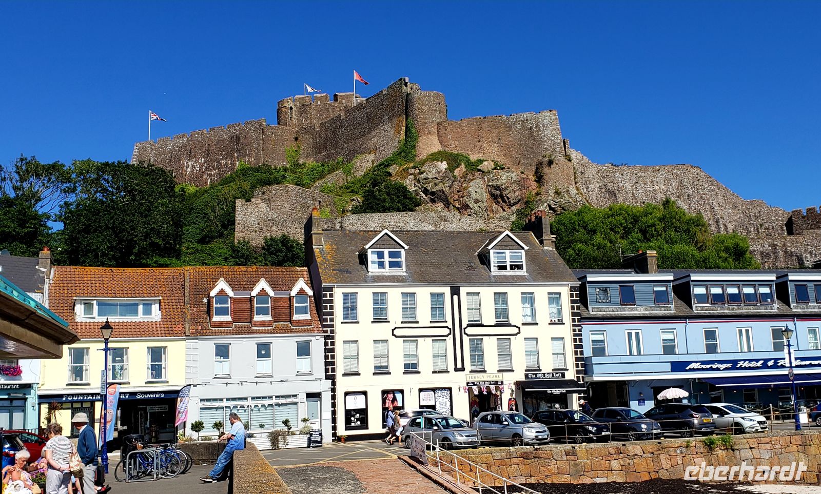 Von Hamburg, Berlin und Dresden erreicht ein Teil der Gäste München, wo weitere Gäste zur Gruppe stoßen, und dann fliegen wir direkt nach Jersey. Zwei der 17 Gäste sind direkt von Düsseldorf nach Jersey gereist. In Saint Helier werden wir von Eddy abgeholt und mit dem Kleinbus ins Hotel Ommaroo gebracht. Unterwegs sehen wir schon Elisabeth Castle und die malerische Bucht, an der auch unser Hotel liegt.