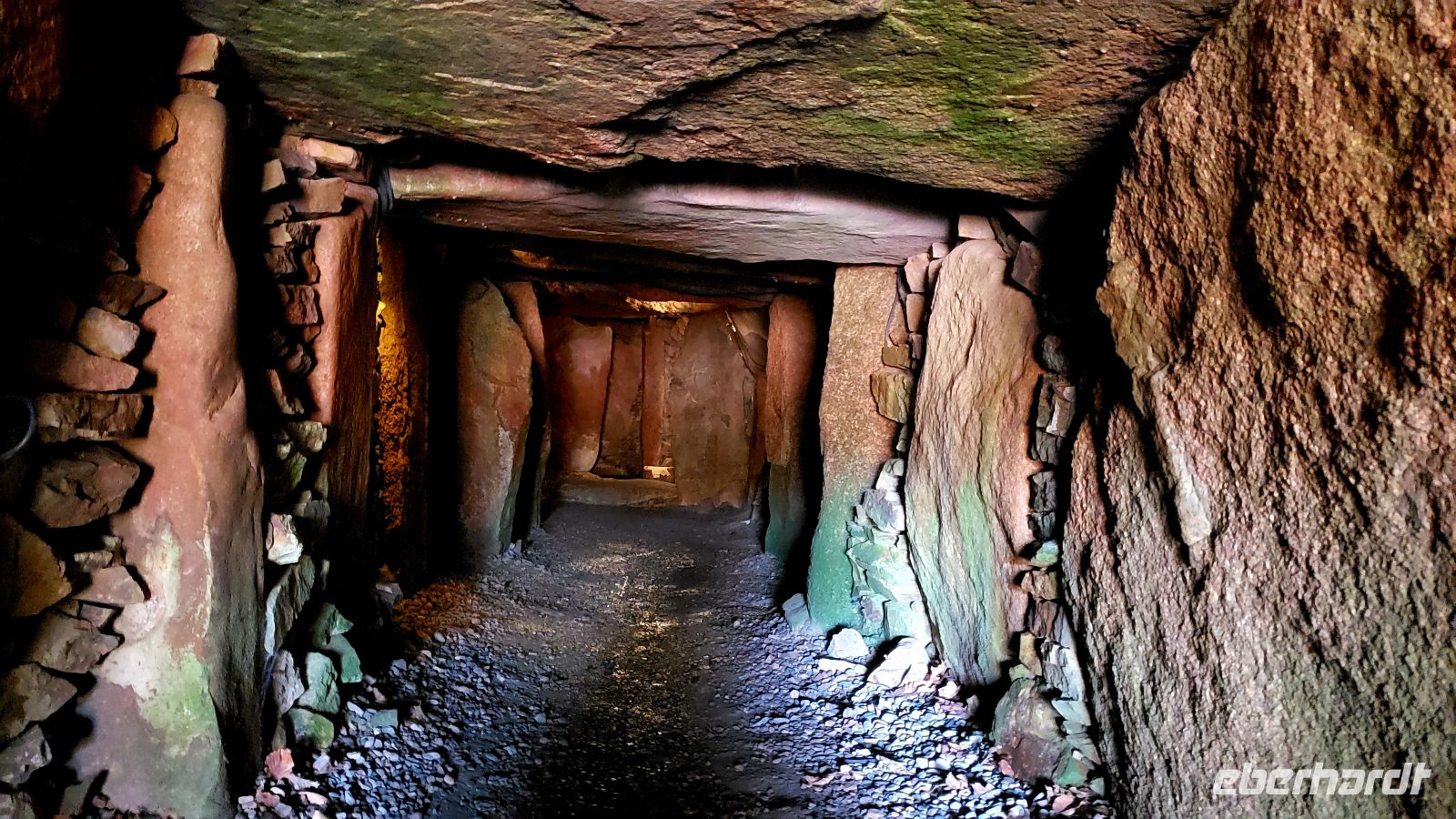 Beeindruckt fahren wir mit dem Bus wieder Richtung zentrale Busstation, unterwegs verlassen uns einige Gäste, weil sie entweder in St. Aubin bummeln oder zum Elisabeth Castle bei Ebbe wandern wollen. Der „harte Kern“ fährt weiter mit mir zur Grabanlage La Hougue, wo wir uns das Ganggrab, eine Kapelle und ein neolithisches Langhaus anschauen. Mit dem nächsten Bus geht es weiter nach Gorey, wo wir in die Burganlage gehen. Auf halber Höhe gibt es ein großartiges Café mit Terrasse, dort sitzen wir bestimmt zwei Stunden, weil die Aussicht so wunderschön ist und lassen den Tag ausklingen. Dann geht es gegen 17.30 Uhr wieder ins Hotel. Das war eine schöne Runde quer über die Insel mit interessanten Einblicken. Beim Abendessen haben sich wieder alle viel zu erzählen!
