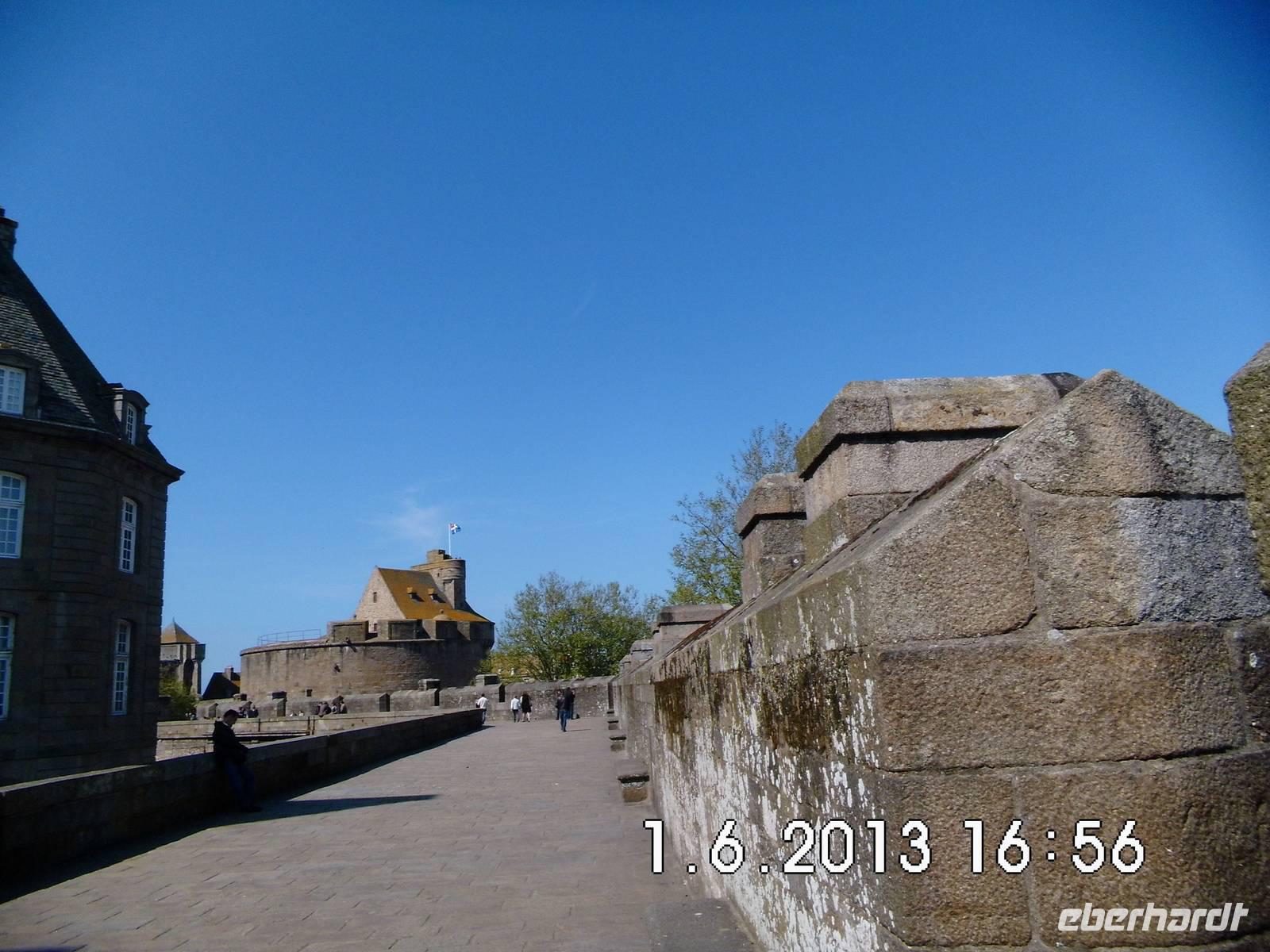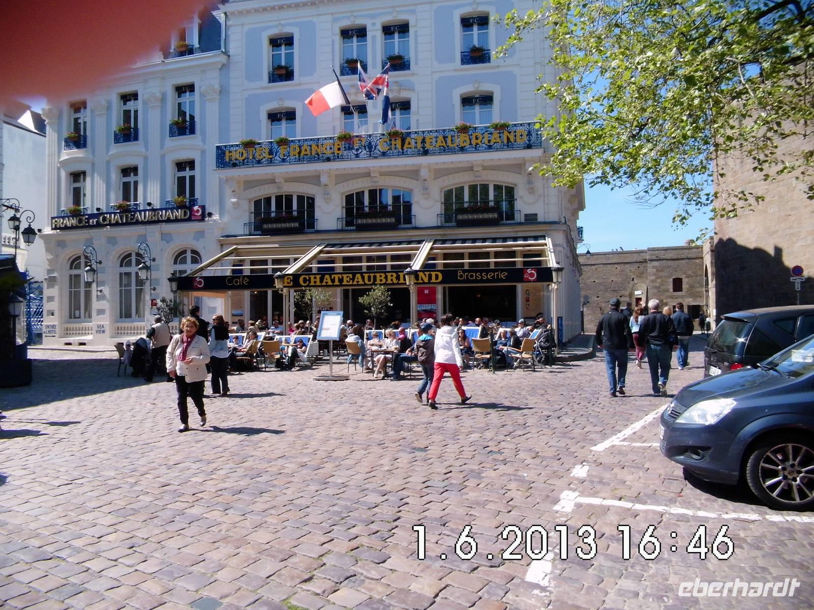 Um acht Uhr setzen wir die Fahrt fort, südlich an Paris vorbei, weiter in westlicher Richtung über Le Mans und Rennes und ab dort Richtung Norden, bis wir die Korsarenstadt St. Malo in der Bretagne erreichen. Nachdem das Gepäck aufgegeben ist, machen wir bei schönstem Sonnenschein einen Spaziergang auf der Stadtmauer. Ein phantastischer Blick über den Hafen und auf die herrschaftlichen Häuser der wohlhabenden Reeder in der „Ville Close", der Stadt innerhalb der Mauern, bietet sich uns . Ihren Wohlstand verdankte die Stadt schon früh der Seefahrt, aber vor allem dem 17. Und 18. Jahrhundert, wo sie sich als Hochburg der Freibeuter etablierte .