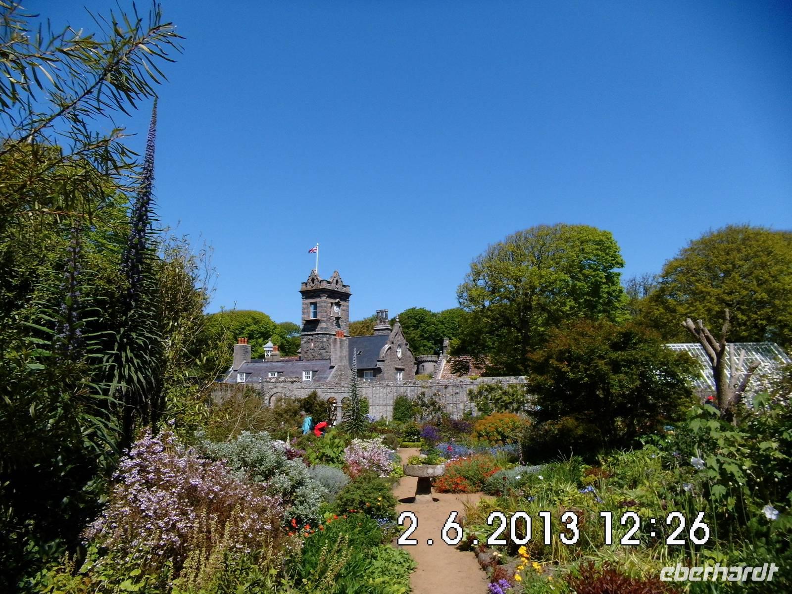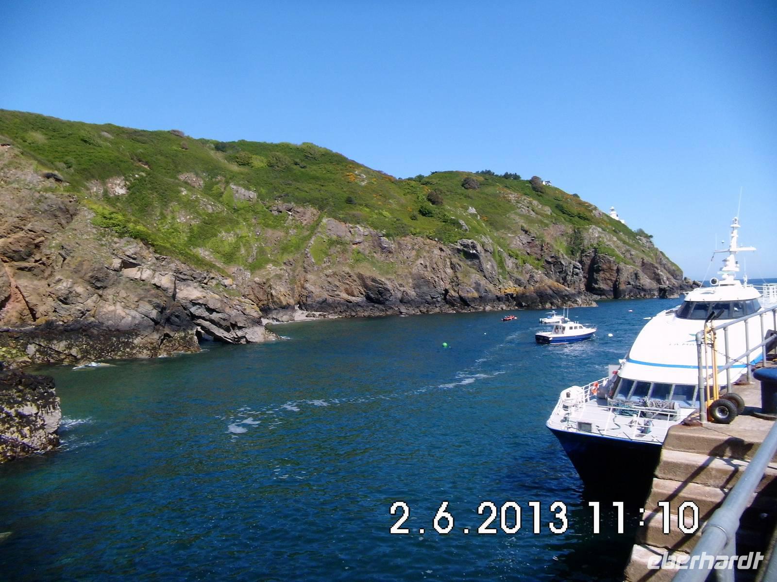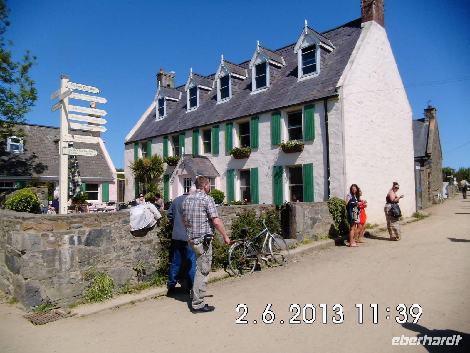 Der erste Tag auf der Insel beginnt gleich mit einem zeitigen Frühstück, denn für uns ist die Fähre nach Sark gebucht. Bei herrlichem Wetter und relativ ruhiger See können wir die Fahrt genießen und betreten dann feudalen Inselgrund . Mit einem Traktor geht es dann auf der autofreien Insel auf das knapp 100 Meter über dem Meeresspiegel liegende, knapp 6 Quadratkilometer große Hochplateau bis zur „Main Road". An diesem Tag begleitet uns Francisca zu allen Sehenswürdigkeiten und berichtet viel Interessantes über die Insel. Seit dem 16.Jahrhundert wird die Insel in männlicher Erbfolge von einem Seigneur regiert, das Land ist in 40 Pachtgrundstücke aufgeteilt und hat 600 Einwohner. Wir machen einen Spaziergang zur Seigneurie, dem Amtssitz des Seigneurs : ein Herrenhaus aus dem frühen 18. Jhd mit parkartigem Garten erwartet uns . Wir bestaunen die kunstvoll angeLegten Beete mit den exotischsten Pflanzen und Blumen, einen Irrgarten, ein Taubenhaus sowie