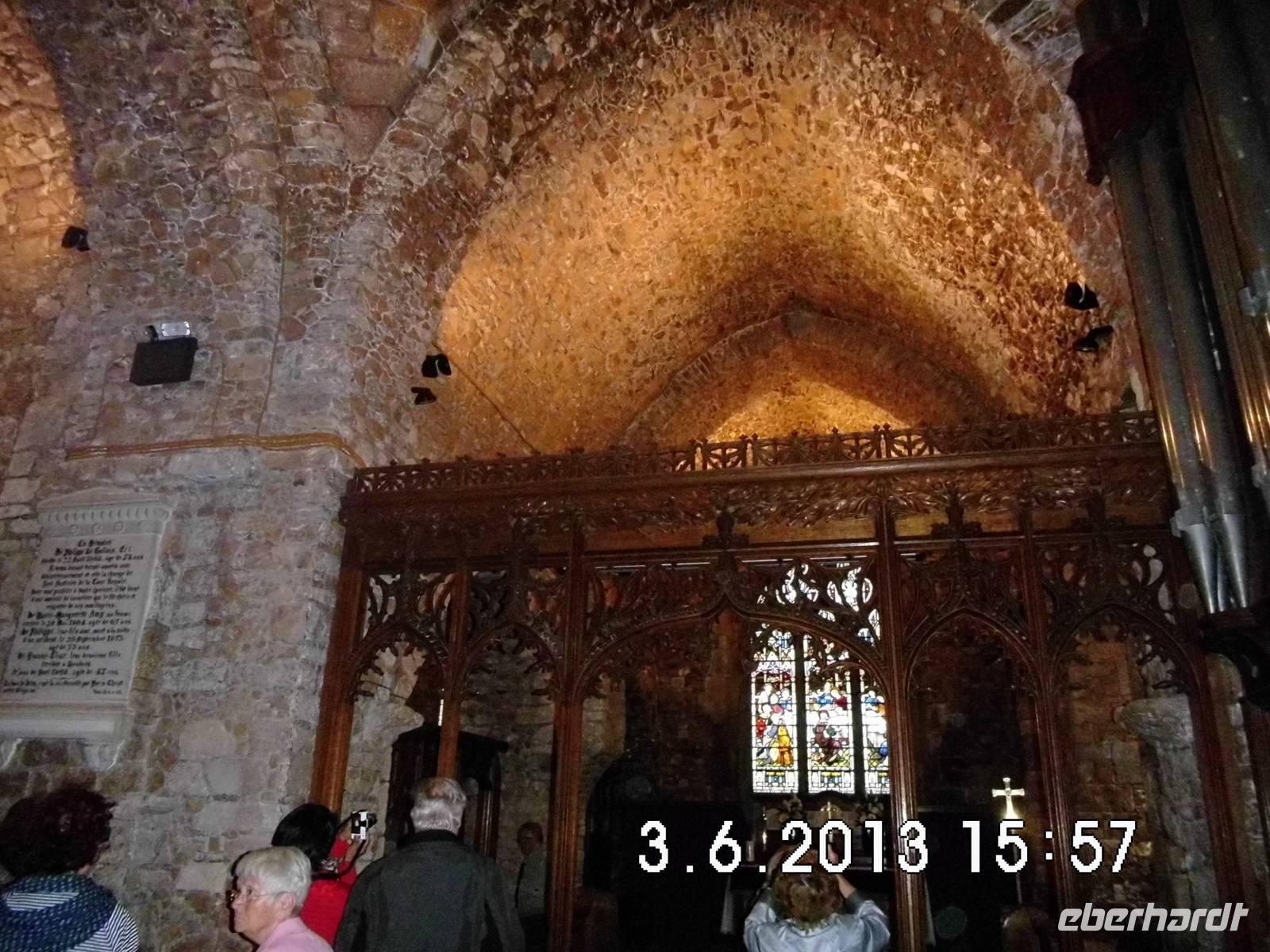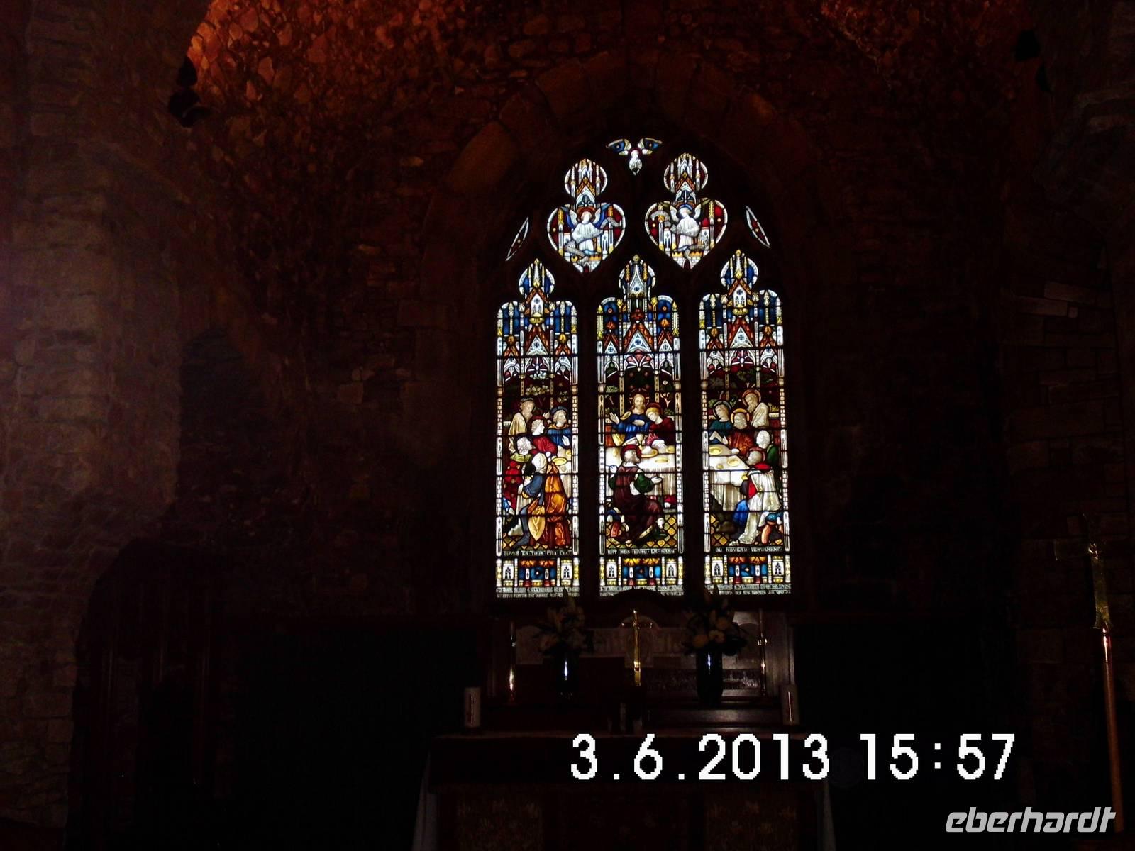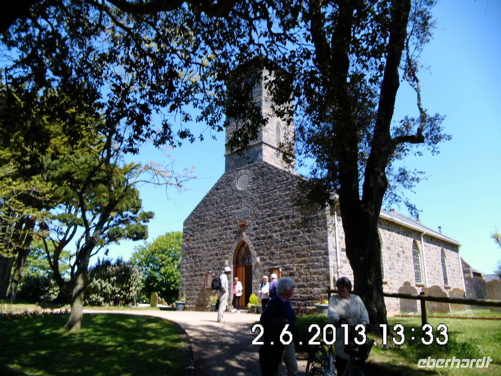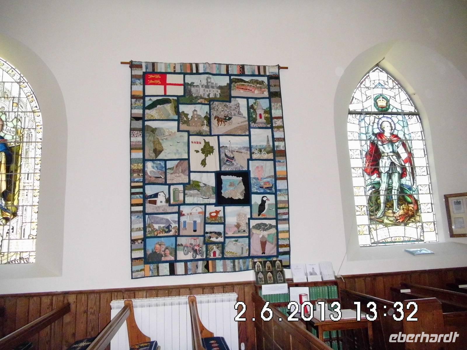 In der kleinen anglikanischen Kirche endet gerade der Sonntagsgottesdienst, als wir das Interieur besichtigen. Jede der 40 ursprünglichen Familien hat hier eine eigene Sitzbank mit dem jeweiligen Familienwappen bestickten Auflagen. Eine 2-er Bank ist für die zwei möglichen Gefängnisinsassen der Insel bestimmt und bleiben heute frei.