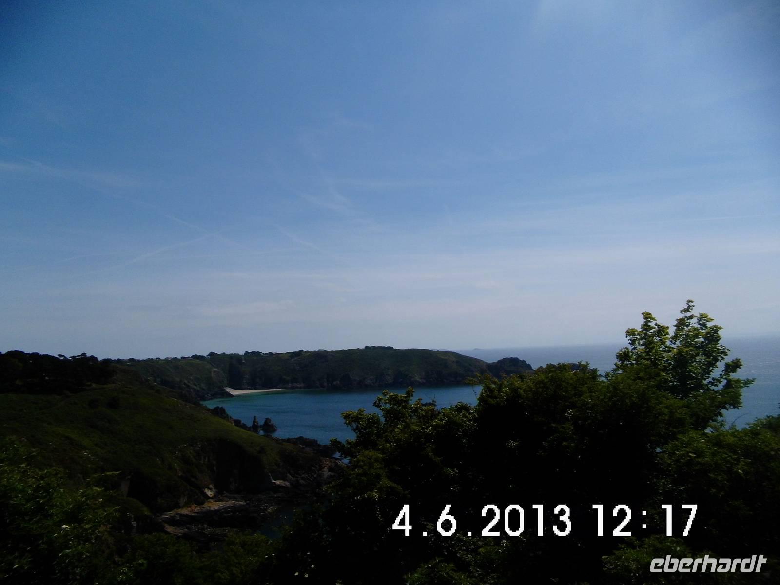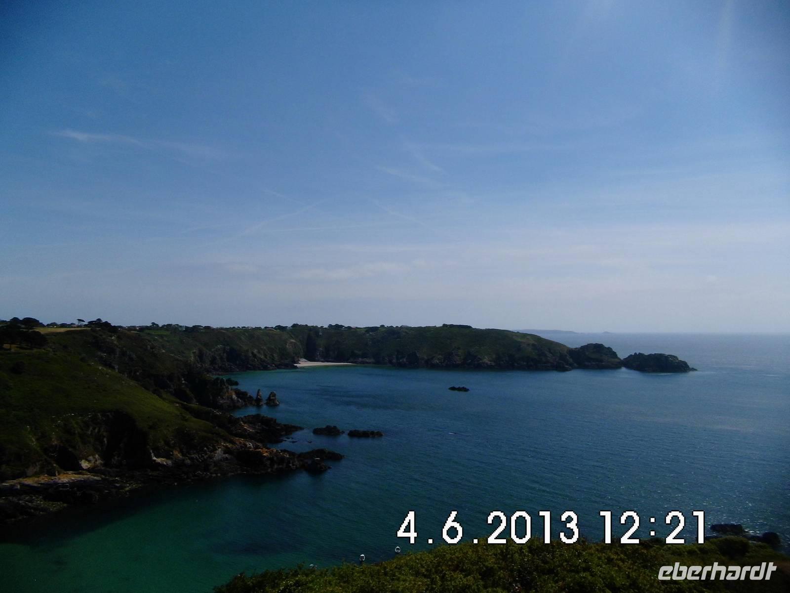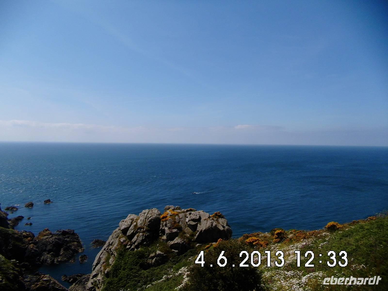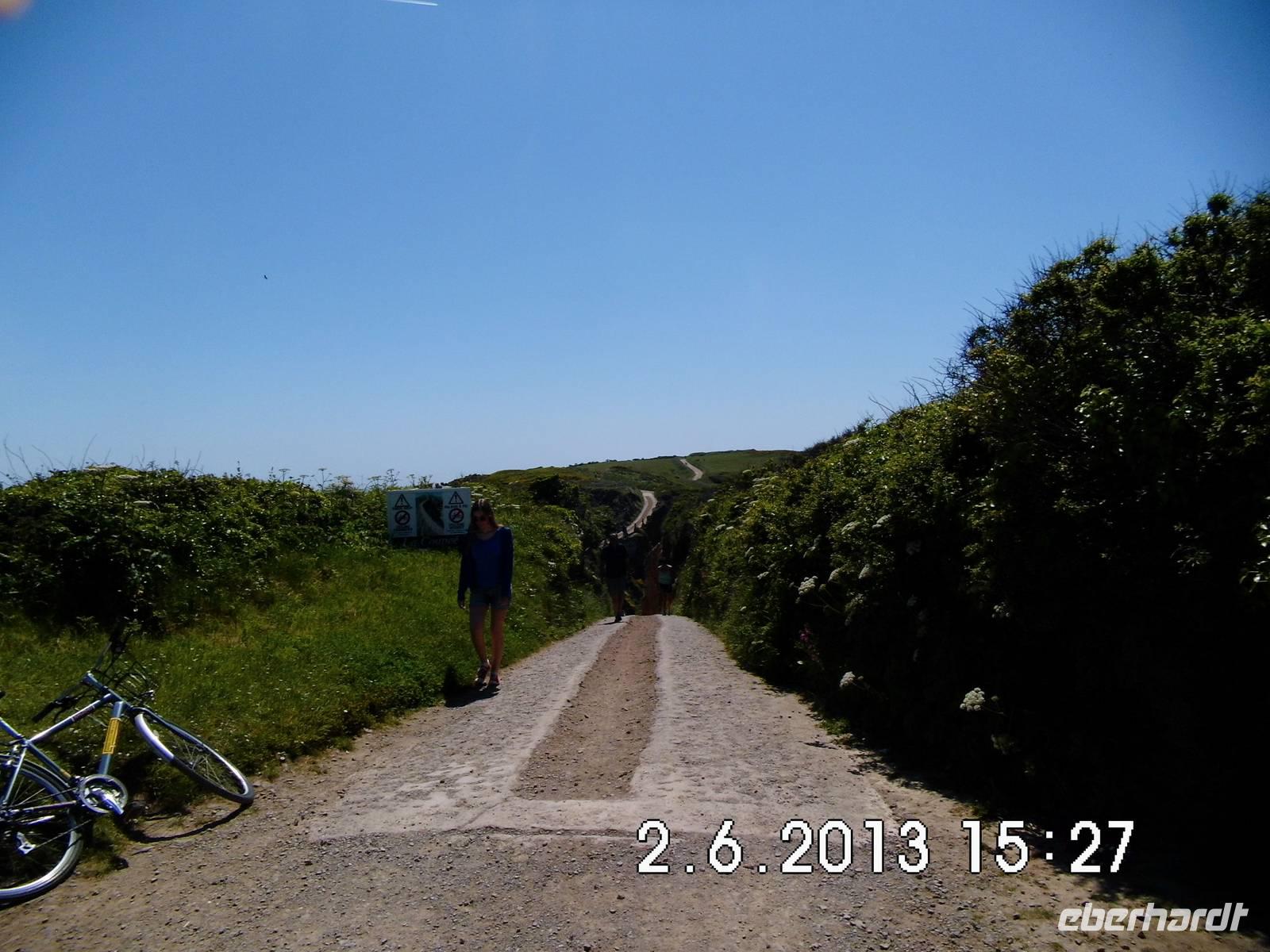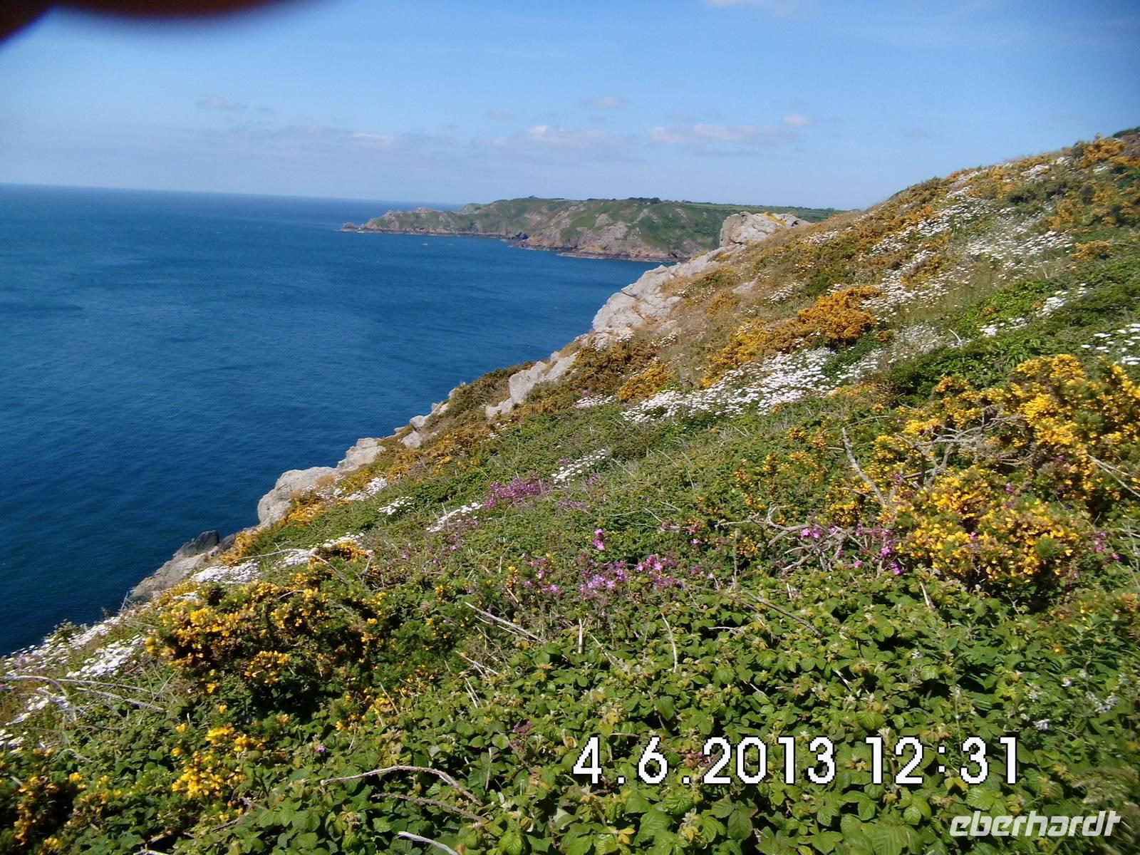 einen Hundefriedhof. Am Nachmittag macht ein Teil der Gruppe eine Wanderung entlang der Küste der Dixcart Bay zur Halbinsel Little Sark, die im Südwesten von Sark durch einen schmalen, 90 Meter hohen Grat , „La Coupee" genannt, mit der Hauptinsel verbunden ist. Der andere Teil der Gruppe unternimmt eine Kutschfahrt dorthin und gemeinsam genießen wir den herrlichen Blick hinüber nach Little Sark und bis nach Guernsey.Der Rückweg führt uns durch Weinberge (obwohl hier kein Wein gedeiht), kleine Wälder und Wiesen. An Verkehrsmittel begegnen uns nur Fahrräder und ab und zu ein Traktor, dessen Benutzung