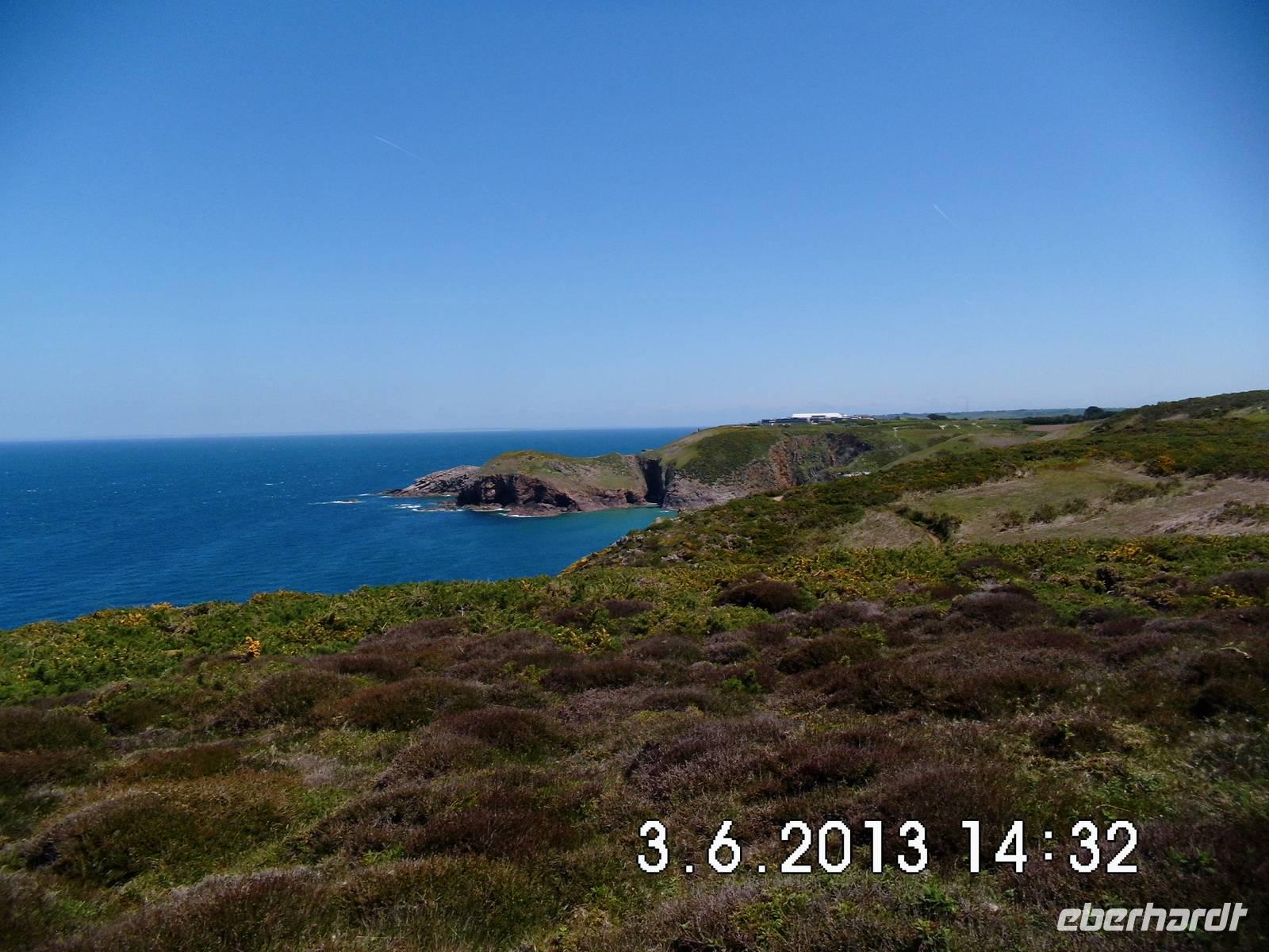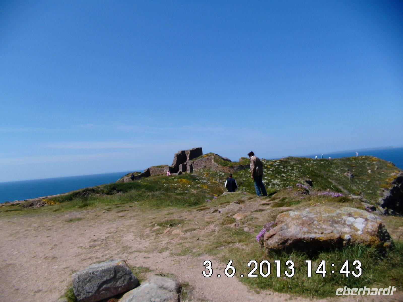 Die Bonne Nuit Bay ist mit 115 m der höchste Punkt der Insel und ist deshalb mit dem Radar des Flughafens bestückt. In Gréve de Lecq gibt es einen hübschen kleinen Hafen und hier machen wir auch unsere Mittagspause. In der Nähe des Parkplatzes steht ein Martello- Turm, - der erste seiner Art auf der Insel. Nach 15 Minuten Wanderung auf einem Klippenweg erreichen wir Grosnez Castle . Von der Burg ist heute im Wesentlichen nur noch die Toreinfahrt mit umgebenden Mauern erhalten, sie hatte aber im hundertjährigen Krieg im 14 Jhd. eine ausgesprochen wichtige Schutzfunktion.
