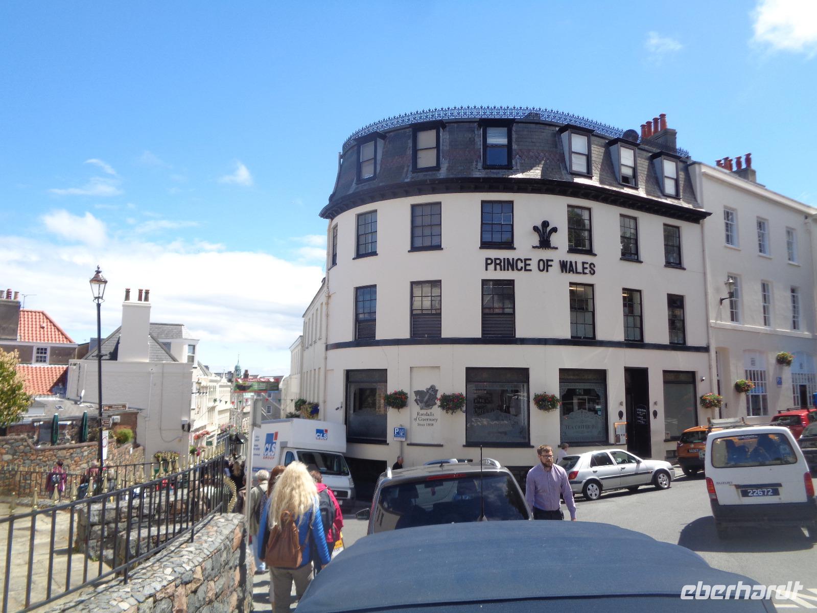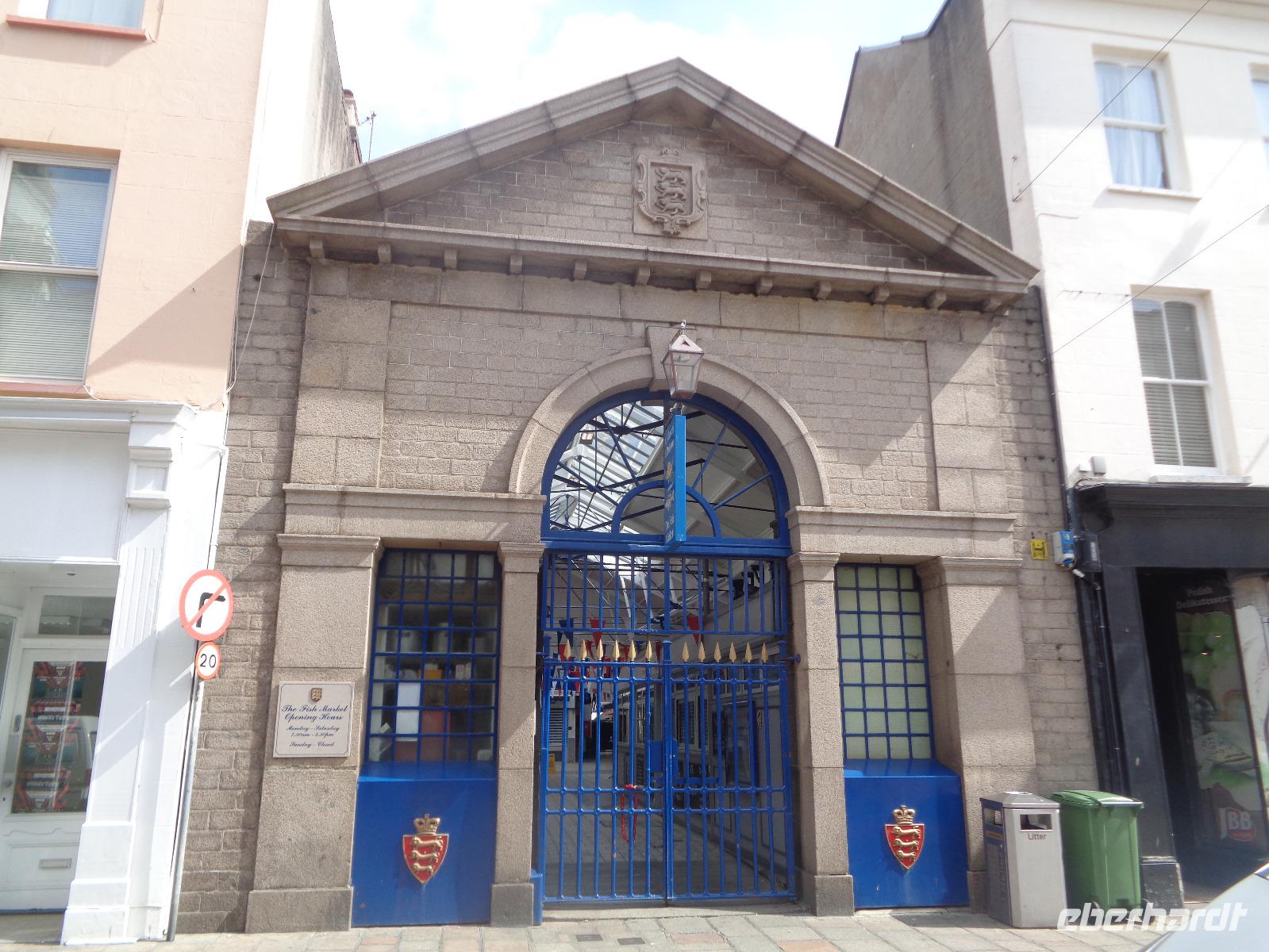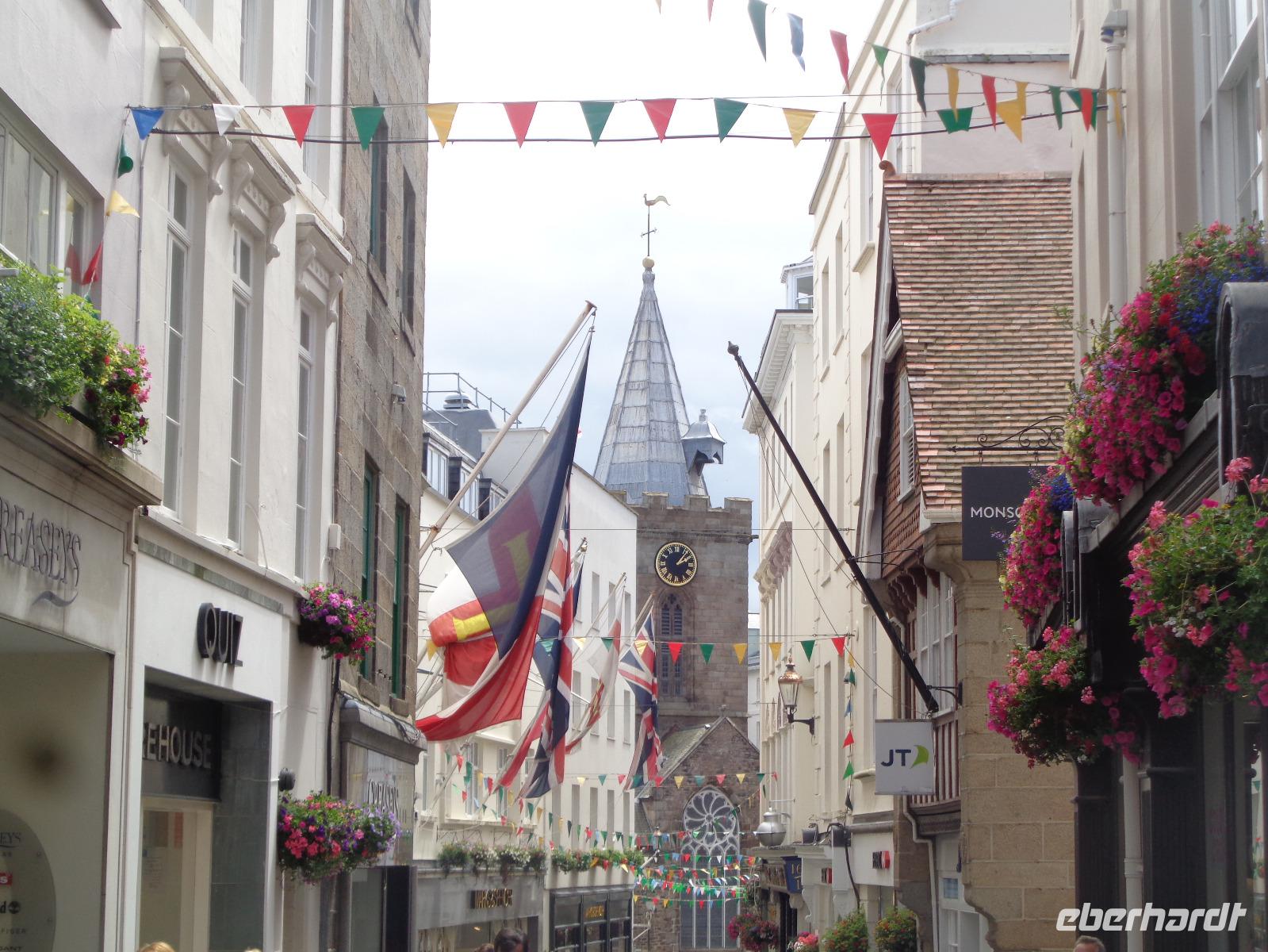 Das Frühstück können wir heute langsam angehen, denn wir haben Zeit. Unser Spaziergang führt uns über die Rooseville street, vorbei an der Polizeistation und dem Bankenviertel, bis zur Queen street, die in die beliebte King street übergeht. Unser erstes Ziel sind die Markthallen, die heute am Sonntag leider geschlossen sind. Wir gehen weiter zum Royal Square. Den Königlichen Platz, der früher der eigentliche Marktplatz war, schmückt die goldene Statue von König George II. Er finanzierte den Bau des Hafens und brachte Wohlstand auf die Insel. Wirtschaft und Handel blühten in der Hauptstadt. Den Namen verdankt der Royal Square allerdings King Charles II., der hier 1649 zum König ausgerufen wurde. Nachdem Cromwell seinen Vater hinrichten ließ, war der Thronfolger in Gefahr und wurde durch die Royalisten Jerseys im Elizabeth Castle versteckt und unter Schutz gestellt.