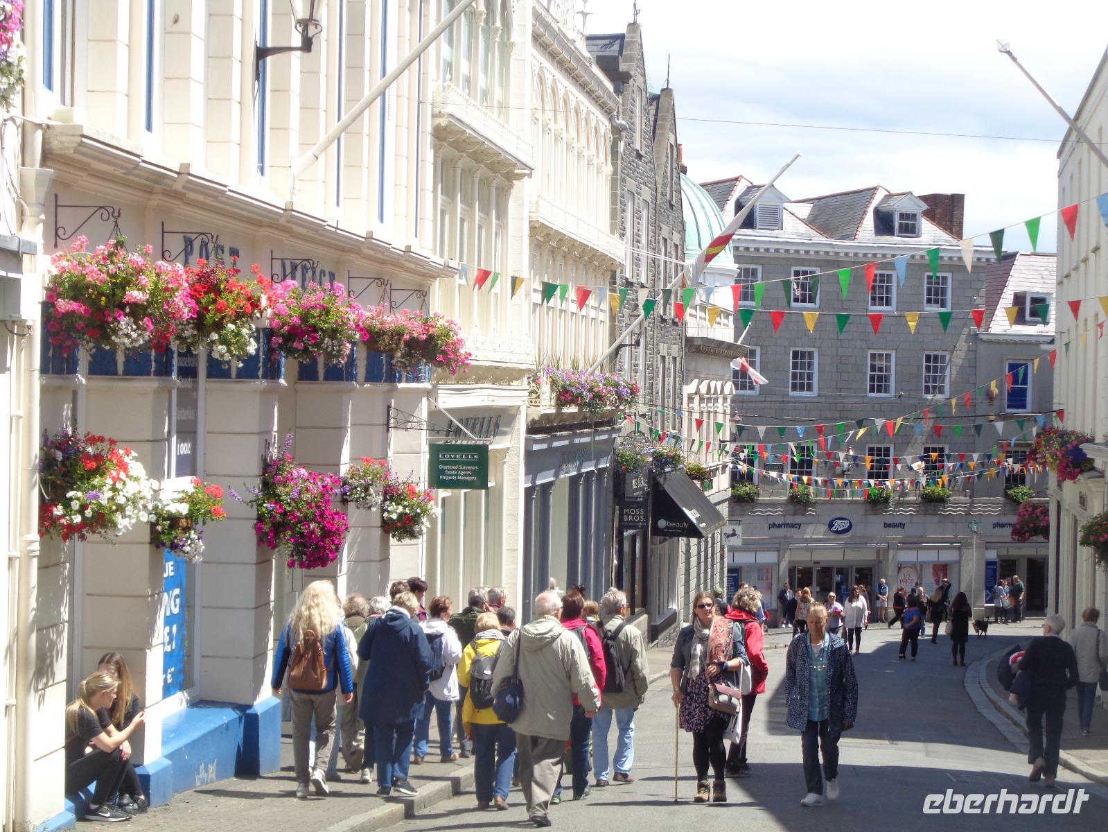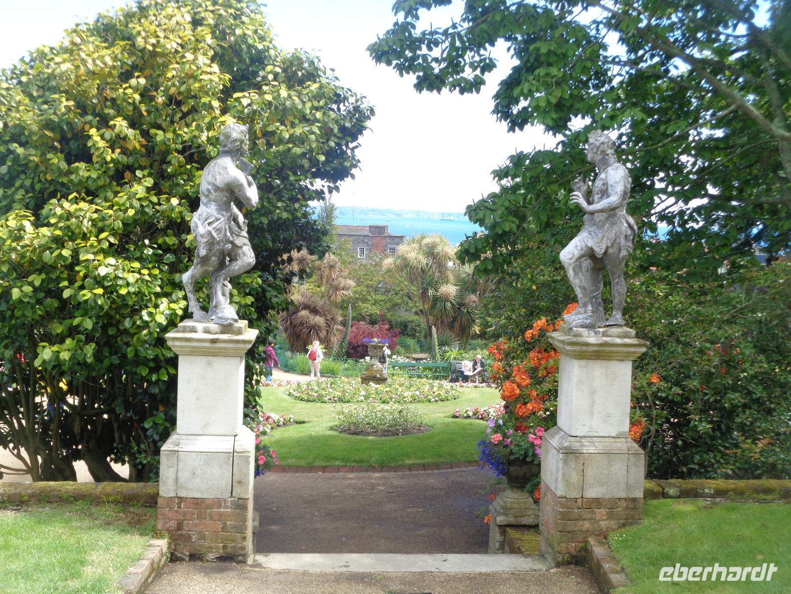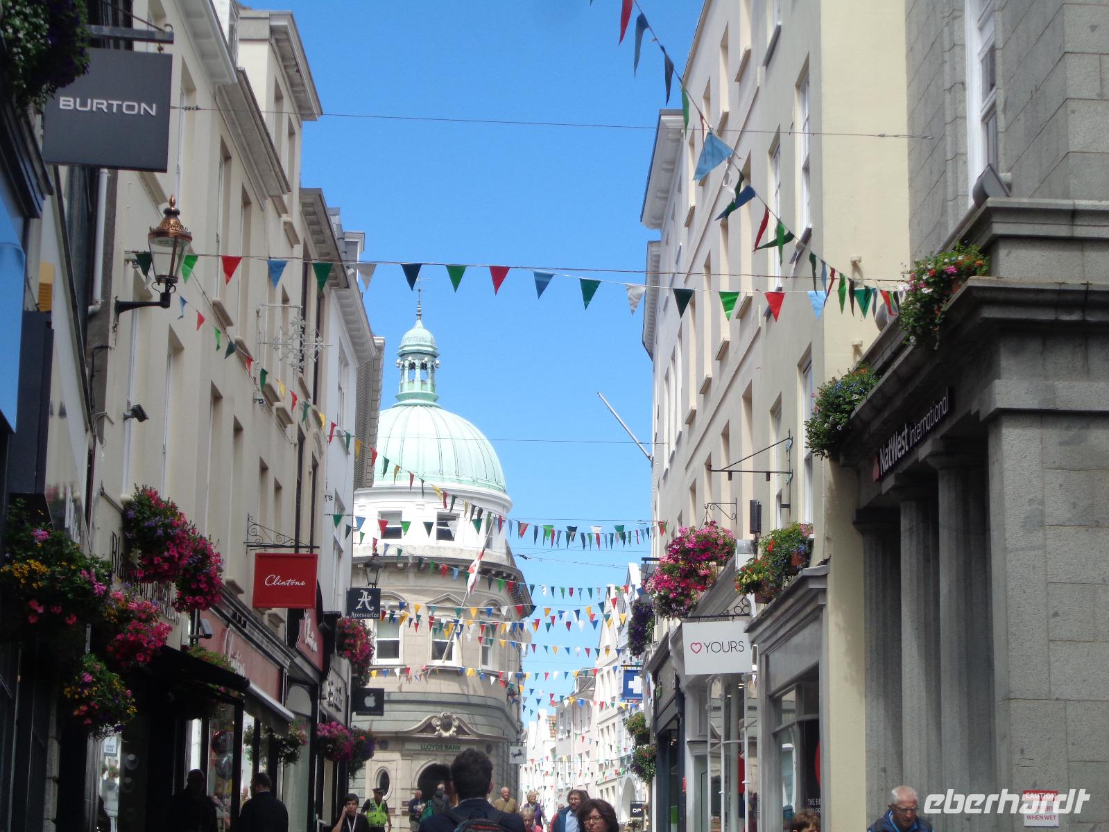 Das Frühstück können wir heute langsam angehen, denn wir haben Zeit. Unser Spaziergang führt uns über die Rooseville street, vorbei an der Polizeistation und dem Bankenviertel, bis zur Queen street, die in die beliebte King street übergeht. Unser erstes Ziel sind die Markthallen, die heute am Sonntag leider geschlossen sind. Wir gehen weiter zum Royal Square. Den Königlichen Platz, der früher der eigentliche Marktplatz war, schmückt die goldene Statue von König George II. Er finanzierte den Bau des Hafens und brachte Wohlstand auf die Insel. Wirtschaft und Handel blühten in der Hauptstadt. Den Namen verdankt der Royal Square allerdings King Charles II., der hier 1649 zum König ausgerufen wurde. Nachdem Cromwell seinen Vater hinrichten ließ, war der Thronfolger in Gefahr und wurde durch die Royalisten Jerseys im Elizabeth Castle versteckt und unter Schutz gestellt.
