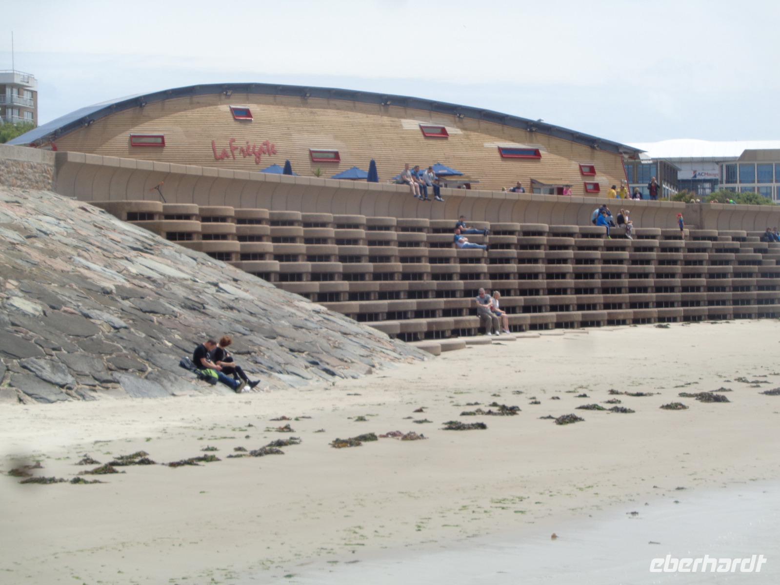 In der Mitte des Platzes erinnert eine Metall-Plakette an den Battle of Jersey, wie der heldenhafte Kampf gegen die Franzosen 1781 genannt wird. Ebenso geschichtsträchtig ist die Fassade des Royal Court von 1866, an der eine Büste von Lord Alexander Moncrieff Contanches angebracht ist, weil er vom Balkon in seiner Eigenschaft als Bailiff die Befreiung von der deutschen Besatzung bekannt gegeben hatte. Auch das Parlament und die Gemeindekirche Library Church befinden sich hier und die Post liegt auch auf dem Weg. Wir folgen dann der King street bis zur „guten Kröte" oder „The good Toad", ein Denkmal von Gordon Young. Hier war das westlichste Ende der Stadt und dahinter gab es nur noch Marschland mit vielen Kröten. Wir biegen ab zur Esplanade und gelangen zum Busbahnhof, dem unser ganz besonderes Interesse gilt. Alles ist so fantastisch optimiert, dass wir heute noch hier abfahren werden. Wir gehen weiter zum Liberation Square zum Monument of Freedom, das am 9. Mai 1995 in Erinnerung an den 50. Jahrestag der Befreiung durch Prinz Charles enthüllt wurde. Wir informieren uns über die Abfahrtszeiten des Little Trains und werfen einen Blick ins Wharf, ehemals Fleischerei und Bahnhof, und heute ein beliebtes Shopping-center. Wir besuchen kurz das Jersey-Museum und werden zu einem Film über Jersey mit deutschen Untertiteln eingeladen. Ein würdiger Abschluss unseres Stadtrundganges, denn jetzt geht es zum Elizabeth Castle.