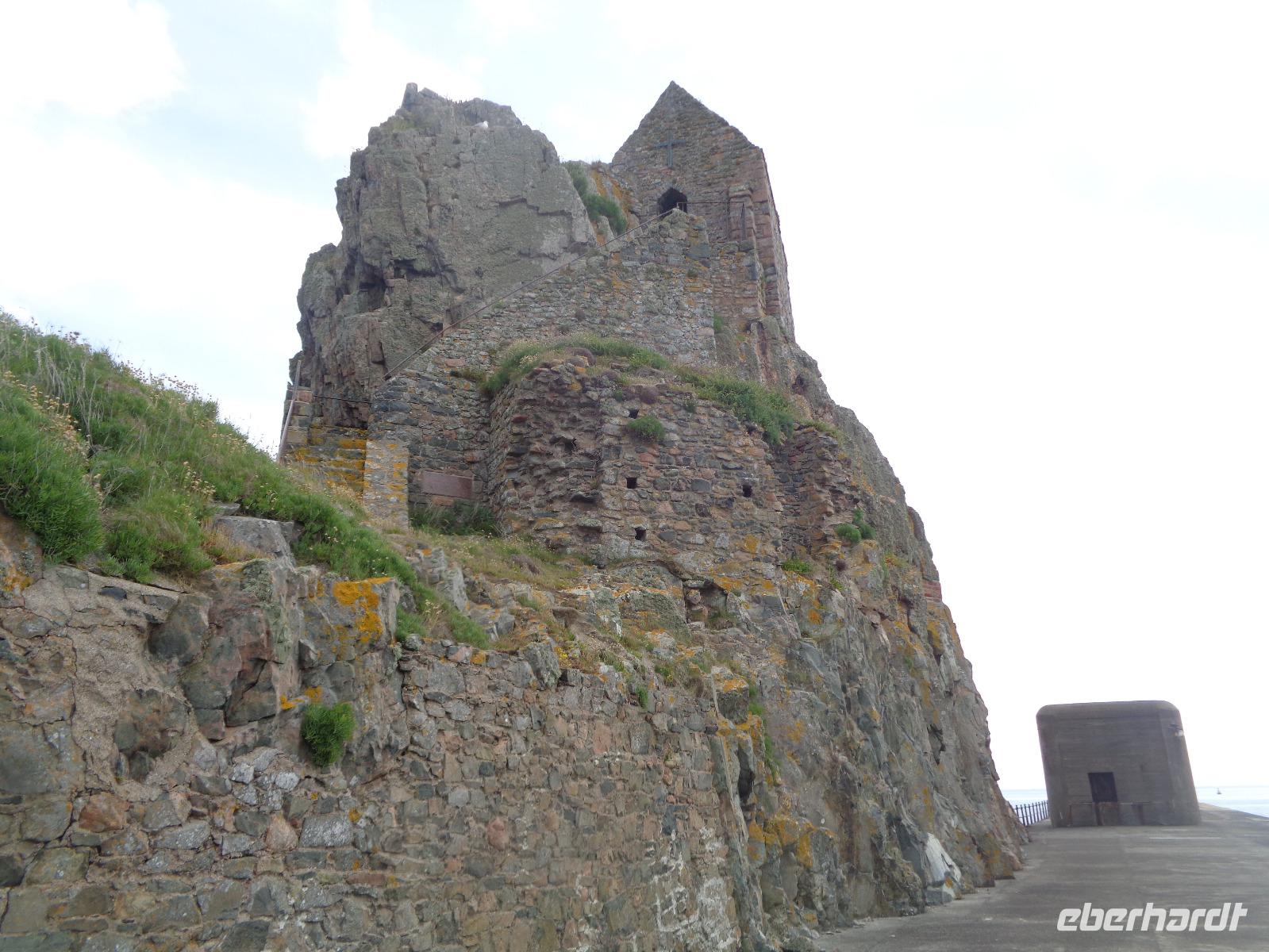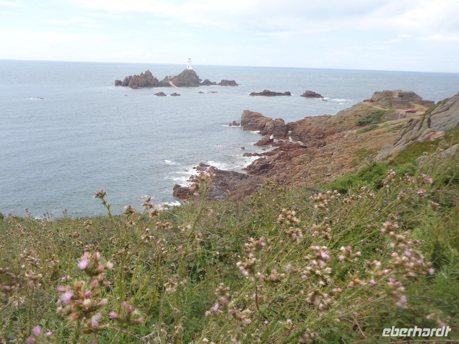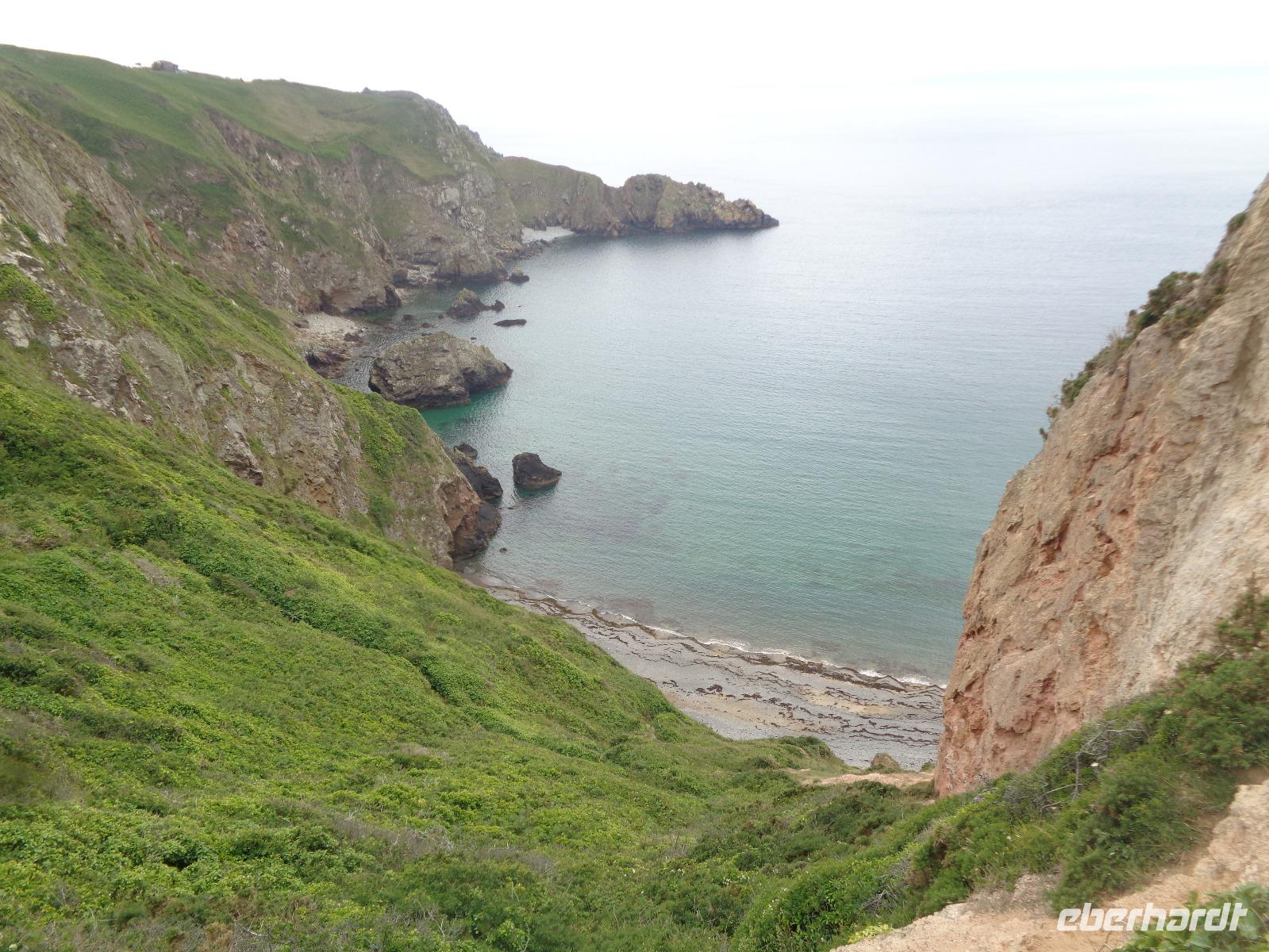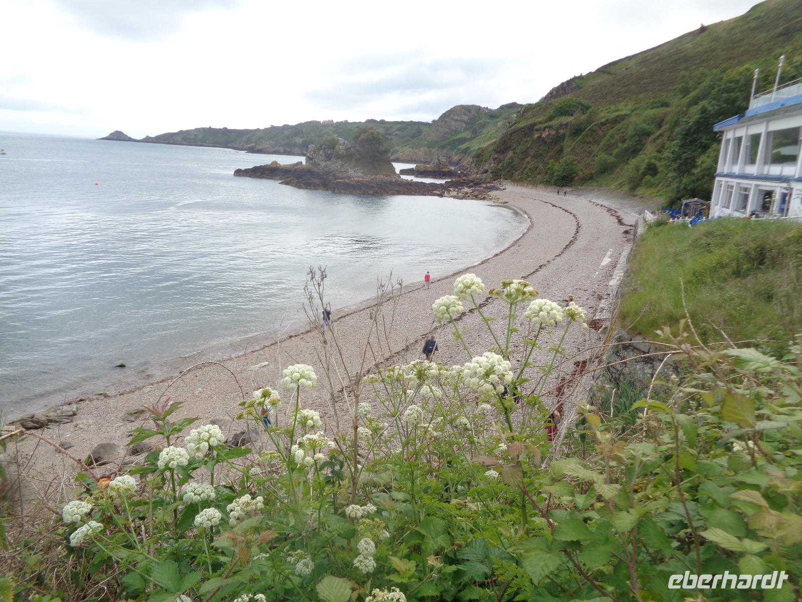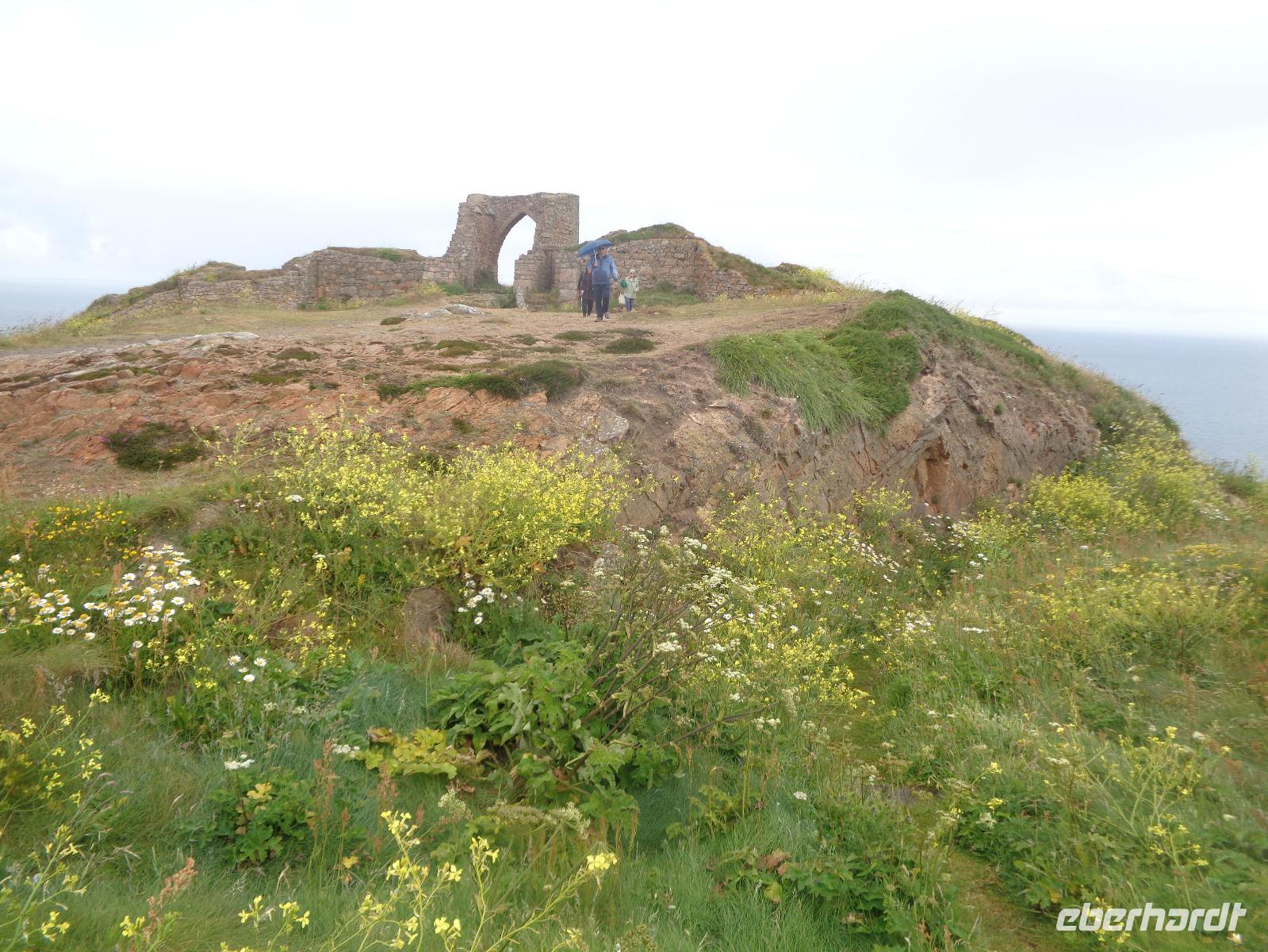 Nach dem Frühstück holt uns heute Heidi ab zur traditionellen Inselrundfahrt. Wir fahren zuerst gen Osten nach Gorey. Hier thront oben auf dem Mont Orgeuil die erst Verteidigungsanlage. Als das Schießpulver erfunden wurde und die Kanonen kamen, verlor das Fort seine Funktion an das Elizabeth Castle. Elisabeth I. hatte ihren Militäringenieur Paul Ivy 1590 beauftragt, das Fort in der St. Aubin Bucht auszubauen. Wir fahren weiter zur Bouley Bay entlang der Küste und durch das Landesinnere bis zur Bucht Greve de Lecq. Hier machen wir unsere Mittagspause und fahren dann weiter zum Grosnez Castle. Von hier aus können wir heute Guernsey und Sark sehen.