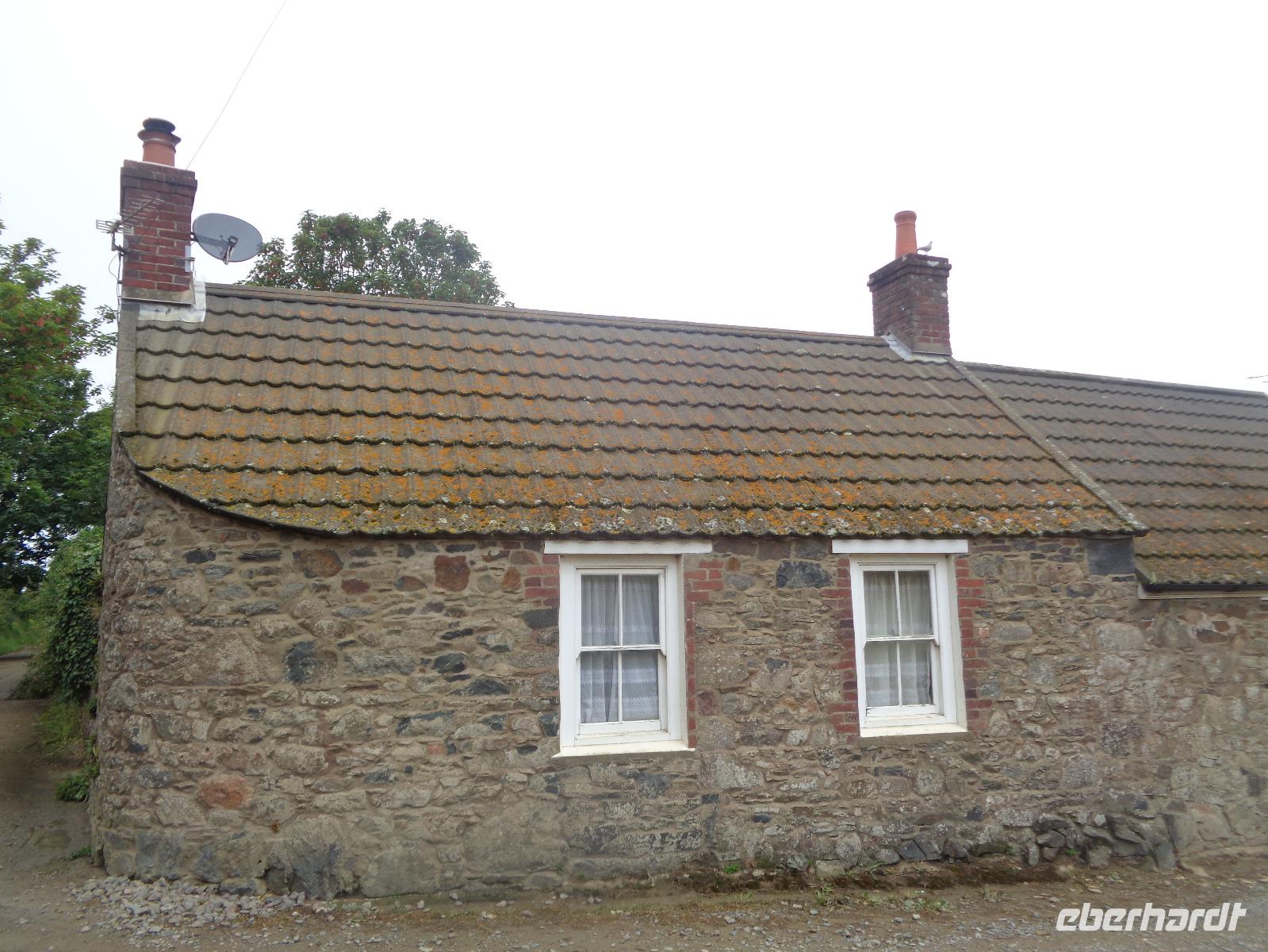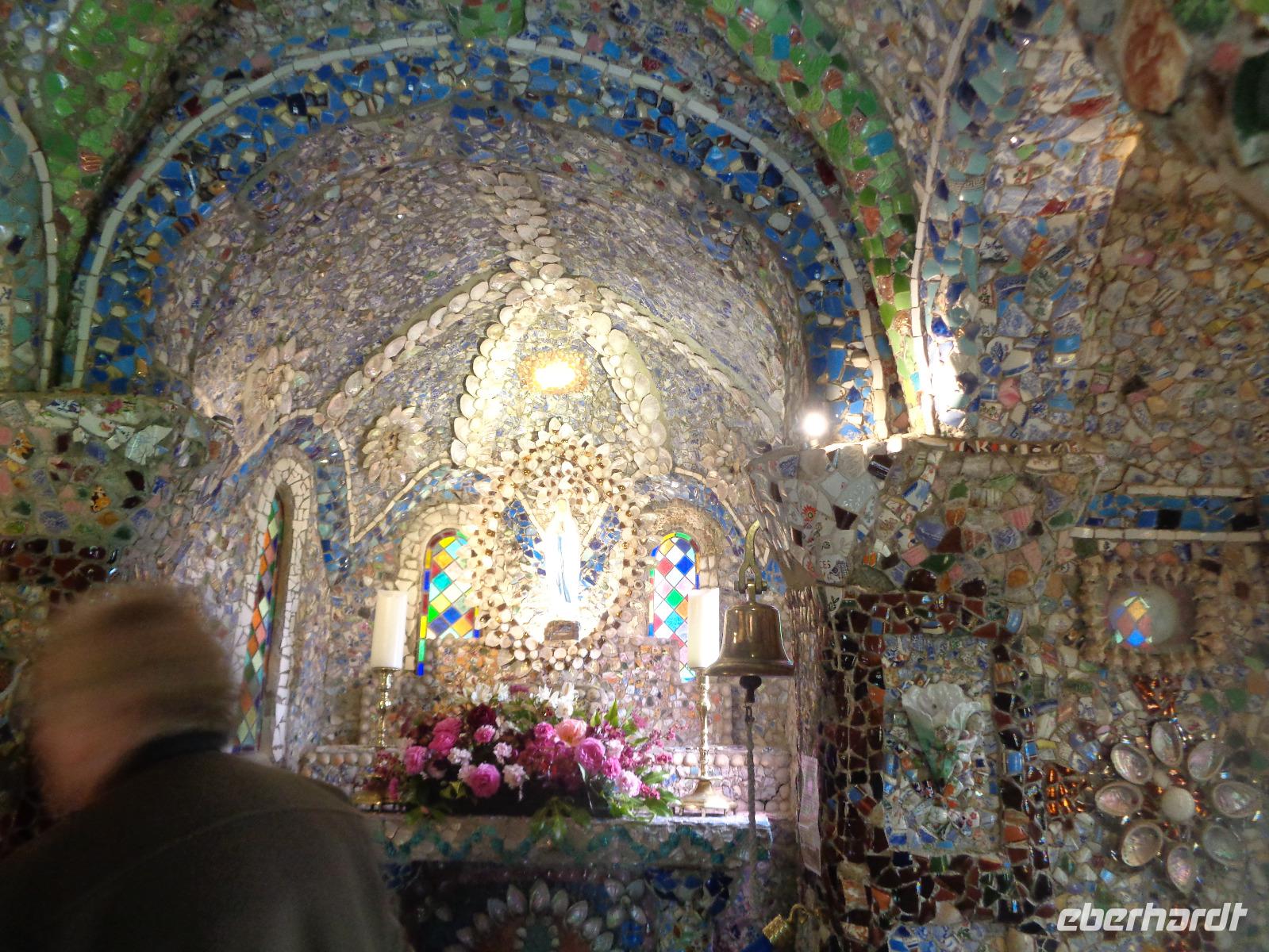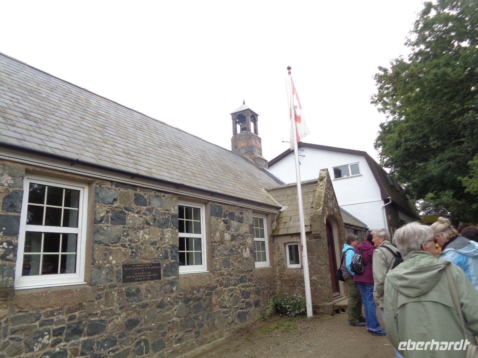Heute werden wir wieder nach einem zeitigen Frühstück abgeholt, weil wir mit der Fähre nach Guernsey wollen. Am Hafen von St. Peter Port steht unser Bus bereit und es geht sofort los zur Küste. Dabei kommen wir am Sausmarez Manor Herrenhaus und an dem Haus von Charlotte Link vorbei, die den Roman „Die Rosenzüchterin" schrieb. Unser Wanderweg gleicht einer Rutschbahn, deshalb sind wir sehr vorsichtig bei unseren Fotoaufnahmen von der wunderschönen Steilküste mit vielen wilden, bunten Blumen und Büschen. Weiter geht es nach St. Andrew zur kleinsten Kirche der Welt, die Bruder Déodat unbedingt nach dem Vorbild der Grotten und der Kapelle von Lourdes in Frankreich bauen wollte. Da der Bischof von Portsmouth mit seinem Hinterteil nicht durch die Tür kam, riss Bruder Déodat seinen Bau wieder ein, das tat er zwei Mal, und baute noch einmal. Die kleine Kirche aus Scherben, Kieselsteinen, Glas- und Porzellansplittern misst nur 4,9 x 2,7 m, kein Wunder.