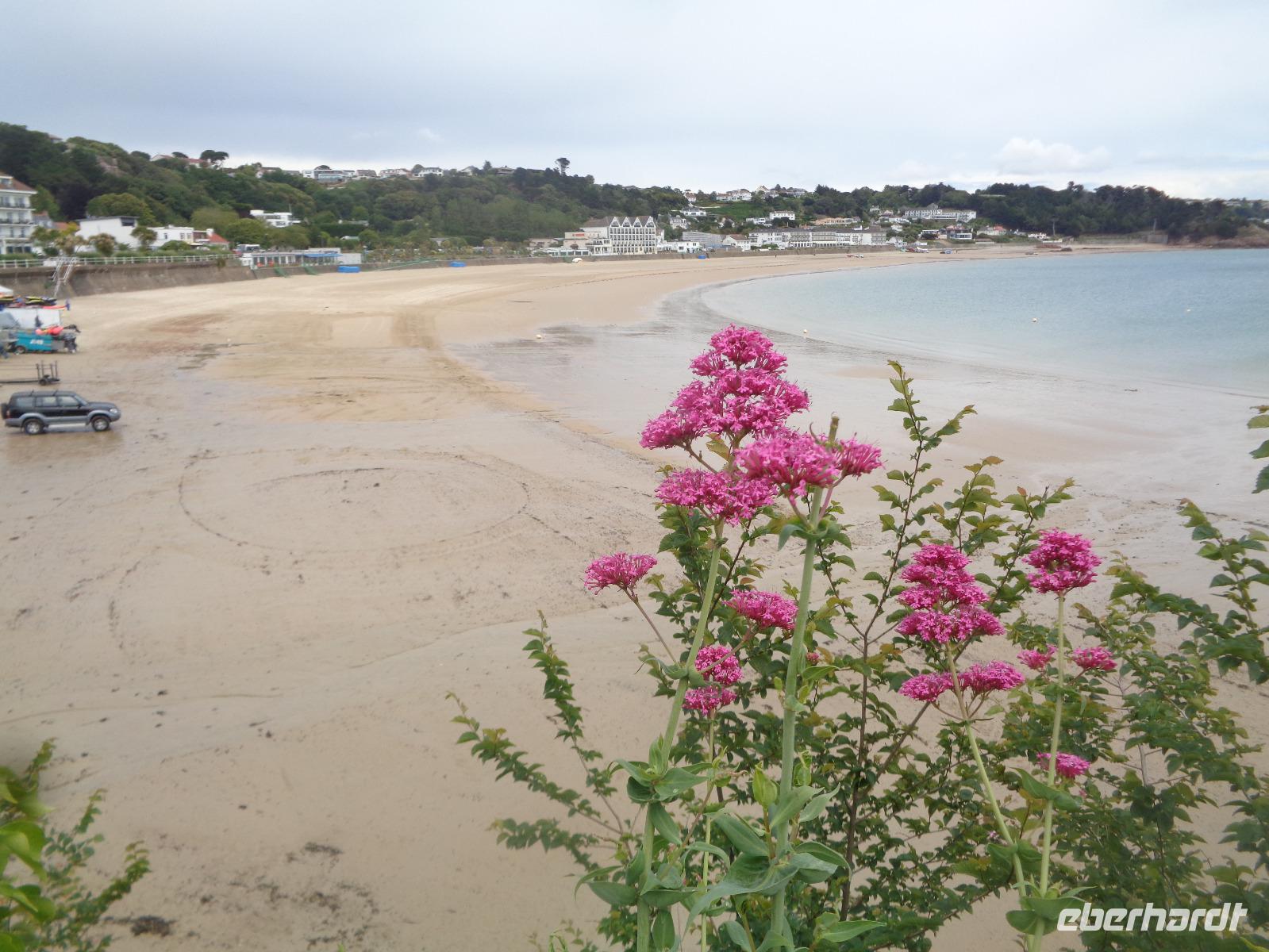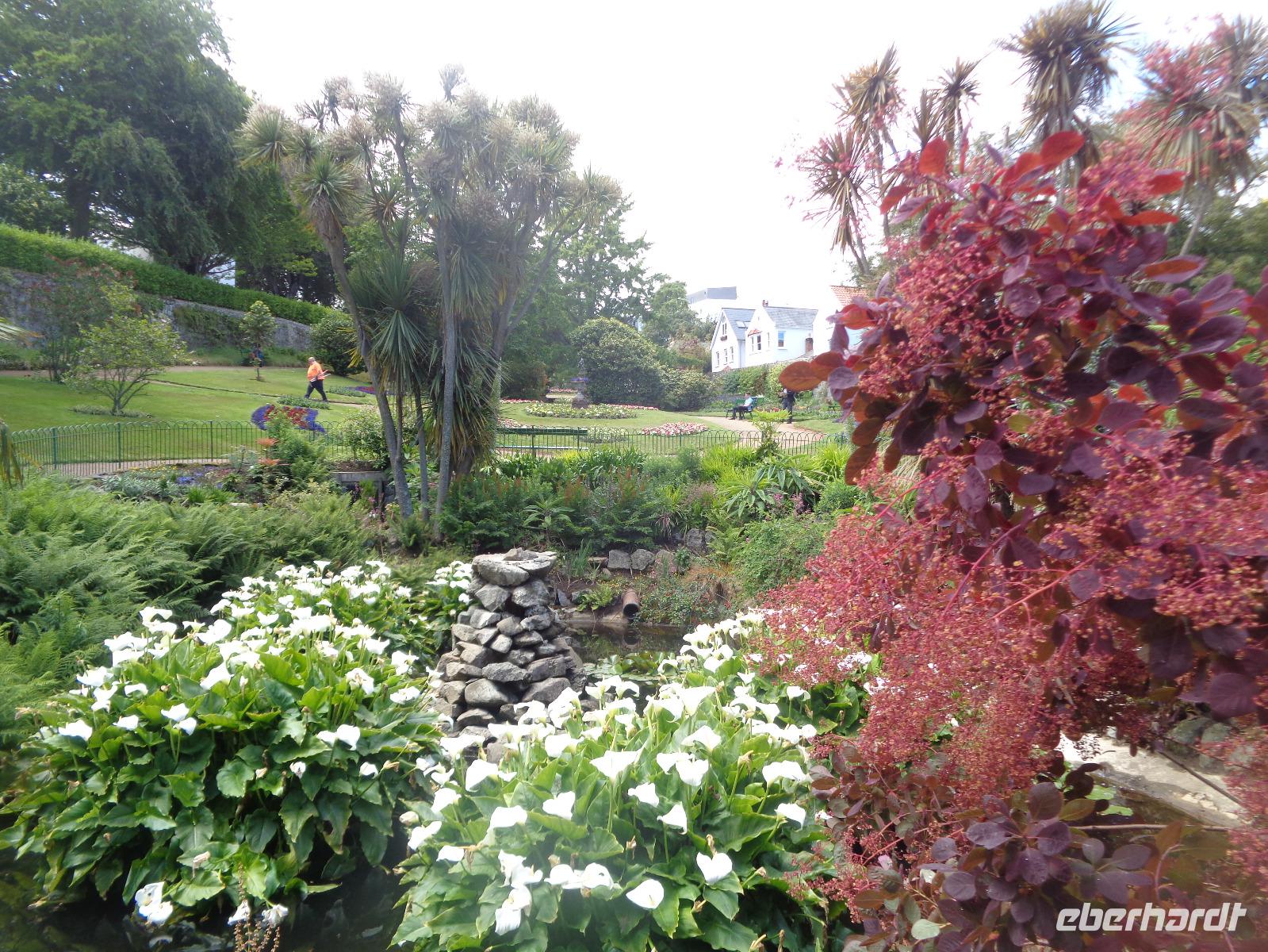 Danach besuchen wir noch 2 Privatgärten von Mrs. Lea und Mrs. Skinners. Vom Garten von Mrs. Lea aus hat man einen unglaublich schönen Blick auf die St. Aubin's Bay, so geschickt sind die Bäume und Blumen angelegt worden. Magnolien, Rhododendren, Azaleen, Acapanthus, Venusnabel, Rosen, alles blüht in den schönsten Farben. Mrs. Lea beschäftigt zwischenzeitlich Gärtner, die die Beete und Rasenflächen pflegen. Der zweite Garten ist anders strukturiert, hat voneinander getrennte Flächen, mit Tennisplatz, Swimmingpool und Gemüse- und Blumengärten sowie edle Bäume und Ziergehölze.