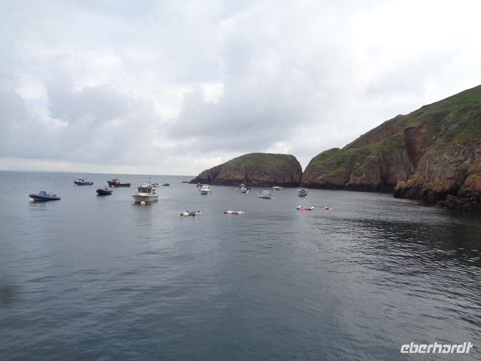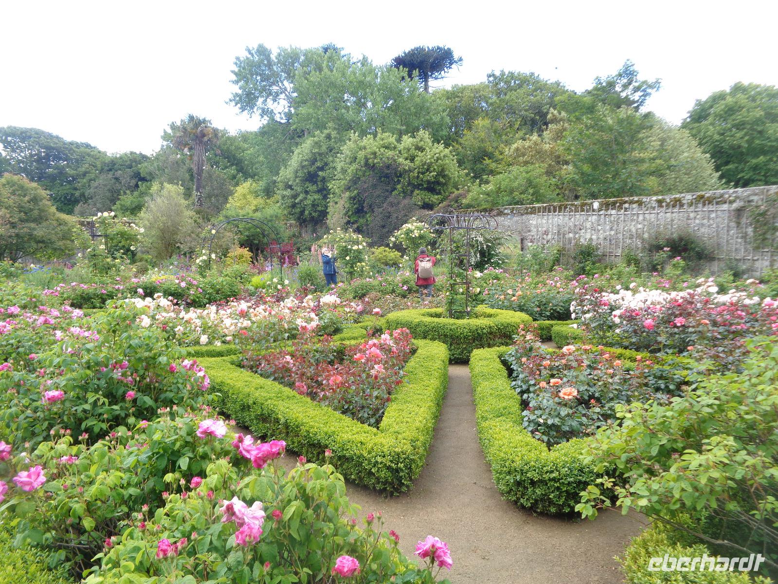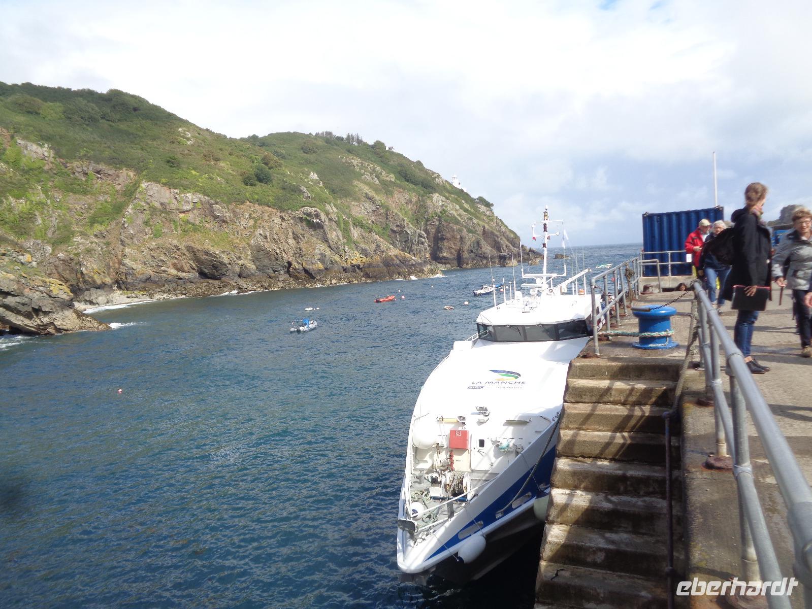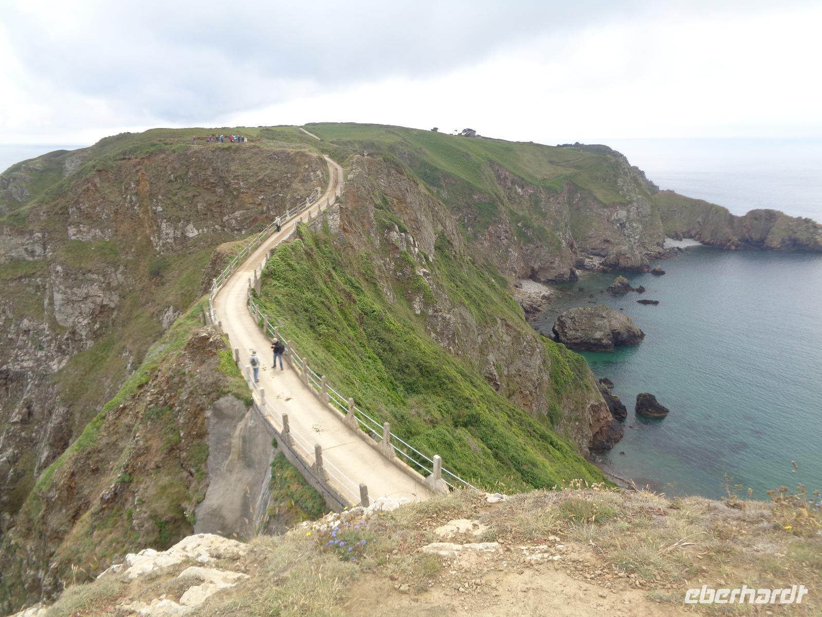 Heidi holt uns heute wieder nach dem Frühstück ab, denn heute klappt es mit der Fähre nach Sark. Die Überfahrt verläuft unauffällig und wir kommen alle topfit an. Heute begleitet uns Christl und erzählt uns zur Einstimmung Wichtiges über Sark. Danach laufen wir gemeinsam zur Seigneurie, dem Herrensitz auf der Insel. Sibyl Hathaway wurde durch ihren Großvater Collings zur Dame von Sark und regierte die Insel bis 1974. Sie förderte den Inseltourismus mit dem Slogan „Die letzte Bastion des Feudalismus" und verstand es auch geschickt, die deutsche Besatzung eher gemütlich bei Tee und Gebäck zu überstehen. Aus ihrer Linie stammen die nachfolgenden Seigneurs Beaumont. Mit dem Feudalismus geht es seit 2008 bergab, denn es wurde mit dem Parlament eine zarte Pflanze der Demokratie installiert. Bewundernswert ist der Garten. Alle Blüten und Blumen, die man sich vorstellen kann, blühen abwechselnd rund um das Jahr. Wir lassen uns auch von dem Blütenduft der Rosen berauschen und kehren anschließend in dem kleinen Restaurant an der Schule ein.