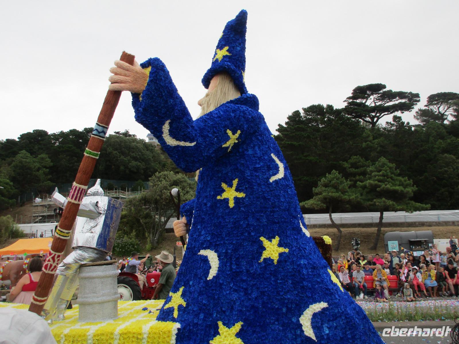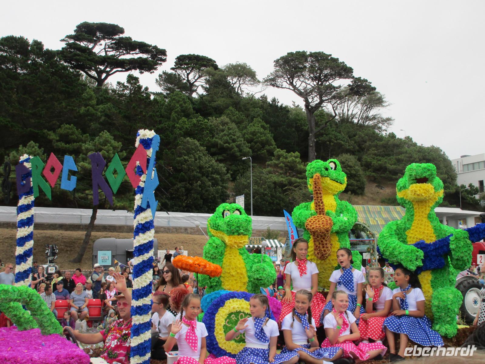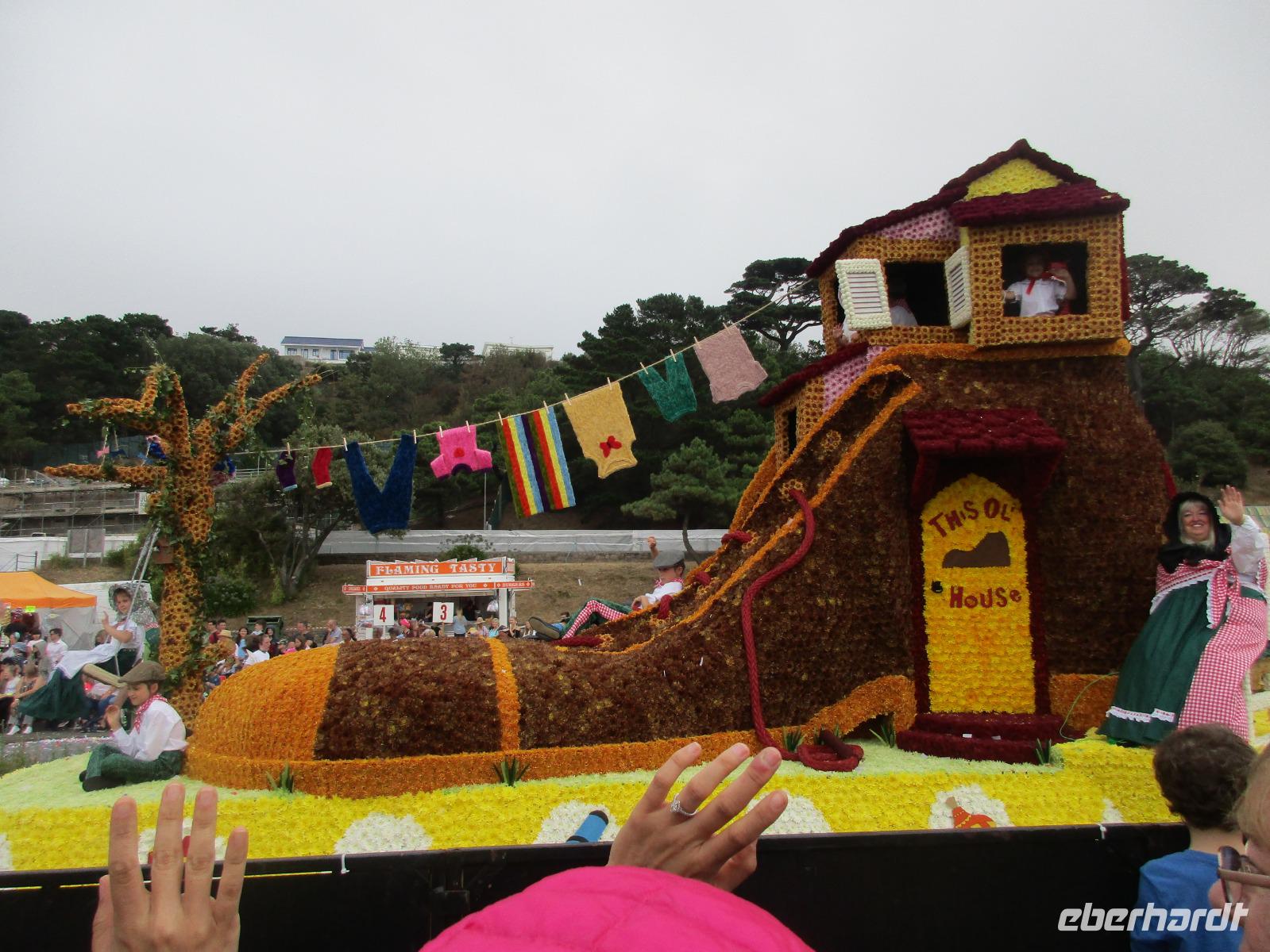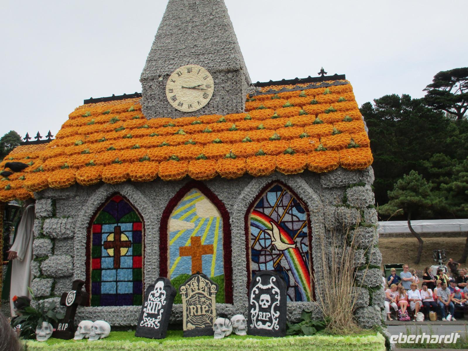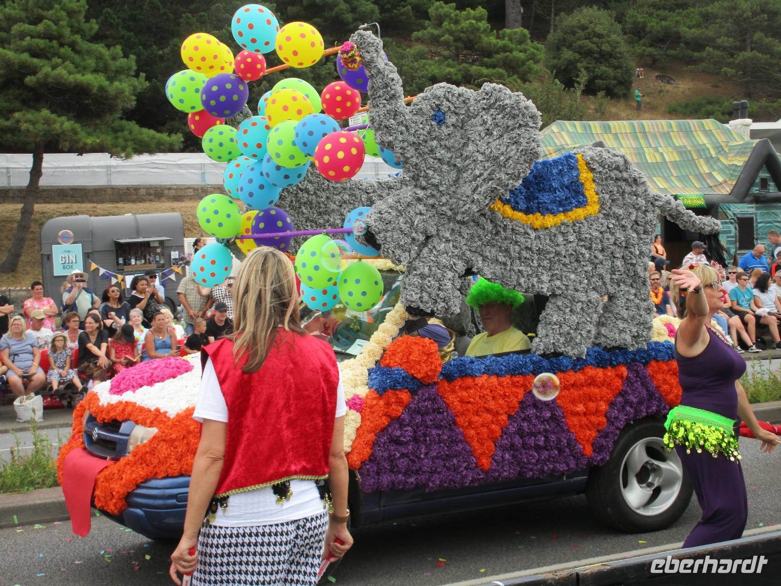 alljährlichen Blumenschau, dem absoluten Höhepunkt jeden Jahres, auf Jersey zu sein.So hatten etliche Reisegäste die Chance,für den Nachmittag einen Tribünenplatz zu buchen genutzt.Wir hatten aus der zweiten Reihe einen fantastischen Blick auf die prächtig blumengeschmückten Wagen, die jeweils unter einem bestimmten Motto sehr fantasiereich gestaltet waren.Die Fotapparate klickten unentwegt und es gelang uns nicht,herauszufinden
