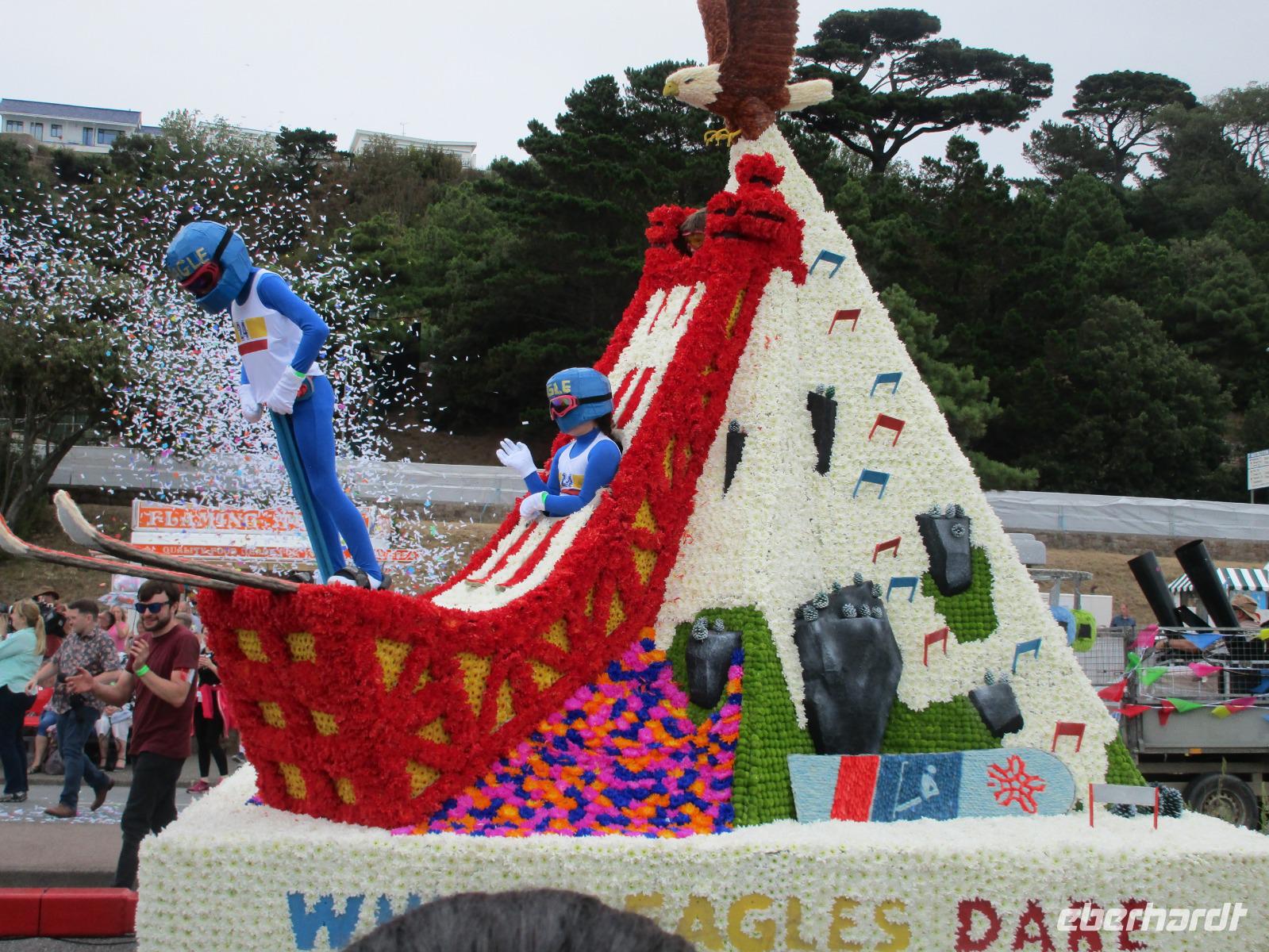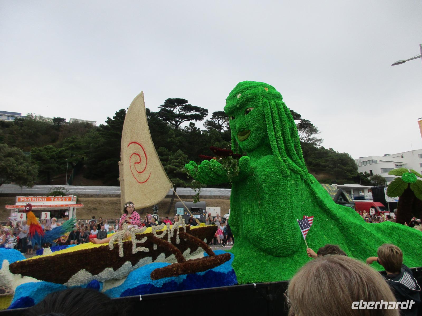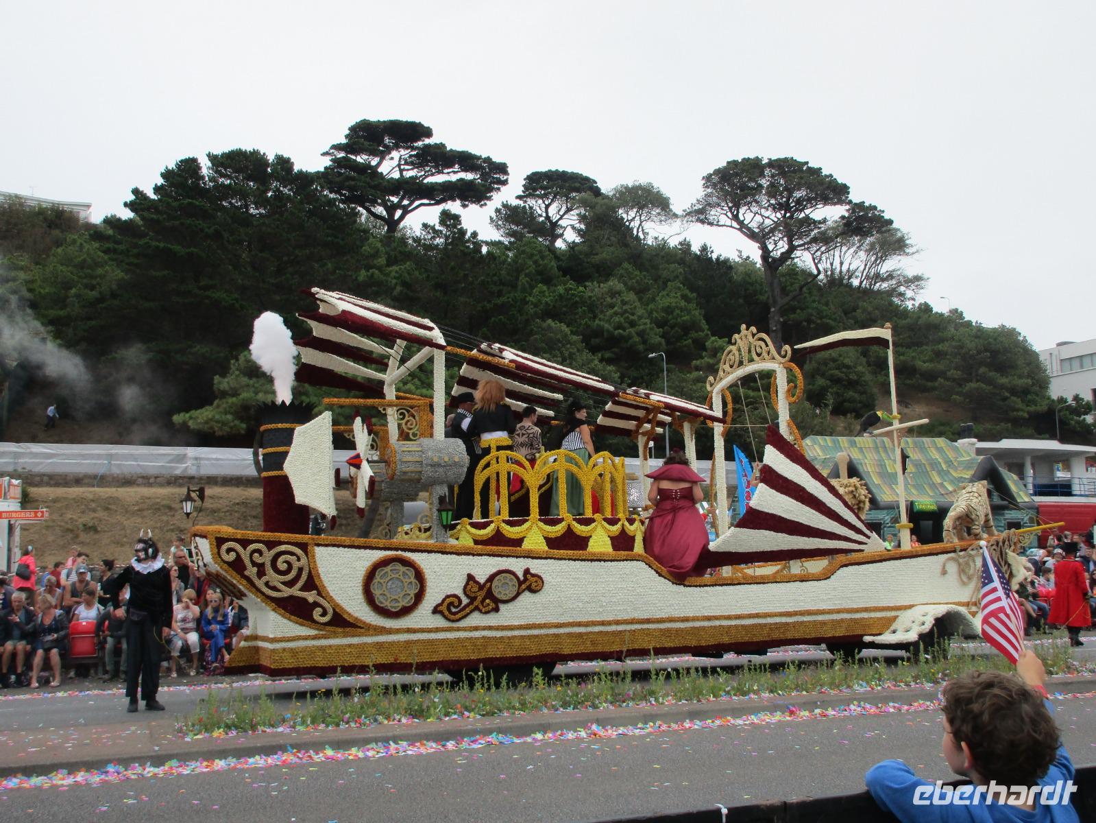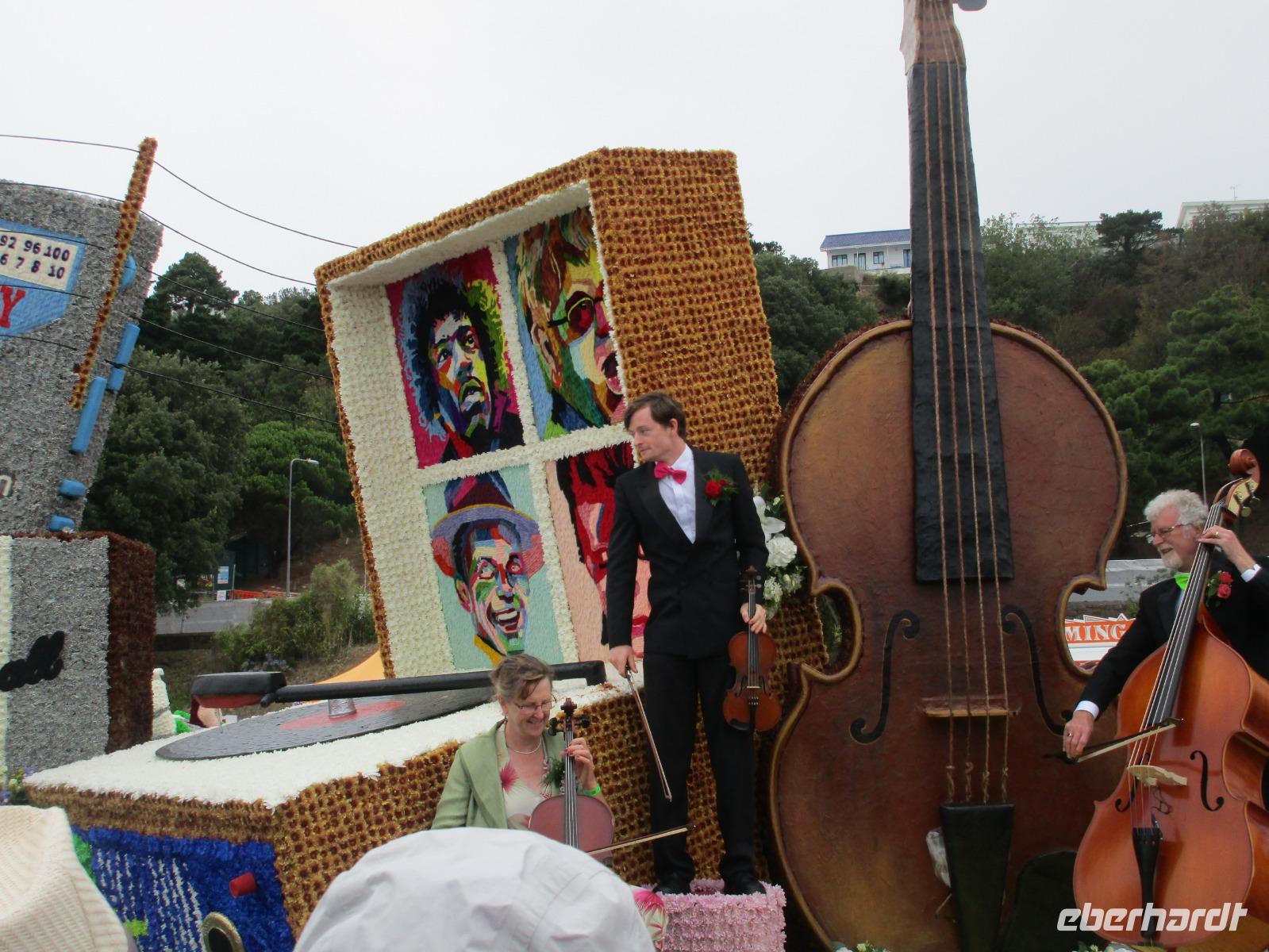 alljährlichen Blumenschau, dem absoluten Höhepunkt jeden Jahres, auf Jersey zu sein.So hatten etliche Reisegäste die Chance,für den Nachmittag einen Tribünenplatz zu buchen genutzt.Wir hatten aus der zweiten Reihe einen fantastischen Blick auf die prächtig blumengeschmückten Wagen, die jeweils unter einem bestimmten Motto sehr fantasiereich gestaltet waren.Die Fotapparate klickten unentwegt und es gelang uns nicht,herauszufinden