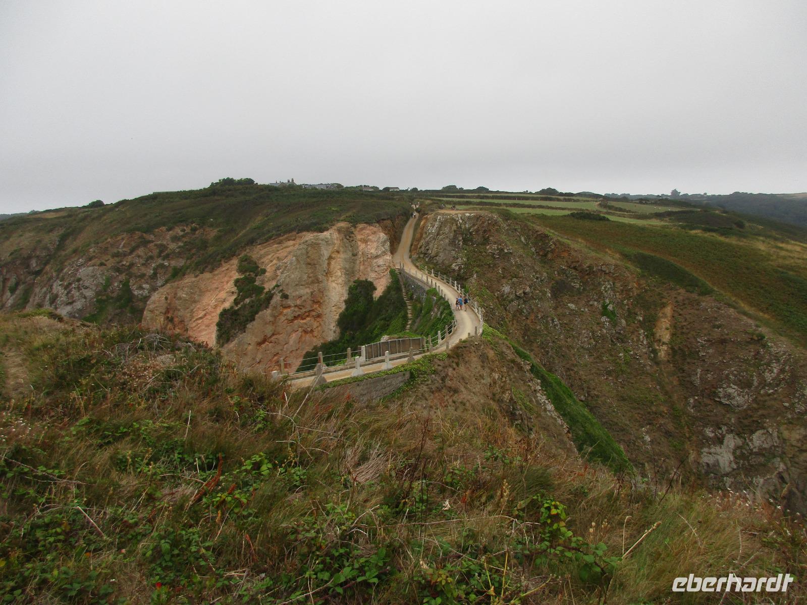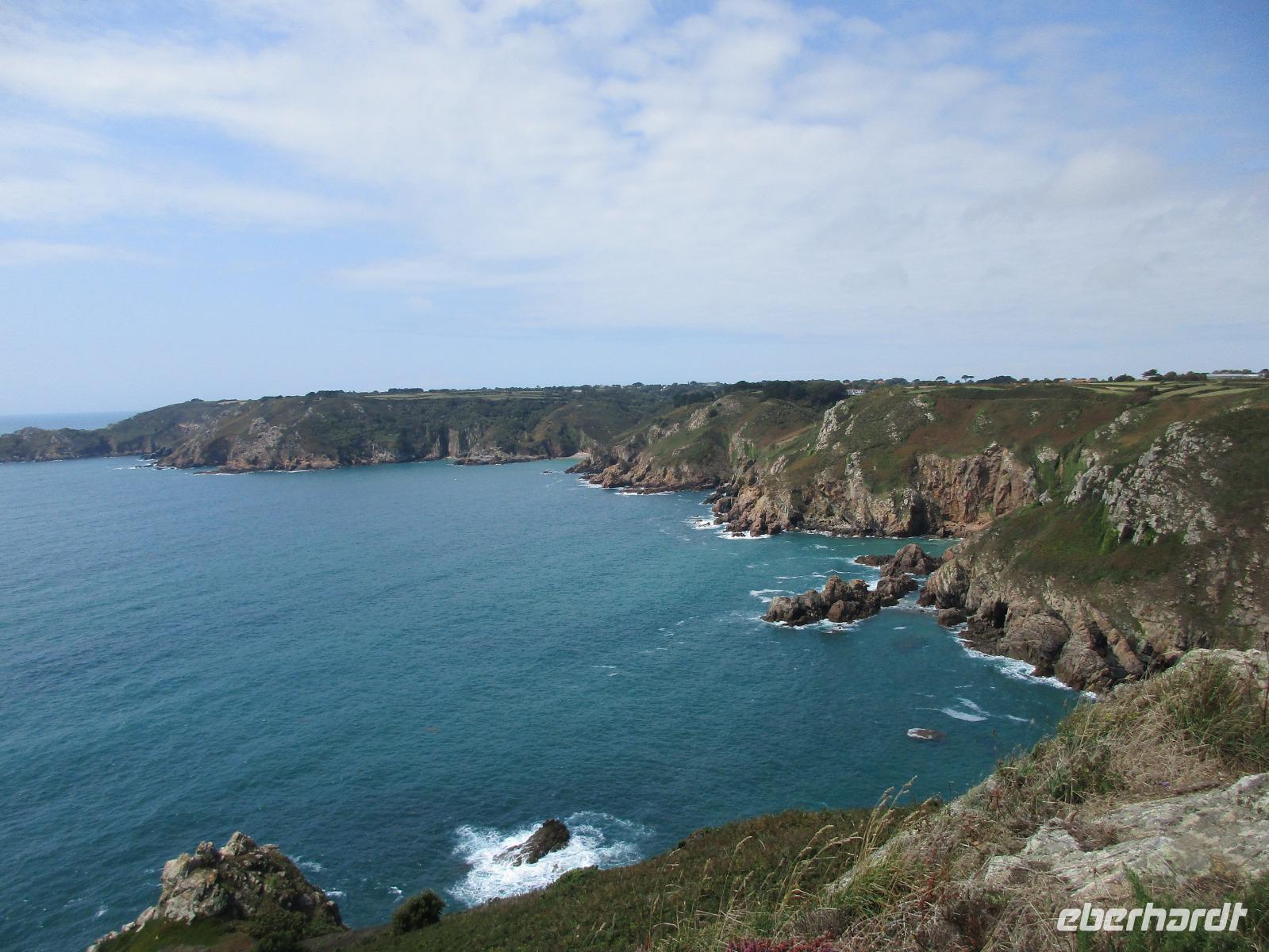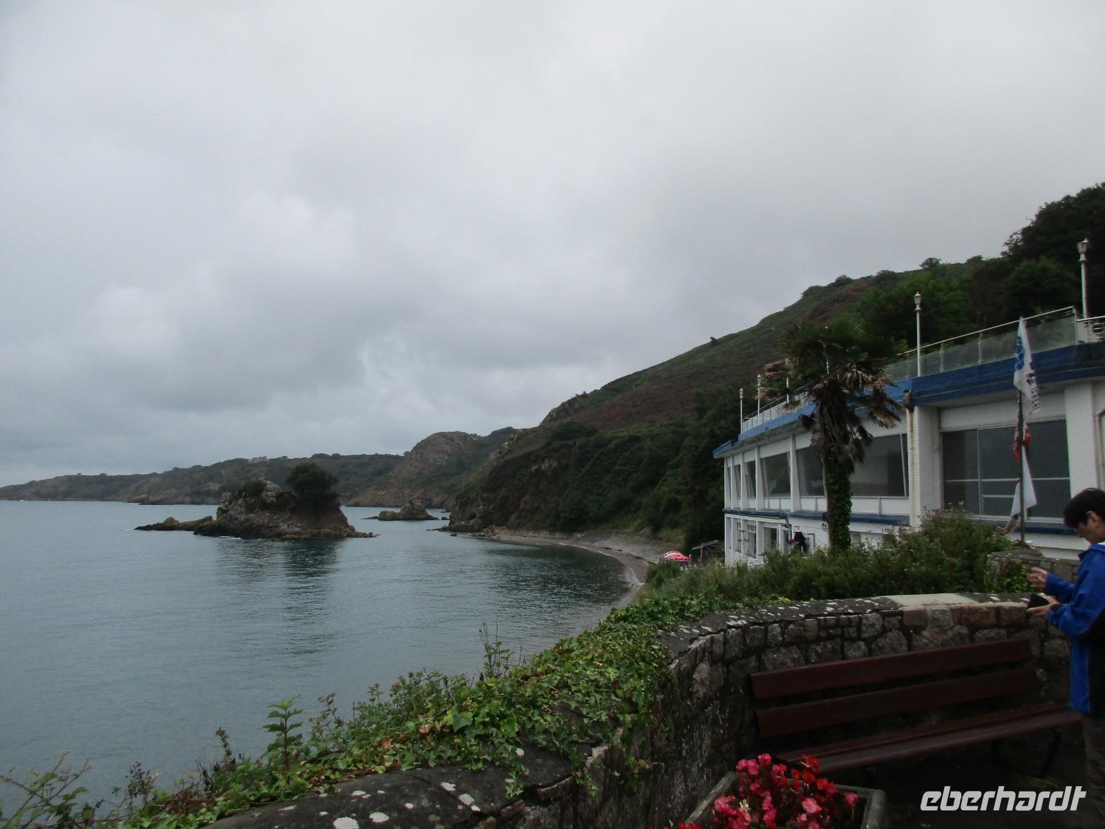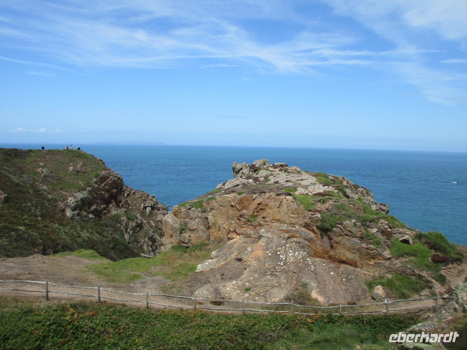 Unsere Erkundung der Insel Jersey mit dem Kleinbus begann im Süden und Südosten, wo wir am Gorey Harbour und Mount Orgueil Castle erste Fotostopps einlegten.Weiter ging`s, vorbei an Kartoffelfeldern und Weiden für die typischen Jersey-Rinder,zur Rozel Bay und der Bouley Bay im Norden.Vorbei an kleinen Ortschaften mit den für die Insel typischen Granit-Häuschen.Nach einem Stopp am höchsten Punkt der Küste erreichten wir "Devil`s Whole".Das Teufelsloch erwies sich als sehr steiler Abhang zum Meer, bot aber vom Plateau aus auch einen kleinen Wanderweg, von dem sich uns spektakuläre Blicke auf die Küste boten.Vom Piemont Point im Nordwesten kann man bis zur Insel Sark schauen.Unterwegs sahen wir Rund- und Martellotürme, auch Bunker, die größtenteils von Dünen überwuchert