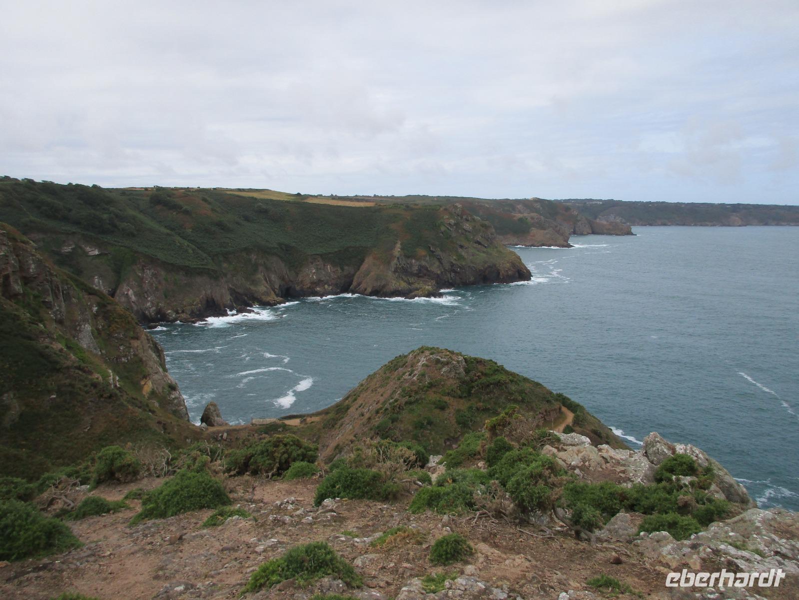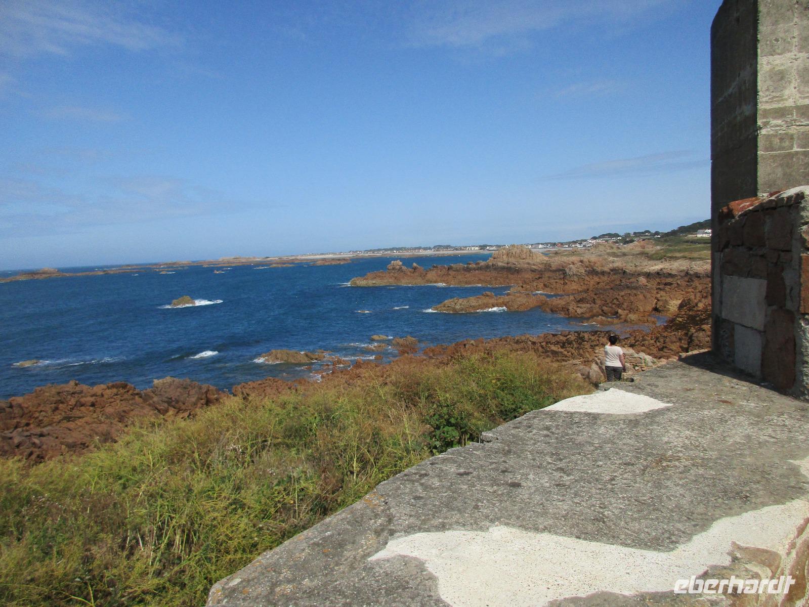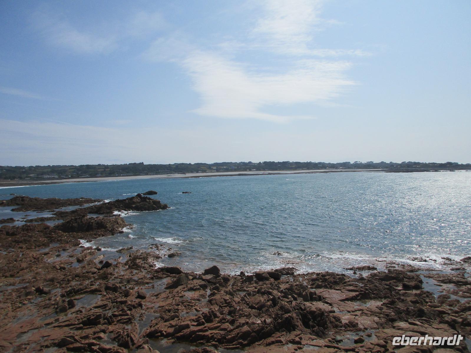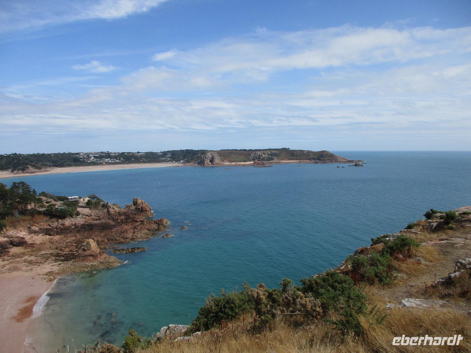 Unsere Erkundung der Insel Jersey mit dem Kleinbus begann im Süden und Südosten, wo wir am Gorey Harbour und Mount Orgueil Castle erste Fotostopps einlegten.Weiter ging`s, vorbei an Kartoffelfeldern und Weiden für die typischen Jersey-Rinder,zur Rozel Bay und der Bouley Bay im Norden.Vorbei an kleinen Ortschaften mit den für die Insel typischen Granit-Häuschen.Nach einem Stopp am höchsten Punkt der Küste erreichten wir "Devil`s Whole".Das Teufelsloch erwies sich als sehr steiler Abhang zum Meer, bot aber vom Plateau aus auch einen kleinen Wanderweg, von dem sich uns spektakuläre Blicke auf die Küste boten.Vom Piemont Point im Nordwesten kann man bis zur Insel Sark schauen.Unterwegs sahen wir Rund- und Martellotürme, auch Bunker, die größtenteils von Dünen überwuchert