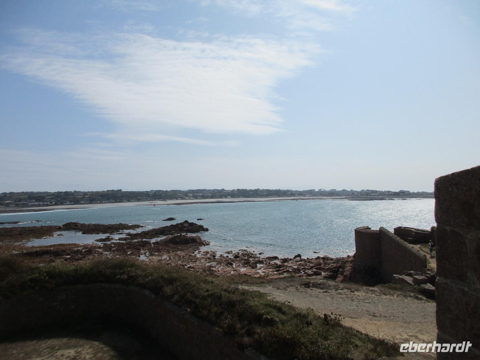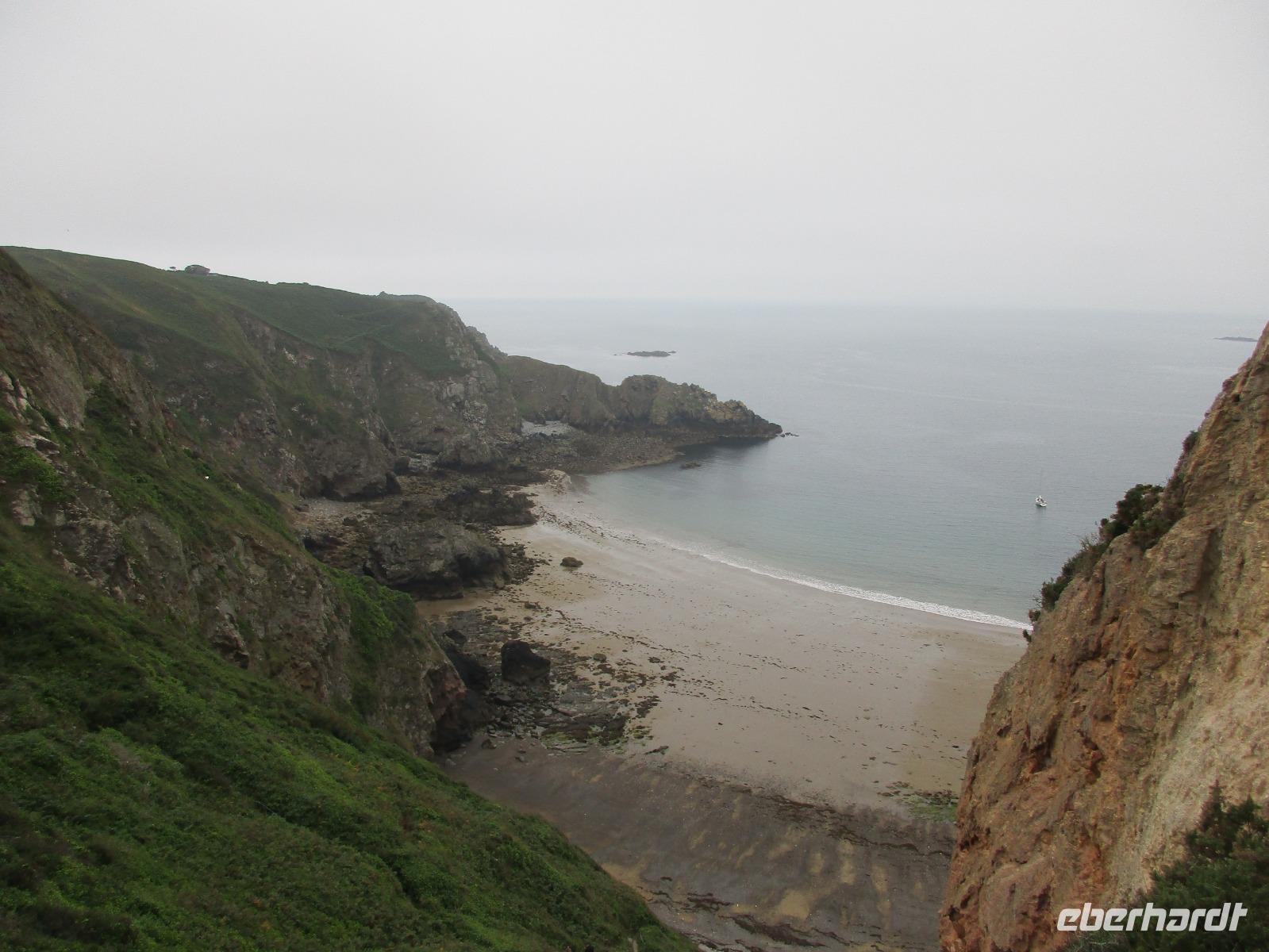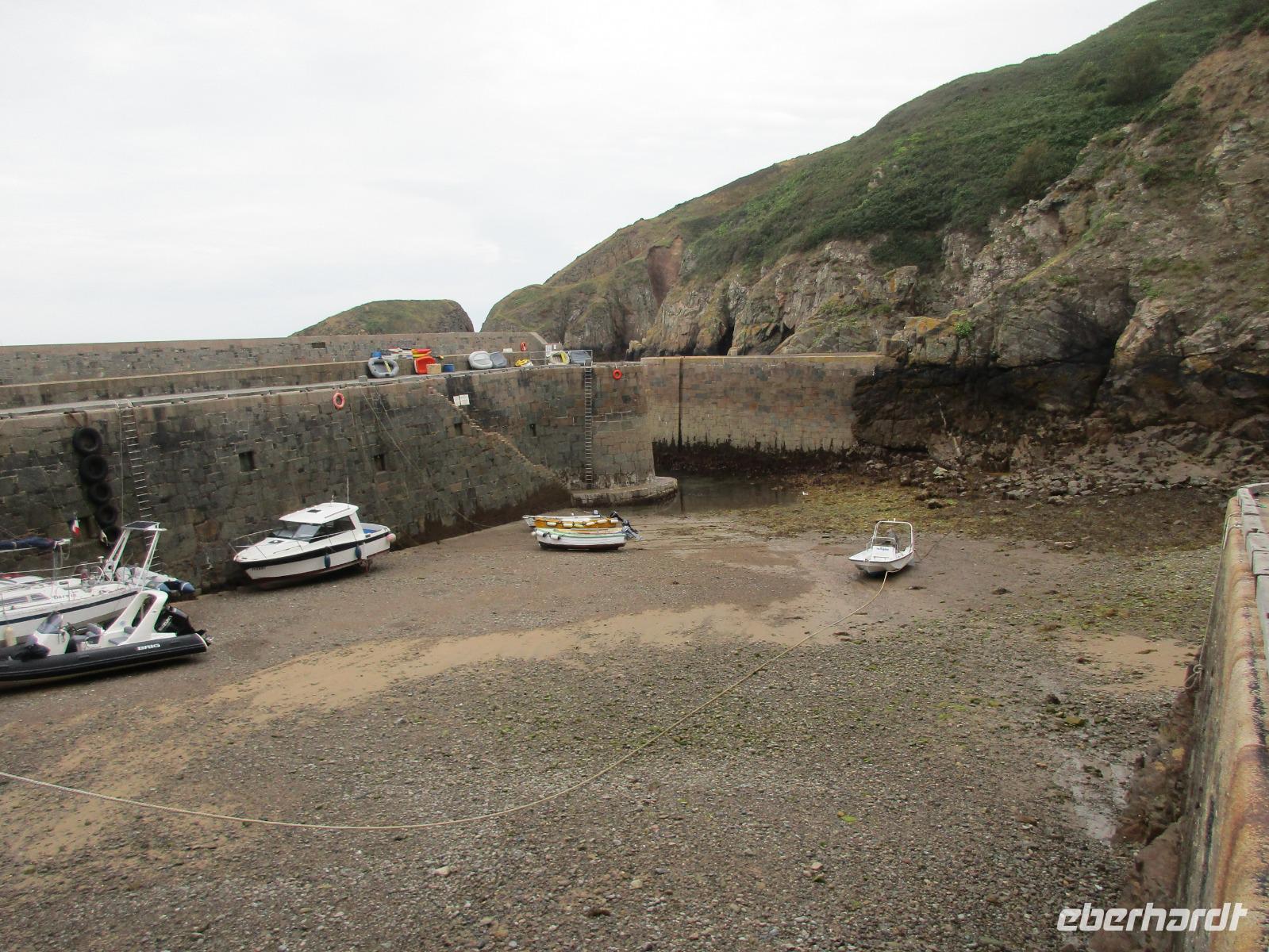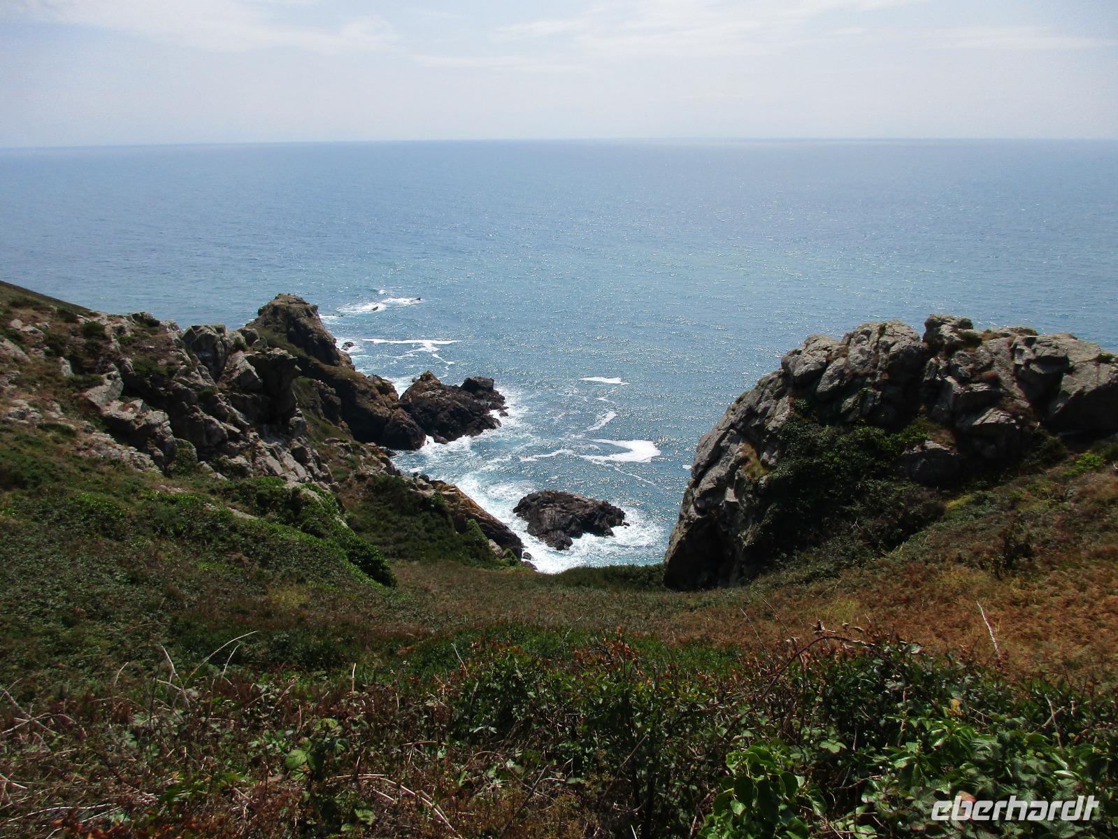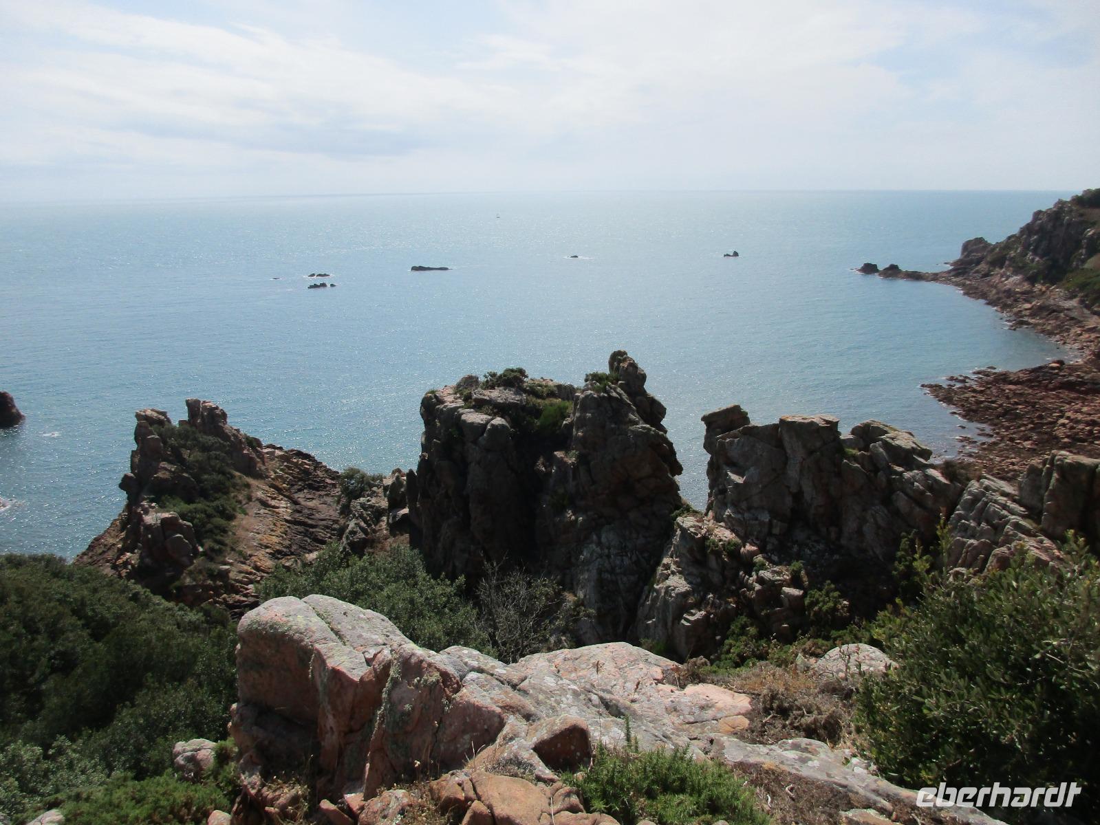 Unsere Erkundung der Insel Jersey mit dem Kleinbus begann im Süden und Südosten, wo wir am Gorey Harbour und Mount Orgueil Castle erste Fotostopps einlegten.Weiter ging`s, vorbei an Kartoffelfeldern und Weiden für die typischen Jersey-Rinder,zur Rozel Bay und der Bouley Bay im Norden.Vorbei an kleinen Ortschaften mit den für die Insel typischen Granit-Häuschen.Nach einem Stopp am höchsten Punkt der Küste erreichten wir "Devil`s Whole".Das Teufelsloch erwies sich als sehr steiler Abhang zum Meer, bot aber vom Plateau aus auch einen kleinen Wanderweg, von dem sich uns spektakuläre Blicke auf die Küste boten.Vom Piemont Point im Nordwesten kann man bis zur Insel Sark schauen.Unterwegs sahen wir Rund- und Martellotürme, auch Bunker, die größtenteils von Dünen überwuchert