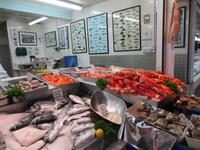 in einem Restaurant ein, dessen Spezialität Meeresfrüchte sind.Der Fisch, die Muscheln oder