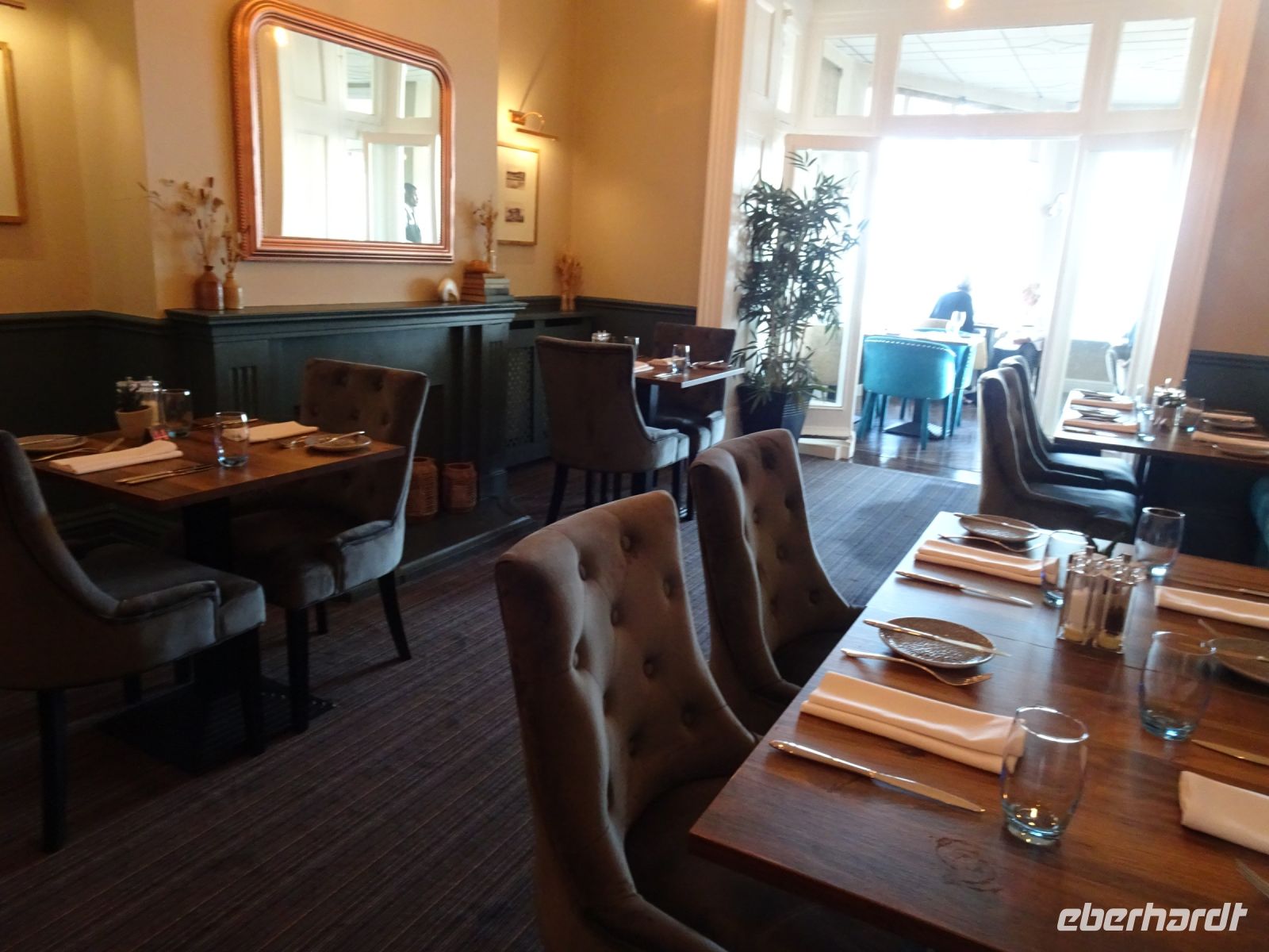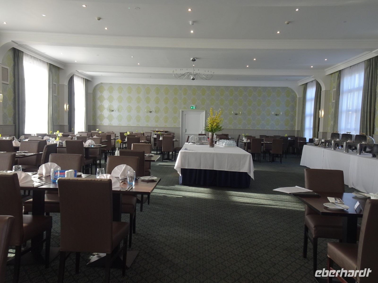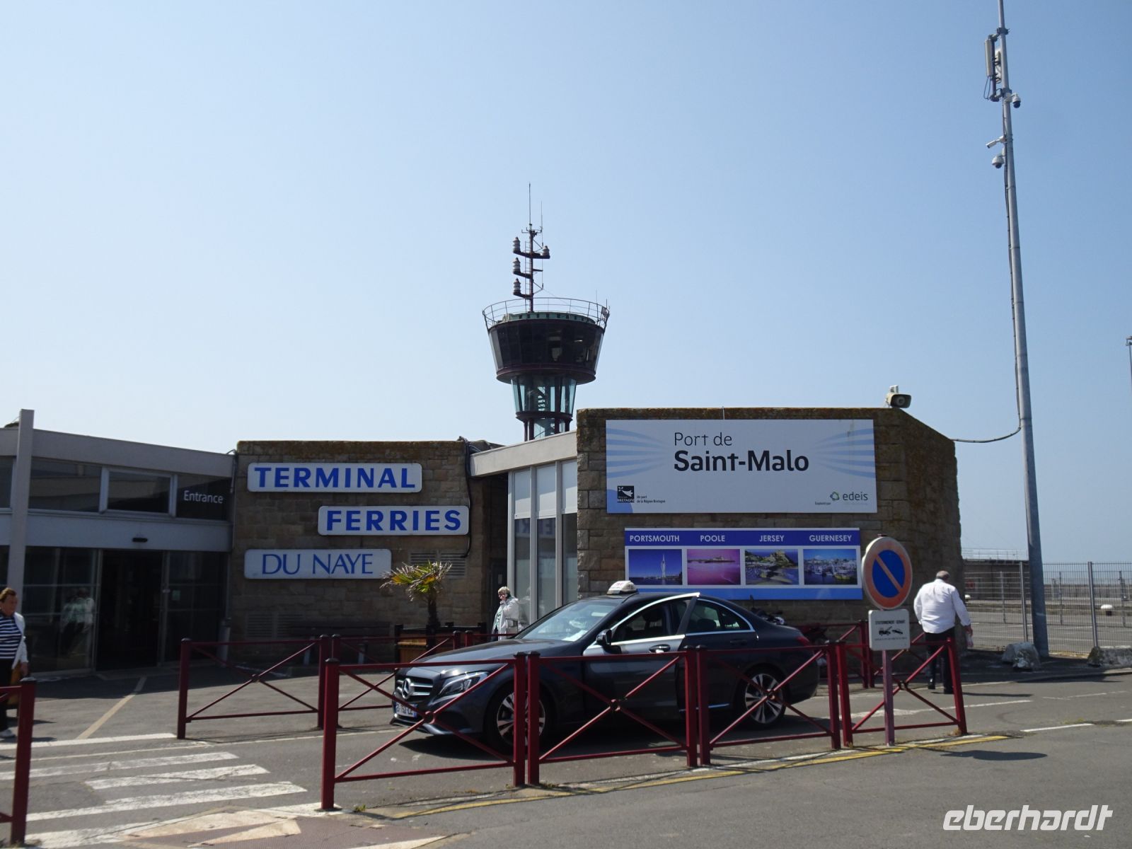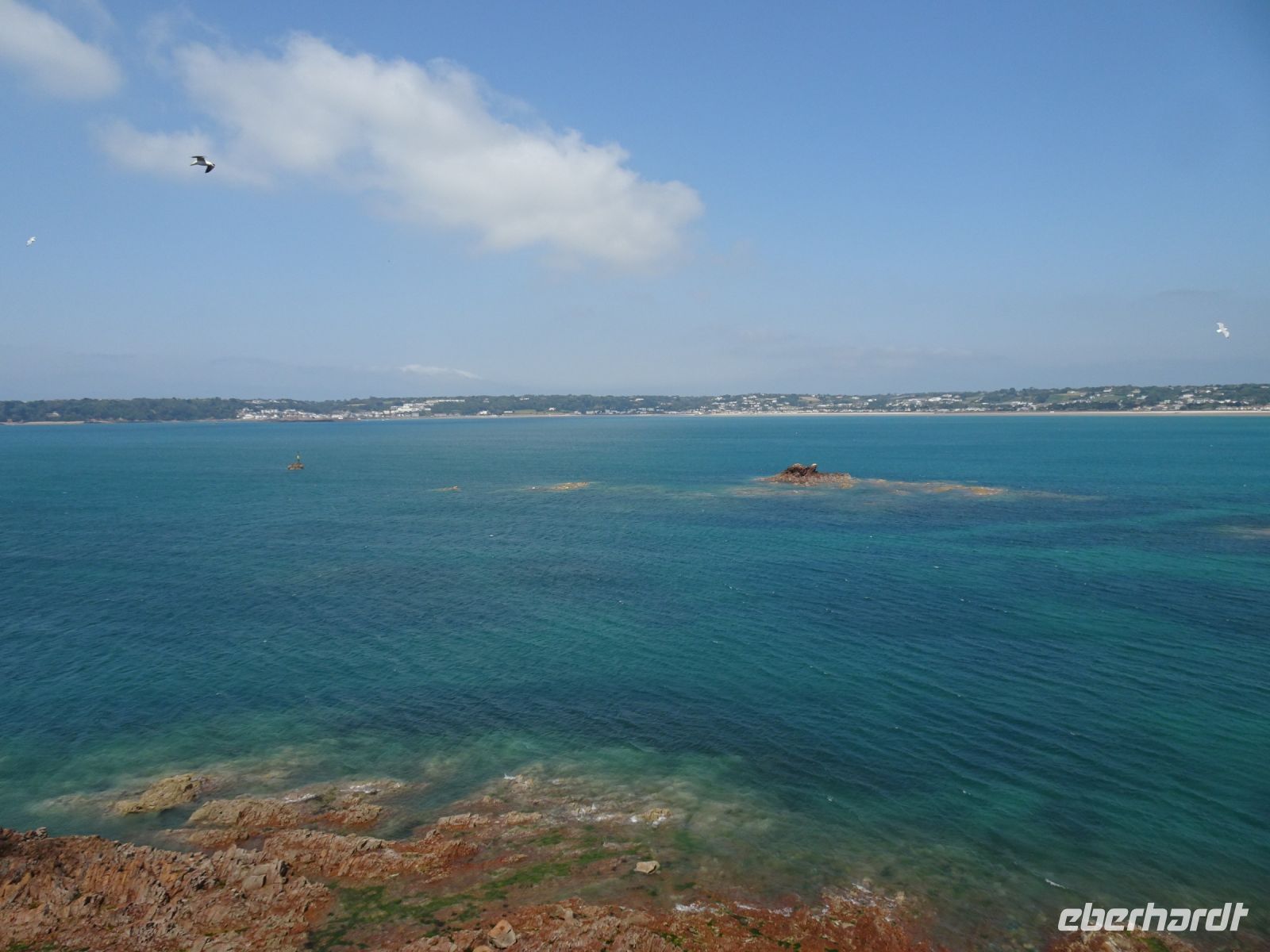 Am nächsten Morgen ging es nach einem sehr guten Frühstück weiter in Richtung der Fähre zu den Kanalinseln nach St. Malo. Am südlichen Zentrumsrand der französischen Hauptstadt Paris und an dem durch sein 24 Stundenrennen bekannten Ort Le Mans vorbei ging es ohne größere Behinderungen zu unserem Fährort St. Malo. Wir erreichten das Terminal des Fährhafens rechtzeitig, checkten unsere Koffer ein und nach einer Sicherheits- und Passkontrolle (Wir verließen den EU-Raum!!) startete unsere voll beladene Schnellfähre in Richtung der Kanalinsel Jersey. Die See war ruhig, so dass wir eine gute Überfahrt hatten. Am frühen Abend und mit einer Zeitverschiebung von einer Stunde landeten wir im Fährhafen der Insel Jersey, St. Helier, an. Von Eddi und Jane, unseren Begleitern mit zwei Kleinbussen während der nächsten Tage, wurden wir bereits erwartet. Es ging sofort weiter zu unserem Hotel Ommaroo Hotel Jersey, unserem Quartier für die nächsten 6 Nächte. Das Hotel liegt sehr günstig unmittelbar am Strand. Das Einchecken erfolgte zügig und nach einer kleinen Ruhepause erwartete uns im Speisesaal ein herrliches Buffet. Unter anderem gab es hier die berühmten Frühkartoffeln Jersey Royals – eine Delikatesse!.