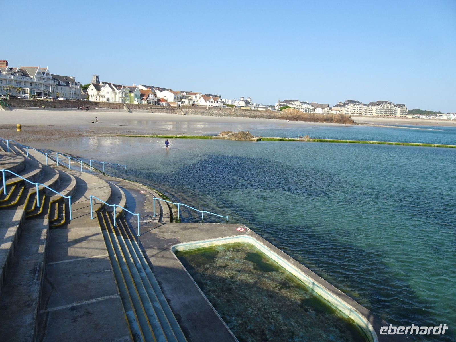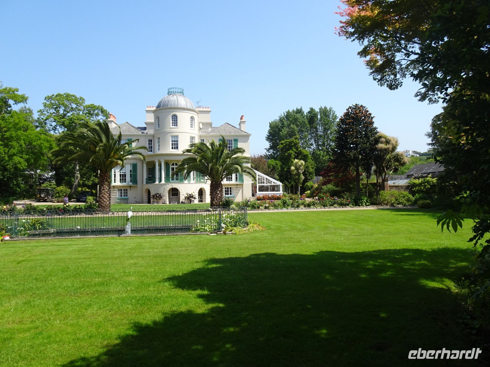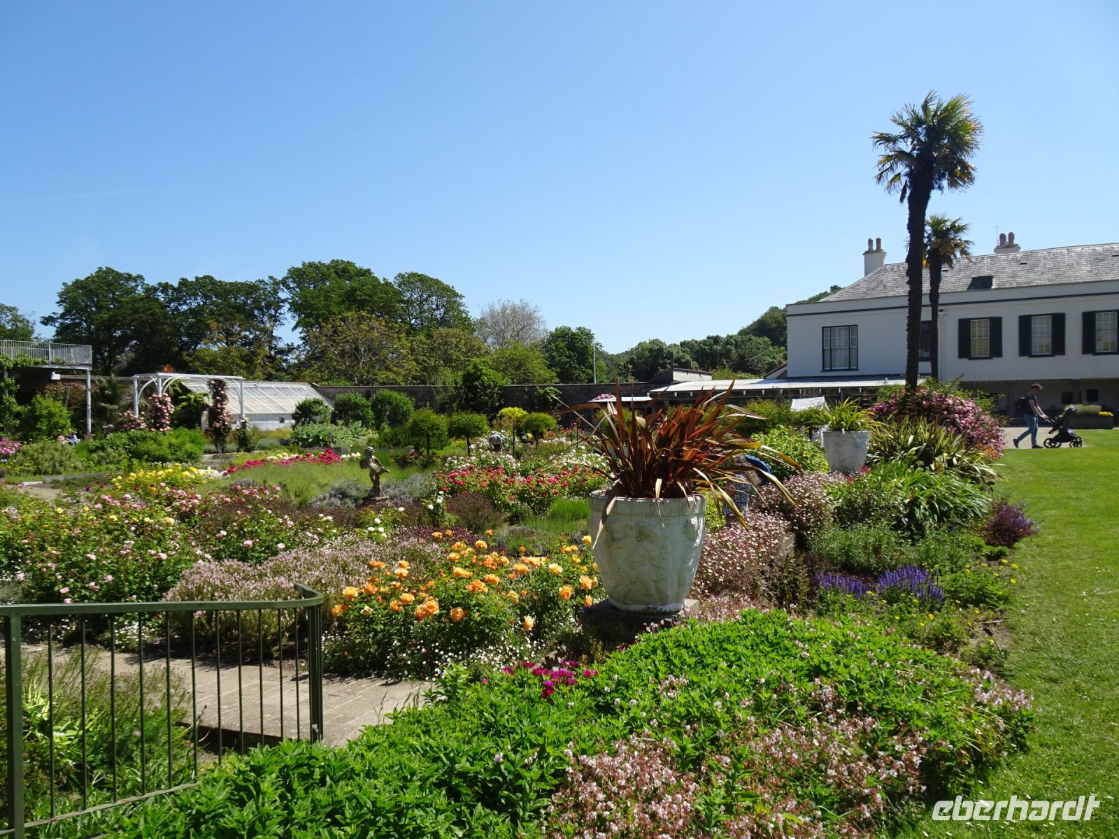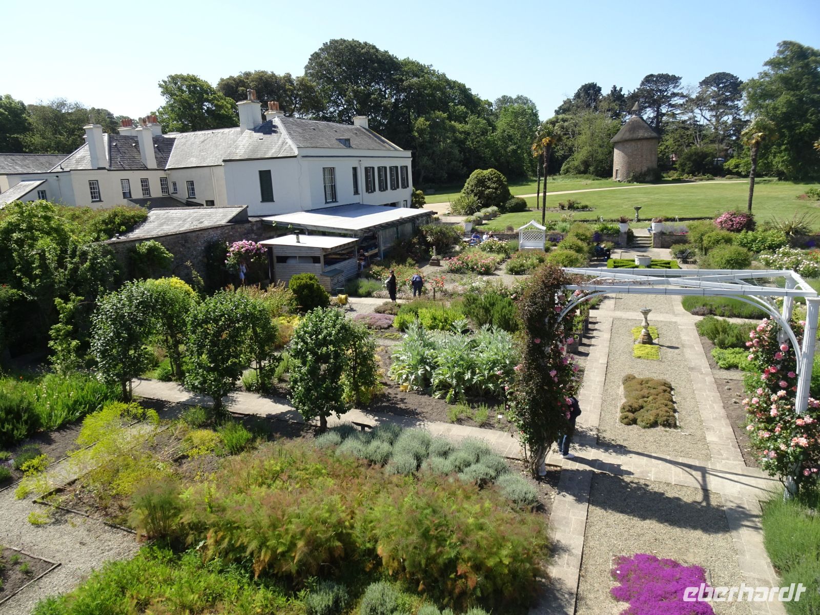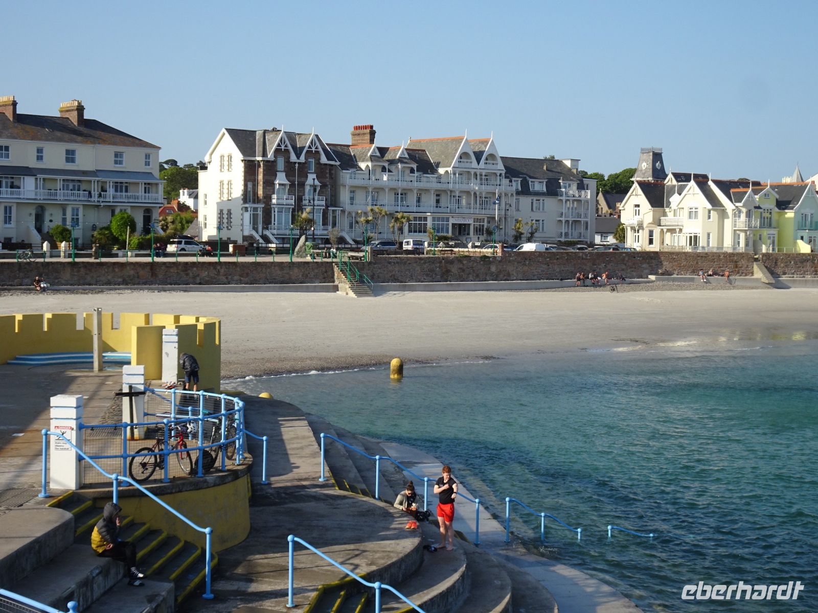 Am nächsten Tag, Sonntag dem 4 Juni, war ursprünglich ein fakultativer Ausflug zur Insel Sark vorgesehen. Leider musste dieser Ausflug wegen schlechter Wetter- und Windverhältnisse im Hafen der Insel Sark von der Reederei abgesagt werden. Es gab heftigen Nordostwind, so dass der Fährbetrieb nur im Notbetrieb und damit nicht für Touristen aufrechterhalten werden konnte. Die Gäste, die den Ausflug zur Insel Sark gebucht hatten, waren darüber sehr traurig, denn sie hatten sich sehr auf einen Ausflug auf diese urtümliche Insel gefreut. So musste ein Alternativprogramm entworfen werden: für alle Reisegäste wurde deshalb ein Besuch des Botanischen Garten Samares Manor angeboten, der nur 1 ½ km von unserem Hotel entfernt war. Zu Fuß oder mit dem Bus erreichten wir den Botanischen Garten. Nach einer kurzen Information zur Geschichte und zu den Sehenswürdigkeiten des Gartens durch unseren Reiseleiter Hartwig erkundeten wir den Garten. Ein typisches Herrenhaus, der für die lokalen Vögte (oder Seigneurs) wichtige Taubenturm aus dem 12. Jahrhundert und vielfältige Gartenbereiche waren interessante Details. Bestens gepflegt der Kräutergarten. Die umfassenden Beete mit Currypflanzen dufteten besonders stark. Besonders beeindruckt waren wir von den gewaltigen Blütenständen des Natternkopfes. Aber auch ein Japanischer Garten, ein Nutzgarten mit einer Arche, die durch Apfelbäume gebildet wurde, und natürlich umfangreich blühende Rosenbeete beeindruckten uns. Nach einem umfangreichen Rundgang Zeit, um ein Eis zu essen oder eine Tasse Kaffee in dem im Garten befindlichen Restaurant zu genießen. Anschließend ging es zu Fuß oder mit dem Bus zurück in die Innenstadt. Da Sonntag war, konnten wir nur einige Sehenswürdigkeiten, wie die Kingstreet, den Paradeplatz, den zentralen Freiheitsplatz und natürlich die Strandpromenade besuchen. Danach war ausreichend Zeit für gastronomische Erlebnisse oder Erkundungen auf eigene Faust. Das Wetter spielte sehr gut mit. Eine ständige leichte Brise und viel Sonnenschein sind typisch für die Kanalinseln. Am Abend trafen wir uns zum Abendessen wieder in unserem Hotel Ommaroo. Einige Reisegäste nutzen vor dem Abendessen noch das kleine Schwimmbad am Hotel, andere nutzten das naheliegende Strandbad, das bereits im Jahre 1926 als eines der ersten Meeresschwimmbäder errichtet wurde.