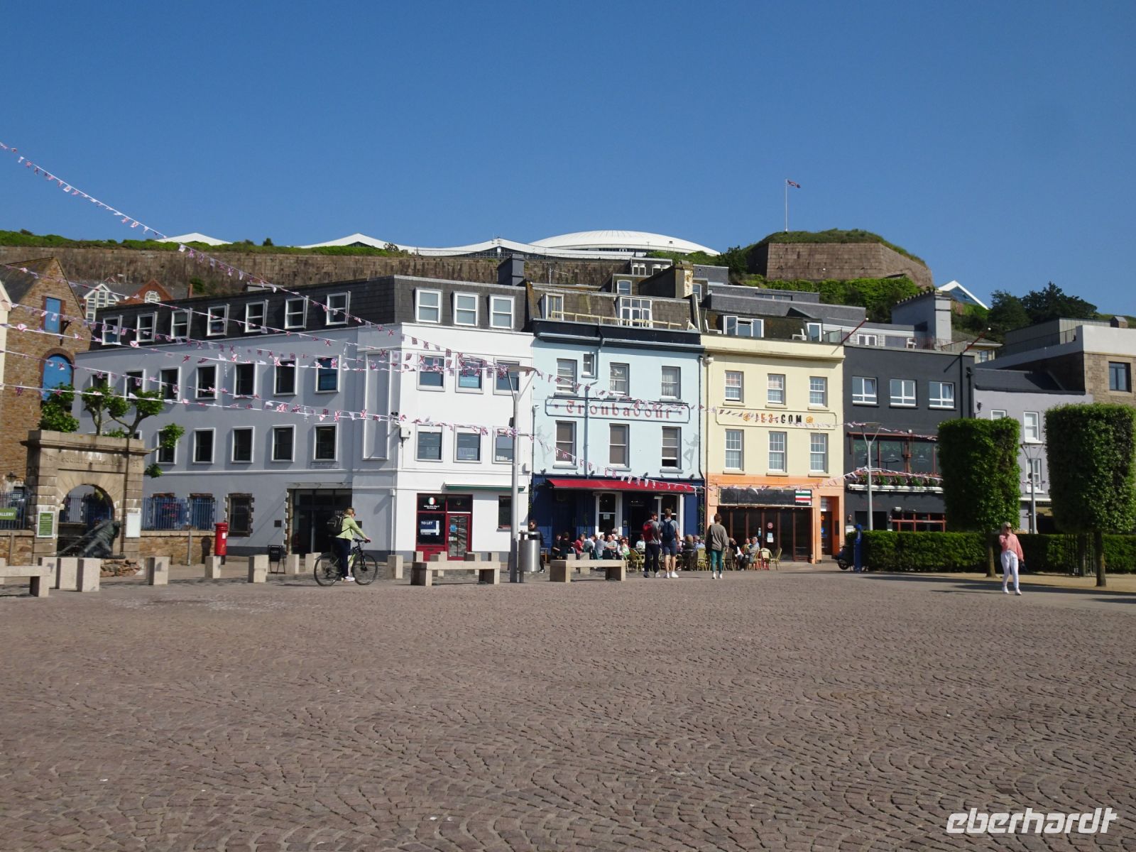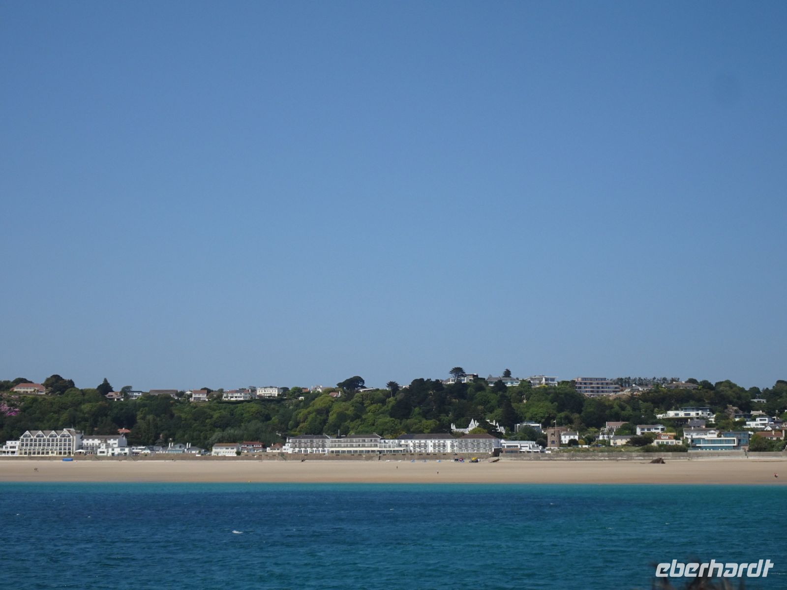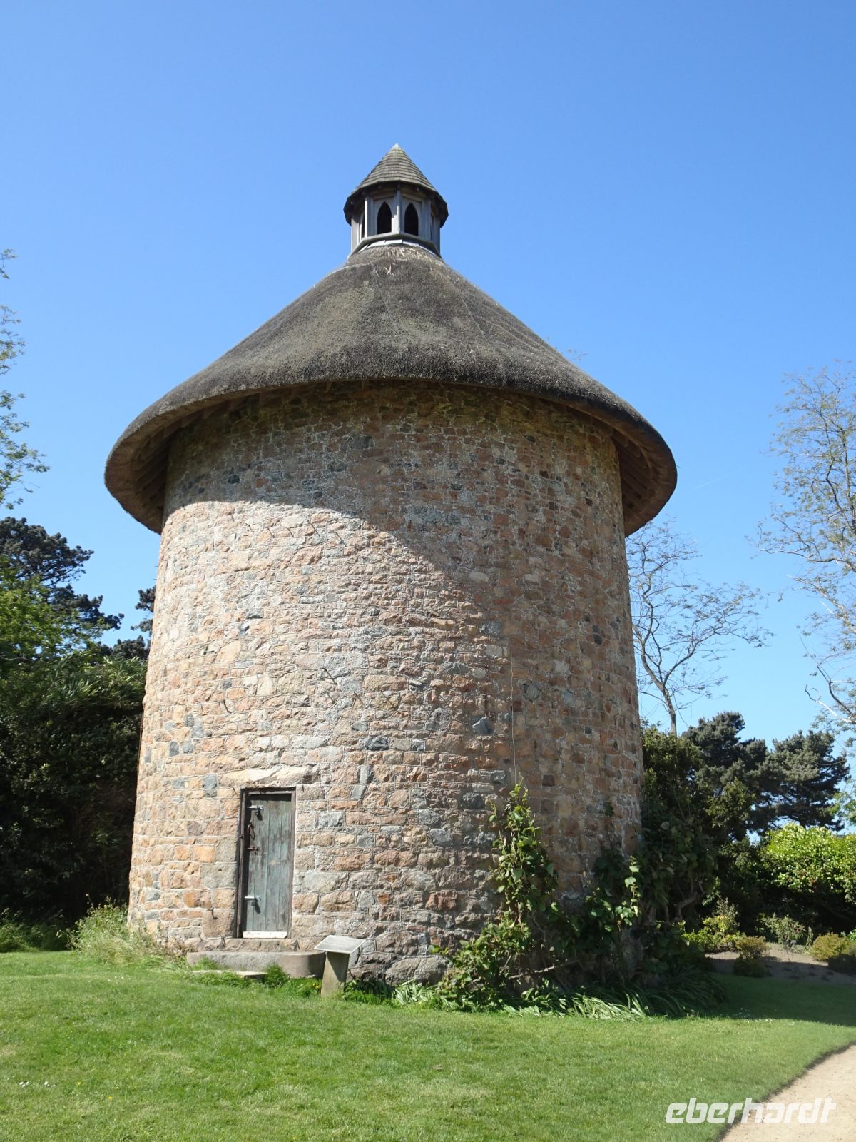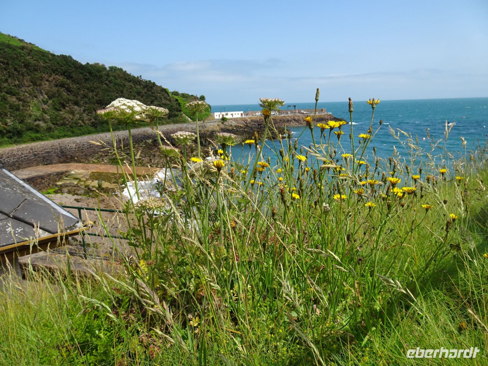 Am nächsten Tag, Sonntag dem 4 Juni, war ursprünglich ein fakultativer Ausflug zur Insel Sark vorgesehen. Leider musste dieser Ausflug wegen schlechter Wetter- und Windverhältnisse im Hafen der Insel Sark von der Reederei abgesagt werden. Es gab heftigen Nordostwind, so dass der Fährbetrieb nur im Notbetrieb und damit nicht für Touristen aufrechterhalten werden konnte. Die Gäste, die den Ausflug zur Insel Sark gebucht hatten, waren darüber sehr traurig, denn sie hatten sich sehr auf einen Ausflug auf diese urtümliche Insel gefreut. So musste ein Alternativprogramm entworfen werden: für alle Reisegäste wurde deshalb ein Besuch des Botanischen Garten Samares Manor angeboten, der nur 1 ½ km von unserem Hotel entfernt war. Zu Fuß oder mit dem Bus erreichten wir den Botanischen Garten. Nach einer kurzen Information zur Geschichte und zu den Sehenswürdigkeiten des Gartens durch unseren Reiseleiter Hartwig erkundeten wir den Garten. Ein typisches Herrenhaus, der für die lokalen Vögte (oder Seigneurs) wichtige Taubenturm aus dem 12. Jahrhundert und vielfältige Gartenbereiche waren interessante Details. Bestens gepflegt der Kräutergarten. Die umfassenden Beete mit Currypflanzen dufteten besonders stark. Besonders beeindruckt waren wir von den gewaltigen Blütenständen des Natternkopfes. Aber auch ein Japanischer Garten, ein Nutzgarten mit einer Arche, die durch Apfelbäume gebildet wurde, und natürlich umfangreich blühende Rosenbeete beeindruckten uns. Nach einem umfangreichen Rundgang Zeit, um ein Eis zu essen oder eine Tasse Kaffee in dem im Garten befindlichen Restaurant zu genießen. Anschließend ging es zu Fuß oder mit dem Bus zurück in die Innenstadt. Da Sonntag war, konnten wir nur einige Sehenswürdigkeiten, wie die Kingstreet, den Paradeplatz, den zentralen Freiheitsplatz und natürlich die Strandpromenade besuchen. Danach war ausreichend Zeit für gastronomische Erlebnisse oder Erkundungen auf eigene Faust. Das Wetter spielte sehr gut mit. Eine ständige leichte Brise und viel Sonnenschein sind typisch für die Kanalinseln. Am Abend trafen wir uns zum Abendessen wieder in unserem Hotel Ommaroo. Einige Reisegäste nutzen vor dem Abendessen noch das kleine Schwimmbad am Hotel, andere nutzten das naheliegende Strandbad, das bereits im Jahre 1926 als eines der ersten Meeresschwimmbäder errichtet wurde.