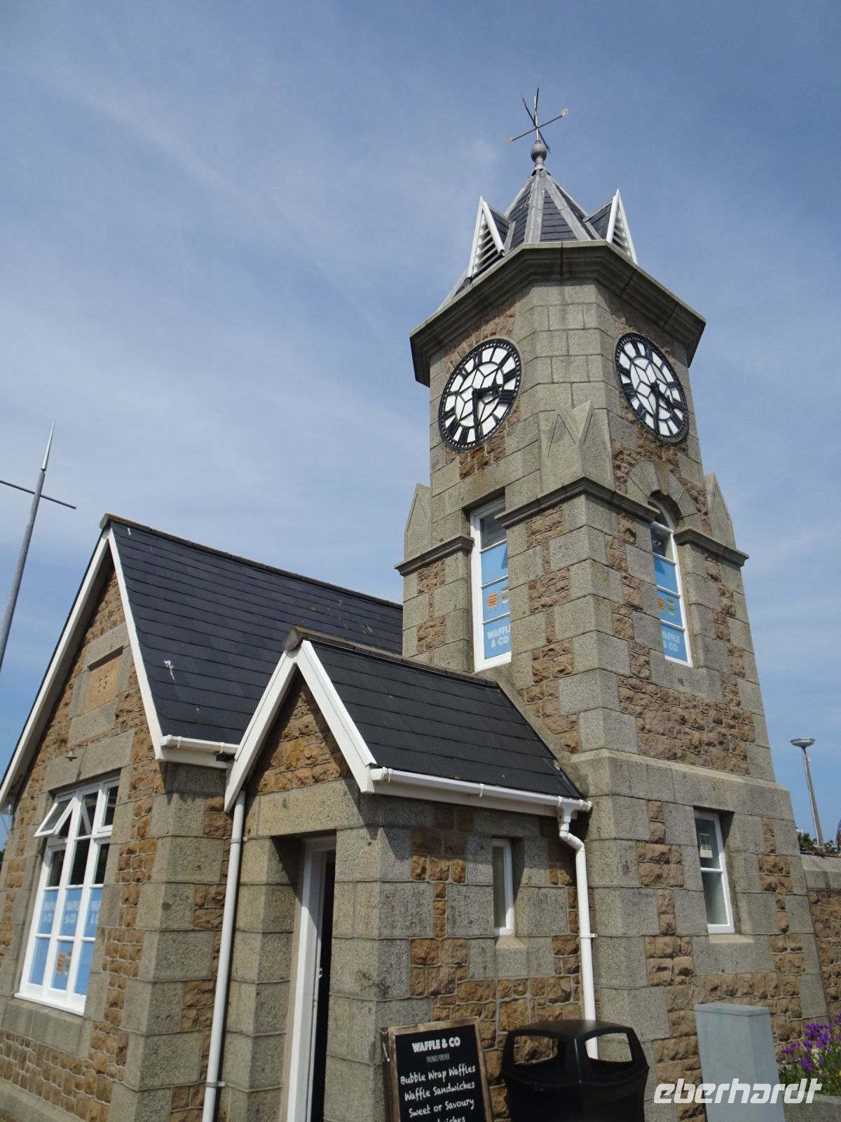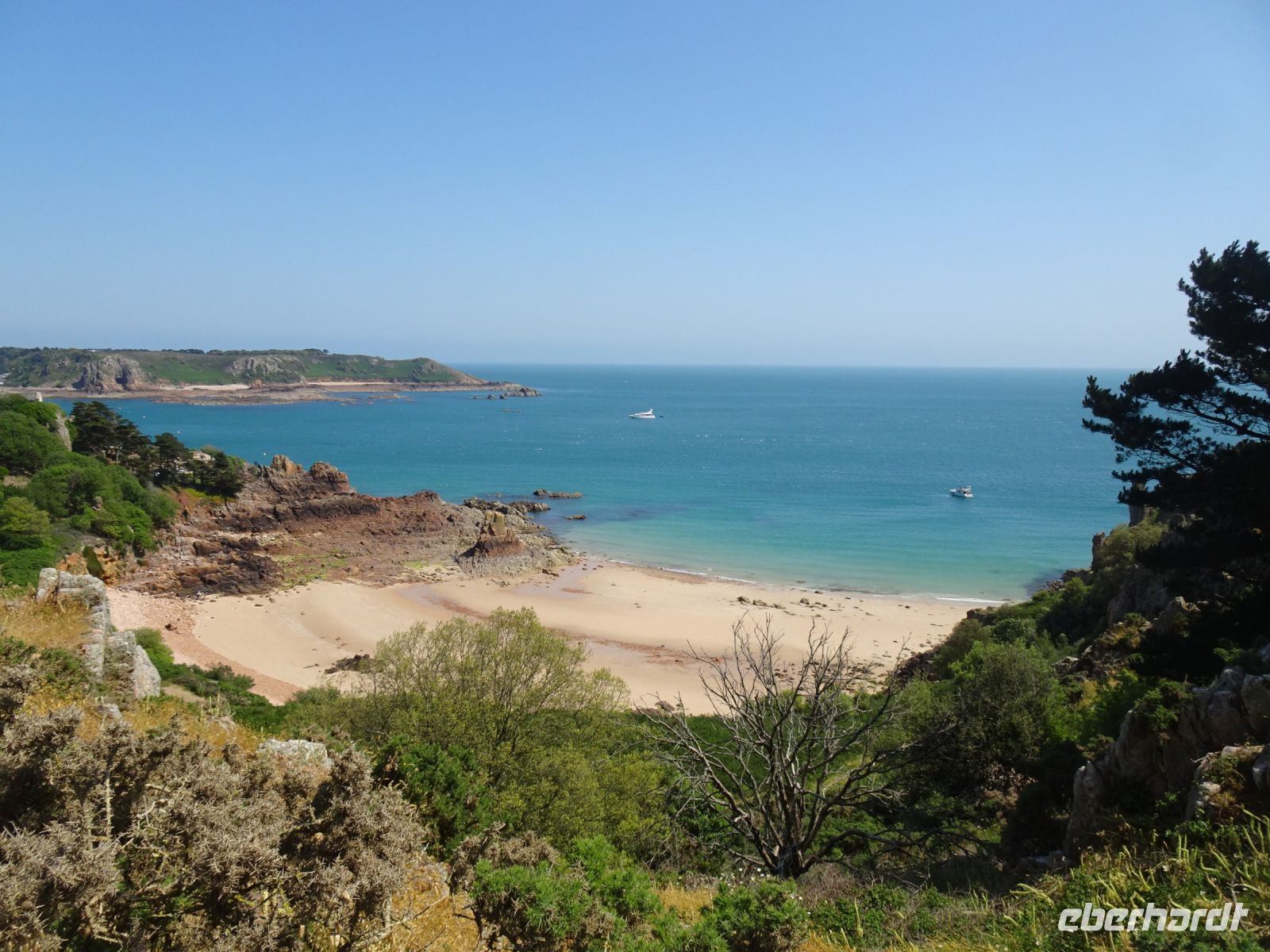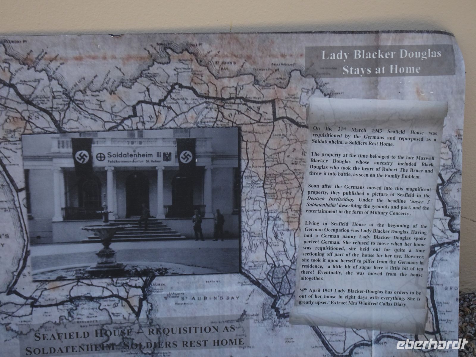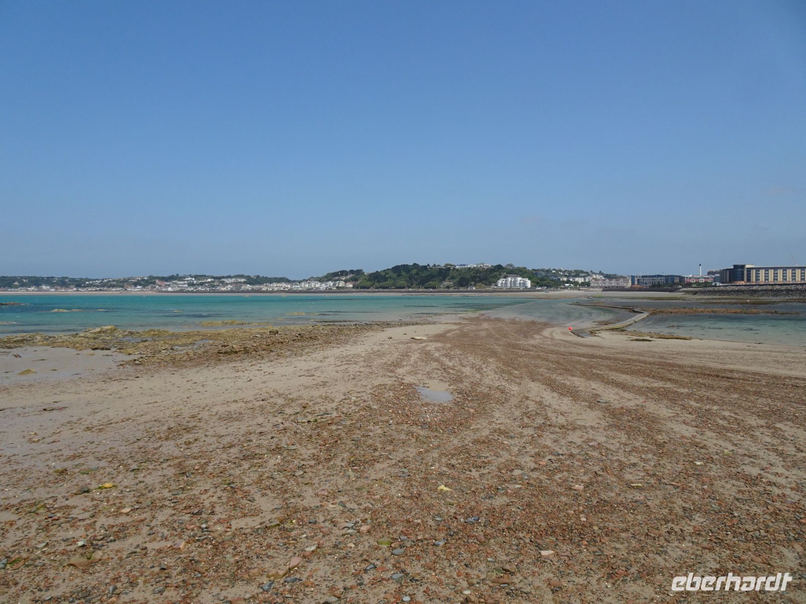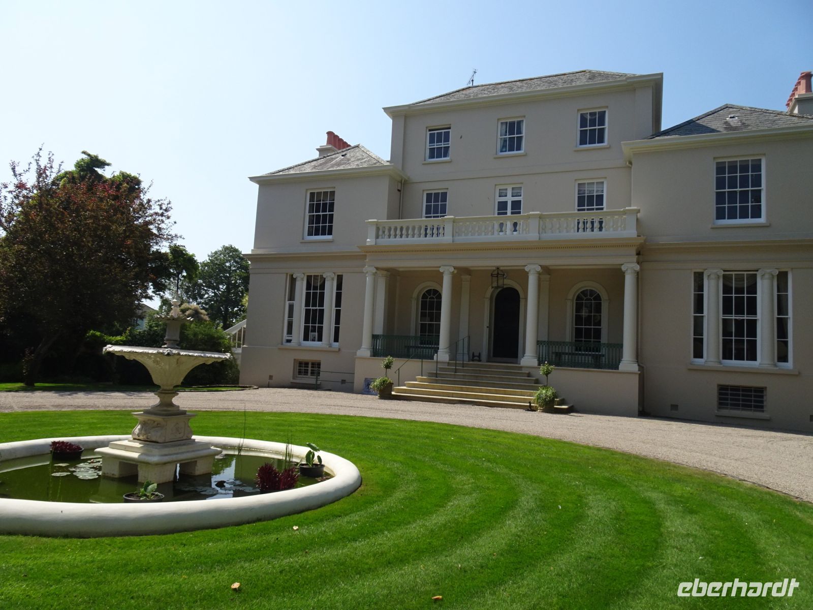 Am nächsten Tag, Sonntag dem 4 Juni, war ursprünglich ein fakultativer Ausflug zur Insel Sark vorgesehen. Leider musste dieser Ausflug wegen schlechter Wetter- und Windverhältnisse im Hafen der Insel Sark von der Reederei abgesagt werden. Es gab heftigen Nordostwind, so dass der Fährbetrieb nur im Notbetrieb und damit nicht für Touristen aufrechterhalten werden konnte. Die Gäste, die den Ausflug zur Insel Sark gebucht hatten, waren darüber sehr traurig, denn sie hatten sich sehr auf einen Ausflug auf diese urtümliche Insel gefreut. So musste ein Alternativprogramm entworfen werden: für alle Reisegäste wurde deshalb ein Besuch des Botanischen Garten Samares Manor angeboten, der nur 1 ½ km von unserem Hotel entfernt war. Zu Fuß oder mit dem Bus erreichten wir den Botanischen Garten. Nach einer kurzen Information zur Geschichte und zu den Sehenswürdigkeiten des Gartens durch unseren Reiseleiter Hartwig erkundeten wir den Garten. Ein typisches Herrenhaus, der für die lokalen Vögte (oder Seigneurs) wichtige Taubenturm aus dem 12. Jahrhundert und vielfältige Gartenbereiche waren interessante Details. Bestens gepflegt der Kräutergarten. Die umfassenden Beete mit Currypflanzen dufteten besonders stark. Besonders beeindruckt waren wir von den gewaltigen Blütenständen des Natternkopfes. Aber auch ein Japanischer Garten, ein Nutzgarten mit einer Arche, die durch Apfelbäume gebildet wurde, und natürlich umfangreich blühende Rosenbeete beeindruckten uns. Nach einem umfangreichen Rundgang Zeit, um ein Eis zu essen oder eine Tasse Kaffee in dem im Garten befindlichen Restaurant zu genießen. Anschließend ging es zu Fuß oder mit dem Bus zurück in die Innenstadt. Da Sonntag war, konnten wir nur einige Sehenswürdigkeiten, wie die Kingstreet, den Paradeplatz, den zentralen Freiheitsplatz und natürlich die Strandpromenade besuchen. Danach war ausreichend Zeit für gastronomische Erlebnisse oder Erkundungen auf eigene Faust. Das Wetter spielte sehr gut mit. Eine ständige leichte Brise und viel Sonnenschein sind typisch für die Kanalinseln. Am Abend trafen wir uns zum Abendessen wieder in unserem Hotel Ommaroo. Einige Reisegäste nutzen vor dem Abendessen noch das kleine Schwimmbad am Hotel, andere nutzten das naheliegende Strandbad, das bereits im Jahre 1926 als eines der ersten Meeresschwimmbäder errichtet wurde.