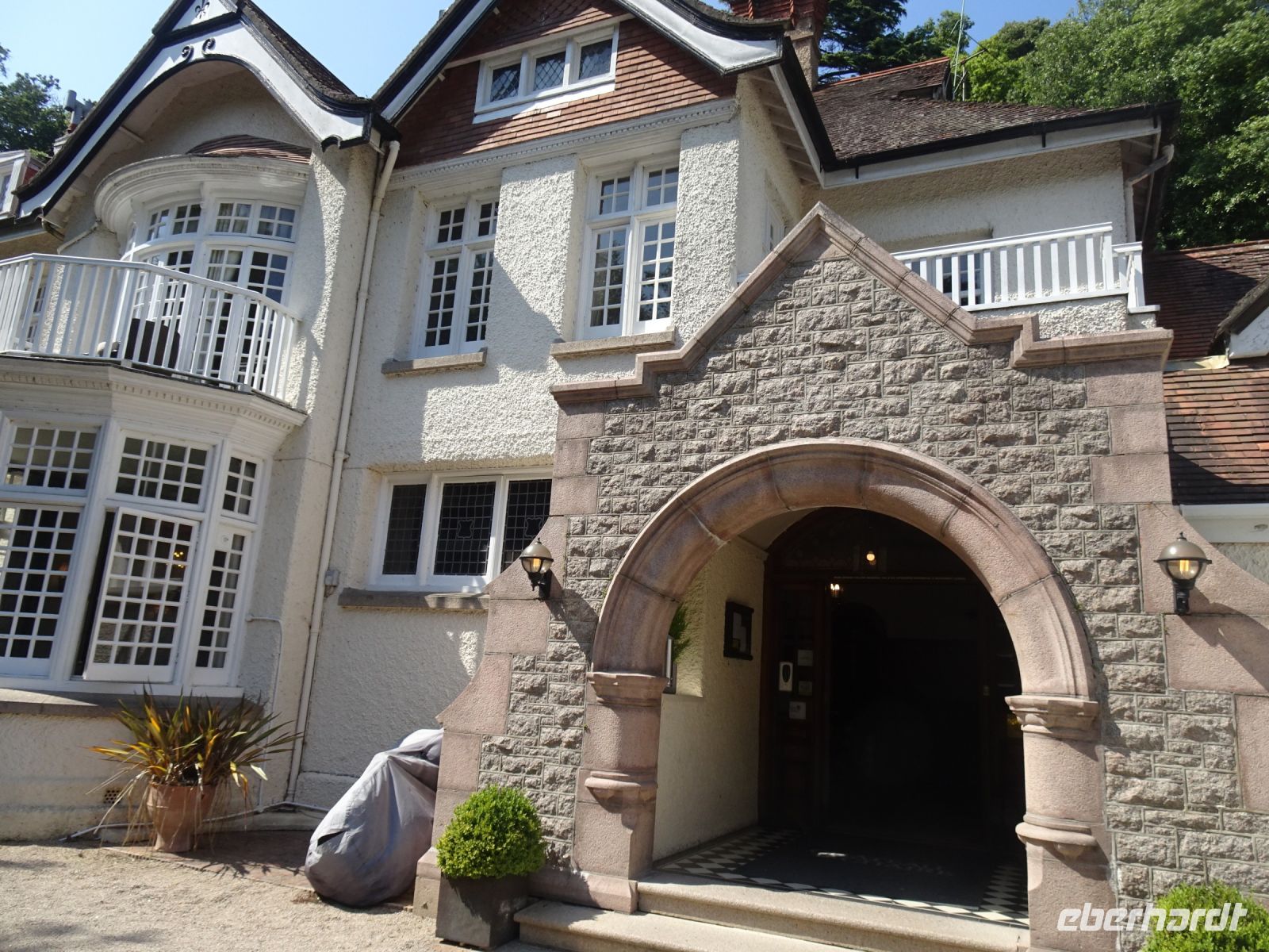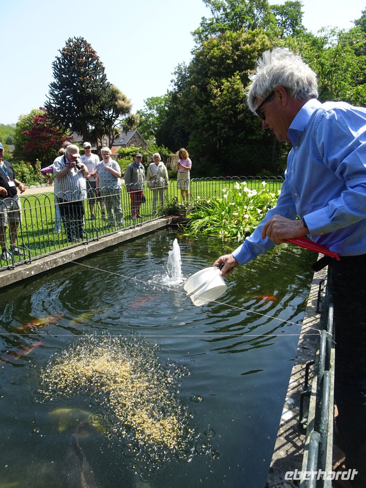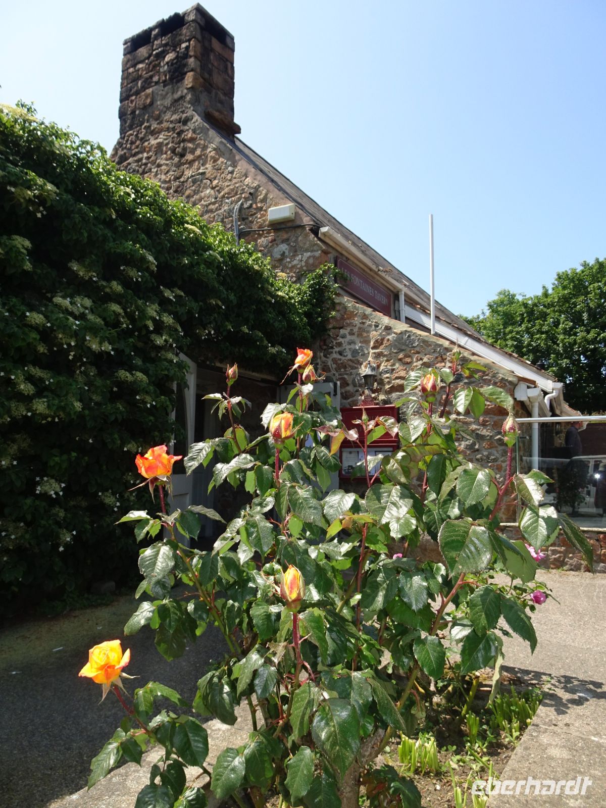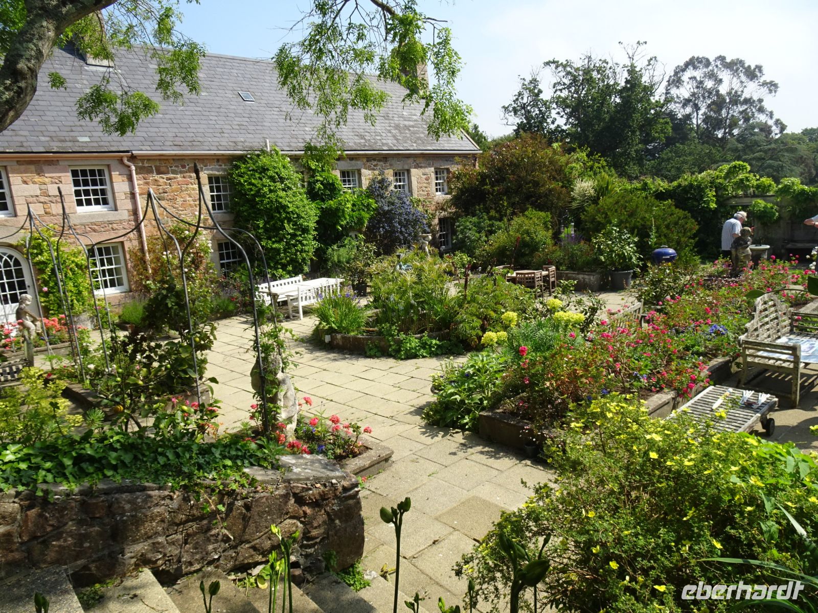 Der heutigeUnser nächster Tag, Mittwoch der 7. Juni, stand unter dem Motto „Gartentour“. Nachdem der Reiseleiter einigen Geburtstagsgästen herzlich gratulierte und ihnen als kleines Geschenk je ein Glas „Jersey Black Butter“ - eine aus Äpfeln, Cider und Gewürzen zubereitete lokale Spezialität – übergeben hatte, starteten wir mit zwei Bussen zu unserer Gartentour. Die erste Station war der Garten von Frau Binney. In den letzten 50 Jahren wurde aus einem unscheinbaren Tal ein prächtiger Landschaftsgarten mit vielen Kamelien und seltenen Bäumen und Sträuchern. Dazu der Nutzgarten mit Gewächshaus und – als besonderes Kleinod – der prächtige Garten am ursprünglichen Bauernhof. Hier finden auf Einladung regelmäßig Benefizkonzerte durch Frau Binney statt. Danach ging es weiter zum Garten des Herrn Miles. Dieser ist ein echtes Prachtstück englischer Gartenarchitektur. Eine Villa aus der ruhmreichen Vergangenheit der Insel Jersey repräsentierte sich im besten Zustand. Klein aber trotzdem auffällig verwies eine Tafel auf die Unterbringung von verletzten Soldaten im Zweiten Weltkrieg. Dazu ist festzustellen, dass in den Jahren 1941 bis 1945 die deutsche Besatzung auf der Insel Jersey und auch die Nachbarinseln sich stationiert hatte. 500 000 Kubikmeter Beton und Stahl in Verteidigungsbauten sind noch heute mahnendes Zeugnis der Besatzung. Glücklicherweise gab es keine Kriegshandlungen. Trotzdem sind diese Zeugen des Zweiten Weltkrieges heute unerschütterliche und nicht zu beseitigende unübersehbare Zeugnisse der Besatzung dieser Inseln im Zweiten Weltkrieg. Der Garten von Herrn Miles war das glatte Gegenteil zum Garten der Frau Binney. Mit bestem englischem Rasen und gepflegt durch mehrere Gärtner repräsentierte er sich sehr selbstbewusst. Wobei man den Inhaber Herrn Miles anmerkte, dass sein ganzer Stolz seltene Pflanzen und ein guter Zustand des Gartens war. Abschließend fütterte Herr Miles im Beisein unsere Gäste seine Koi-Karpfen. Wir machten zu Mittag Station in einem im Pub „The Portlet Inn“. Leckere regionale Küche mit wunderbarer Rosen- und Mittagsblumenpracht um den Pub mit Blick zur Küste – es war wie im Paradies. Unser anschließender Besuch in der Eric Young Orchideen Foundation war der nächste Höhepunkt unserer Gartenreise. Sehen Sie selbst in der Fotogalerie die Prachtexemplare an seltenen Orchideen und die wunderbare Gestaltung in den Glashäusern. Am frühen Nachmittag ging es weiter zum versteckt liegenden Schloss Chateau La Chaire. Umgeben wiederum von prächtigen Natternköpfen mit ihren tollen Blütenständen wartete die nächste Überraschung auf uns: als bei Eberhardt-Reisenden bereits erwartetes WOW ging es zum Cream Tea in das Schloss. Ausgezeichneter Tee mit Milch, dazu frisch zubereitetet Scones mit Marmelade und der kalorienhaltigen clotted cream – einer Art Butter - ließen sich alle Reisegäste sehr gut schmecken. Ein sehr interessanter Tag mit wunderbaren Gärten ging zu Ende. Es ging zurück zu unserem Hotel, wo uns auch heute wieder genügend Zeit für ein Bad blieb. Anschließend genossen wir ein wunderbares Abendessen.