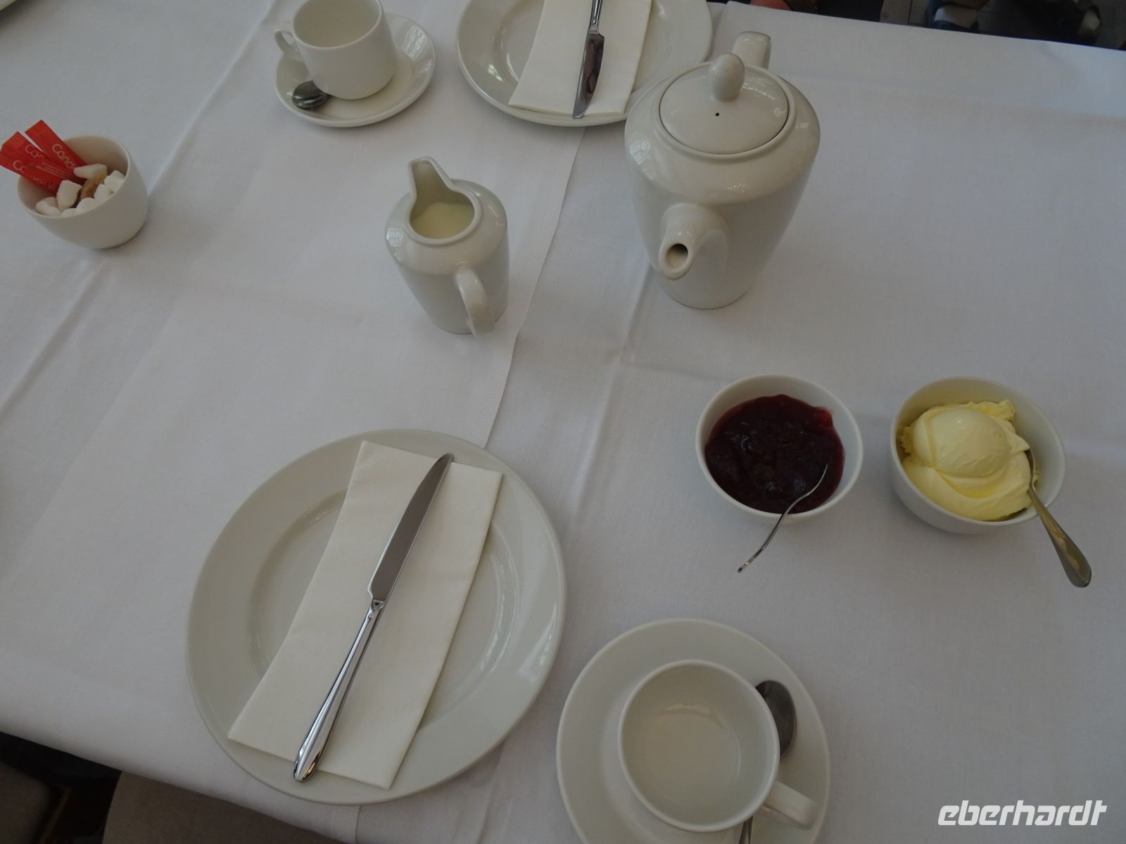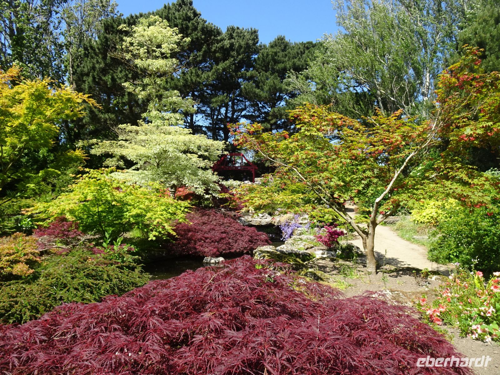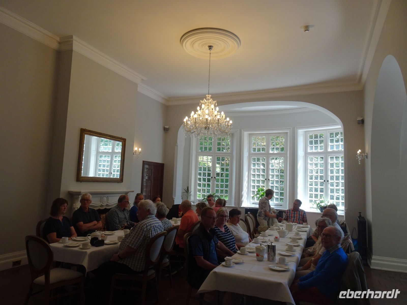 Der heutigeUnser nächster Tag, Mittwoch der 7. Juni, stand unter dem Motto „Gartentour“. Nachdem der Reiseleiter einigen Geburtstagsgästen herzlich gratulierte und ihnen als kleines Geschenk je ein Glas „Jersey Black Butter“ - eine aus Äpfeln, Cider und Gewürzen zubereitete lokale Spezialität – übergeben hatte, starteten wir mit zwei Bussen zu unserer Gartentour. Die erste Station war der Garten von Frau Binney. In den letzten 50 Jahren wurde aus einem unscheinbaren Tal ein prächtiger Landschaftsgarten mit vielen Kamelien und seltenen Bäumen und Sträuchern. Dazu der Nutzgarten mit Gewächshaus und – als besonderes Kleinod – der prächtige Garten am ursprünglichen Bauernhof. Hier finden auf Einladung regelmäßig Benefizkonzerte durch Frau Binney statt. Danach ging es weiter zum Garten des Herrn Miles. Dieser ist ein echtes Prachtstück englischer Gartenarchitektur. Eine Villa aus der ruhmreichen Vergangenheit der Insel Jersey repräsentierte sich im besten Zustand. Klein aber trotzdem auffällig verwies eine Tafel auf die Unterbringung von verletzten Soldaten im Zweiten Weltkrieg. Dazu ist festzustellen, dass in den Jahren 1941 bis 1945 die deutsche Besatzung auf der Insel Jersey und auch die Nachbarinseln sich stationiert hatte. 500 000 Kubikmeter Beton und Stahl in Verteidigungsbauten sind noch heute mahnendes Zeugnis der Besatzung. Glücklicherweise gab es keine Kriegshandlungen. Trotzdem sind diese Zeugen des Zweiten Weltkrieges heute unerschütterliche und nicht zu beseitigende unübersehbare Zeugnisse der Besatzung dieser Inseln im Zweiten Weltkrieg. Der Garten von Herrn Miles war das glatte Gegenteil zum Garten der Frau Binney. Mit bestem englischem Rasen und gepflegt durch mehrere Gärtner repräsentierte er sich sehr selbstbewusst. Wobei man den Inhaber Herrn Miles anmerkte, dass sein ganzer Stolz seltene Pflanzen und ein guter Zustand des Gartens war. Abschließend fütterte Herr Miles im Beisein unsere Gäste seine Koi-Karpfen. Wir machten zu Mittag Station in einem im Pub „The Portlet Inn“. Leckere regionale Küche mit wunderbarer Rosen- und Mittagsblumenpracht um den Pub mit Blick zur Küste – es war wie im Paradies. Unser anschließender Besuch in der Eric Young Orchideen Foundation war der nächste Höhepunkt unserer Gartenreise. Sehen Sie selbst in der Fotogalerie die Prachtexemplare an seltenen Orchideen und die wunderbare Gestaltung in den Glashäusern. Am frühen Nachmittag ging es weiter zum versteckt liegenden Schloss Chateau La Chaire. Umgeben wiederum von prächtigen Natternköpfen mit ihren tollen Blütenständen wartete die nächste Überraschung auf uns: als bei Eberhardt-Reisenden bereits erwartetes WOW ging es zum Cream Tea in das Schloss. Ausgezeichneter Tee mit Milch, dazu frisch zubereitetet Scones mit Marmelade und der kalorienhaltigen clotted cream – einer Art Butter - ließen sich alle Reisegäste sehr gut schmecken. Ein sehr interessanter Tag mit wunderbaren Gärten ging zu Ende. Es ging zurück zu unserem Hotel, wo uns auch heute wieder genügend Zeit für ein Bad blieb. Anschließend genossen wir ein wunderbares Abendessen.