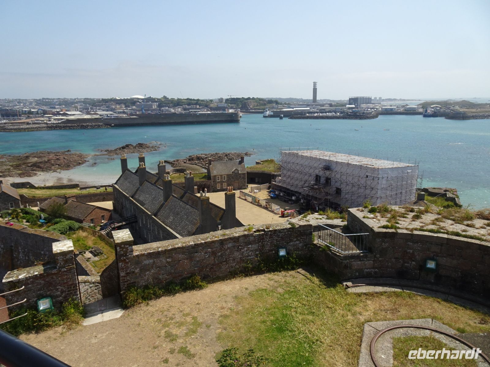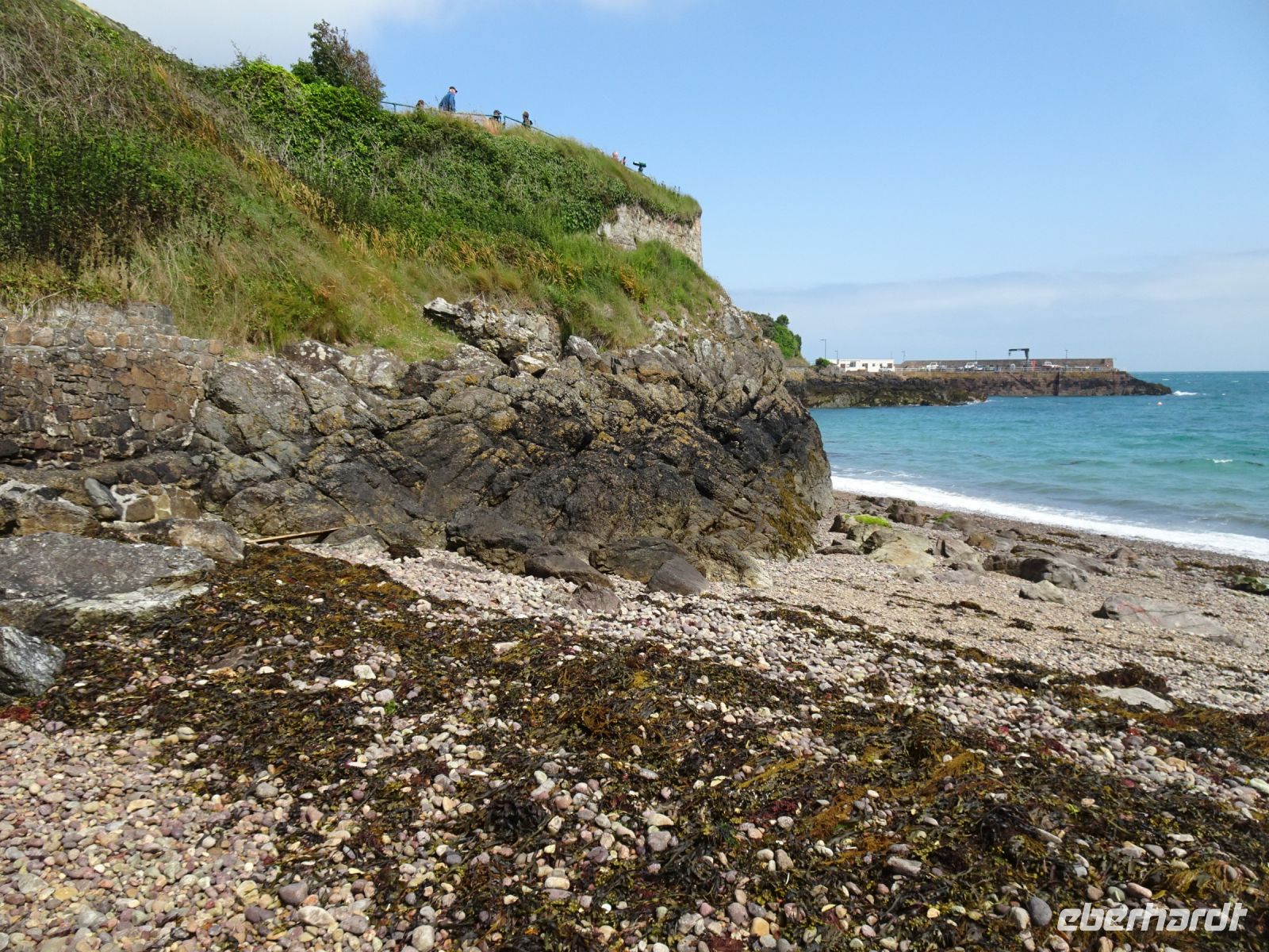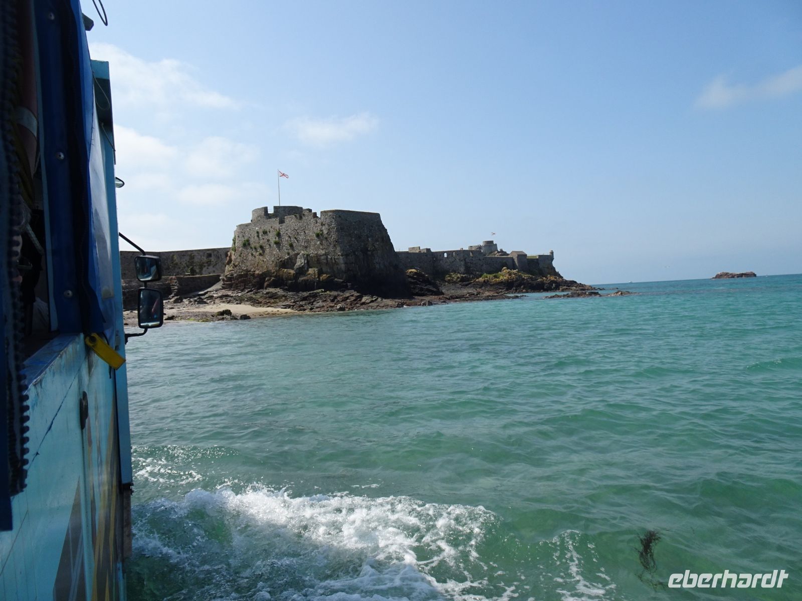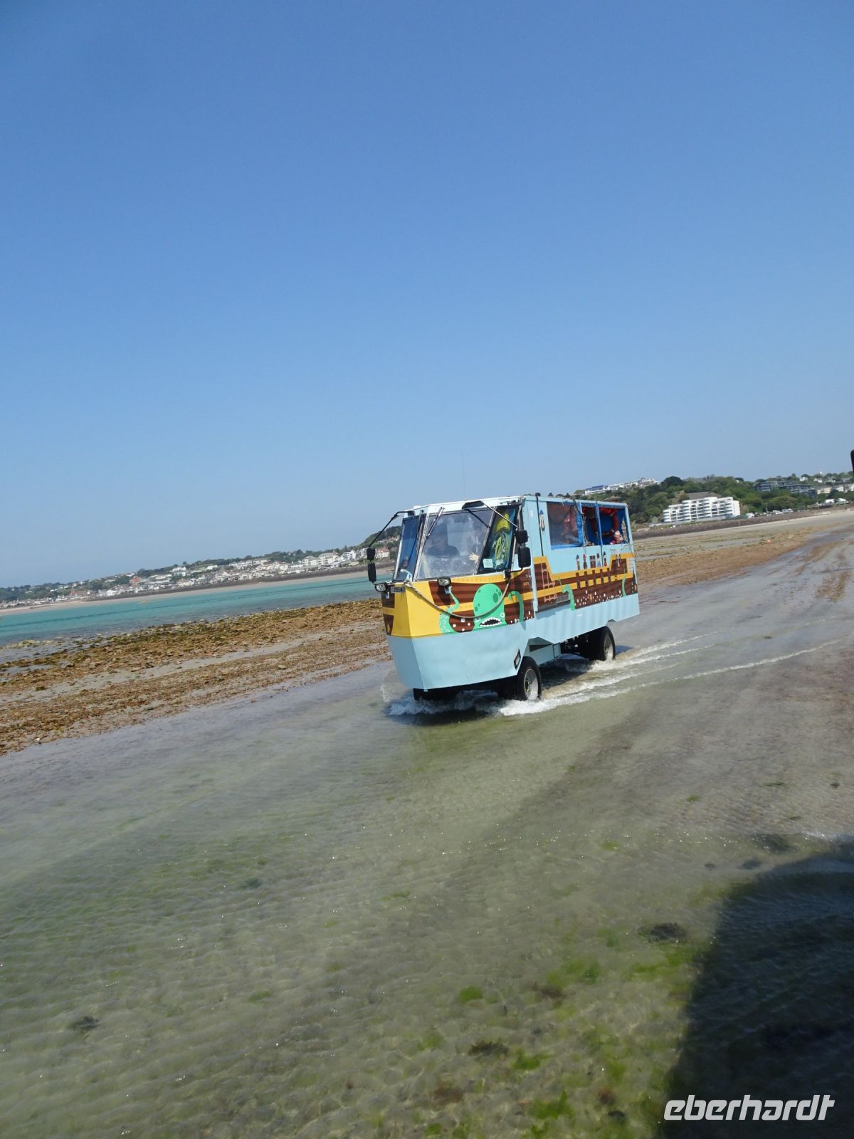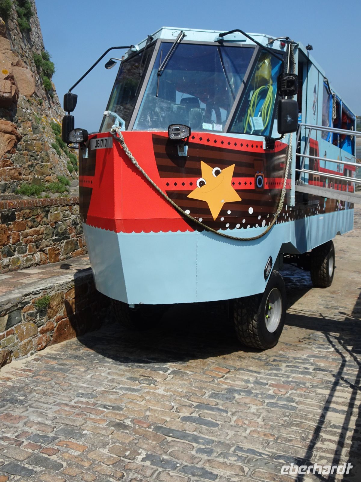 Der nächste Tag, Dienstag der 6 Juni, war freie Zeit. Unser Reiseleiter Hartwig unterbreitete uns trotzdem mit Unterstützung der Produktmanagerin Frau Schkade von Eberhardt Travel zwei sehr schöne Angebote für Aktivitäten in St. Helier: ein Ausflug mit dem als Paddledog bezeichneten Amphibienfahrzeug zum Elizabeth Castle und am Nachmittag einen 2stündigen Schiffsausflug entlang der Südküste. Der Mehrzahl der Reisegäste sagten diese Angebote zu. So ging es nach dem Frühstück zuerst einmal weiter mit unserem Stadtrundgang. Heute hatten der Central Market und der Fish Market geöffnet – welche Pracht! Die vielfältigen Angebote waren für alle interessant: von Austern bis zu Schweineohren waren alle Spezialitäten der Insel im Angebot. Selbstverständlich auch leckere Süßigkeiten beim Konditor und natürliche prächtige Obst- und Blumenangebote. Bei der anschließenden Fahrt mit dem Paddledog ging es durchs Wasser, deshalb mussten wir zuerst die Einweisung in die Nutzung der Schwimmwesten durch den historischen „Festungskommandanten“ mitmachen – sicher ist sicher. Auf Elizabeth Castle wurden wir von einer freundlichen Dame empfangen und über die Struktur der Festung und die Sehenswürdigkeiten informiert. Und so hatte jeder sein eigenes Programm: einige Reisegäste ließen sich vom Festungsarzt in die ehemaligen Medizinkünste einweisen, andere folgten den Ausführungen auf dem Paradeplatz. Wieder andere Reisegäste bestiegen die Türme und genossen die Aussicht… Es war für alle etwas dabei. Zurückgekehrt an Land ging es am frühen Nachmittag zu unserer Schiffstour. Prächtiges Wetter, niedriger Wasserstand – wunderbare Sichten und Bilder haben sich in unsern Speicherkarten und in unseren Erinnerungen festgesetzt. Dann am Leuchtturm Corbiére war der Wendepunkt. Mit ruhiger See und sehr guter Fahrt kamen wir wohlbehalten im Hafen von St. Helier an. Es war wiederum ein vielgestaltiger wunderbarer Tag.