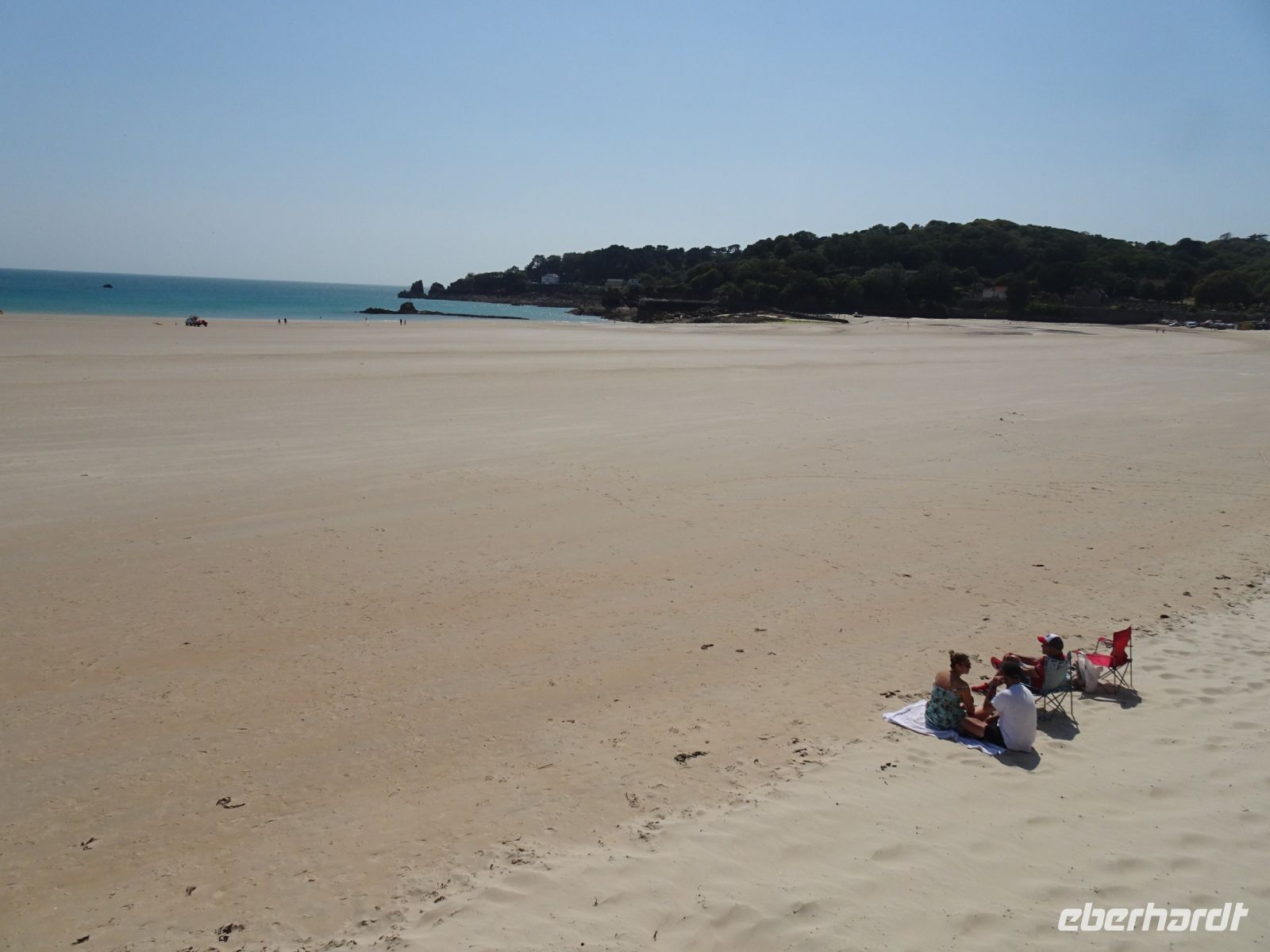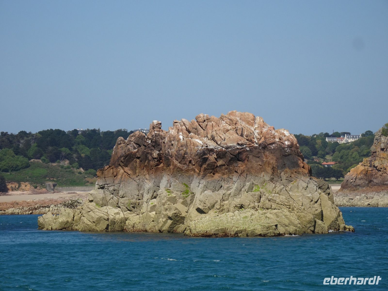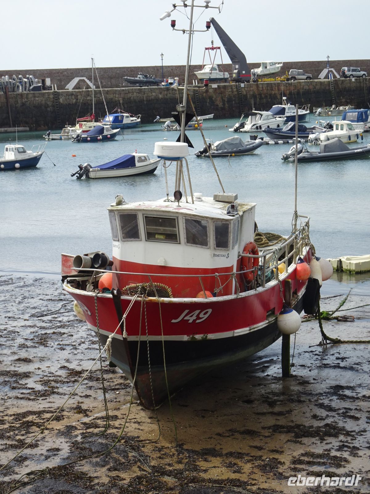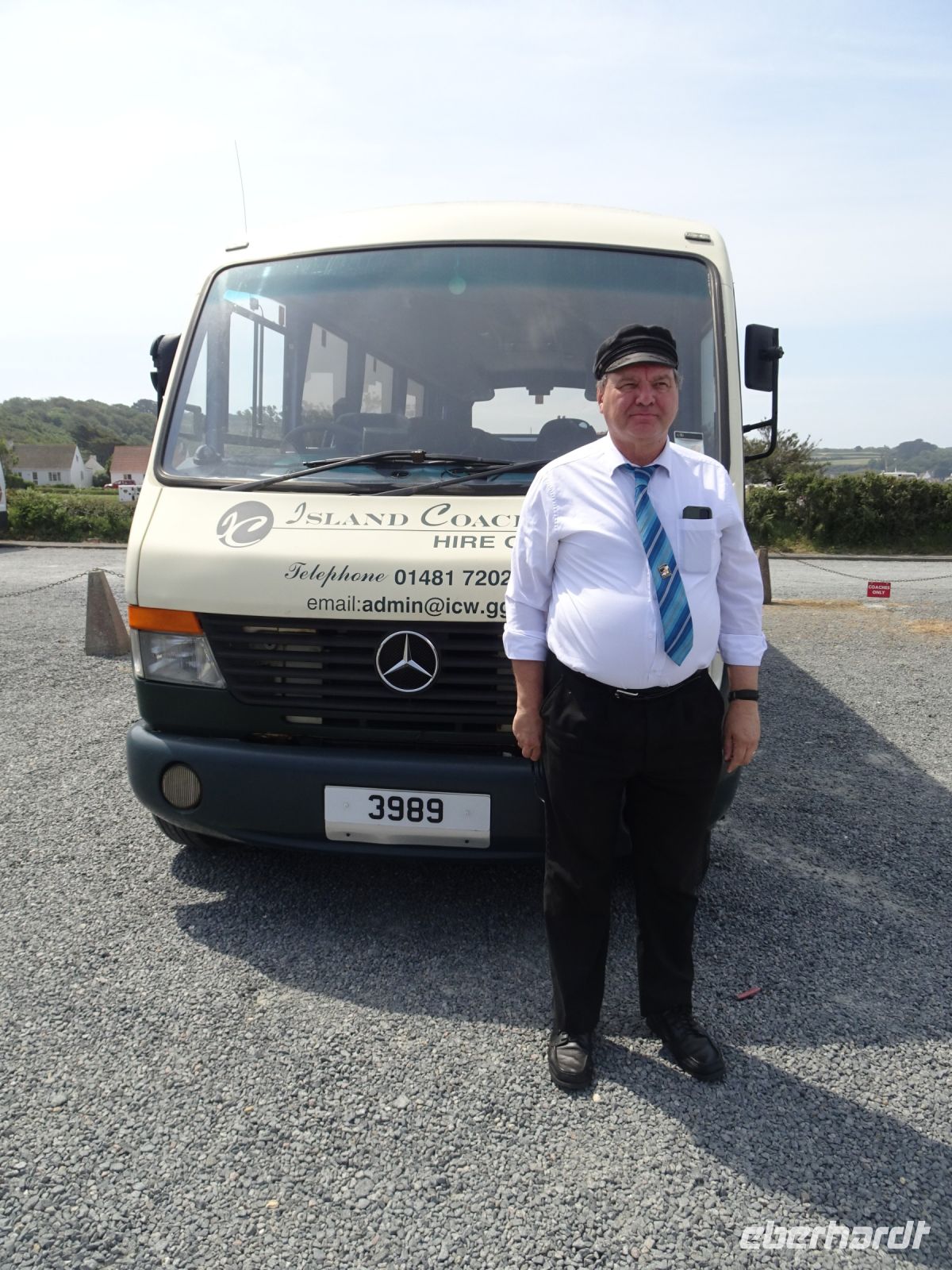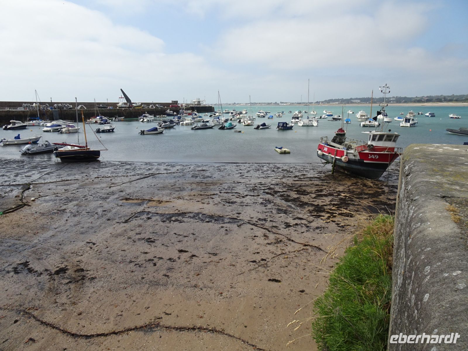 Am Montag, unserem 4. Reisetag, stand eine Inselrundfahrt mit unseren beiden Bussen und Ernst auf dem Programm. Wir starten unsere Inselrundfahrt am Hotel und fuhren entlang der Ostküste zuerst bis La Rocque Harbour, wo sich uns bei dem aktuellen Wasserstand “Ebbe“ eine durch schroffe Felsen mystische Landschaft zeigte. Unser nächster Stopp war der Hafen von Gorey mit dem das Panorama dominierenden Mont Orgueil Castle. Durch enge Wege ging es weiter an der Küste nach Norden entlang. Es war gut, dass wir mit den kleinen Reisebussen unterwegs waren, da größere Busse nur die Hauptwege nutzen können. Vorbei an der Rozel Bay ging es zum nächsten Stopp an der Bouley Bay. Hier konnten wir ausgiebig Souvenirs in Form von Muscheln sammeln. Tolle Eindrücke so direkt nach dem Rückgang des Meeres. Anschließend ging es weiter zu unserem Mittagessen in dem Pub Greve de Lecq. Eine Empfehlung unseres Reiseleiters Ernst war das bekannte Gericht fish and chip. So frisch war das besonders lecker und wir ließen es uns schmecken. Danach fuhren wir weiter entlang der Nord- und Westküste mit einem Stopp an der Ruine von Grosnez Castle zur St. Quen’s Bay. Ernst musste hier in einer der traditionellen Verkaufskisten erst noch die Jersey Royal Kartoffeln kaufen. Und dann als nächster Stopp der Leuchtturm Corbiére. Aber genauso wie der Leuchtturm lockte der Eisstand die Reisegäste. Der Verkäufer hatte ein breites Eisangebot und viele Gäste. Und so wurde kräftig dem Eis aus der guten Milch der Kühe von Jersey, die die fetteste Milch geben sollen, zugelangt. Mit einigen weiteren Stopps, z. B. an der St. Brelades Bay, ging es zurück zu unserem Hotel. Mit Worten ist diese wunderbare Landschaft nur unvollständig zu beschreiben, sehen Sie sich doch mal die Bilder in der Bildergalerie ergänzend an.