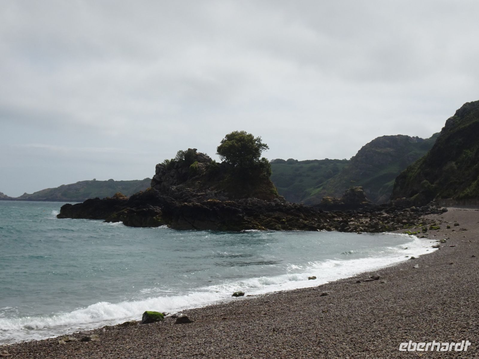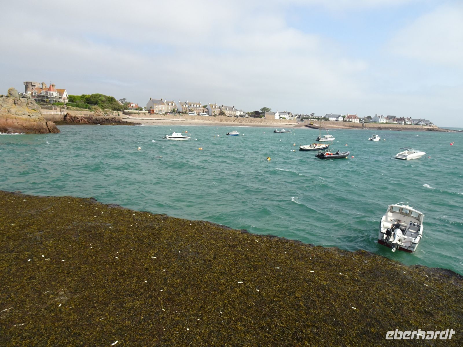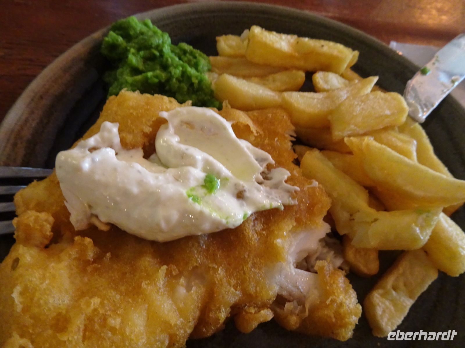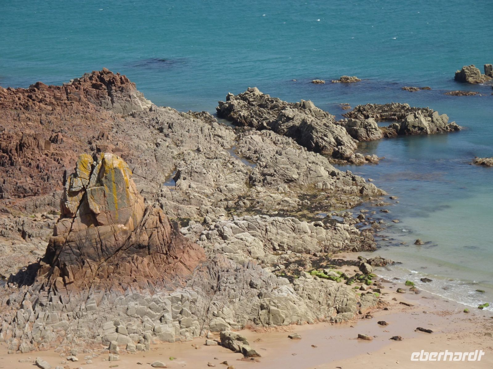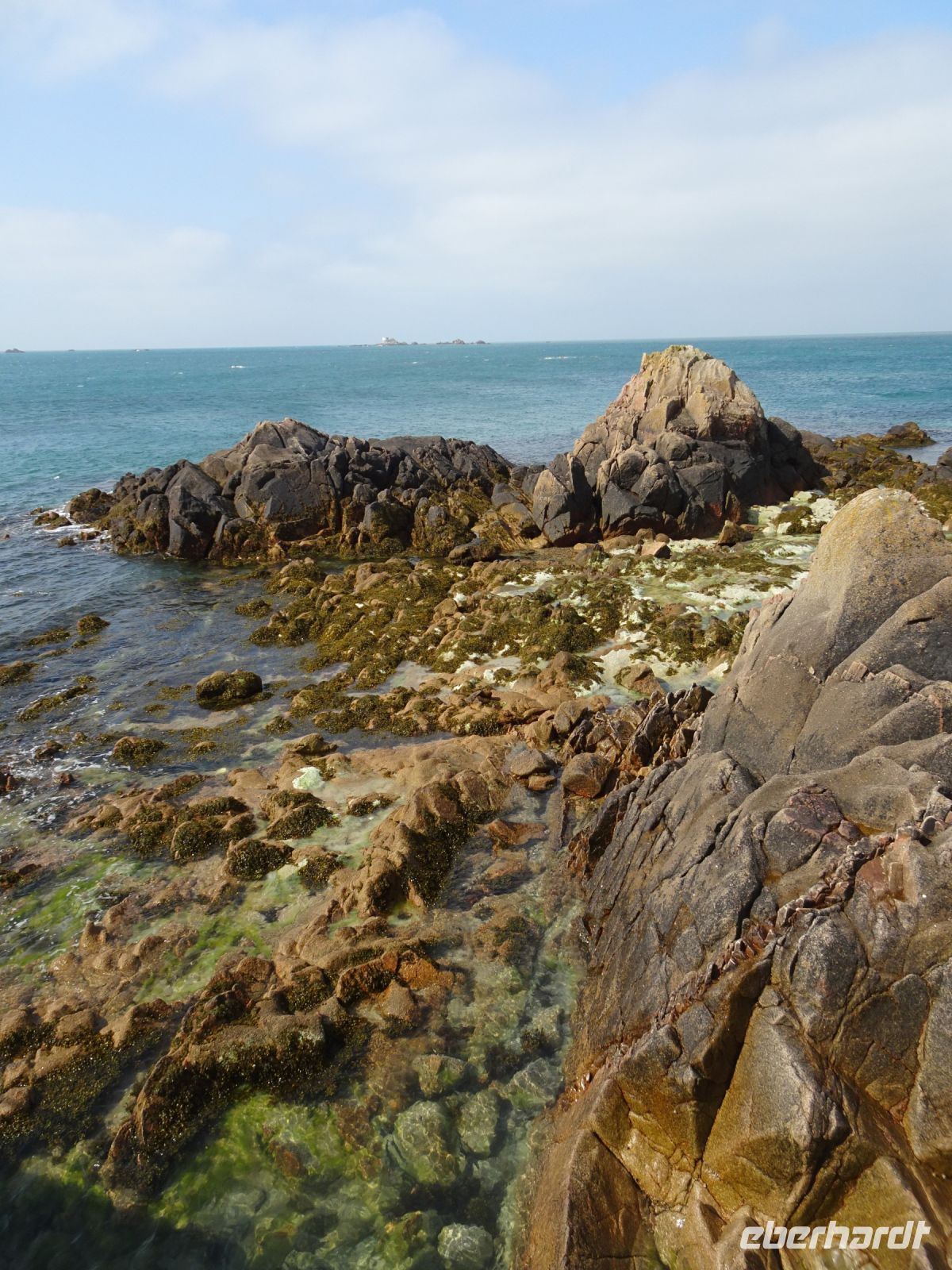 Am Montag, unserem 4. Reisetag, stand eine Inselrundfahrt mit unseren beiden Bussen und Ernst auf dem Programm. Wir starten unsere Inselrundfahrt am Hotel und fuhren entlang der Ostküste zuerst bis La Rocque Harbour, wo sich uns bei dem aktuellen Wasserstand “Ebbe“ eine durch schroffe Felsen mystische Landschaft zeigte. Unser nächster Stopp war der Hafen von Gorey mit dem das Panorama dominierenden Mont Orgueil Castle. Durch enge Wege ging es weiter an der Küste nach Norden entlang. Es war gut, dass wir mit den kleinen Reisebussen unterwegs waren, da größere Busse nur die Hauptwege nutzen können. Vorbei an der Rozel Bay ging es zum nächsten Stopp an der Bouley Bay. Hier konnten wir ausgiebig Souvenirs in Form von Muscheln sammeln. Tolle Eindrücke so direkt nach dem Rückgang des Meeres. Anschließend ging es weiter zu unserem Mittagessen in dem Pub Greve de Lecq. Eine Empfehlung unseres Reiseleiters Ernst war das bekannte Gericht fish and chip. So frisch war das besonders lecker und wir ließen es uns schmecken. Danach fuhren wir weiter entlang der Nord- und Westküste mit einem Stopp an der Ruine von Grosnez Castle zur St. Quen’s Bay. Ernst musste hier in einer der traditionellen Verkaufskisten erst noch die Jersey Royal Kartoffeln kaufen. Und dann als nächster Stopp der Leuchtturm Corbiére. Aber genauso wie der Leuchtturm lockte der Eisstand die Reisegäste. Der Verkäufer hatte ein breites Eisangebot und viele Gäste. Und so wurde kräftig dem Eis aus der guten Milch der Kühe von Jersey, die die fetteste Milch geben sollen, zugelangt. Mit einigen weiteren Stopps, z. B. an der St. Brelades Bay, ging es zurück zu unserem Hotel. Mit Worten ist diese wunderbare Landschaft nur unvollständig zu beschreiben, sehen Sie sich doch mal die Bilder in der Bildergalerie ergänzend an.