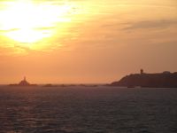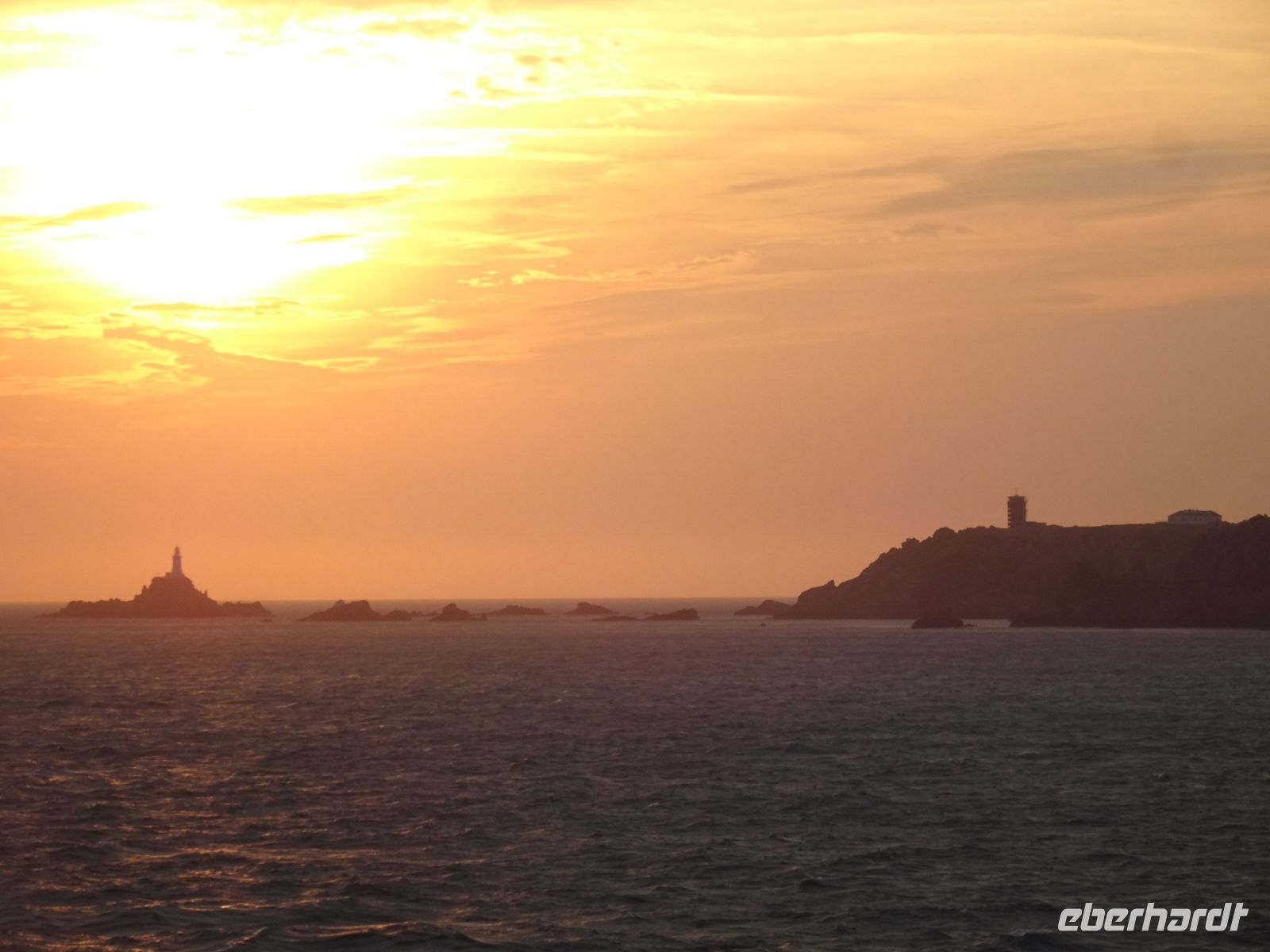 Am heutigen Donnerstag, dem 8. Juni, war ein Besuch der Schwesterinsel Guernsey vorgesehen. Nach einer zügigen und ruhigen Überfahrt mit der Schnellfähre landeten wir pünktlich im Hafen der Insel Guernsey in St. Peter Port an. Unser Fahrer Peter erwartete uns und unsere örtliche Reiseleiterin Heidi starteten mit uns zur Inselrundfahrt. Vorbei an Weiden mit typischen Guernsey-Rindern und der Molkerei ging es zuerst zur wohl kleinsten Kirche der Welt, gefertigt aus Scherben der berühmten Wedgewood-Keramik. Die Maße der Kirche sind wirklich „sehr klein“, weshalb wohl gerade einmal die Geistlichkeit und einige wenige Besucher darin Gottesdienst feiern konnten. Wir haben diese vor Kurzem wunderbar rekonstruierte und mit herrlicher Beleuchtung angestrahlte Kirche Einzeln genossen. Es gibt die Anekdote, das zur Weihe der Bischof die Kirche nicht betreten konnte, weil seine Körpermaße nicht an die Kirche angepasst waren… Wir jedenfalls kamen alle gut durch. Unsere Inselrundfahrt zeigte uns wunderbare Naturerlebnisse, aber auch immer wieder die Zeugen der steten Verteidigung. Wie z. B. Fort Grey, auf Grund seiner an korsische Martarellotürme erinnernden Form auch als „Tasse mit Untertasse“ bezeichnet und das heute auch im Inneren als Kirche genutzte Fort Hommet. Den Abschluss unsere Inselrundfahrt bildete die Landeshauptstadt St. Peter Port. Beginnend im Candei-Garten mit seinen wunderbaren Parkanlagen und den Denkmalen der Königin Victoria und des Schriftstellers Victor Hugo (der längere Zeit auf Guernsey im Exil lebte) ging unser Bummel anschließend durch die Altstadt mit der Stadtkirche. Mit Hinweisen von Heidi verlebten wir in St. Peter Port eine schöne Zeit. Aber es gab bei unserer Rückfahrt ein Problem: auf Grund schwieriger Wetterbedingungen im Ärmelkanal hatte unsere von Portsmouth kommende Fähre ca. 1 ½ Stunden Verspätung. Und da es sich um eine Lasten- und Passagierfähre handelte, benötigten wir auch 2 Stunden bis nach Jersey. Alle weiteren Planungen wurden damit hinfällig. Auch der im Pub „The Square“ organisierte Pubbesuch musste abgesagt werden… Schade!! Aber jede Änderung ist auch eine Chance für Neues: wir hatten einen herrlichen Sonnenuntergang mit der Südwestküste der Insel Jersey und dem Leuchtturm Corbiére im Bild. Dieser letzte Abend auf der Insel Jersey war Abschluss einer sehr interessanten und stimmungsvollen Reise zu den Kanalinseln Jersey und Guernsey. Jetzt hieß es Koffer packen.