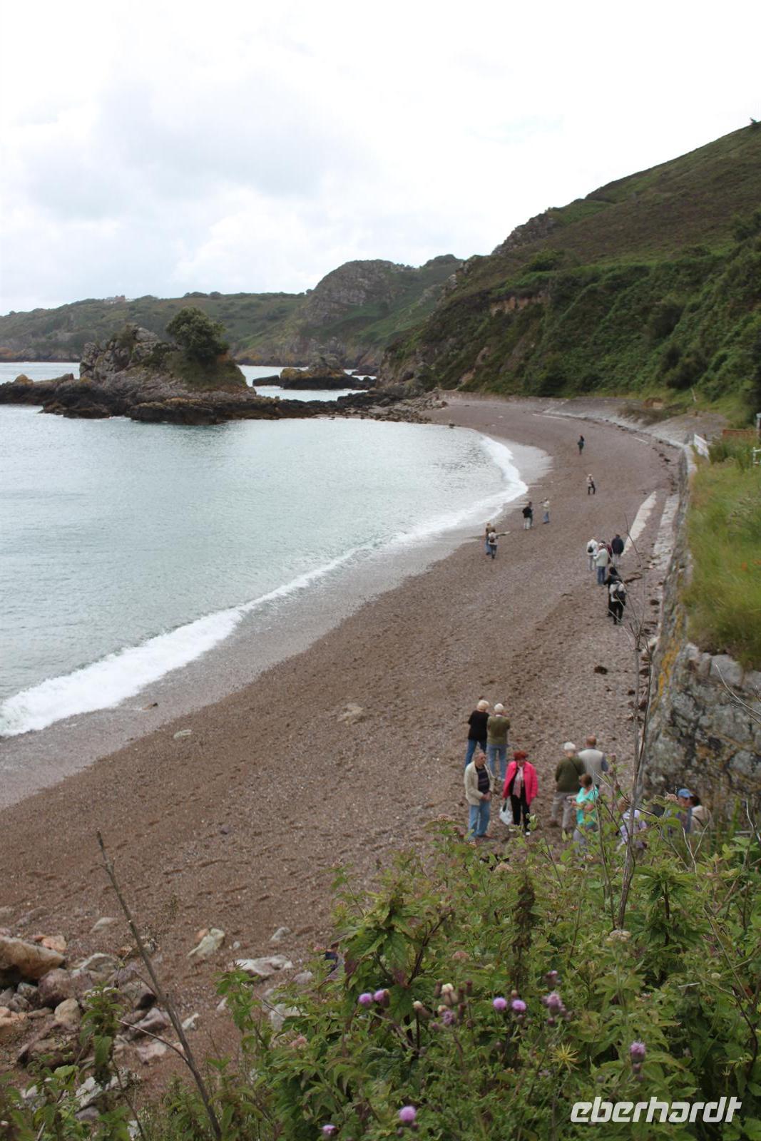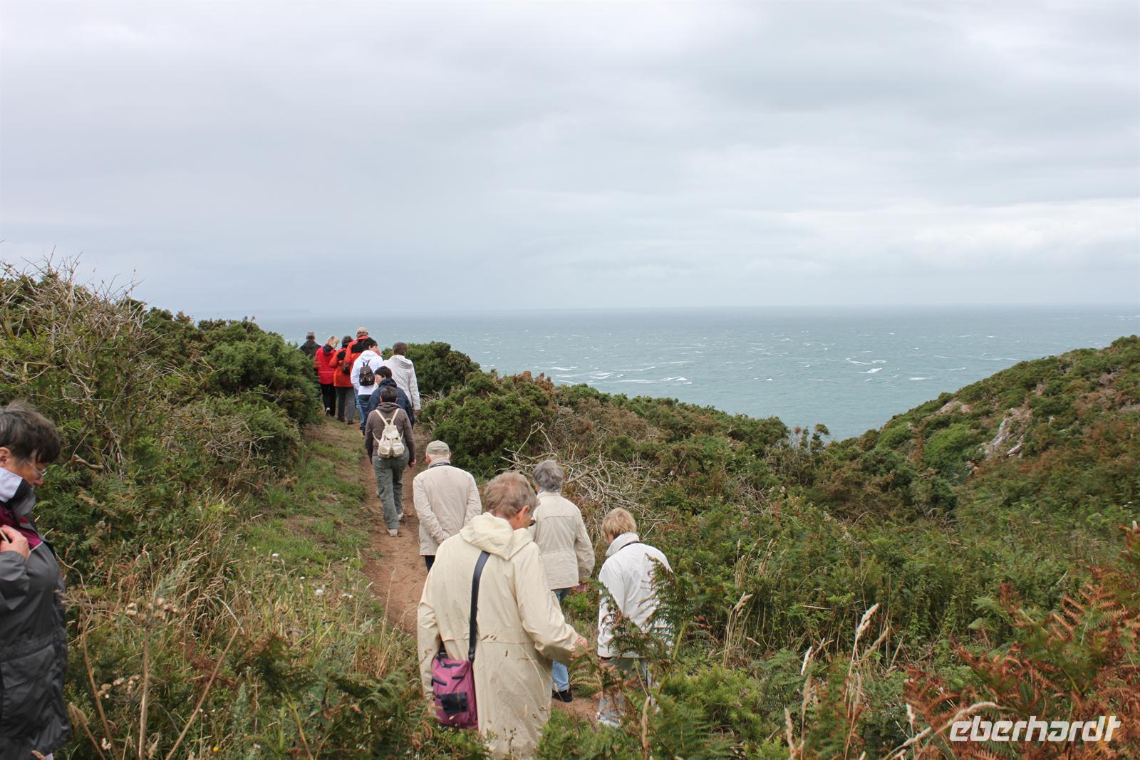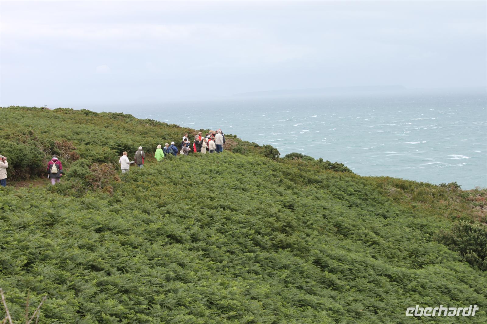 Natürlich gab es auch Höhepunkte an den Tagen zuvor. Das Wetter hat sich da leider aber nicht positiv hervorgetan, denn es regnete sehr ausgiebig - vor allem auf Sark. An dieser Stelle ein großes Lob an alle meine Reisegäste, dass Sie trotz der Witterung so eisern durchgehalten haben. Die standhaftesten unter Ihnen (13 Gäste an der Zahl) sind sogar von der Seigneurie noch bis zum „Window in the rock“ gewandert - haben gegen Schlammpfützen und strömenden Regen angekämpft. Großen Dank an die Wetterfee, dass der unsagbar dicke Nebel erst etwa eine Stunde später aufzog, sonst hätten wir diesen Blick über die Bucht nicht genießen können - dieser hat die Mühen schließlich belohnt. Dennoch war auch der Tag schön, zumindest unvergesslich. Für mich vor allem wegen des Wellenganges auf dem Hinweg per Fähre! Ich bin sicher, ich hatte eine gesunde Blässe angenommen.