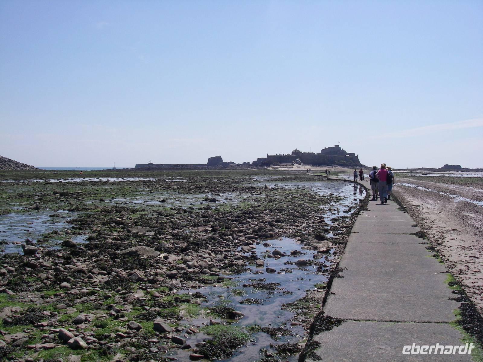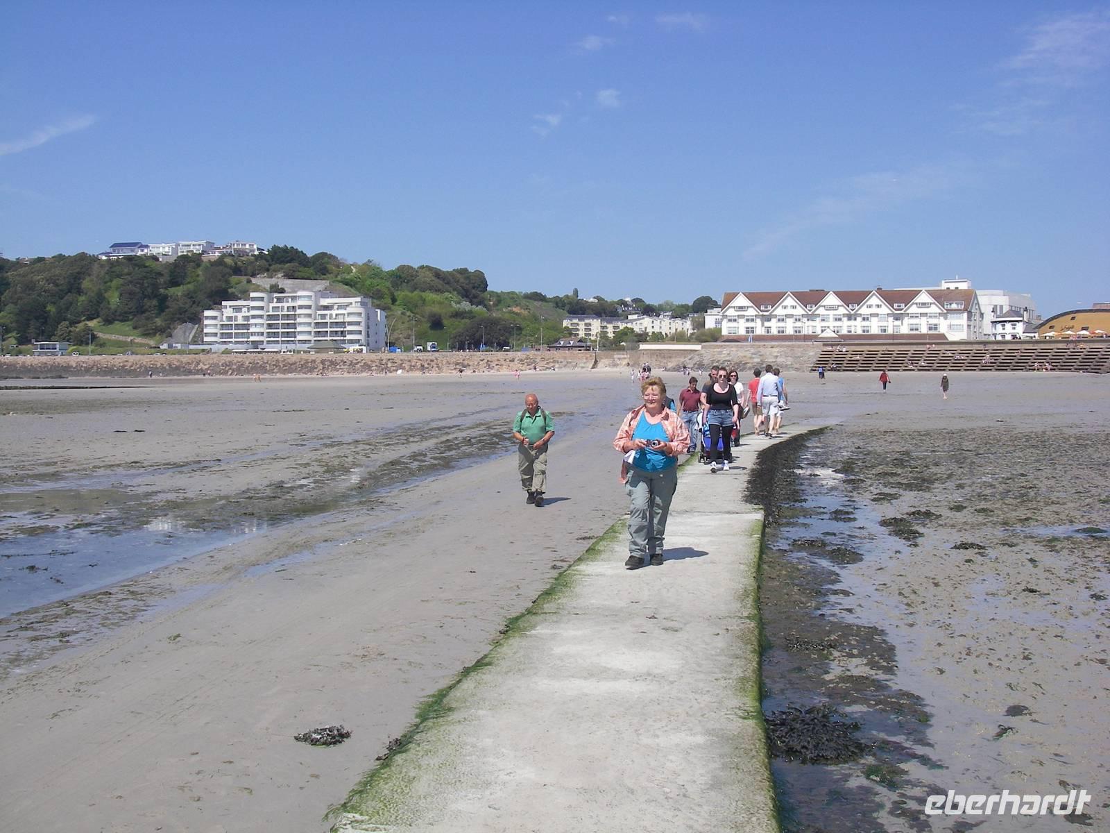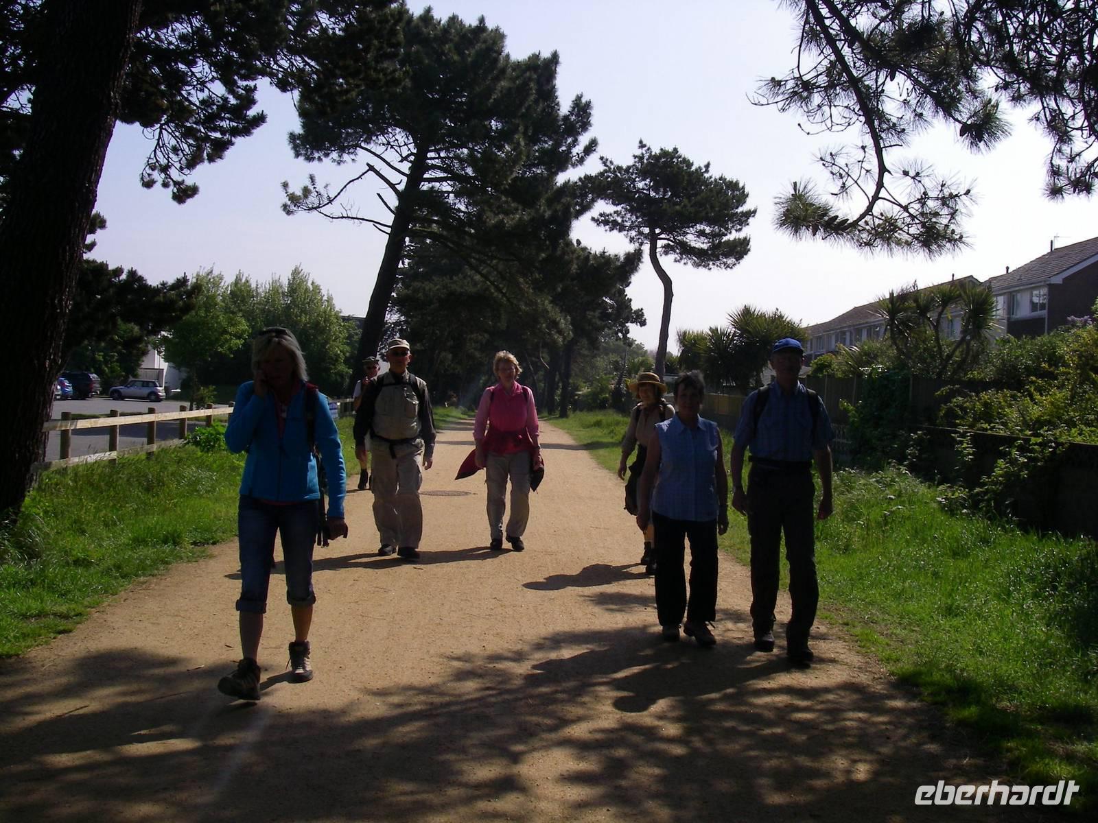 Bei strahlendem Sonnenschein starten wir heute nach einem gemeinsamen Frühstück zu unserer ersten Wanderung auf Jersey. Gegen 9:30 Uhr holt uns Heidi mit dem Bus ab und wir fahren über die Victoria Avenue, der Miniautobahn auf Jersey, bis zum Coronation Park - dem Ausgangspunkt unserer heutigen Wanderung. Unterwegs legen wir einen kurzen Fotostopp ein, um Elizabeth Castle bei Flut zu fotografieren. Doch bevor wir uns auf den Weg ins Landesinnere begeben, besichtigen wir noch die St. Matthew's Glaskirche. Diese ist architektonisch eher unspektakulär, wartet aber mit einer ungewöhnlichen Innenausstattung auf, da beispielsweise das Kreuz, der Altar oder die Engel in der Lady Chapel aus ungefärbtem Glas hergestellt wurden. Anschließend laufen wir durch den gepflegten Coronation Park ins Hinterland. An dem Millbrook und Dannemarche Reservoir vorbei wandern wir durch das Waterworks Valley in die Mitte der Insel. Unterwegs legen wir an einem der 12 Milleniumssteinen eine kurze Verschnaufpause ein, bevor wir dann schließlich die Green Lanes erreichen. Dies sind von Alleen gesäumte asphaltierte, schmale Straßen, auf welchen Fußgänger, Radfahrer und auch Reiter Vorrang haben. Zudem gibt es auf diesen Straßen eine Geschwindigkeitsbegrenzung von 15 Meilen die Stunde. Auf unserem Weg kommen wir an saftigen Wiesen und Weiden, Kartoffelfeldern und charmanten Jersey Cottages mit herrlichen Gärten, welche meist zum Jersey National Trust gehören, vorbei. Anschließend geht es auf Wanderwegen durch den Wald wieder in Richtung Küste. Kurz bevor wir diese erreichen, legen wir eine Mittagspause im „Goose Pub" ein. Nach diesem leckeren Essen laufen wir an der Strandpromenade zurück zum Bus. Unseren Nachmittag verbringen wir mit einem Besuch des Elizabeth Castles. Dieses befindet sich auf einer Felseninsel in der St. Aubin's Bay und wurde 1590 erbaut. Zu Ehren von Queen Elizabeth I. wurde die Festungsanlage von Sir Walter Raleigh während seiner Zeit als Gouverneur von Jersey nach ihr benannt. Nach gerade Ebbe ist, benötigen wir für das Erreichen der Burg heute nicht das Amphibienfahrzeug. Zu Fuß laufen wir auf dem Dammweg zur Burg, welche wir nach einem ca. 15-minütigen Marsch erreichen. Hier verschafft uns Heidi bei einer kurzen Führung einen Überblick über Elizabeth Castle. Am höchsten Punkt angekommen, genießen wir den Ausblick und trennen uns dann für die individuelle Erkundung der Burg. Einige Gäste nutzen die Zeit um sich die zwei Museen, wo man unter anderem etwas über die Geschichte von Elizabeth Castle erfahren kann, anzuschauen, andere gehen hinüber zum Einsiedler-Felsen, wo im 6. Jhd. der Mönch St. Helier gelebt haben soll. Nach einer Stunde Freizeit laufen wieder gemeinsam über den Dammweg zum Bus und fahren zurück zum Hotel. Beim Abendessen und einem anschließendem Besuch der Hotelbar, wo es heute übrigens Live-Musik gibt, tauschen wir uns über die Erlebnisse des Tages aus.
