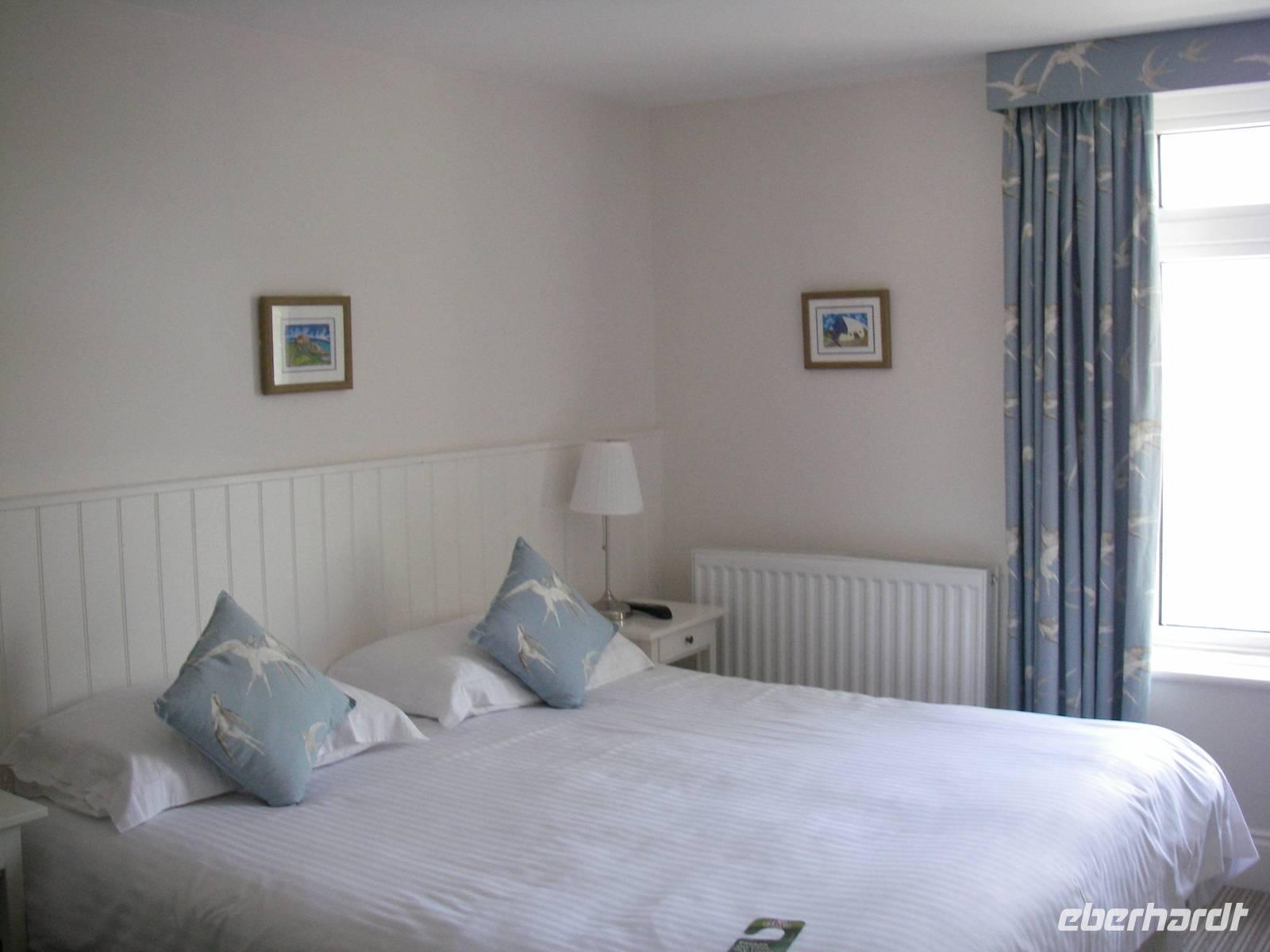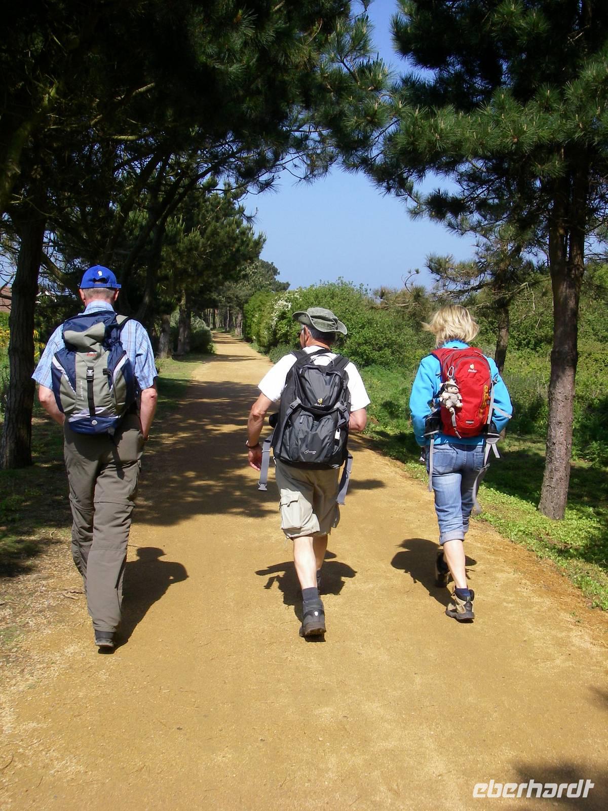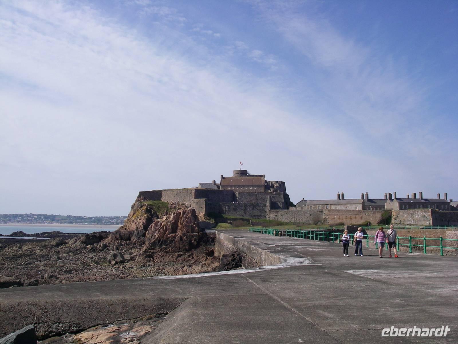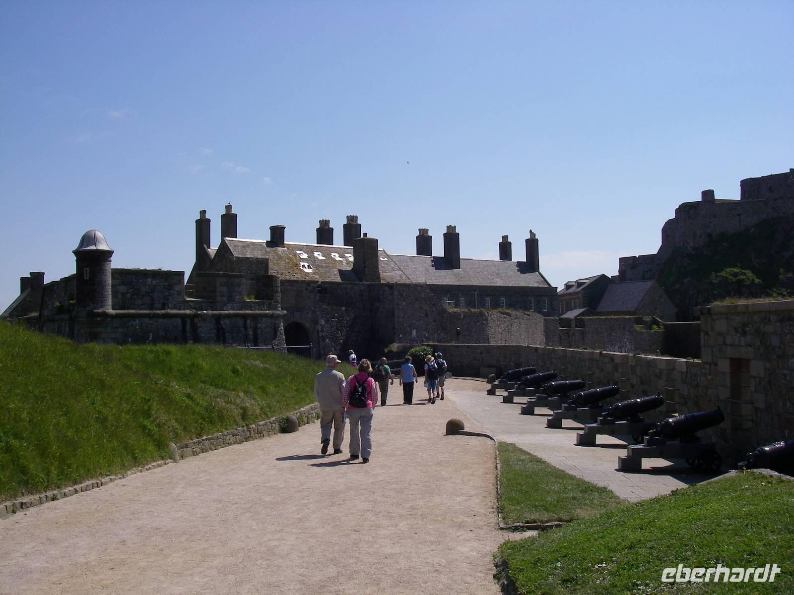Bei strahlendem Sonnenschein starten wir heute nach einem gemeinsamen Frühstück zu unserer ersten Wanderung auf Jersey. Gegen 9:30 Uhr holt uns Heidi mit dem Bus ab und wir fahren über die Victoria Avenue, der Miniautobahn auf Jersey, bis zum Coronation Park - dem Ausgangspunkt unserer heutigen Wanderung. Unterwegs legen wir einen kurzen Fotostopp ein, um Elizabeth Castle bei Flut zu fotografieren. Doch bevor wir uns auf den Weg ins Landesinnere begeben, besichtigen wir noch die St. Matthew's Glaskirche. Diese ist architektonisch eher unspektakulär, wartet aber mit einer ungewöhnlichen Innenausstattung auf, da beispielsweise das Kreuz, der Altar oder die Engel in der Lady Chapel aus ungefärbtem Glas hergestellt wurden. Anschließend laufen wir durch den gepflegten Coronation Park ins Hinterland. An dem Millbrook und Dannemarche Reservoir vorbei wandern wir durch das Waterworks Valley in die Mitte der Insel. Unterwegs legen wir an einem der 12 Milleniumssteinen eine kurze Verschnaufpause ein, bevor wir dann schließlich die Green Lanes erreichen. Dies sind von Alleen gesäumte asphaltierte, schmale Straßen, auf welchen Fußgänger, Radfahrer und auch Reiter Vorrang haben. Zudem gibt es auf diesen Straßen eine Geschwindigkeitsbegrenzung von 15 Meilen die Stunde. Auf unserem Weg kommen wir an saftigen Wiesen und Weiden, Kartoffelfeldern und charmanten Jersey Cottages mit herrlichen Gärten, welche meist zum Jersey National Trust gehören, vorbei. Anschließend geht es auf Wanderwegen durch den Wald wieder in Richtung Küste. Kurz bevor wir diese erreichen, legen wir eine Mittagspause im „Goose Pub" ein. Nach diesem leckeren Essen laufen wir an der Strandpromenade zurück zum Bus. Unseren Nachmittag verbringen wir mit einem Besuch des Elizabeth Castles. Dieses befindet sich auf einer Felseninsel in der St. Aubin's Bay und wurde 1590 erbaut. Zu Ehren von Queen Elizabeth I. wurde die Festungsanlage von Sir Walter Raleigh während seiner Zeit als Gouverneur von Jersey nach ihr benannt. Nach gerade Ebbe ist, benötigen wir für das Erreichen der Burg heute nicht das Amphibienfahrzeug. Zu Fuß laufen wir auf dem Dammweg zur Burg, welche wir nach einem ca. 15-minütigen Marsch erreichen. Hier verschafft uns Heidi bei einer kurzen Führung einen Überblick über Elizabeth Castle. Am höchsten Punkt angekommen, genießen wir den Ausblick und trennen uns dann für die individuelle Erkundung der Burg. Einige Gäste nutzen die Zeit um sich die zwei Museen, wo man unter anderem etwas über die Geschichte von Elizabeth Castle erfahren kann, anzuschauen, andere gehen hinüber zum Einsiedler-Felsen, wo im 6. Jhd. der Mönch St. Helier gelebt haben soll. Nach einer Stunde Freizeit laufen wieder gemeinsam über den Dammweg zum Bus und fahren zurück zum Hotel. Beim Abendessen und einem anschließendem Besuch der Hotelbar, wo es heute übrigens Live-Musik gibt, tauschen wir uns über die Erlebnisse des Tages aus.