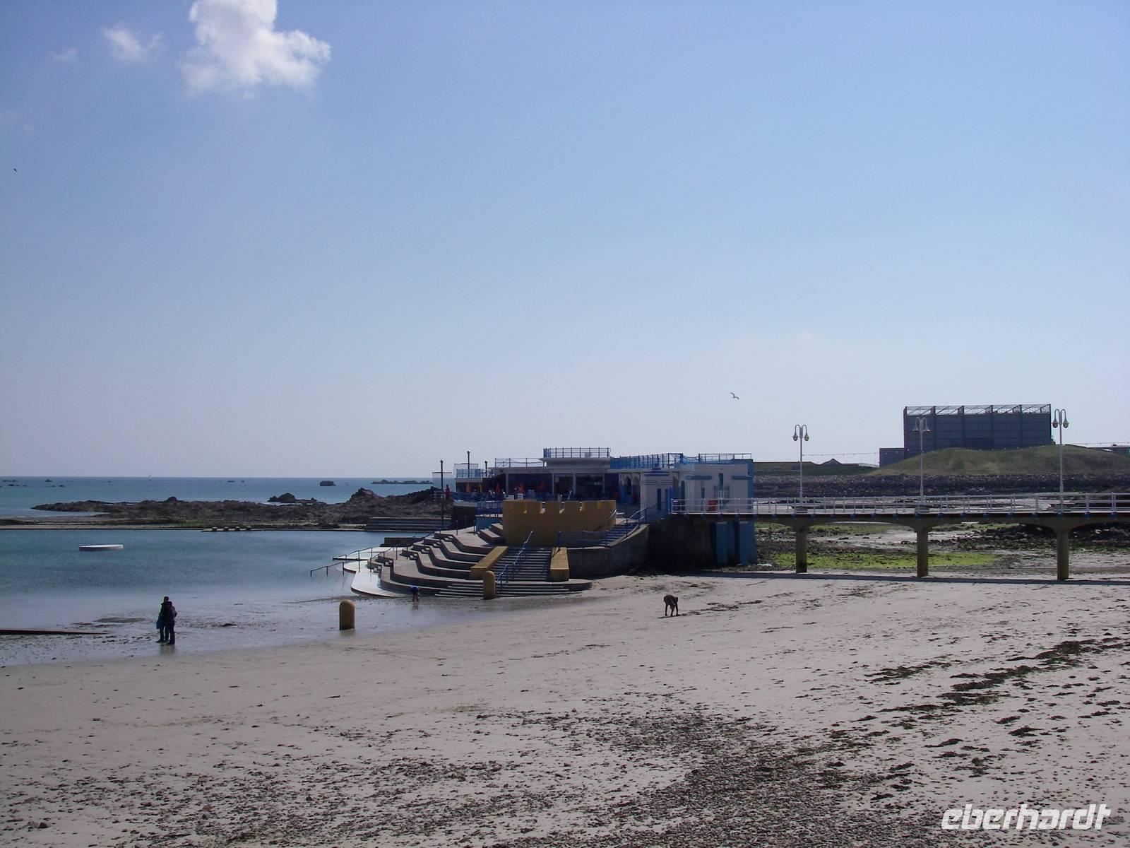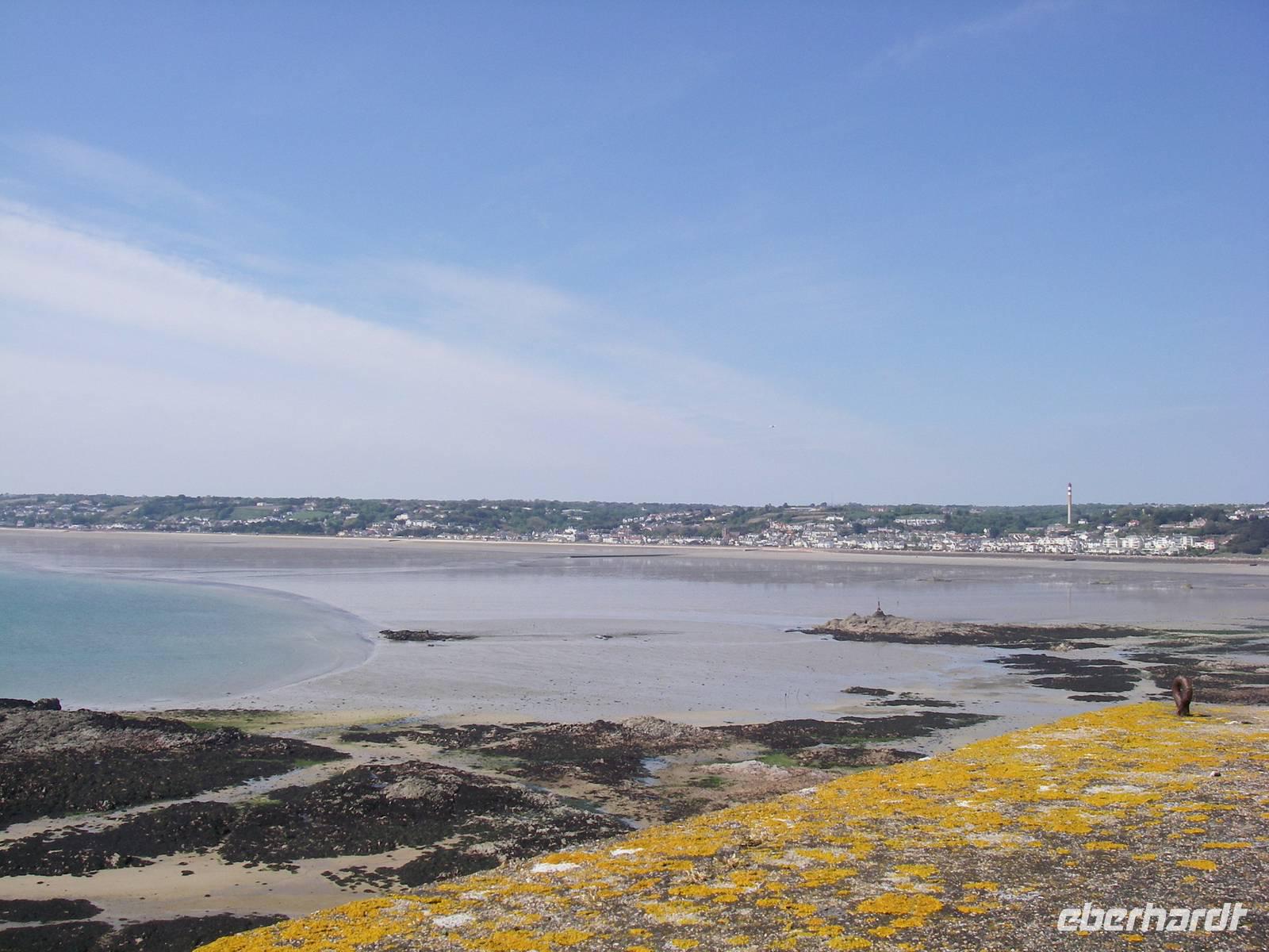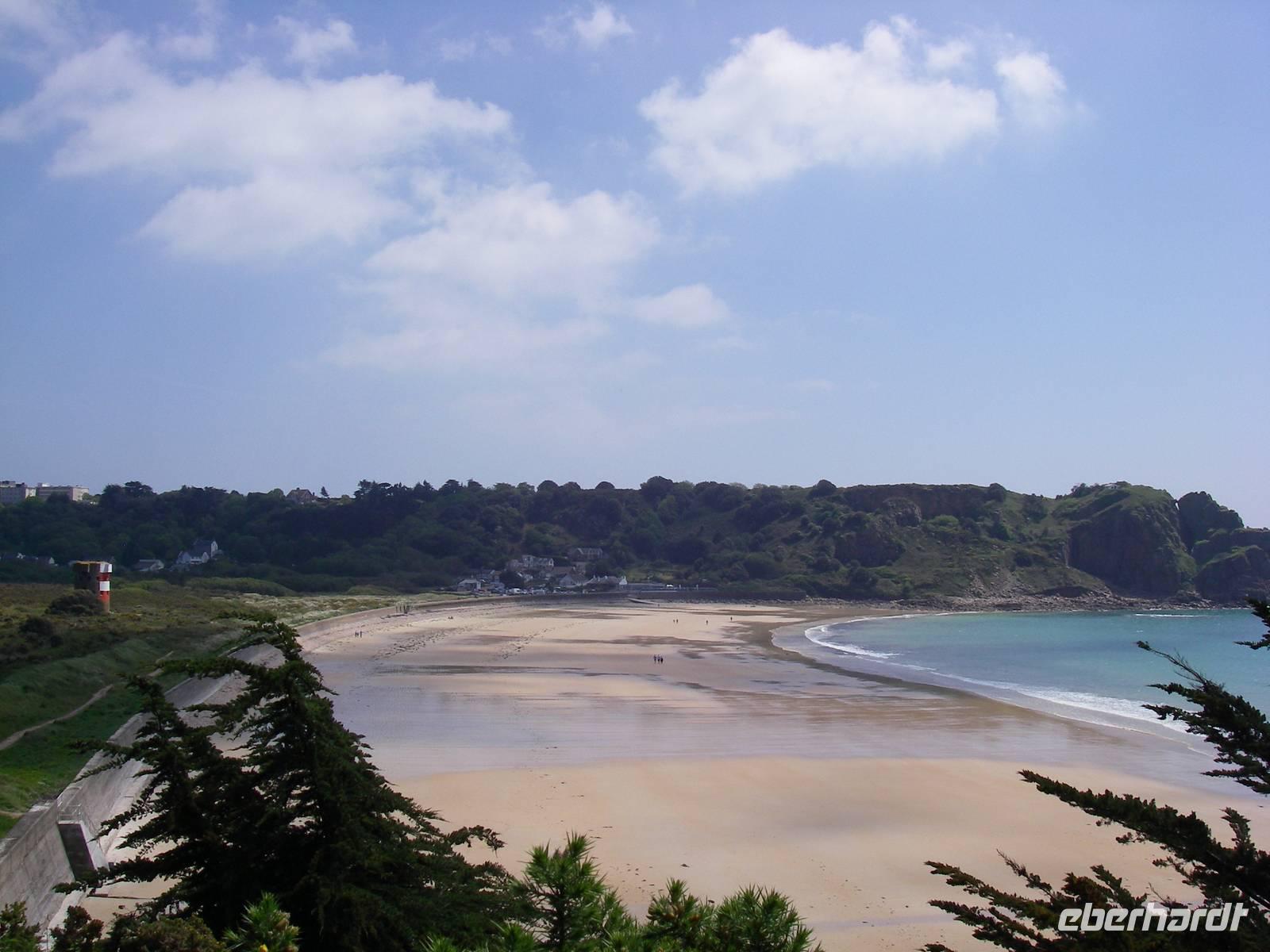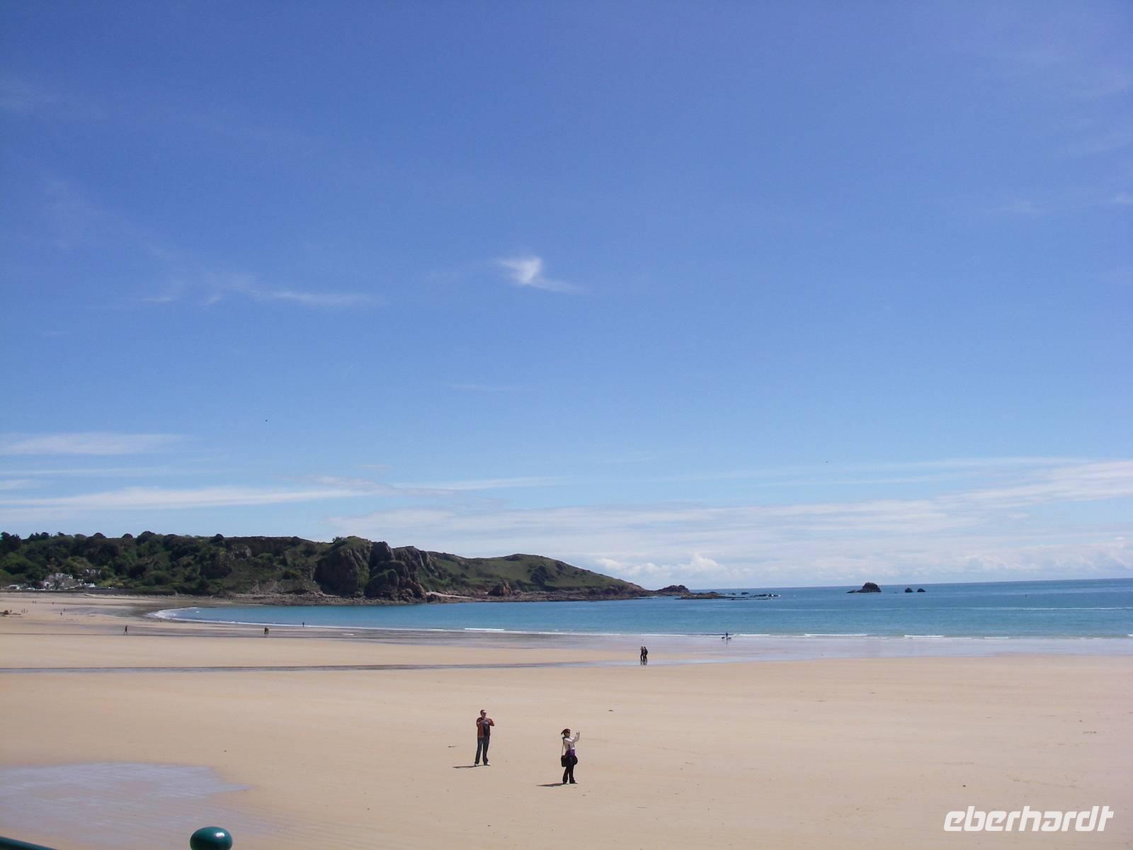 Auf unserer Rundfahrt umfahren wir die gesamte Insel entgegen dem Uhrzeigersinn. So fahren wir zunächst entlang der Ostküste bis nach Gorey, wo wir uns kurz die älteste Burg von Jersey, das Mont Orgueil Castle, und den Hafen anschauen. Weiter geht es dann entlang der St. Catherine's Bay und der Rozel Bay bis zur Bouley Bay. Bei einem Stopp in dieser Bucht erinnern wir uns an den gestrigen Tag und können leider wieder nicht auf Jakobsmuscheln-Jagd gehen. Vorbei an der Bonne Nuit Bay und durch die Parishes St. John und St. Mary erreichen wir Greve de Lecq. Hier machen wir heute unsere Mittagspause im Rosmany Restaurant. Dieses bietet einen günstigen und köstlichen Hummersalat, der von allen Gästen probiert wird. Wieder im Bus fahren längs der Plémont Bay bis zur Ruine des Grosnez Castles, wo im Großen und Ganzen nur noch die Toreinfahrt mit den umgebenen Mauern erhalten ist. An diesem nordwestlichen Punkt von Jersey haben wir einen guten Blick auf die Nachbarinseln. Entlang der Westküste gelangen wir zum Corbière Leuchtturm, der im Jahre 1873 gebaut wurde. Es ist gerade Ebbe, so dass die Gelegenheit bestünde rüber zum Leuchtturm zu laufen. Da dieser aber nicht für die Öffentlichkeit zugänglich ist, entschließen sich die Gäste dagegen und genießen den tollen Anblick von der Ferne. Hier befindet sich auch ein Denkmal, welches an ein Unglück von 1995 erinnert. Bei diesem Vorfall kam eine Fähre von Jersey nach Sark in Seenot. Jedoch konnten alle Passagiere an Bord gerettet werden. Nach diesem Highlight unserer Rundfahrt geht es weiter zu der begehrtesten Bucht von Jersey, der St. Brelade Bay. Mit einem leckeren Jersey-Eis in der Hand unternehmen viele Gäste hier einen kleinen Spaziergang entlang der Strandpromenade bzw. am Strand und genießen das herrliche Sommerwetter. Auf geht es dann schließlich zu unserem letzten Stopp für heute - zum Noirmont Point. Hier befindet sich eine ehemalige deutsche Bunkerstation. Dies nimmt Ernst zum Anlass uns über die Besatzungszeit auf Jersey zu berichten. Langsam neigt sich unsere Inselrundfahrt dem Ende zu. Wieder angekommen in St. Helier steigen wir alle am Liberation Square aus und bummeln durch die Stadt bis zu der 1881 erbauten, viktorianischen Markthalle. Hier gibt es unter anderem frisches Obst und tolle Blumensträuße zu kaufen. Wir schlendern einmal durch die Halle und gelangen auf der anderen Seite auf die Beresford Street, wo sich schon gleich der Fischmarkt befindet. Dieser bietet an verschiedenen Ständen unterschiedlichsten fangfrischen Fisch, Meeresfrüchte und Krustentiere an. Nach unserem gemeinsamen Bummel über die Märkte verbringt jeder den restlichen Nachmittag nach seinen eigenen Vorstellungen und wir treffen uns erst am Abend zum Essen im Hotelrestaurant wieder.