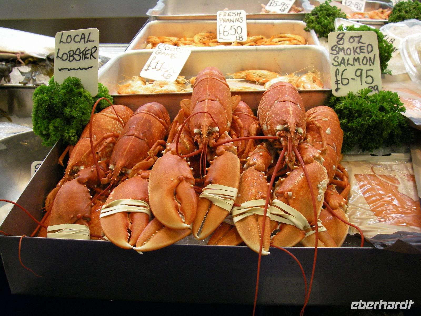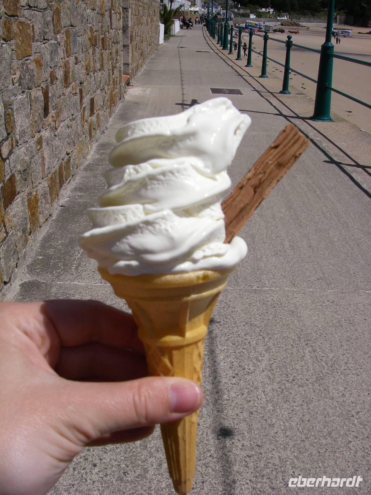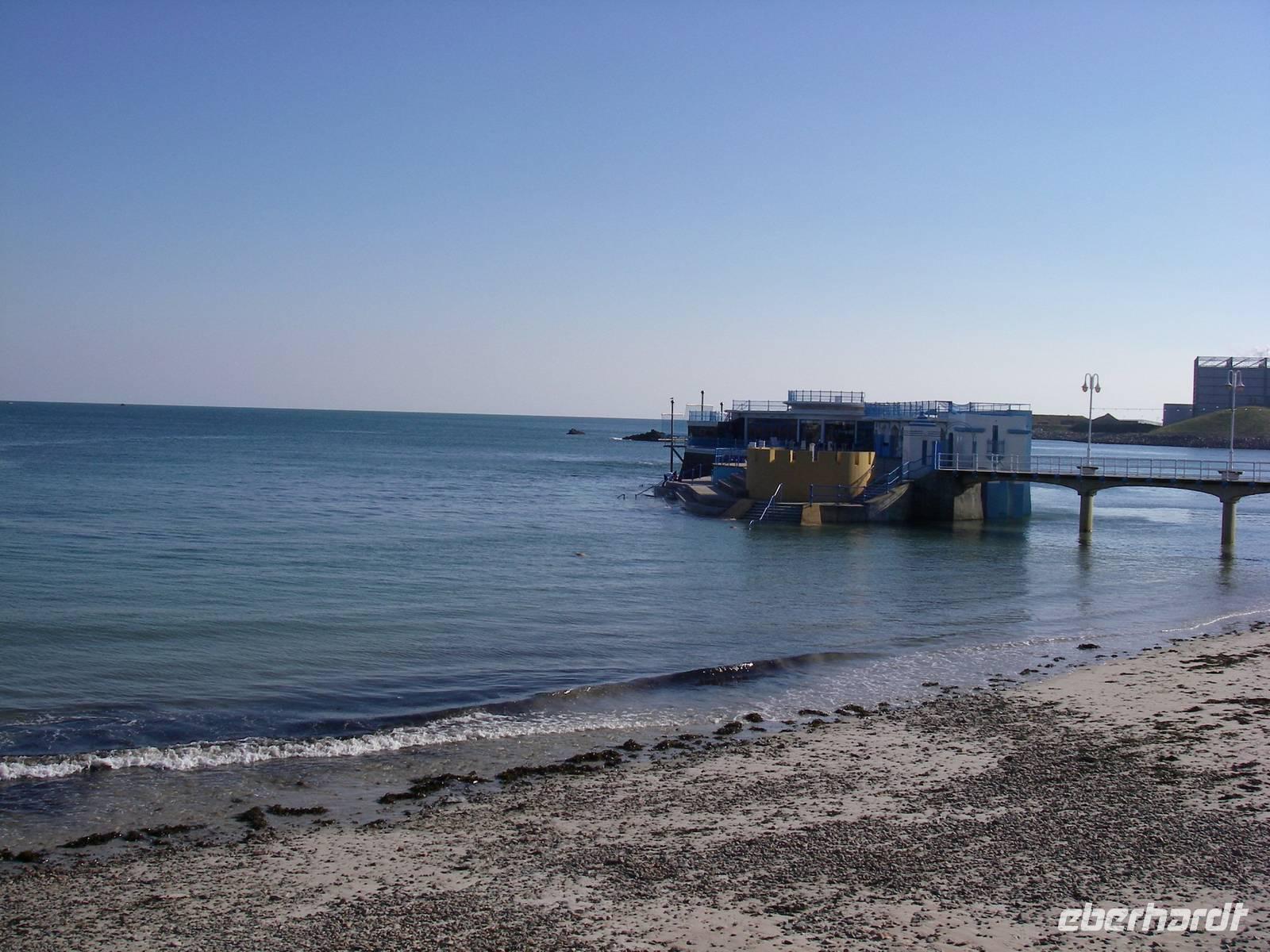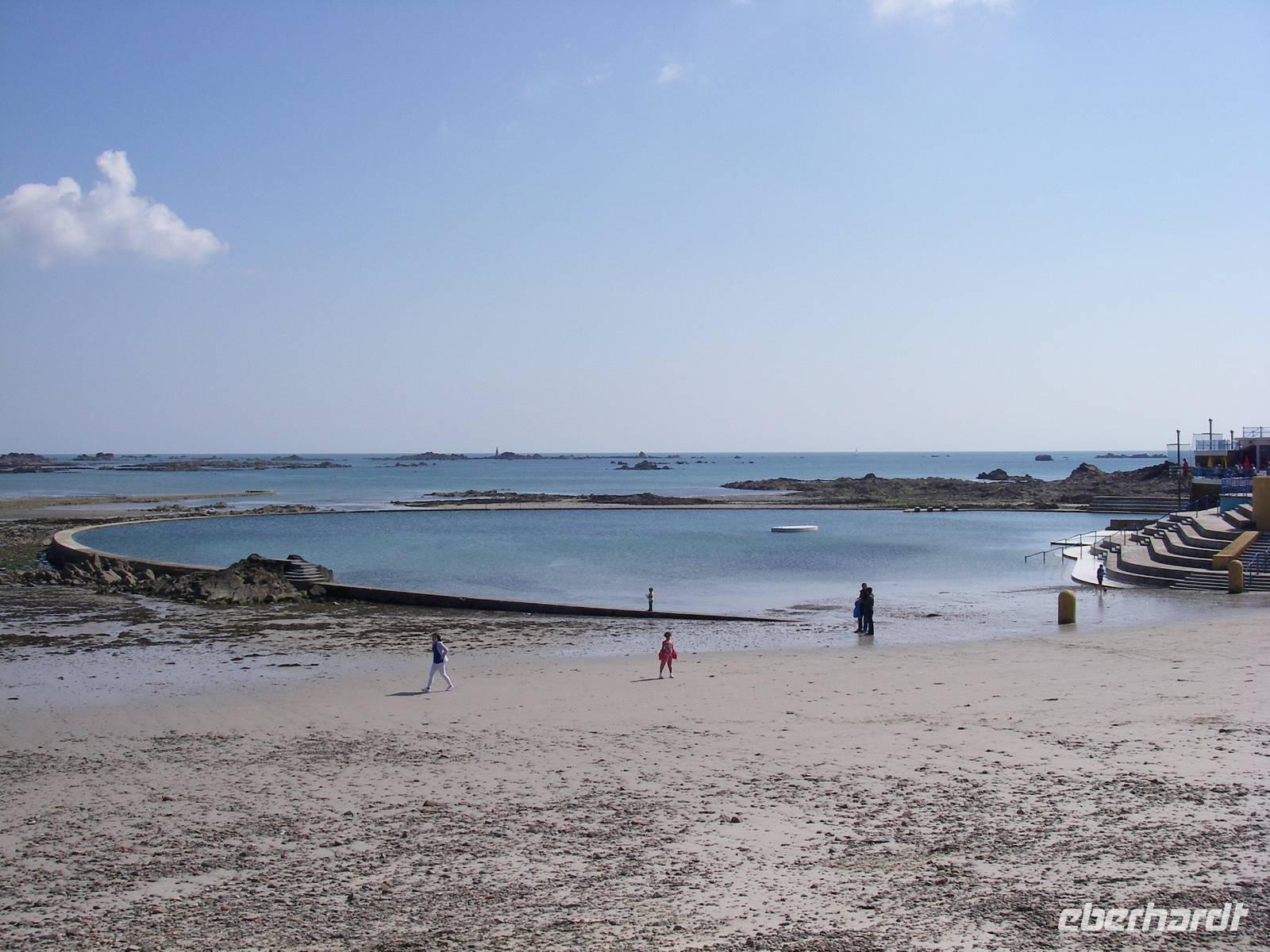 Auf unserer Rundfahrt umfahren wir die gesamte Insel entgegen dem Uhrzeigersinn. So fahren wir zunächst entlang der Ostküste bis nach Gorey, wo wir uns kurz die älteste Burg von Jersey, das Mont Orgueil Castle, und den Hafen anschauen. Weiter geht es dann entlang der St. Catherine's Bay und der Rozel Bay bis zur Bouley Bay. Bei einem Stopp in dieser Bucht erinnern wir uns an den gestrigen Tag und können leider wieder nicht auf Jakobsmuscheln-Jagd gehen. Vorbei an der Bonne Nuit Bay und durch die Parishes St. John und St. Mary erreichen wir Greve de Lecq. Hier machen wir heute unsere Mittagspause im Rosmany Restaurant. Dieses bietet einen günstigen und köstlichen Hummersalat, der von allen Gästen probiert wird. Wieder im Bus fahren längs der Plémont Bay bis zur Ruine des Grosnez Castles, wo im Großen und Ganzen nur noch die Toreinfahrt mit den umgebenen Mauern erhalten ist. An diesem nordwestlichen Punkt von Jersey haben wir einen guten Blick auf die Nachbarinseln. Entlang der Westküste gelangen wir zum Corbière Leuchtturm, der im Jahre 1873 gebaut wurde. Es ist gerade Ebbe, so dass die Gelegenheit bestünde rüber zum Leuchtturm zu laufen. Da dieser aber nicht für die Öffentlichkeit zugänglich ist, entschließen sich die Gäste dagegen und genießen den tollen Anblick von der Ferne. Hier befindet sich auch ein Denkmal, welches an ein Unglück von 1995 erinnert. Bei diesem Vorfall kam eine Fähre von Jersey nach Sark in Seenot. Jedoch konnten alle Passagiere an Bord gerettet werden. Nach diesem Highlight unserer Rundfahrt geht es weiter zu der begehrtesten Bucht von Jersey, der St. Brelade Bay. Mit einem leckeren Jersey-Eis in der Hand unternehmen viele Gäste hier einen kleinen Spaziergang entlang der Strandpromenade bzw. am Strand und genießen das herrliche Sommerwetter. Auf geht es dann schließlich zu unserem letzten Stopp für heute - zum Noirmont Point. Hier befindet sich eine ehemalige deutsche Bunkerstation. Dies nimmt Ernst zum Anlass uns über die Besatzungszeit auf Jersey zu berichten. Langsam neigt sich unsere Inselrundfahrt dem Ende zu. Wieder angekommen in St. Helier steigen wir alle am Liberation Square aus und bummeln durch die Stadt bis zu der 1881 erbauten, viktorianischen Markthalle. Hier gibt es unter anderem frisches Obst und tolle Blumensträuße zu kaufen. Wir schlendern einmal durch die Halle und gelangen auf der anderen Seite auf die Beresford Street, wo sich schon gleich der Fischmarkt befindet. Dieser bietet an verschiedenen Ständen unterschiedlichsten fangfrischen Fisch, Meeresfrüchte und Krustentiere an. Nach unserem gemeinsamen Bummel über die Märkte verbringt jeder den restlichen Nachmittag nach seinen eigenen Vorstellungen und wir treffen uns erst am Abend zum Essen im Hotelrestaurant wieder.