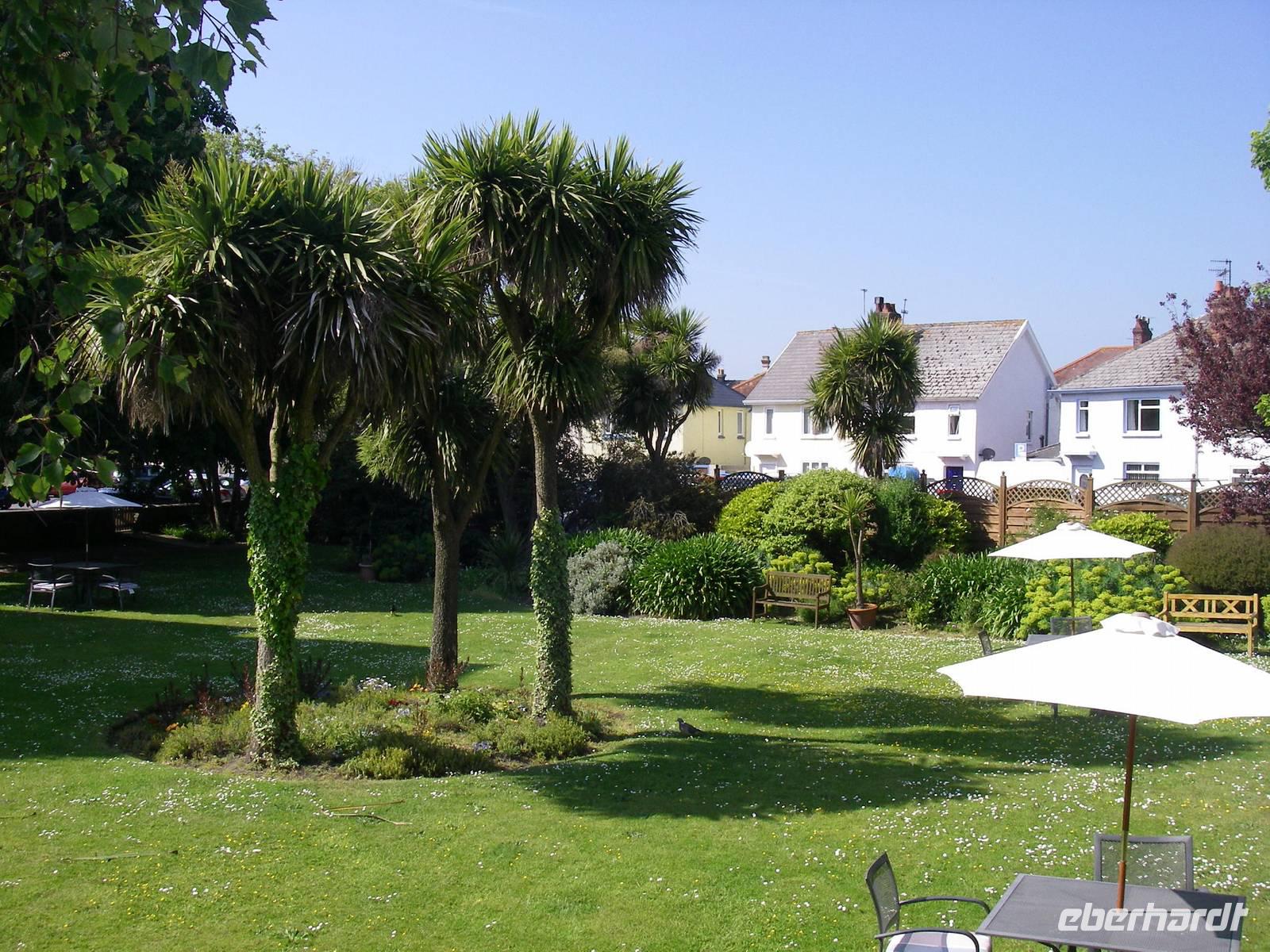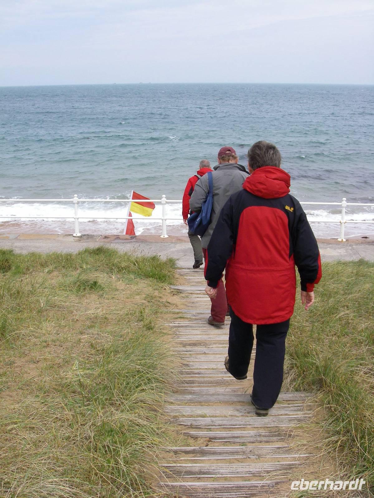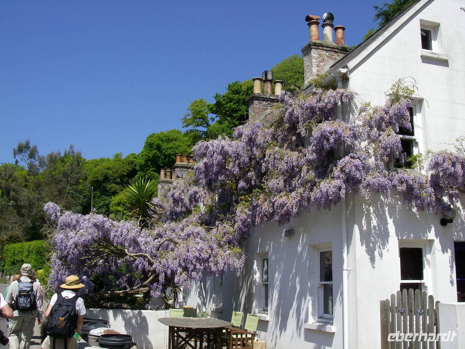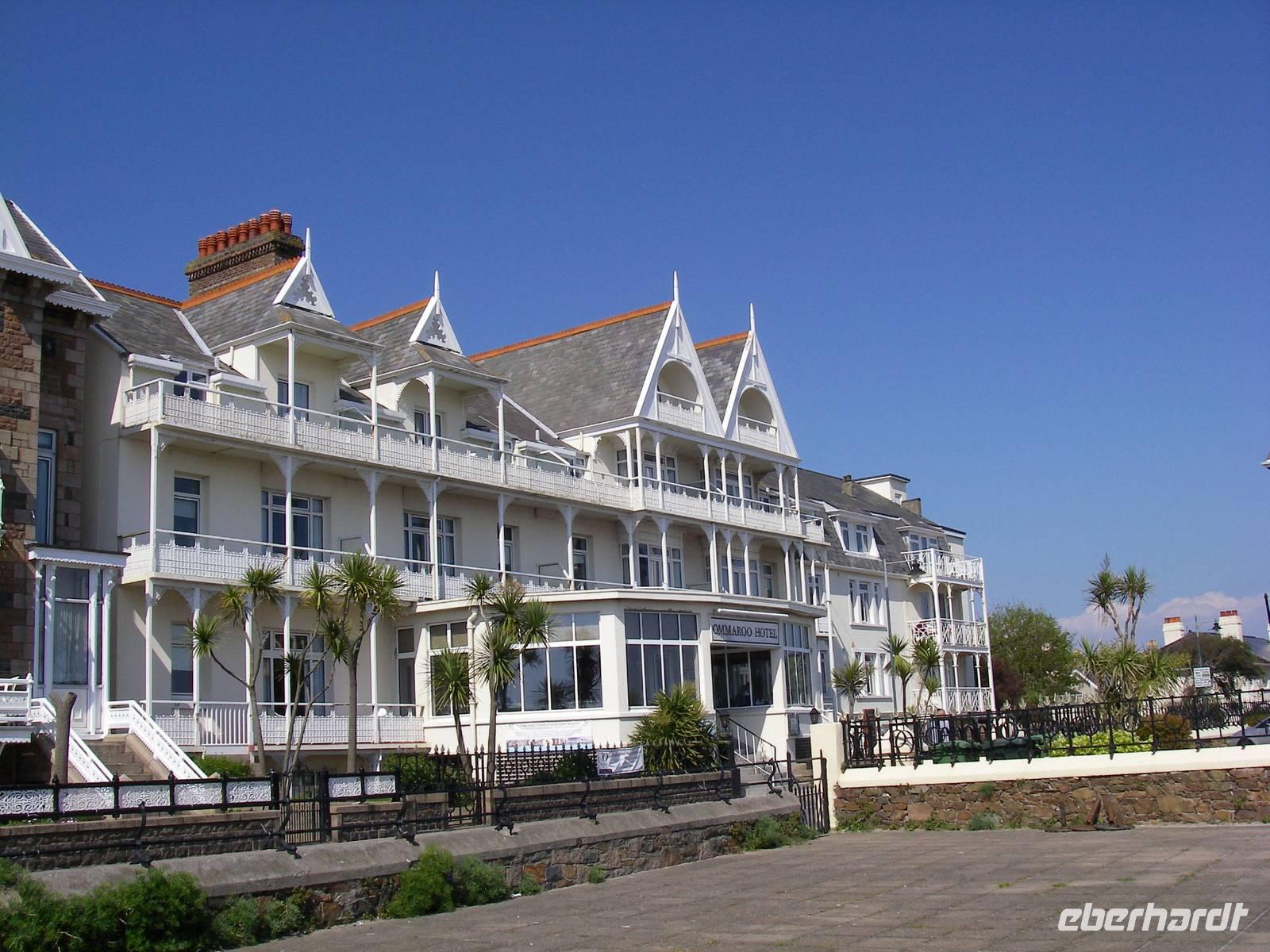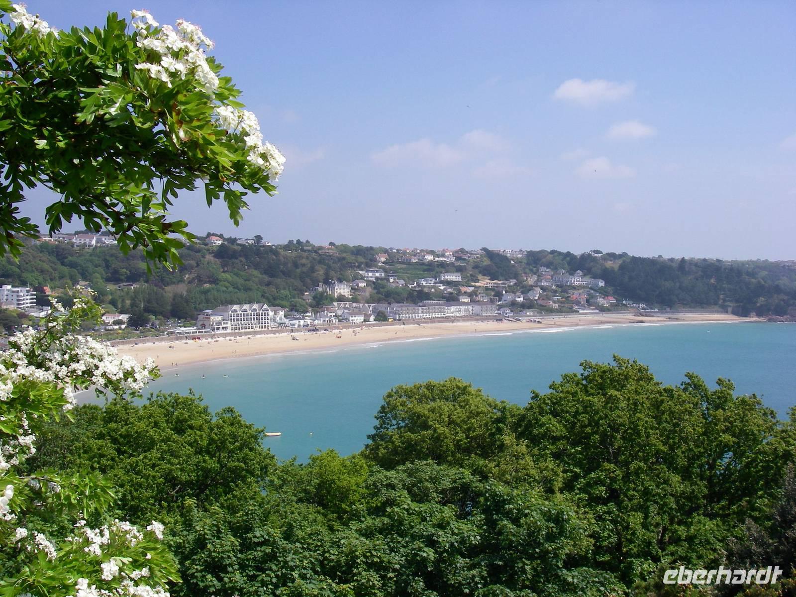 Nun ist es endlich soweit - unser Wanderabendteuer auf den Kanalinseln Jersey und Sark kann beginnen. Nachdem alle Gäste am Flughafen in Dresden angekommen sind, geben wir am Schalter der Lufthansa unser Gepäck ab und stellen uns anschließend sofort den Sicherheitskontrollen. Pünktlich heben wir schließlich Richtung Düsseldorf ab. Dort angekommen begeben wir uns auch gleich zum Abfluggate und stoßen unterwegs auf die Gäste aus Berlin. Vollzählig starten wir voller Vorfreude auf eine unvergessliche Wanderreise im Blütenparadies Richtung Jersey, der südlichsten und größten Insel der Kanalinseln. Beim Landeanflug haben wir einen tollen Blick auf die Insel - es ist gerade Ebbe und große Teile des Wattes sind frei von Wasser. Heute ist UEFA-Champions-League-Finale, wo die deutschen Mannschaften Bayern München und Borussia Dortmund aufeinander treffen. Da anscheinend auch unser Pilot ein großer Fan der Mannschaft von Dortmund ist, befindet sich an unserem Flugzeug eine Fahne dieses Fußballvereins. Auf Jersey angekommen, werden wir von Heidi, unserer Wanderführerin, freundlich begrüßt. Sie bringt uns sicher und bequem in unser Hotel für die nächsten 8 Tage, dem Hotel Ommaroo. Nachdem wir eingecheckt und uns etwas frischt haben, begeben wir uns auf die erste Erkundungstour durch die Stadt St. Helier, der Inselhauptstadt. Wir schlendern durch die kleinen Straßen und die Einkaufsmeile der Stadt. In einem kleinen Café an der Straße machen wir es uns bequem und stärken uns bei herrlichem Sonnenschein mit leckeren Baguettes. Zurück im Hotel gestaltet jeder den Rest des Nachmittags nach seinen eigenen Wünschen. Es ist immer noch Ebbe, aber die Flut lässt nun nicht mehr lange auf sich warten. Pünktlich 19 Uhr treffen wir uns zu unserem gemeinsamen Abendessen im Hotelrestaurant. Bei einem köstlichen 3-Gang-Menü bekommen wir erste kulinarische Eindrücke der britischen Küche. Mit einem Fernsehabend mit dem Fußballspiel Borussia Dortmund gegen Bayern München lassen einige Gäste den Tag ausklingen, welcher mit einem Sieg für Bayern München endet.