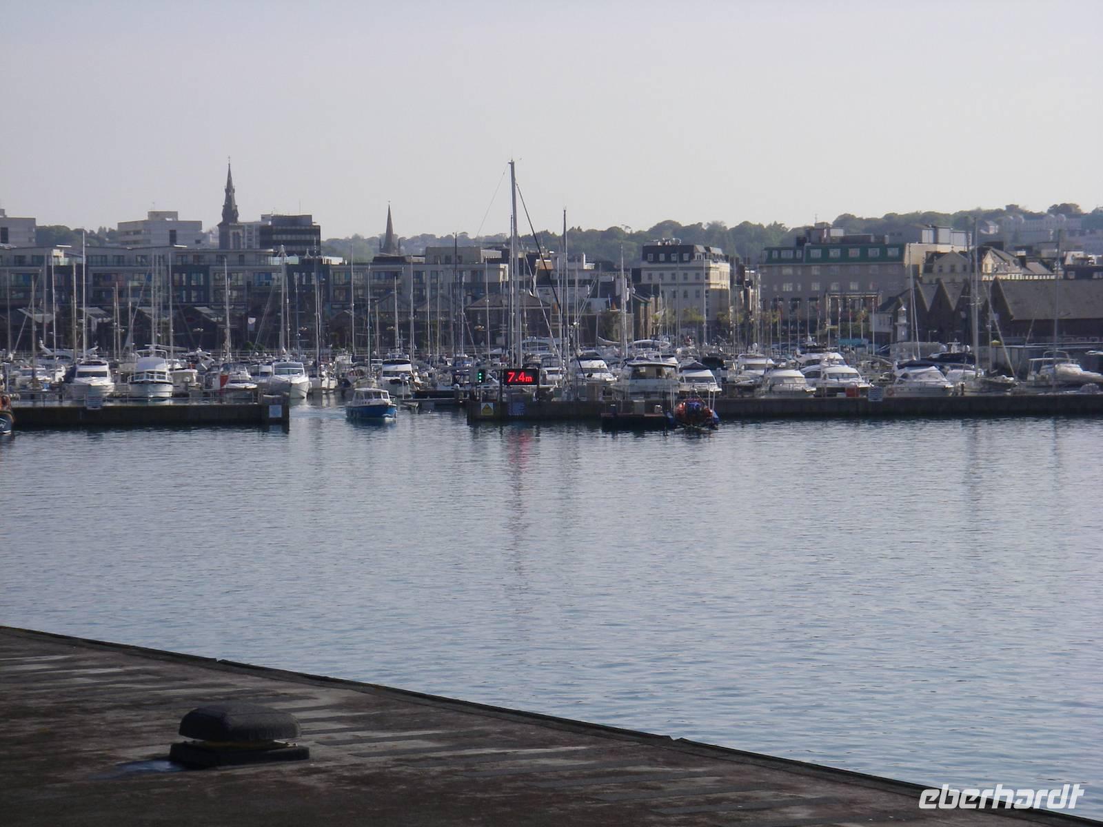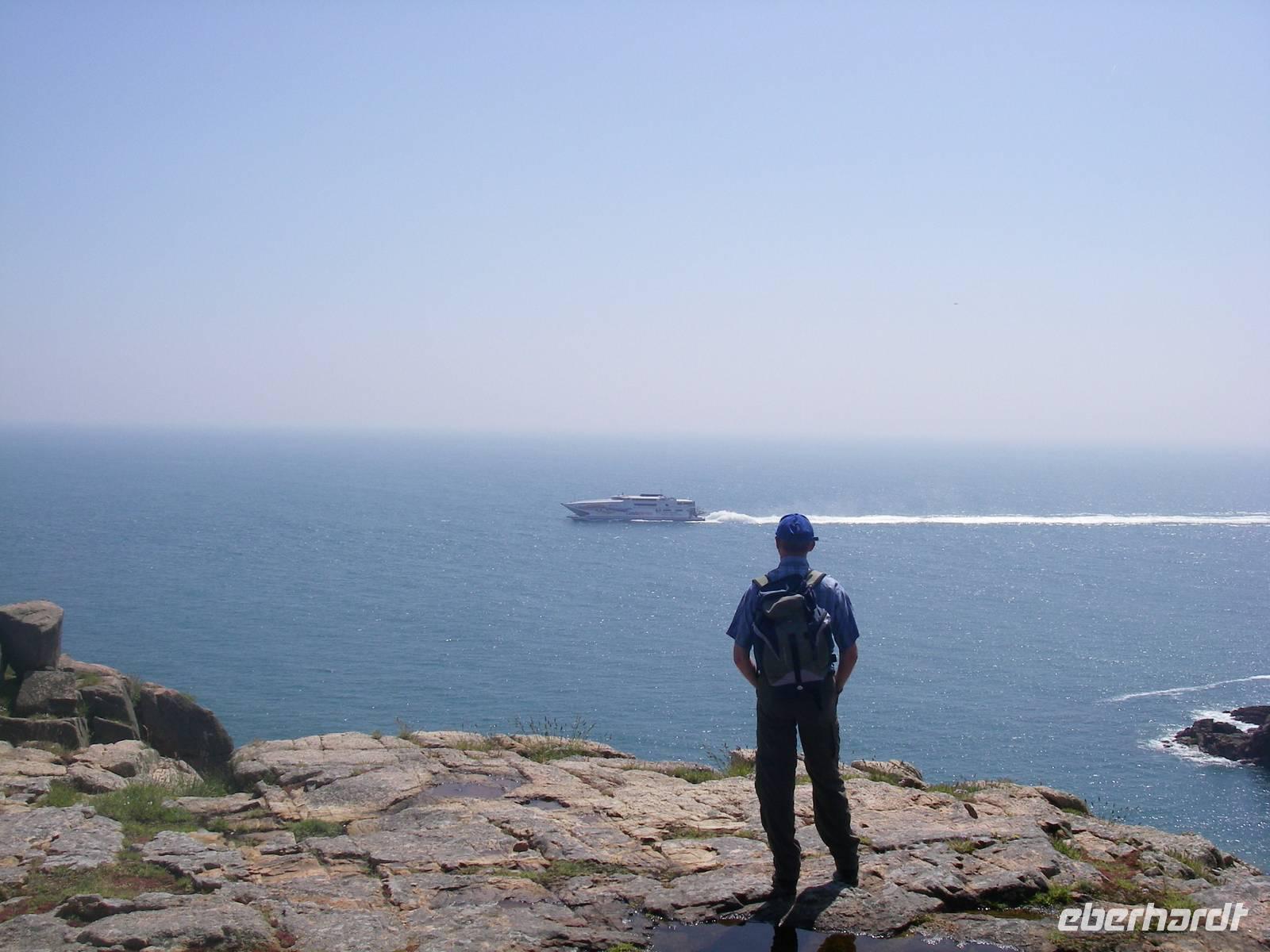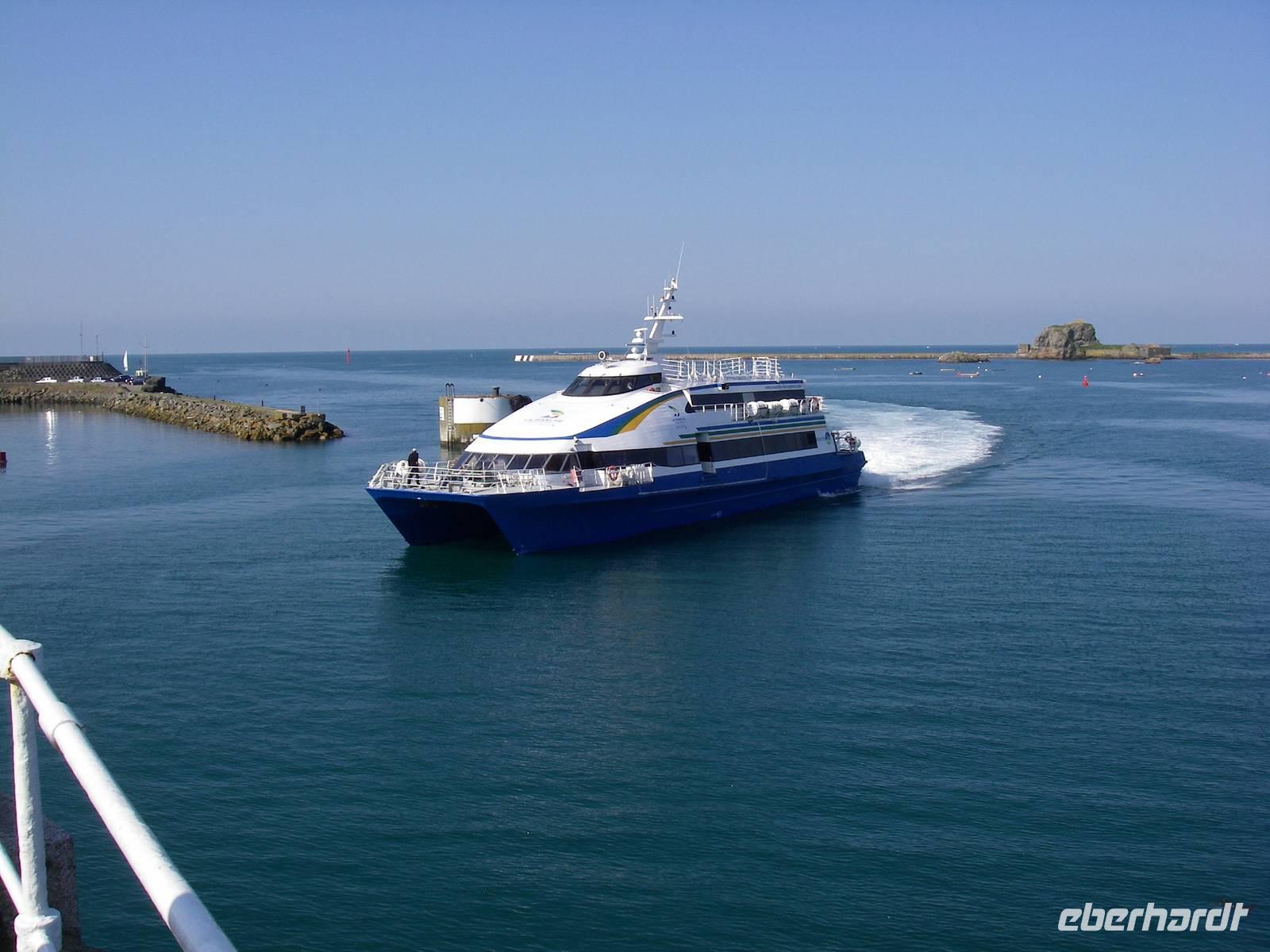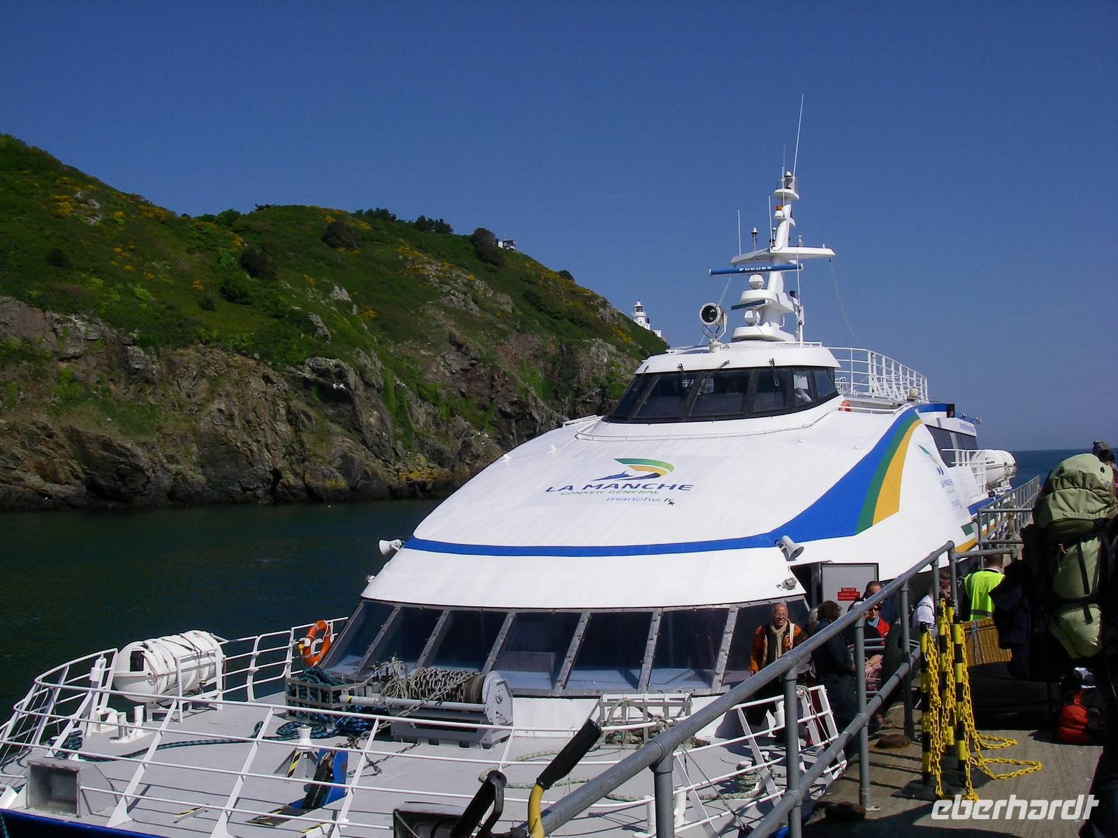 Nach einem zeitigen Frühstück werden wir heute gegen 8:15 Uhr von Heidi vom Hotel abgeholt. Obwohl die Fähre nach Sark erst etwa 9:45 Uhr ablegen soll, sind wir bereits 8:30 Uhr am Hafen, da schon eine Stunde vor der Abfahrt eingecheckt werden muss. Während dies Heidi für uns erledigt, nutzen wir die Zeit und erkunden den Hafen. Auf der Hafenmauer genießen wir den schönen Ausblick und sehen wie unsere Fähre schließlich den Hafen erreicht. Das Wetter meint es heute gut mit uns und bei strahlend blauem Himmel legen wir 9:40 Uhr vom Albert Pier in Jersey ab. Das Meer ist ruhig, so dass wir eine angenehme einstündige Überfahrt nach Sark, der zweitkleinsten Insel der Kanalinseln, haben.