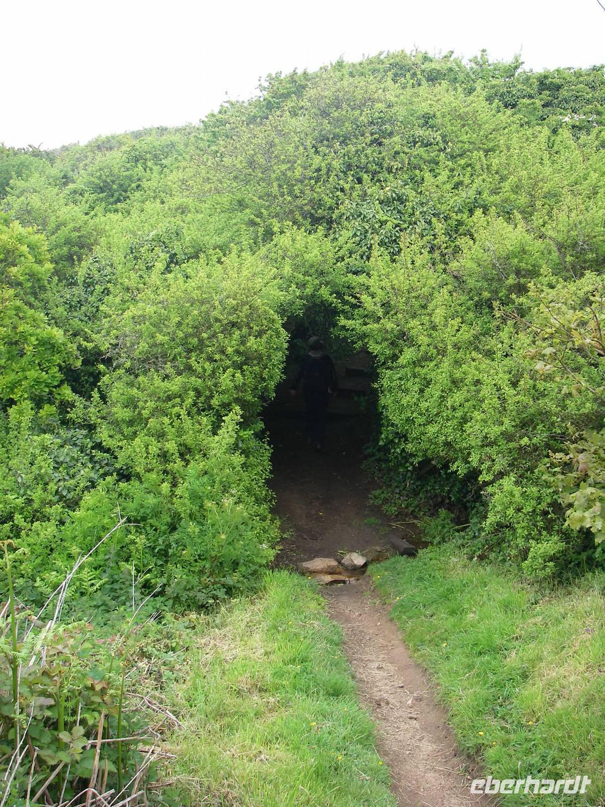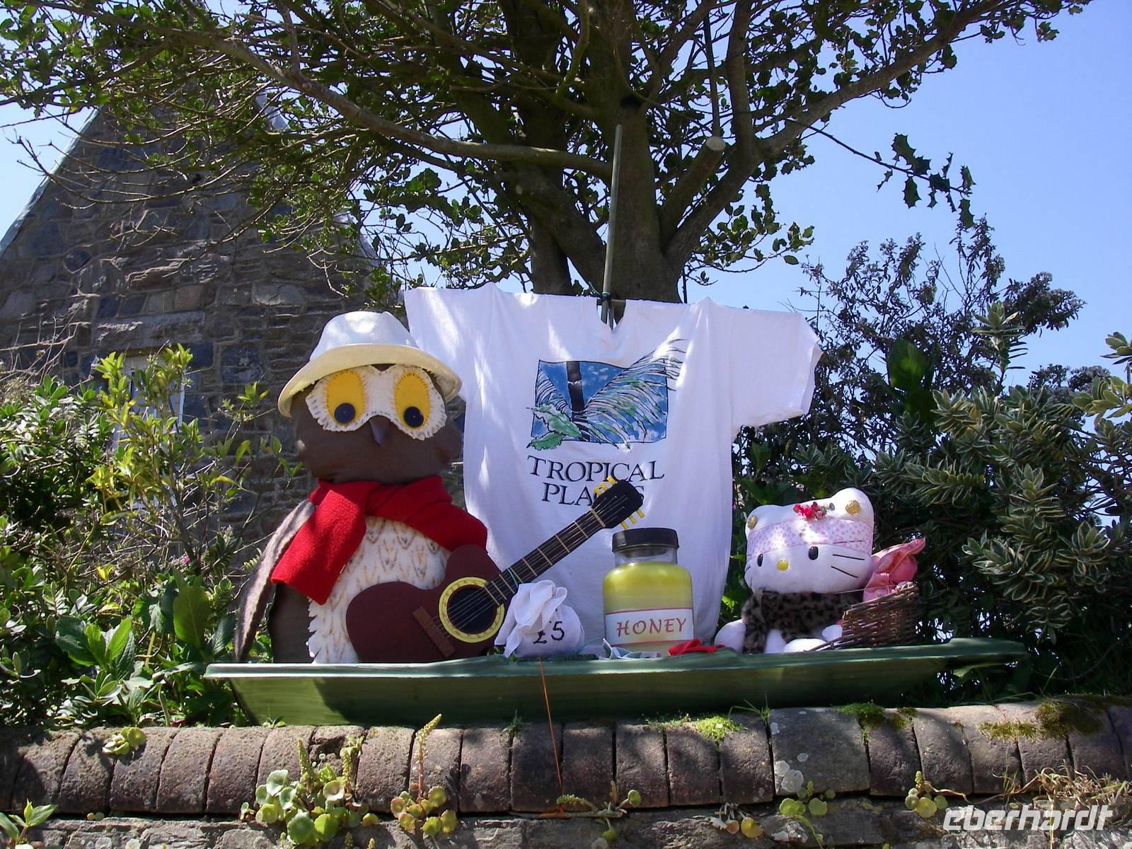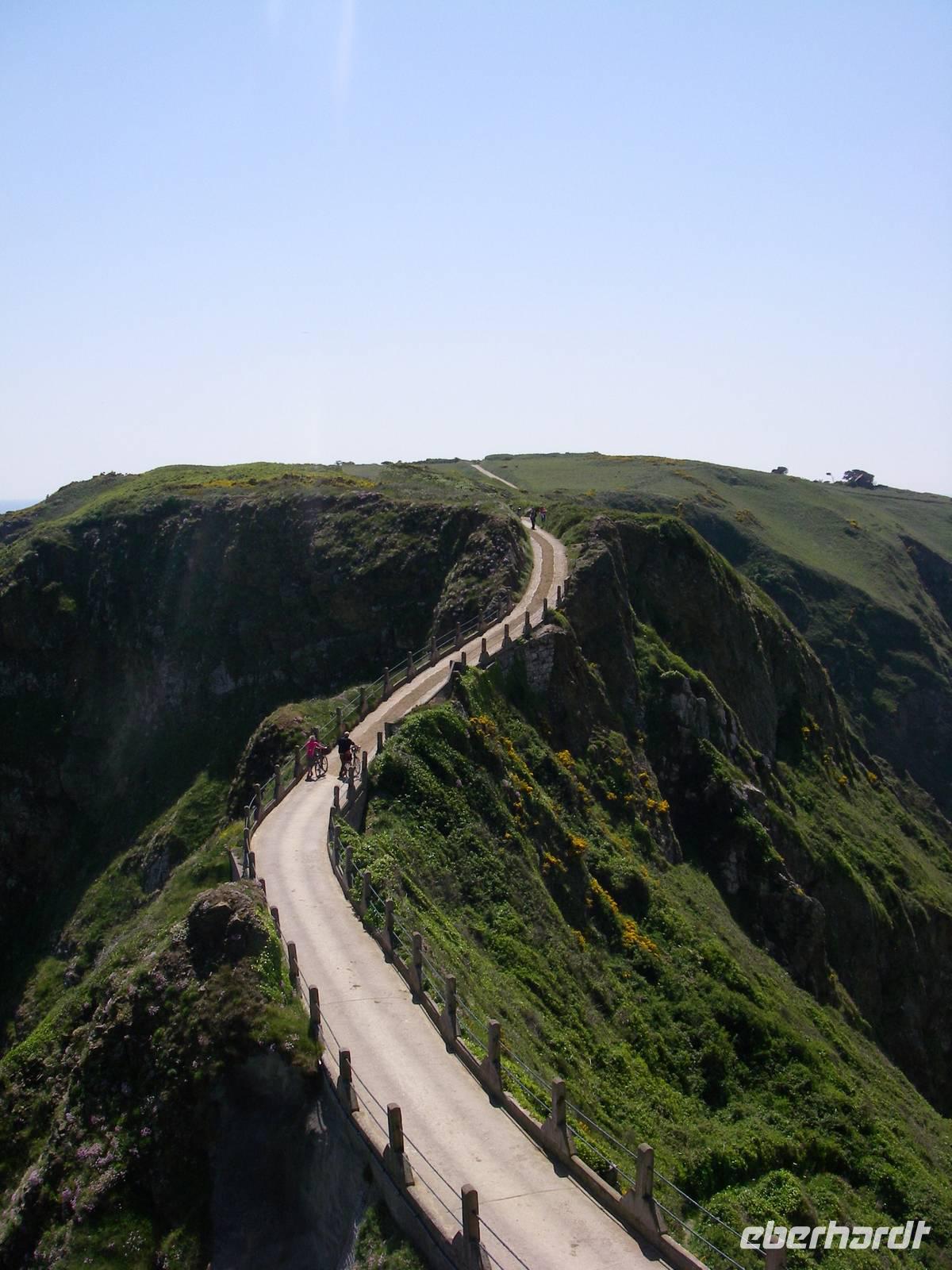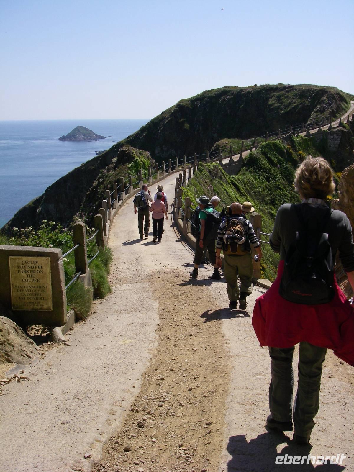 Angekommen am Maseline Hafen auf Sark beginnen wir unsere Wandertour mit einem Aufstieg auf den Harbour Hill bis zum Dorf. Unterwegs kommen wir an verschiedenen Figuren vorbei, die extra für den an diesem Wochenende stattfindende Vogelseuchenwettbewerb aufgestellt wurden. Vom Dorf laufen wir zur La Seigneurie, wo wir uns die prächtigen Gärten anschauen und durch einen Irrgarten kämpfen. Alles blüht herrlich und wir verweilen etwas. Anschließend wandern wir zum Window in the Rock, welches ein unnatürlicher Durchgang durch eine Felswand ist, durch den früher Güter von dem darunterliegenden Hafen hochgezogen wurden. Hier bietet sich uns ein einzigartiger Ausblick, welchen wir mit unzähligen Fotos festhalten. Nun geht es zurück zum Dorf. Unterwegs kommen wir an der Kirche von Sark vorbei, die wir besuchen und sogar den Pfarrer kurz kennenlernen, der uns in deutscher Sprache recht herzlich willkommen heißt. Etwas erschöpft, gönnen wir uns eine Mittagspause. In dem Garten eines kleinen Café setzen wir uns und stärken uns bei herrlichem Sonnenschein mit kleinen Snacks. Frisch gestärkt wandern wir über Weiden, Weinanbaufelder und einem Küstenpfad zum La Coupée. Dies ist eine Verbindungsbrücke zwischen Great und Little Sark, welche von den Deutschen als Kriegsgefangene betoniert wurde. Unterwegs genießen wir die tollen Ausblicke und sehen in der Ferne die Nachbarinseln von Sark.
