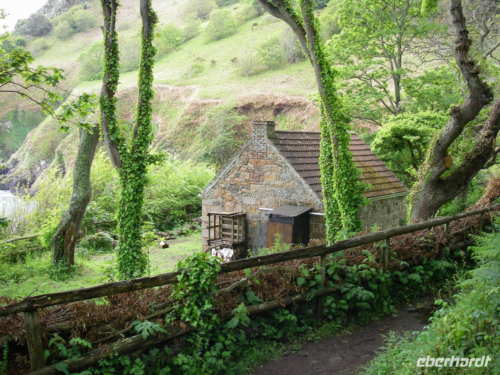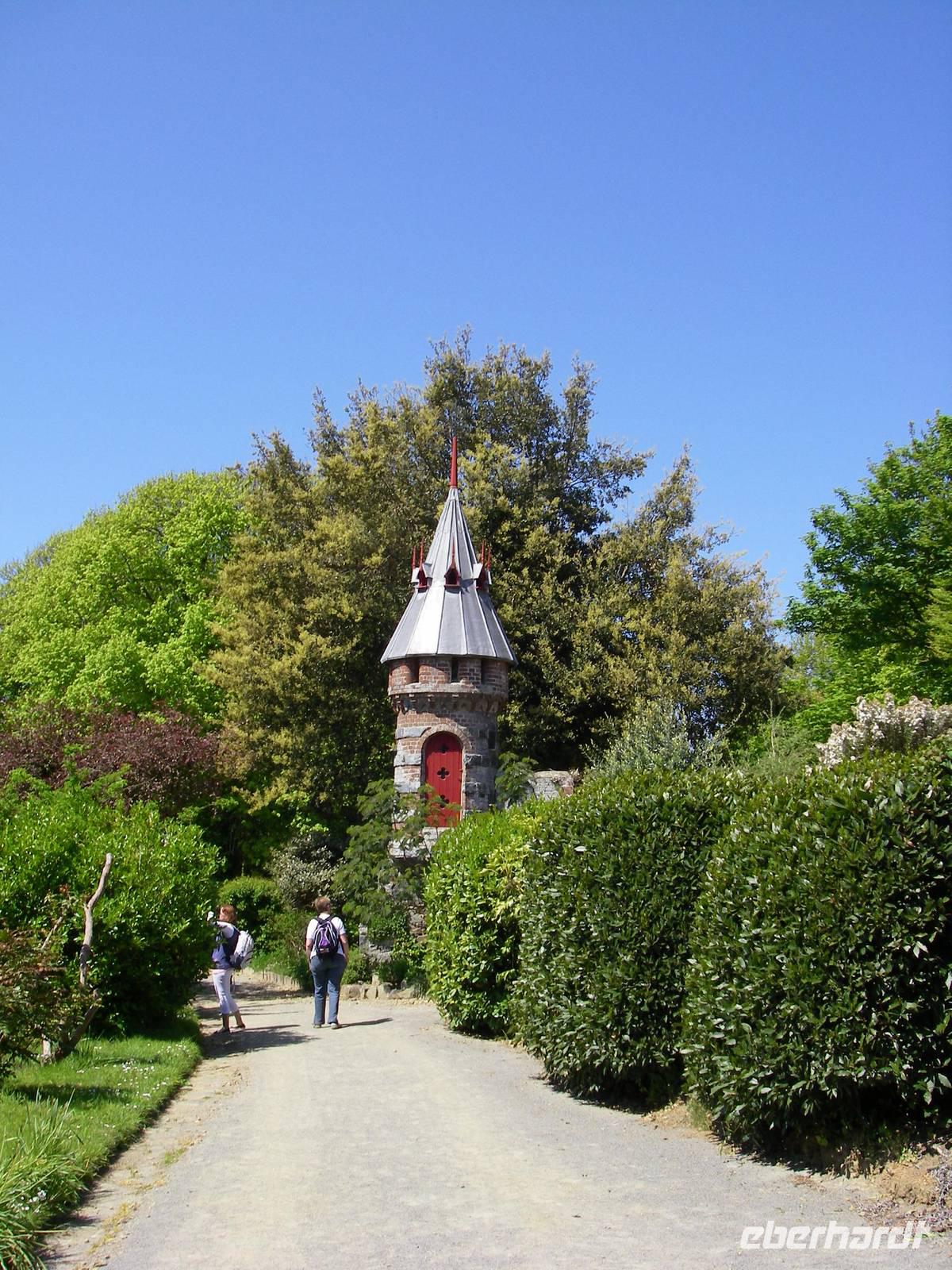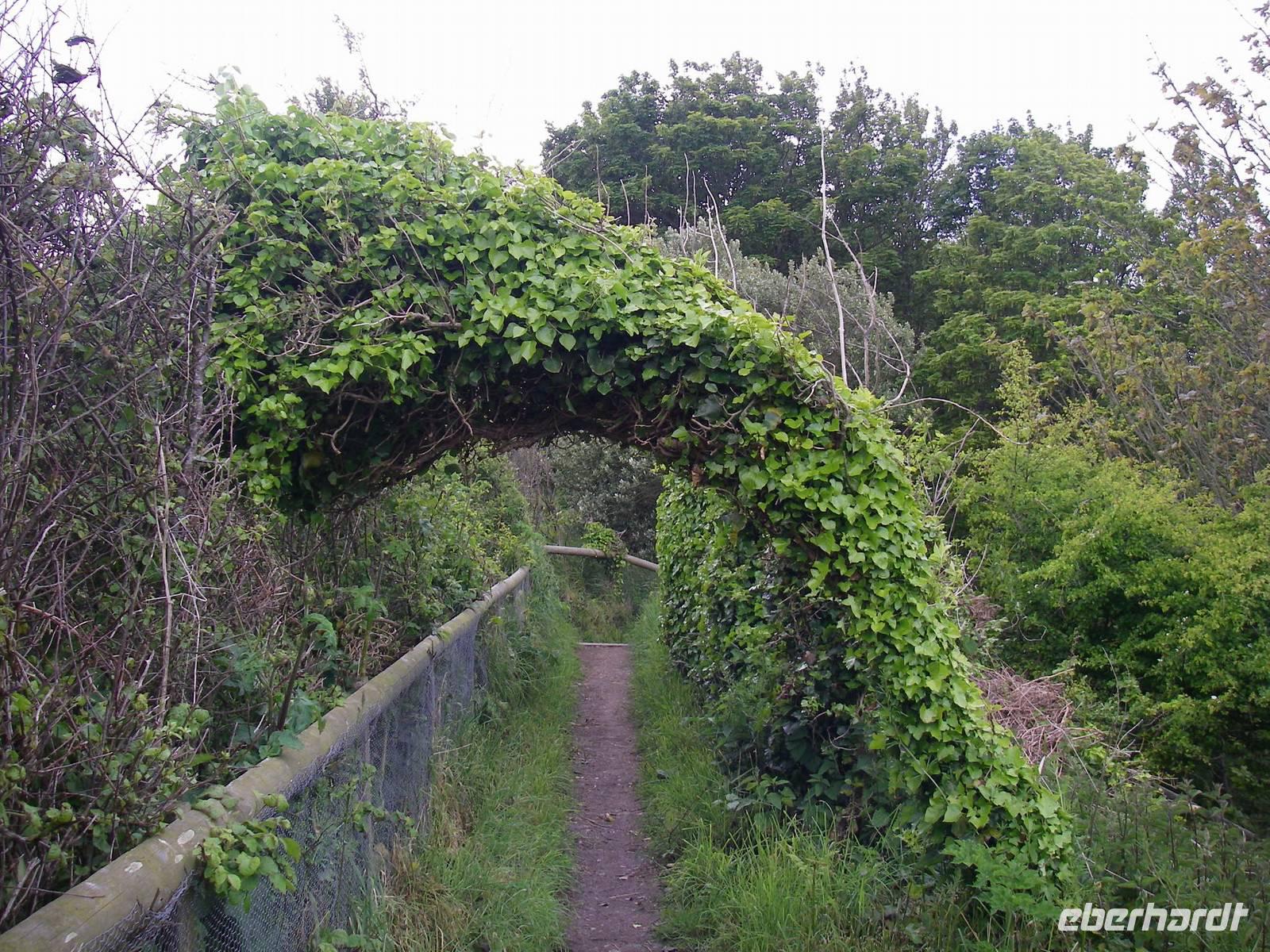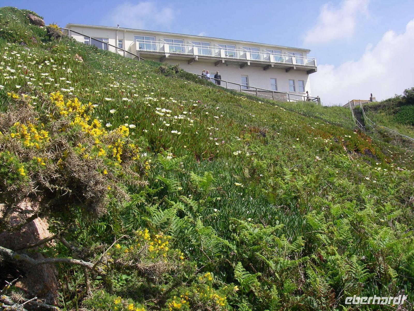 Angekommen am Maseline Hafen auf Sark beginnen wir unsere Wandertour mit einem Aufstieg auf den Harbour Hill bis zum Dorf. Unterwegs kommen wir an verschiedenen Figuren vorbei, die extra für den an diesem Wochenende stattfindende Vogelseuchenwettbewerb aufgestellt wurden. Vom Dorf laufen wir zur La Seigneurie, wo wir uns die prächtigen Gärten anschauen und durch einen Irrgarten kämpfen. Alles blüht herrlich und wir verweilen etwas. Anschließend wandern wir zum Window in the Rock, welches ein unnatürlicher Durchgang durch eine Felswand ist, durch den früher Güter von dem darunterliegenden Hafen hochgezogen wurden. Hier bietet sich uns ein einzigartiger Ausblick, welchen wir mit unzähligen Fotos festhalten. Nun geht es zurück zum Dorf. Unterwegs kommen wir an der Kirche von Sark vorbei, die wir besuchen und sogar den Pfarrer kurz kennenlernen, der uns in deutscher Sprache recht herzlich willkommen heißt. Etwas erschöpft, gönnen wir uns eine Mittagspause. In dem Garten eines kleinen Café setzen wir uns und stärken uns bei herrlichem Sonnenschein mit kleinen Snacks. Frisch gestärkt wandern wir über Weiden, Weinanbaufelder und einem Küstenpfad zum La Coupée. Dies ist eine Verbindungsbrücke zwischen Great und Little Sark, welche von den Deutschen als Kriegsgefangene betoniert wurde. Unterwegs genießen wir die tollen Ausblicke und sehen in der Ferne die Nachbarinseln von Sark.