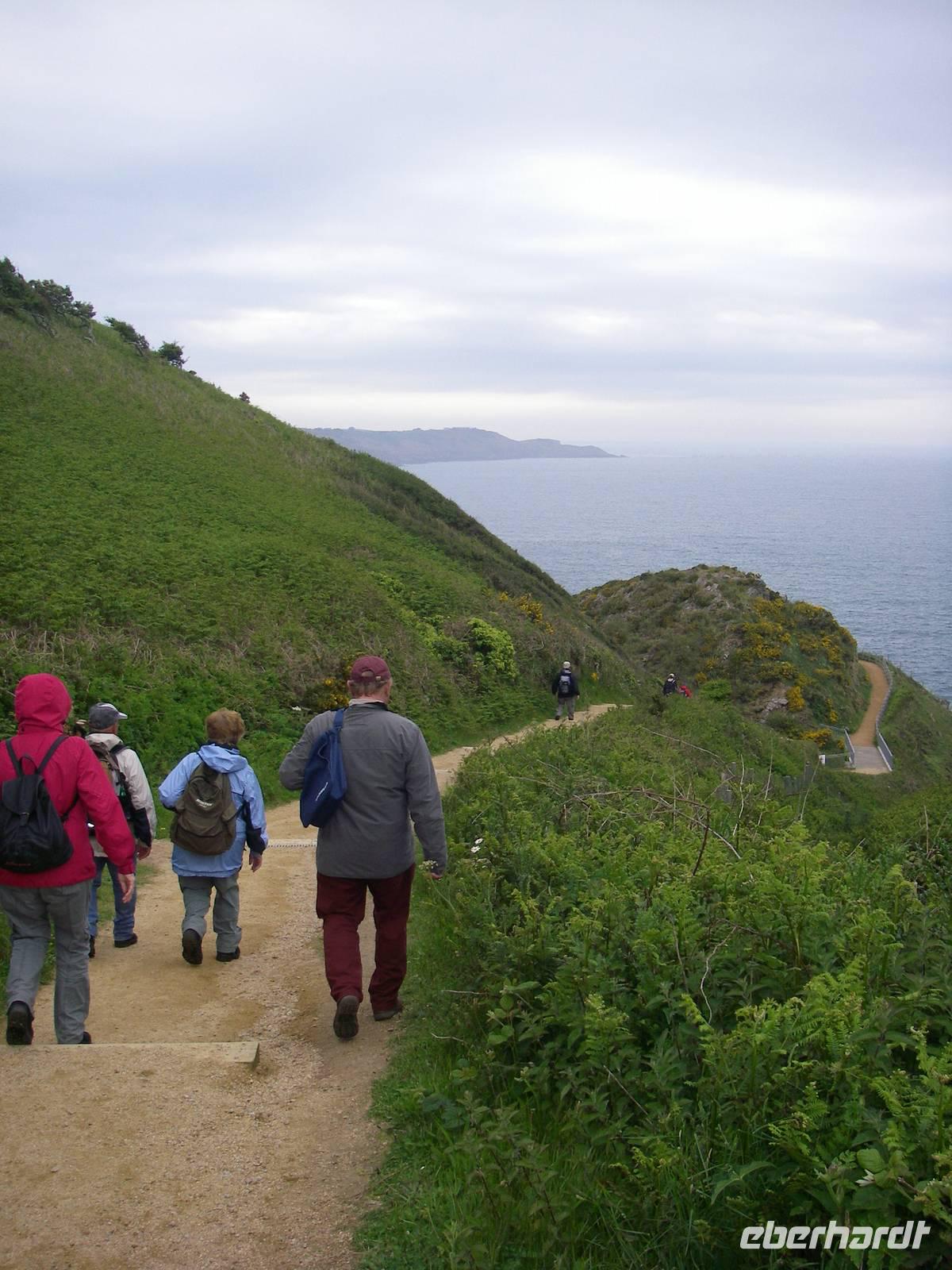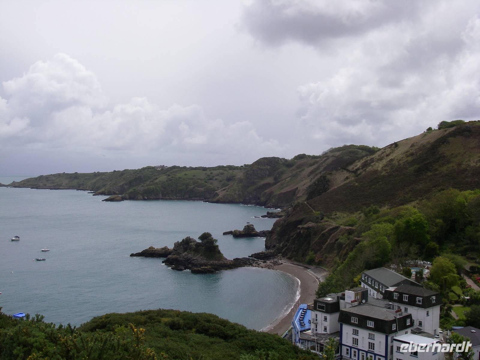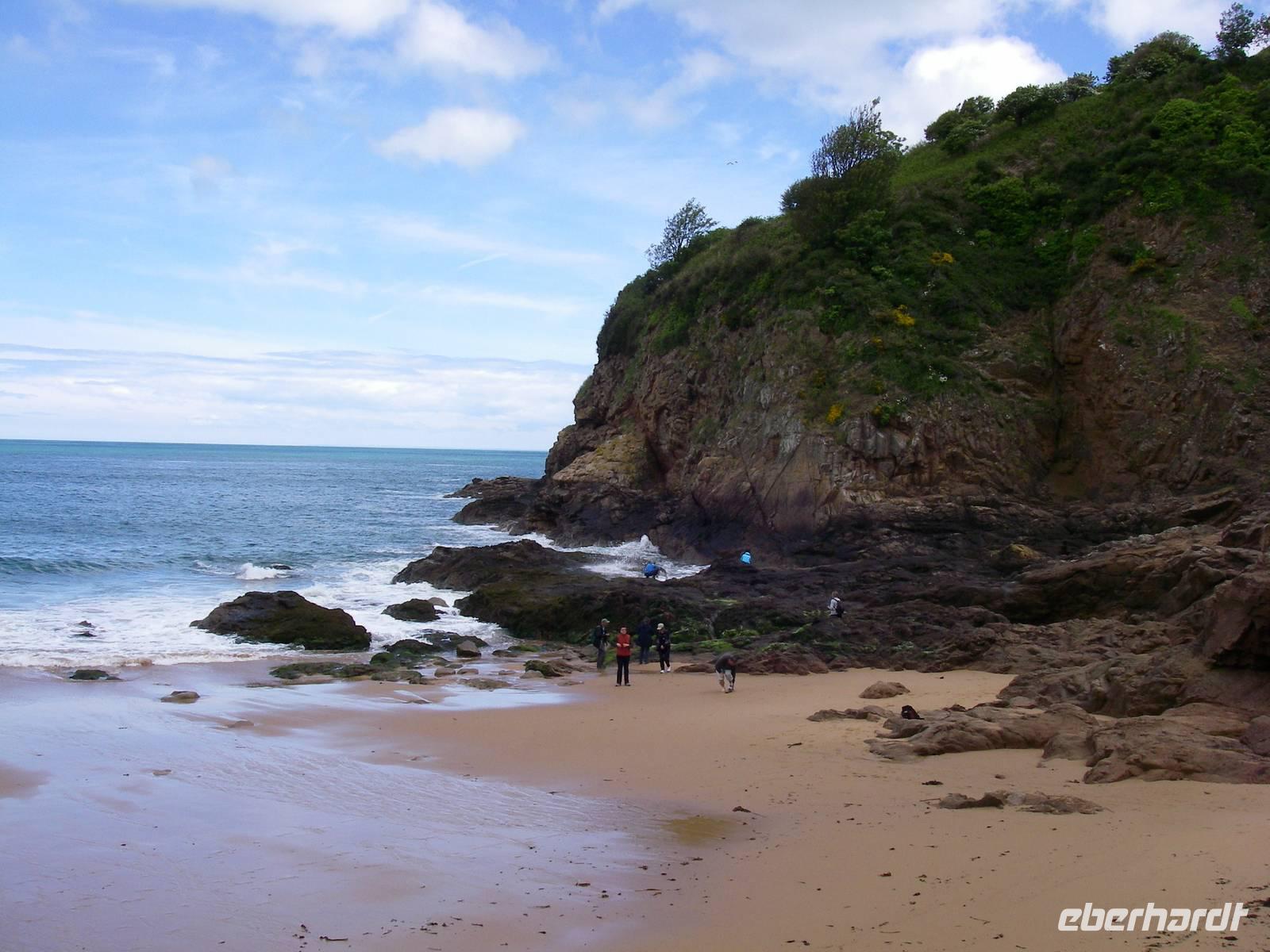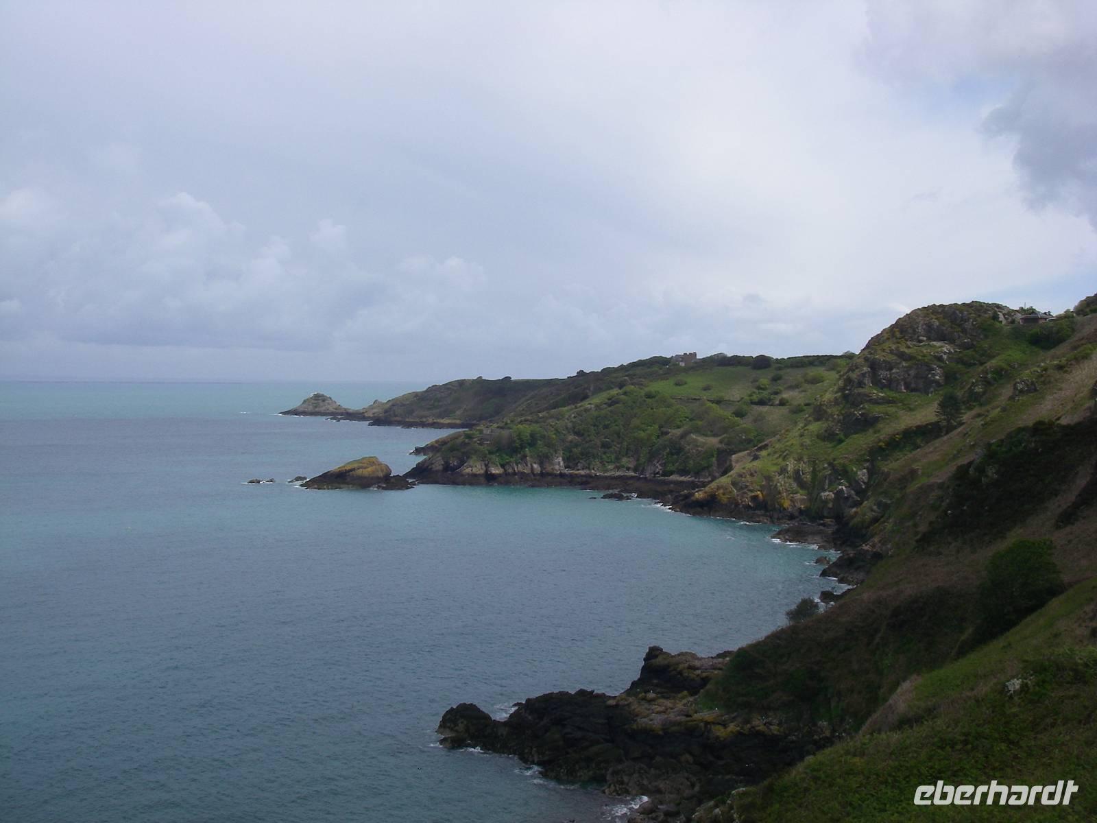Wie vorhergesagt, regnet es heute. Aber wir geben die Hoffnung auf besseres Wetter nicht auf. Mit einem wie immer reichlichen Frühstück starten wir in den Tag und werden gegen 9:30 Uhr von Heidi und Ernst, der unser Chauffeur für den heutigen Tag ist, abgeholt. Von St. Helier fahren wir durch das Landesinnere nach Norden bis wir nach ca. 20 Minuten wieder die Küste erreichen. An der Bonne Nuit Bay steigen wir bei trockenen Wetter aus dem Bus und beginnen unsere Wanderung Richtung Osten. Entlang eines schmalen Küstenpfades wandern wir bei einem Mix aus Sonne und Wolken an der Giffard Bay bis zur Bouley Bay. Die Aussichten auf das Meer und die Buchten sind unvergesslich und die Vegetation ist prächtig. Unterwegs geht es immer wieder bergauf und bergab, so dass es nicht langweilig wird. Auch müssen wir ein kurzes Stück durch einen Wald bis wir schließlich Bouley Bay erreichen. Hier gehen wir alle gemeinsam ins Pub und lassen uns von der lokalen Küche verwöhnen. Da immer noch recht viel Wasser in der Bouley Bay ist, haben wir heute leider keine Chance Jakobsmuscheln zu finden, welche hier immer von den Tauchern hinterlassen werden. Nach dieser Erholungspause setzen wir unseren Weg entlang der Küste bis zur Rozel Bay fort. Unterwegs kommen wir an den Überresten des L'Etacquerel Forts vorbei. Auch haben wir heute unseren ersten Probealarm in Sachen schnelles Regenkleidung anziehen. Da es kurz anfängt etwas stärker zu regnen, machen wir einen kurzen Stopp um unsere Regenmontur anzulegen. Die Regenwolke zieht jedoch schnell vorbei, so dass wir nach kurzer Zeit wieder alles ablegen können. An der Rozel Bay ist bereits schon Ebbe, so dass wir bei einem kurzen Strandspaziergang ein paar Muscheln finden. Anschließend genießen wir zum Abschluss unserer Wanderung noch eine kleine Überraschung im Schlosshotel „Chateau la Chaire". Ernst holt uns dann wieder mit dem Bus ab und bringt uns zurück zum Hotel. Nach unserem gemeinsamen Abendessen gehen einige Gäste mit mir noch in den Stadt, um einen Absacker im Pub „Lamplighter", wo es eine große Auswahl an verschiedenen Biersorten gibt, zu haben.