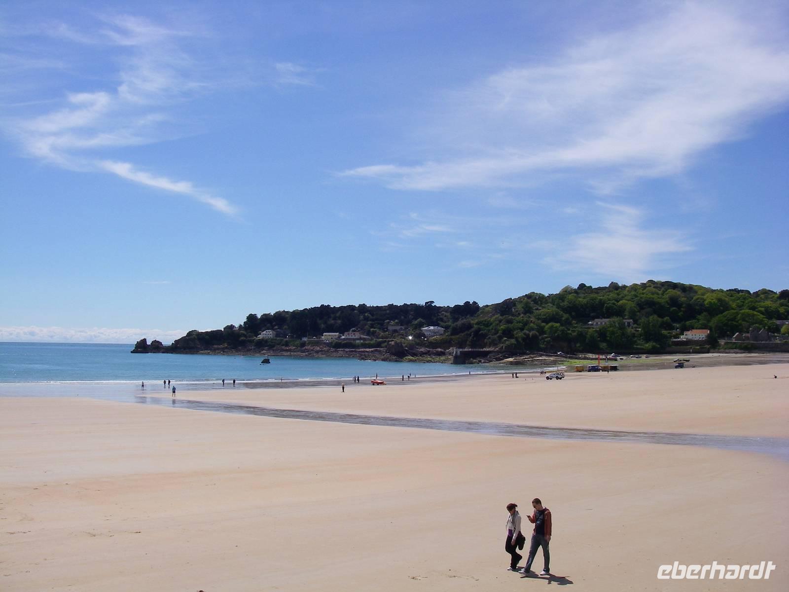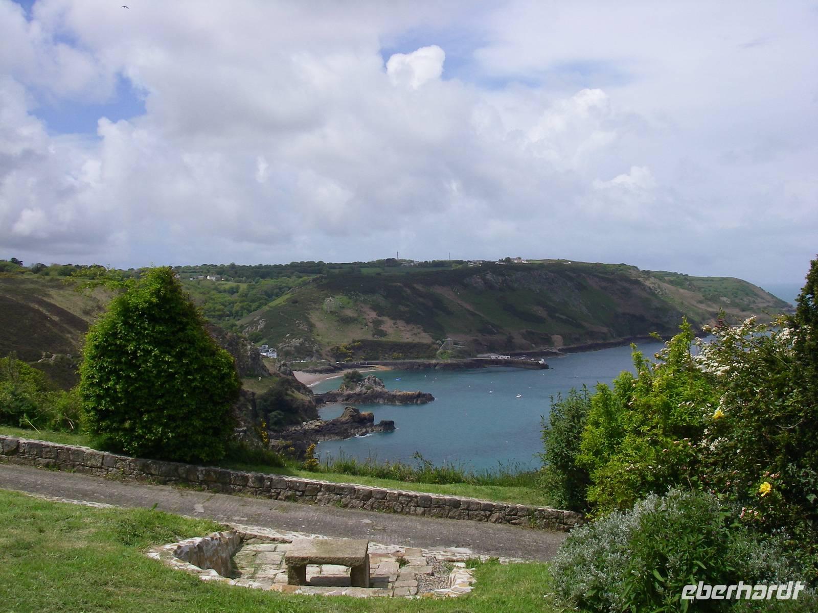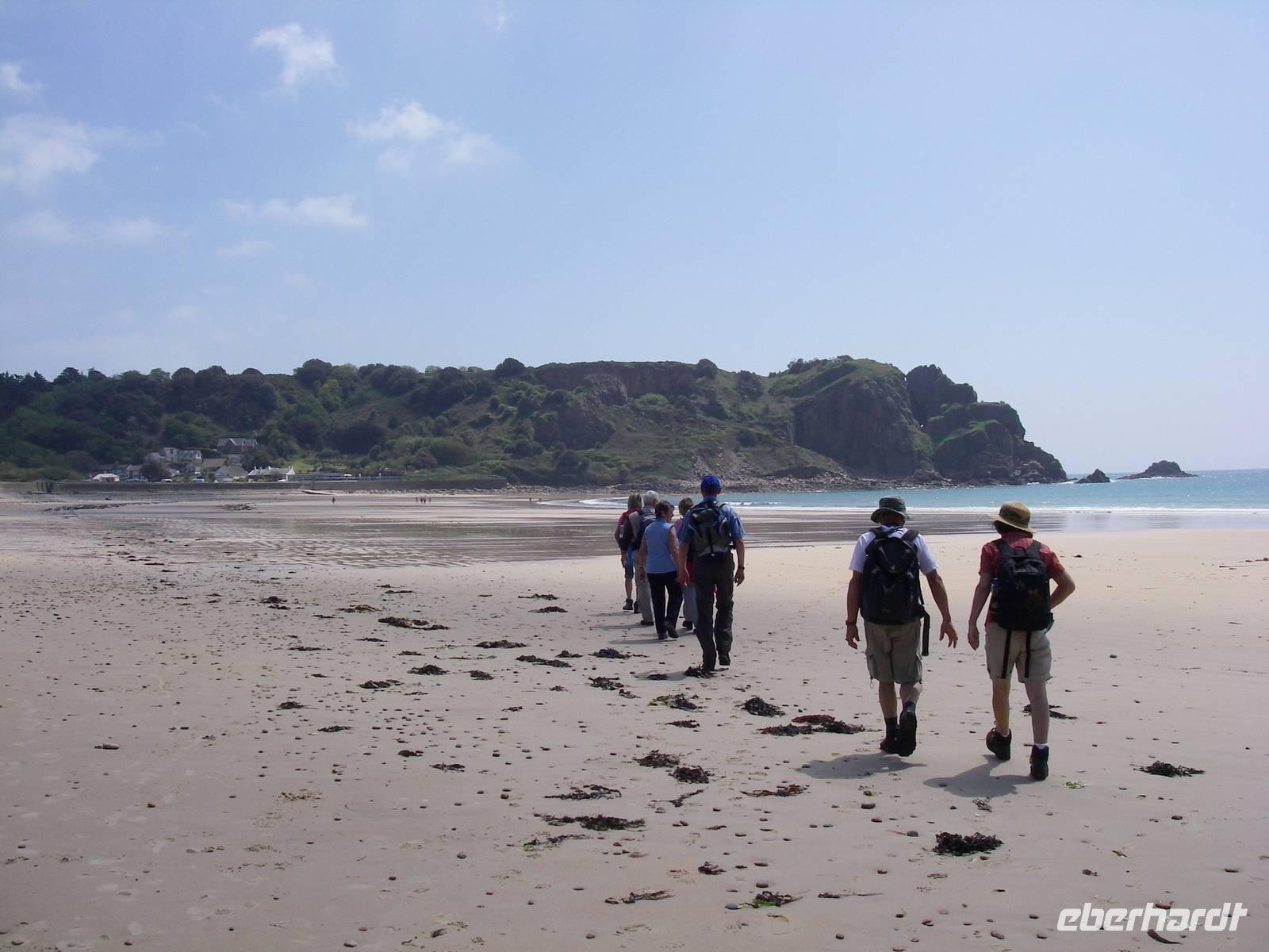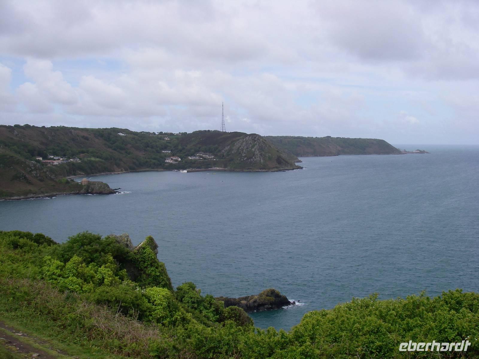 Wie vorhergesagt, regnet es heute. Aber wir geben die Hoffnung auf besseres Wetter nicht auf. Mit einem wie immer reichlichen Frühstück starten wir in den Tag und werden gegen 9:30 Uhr von Heidi und Ernst, der unser Chauffeur für den heutigen Tag ist, abgeholt. Von St. Helier fahren wir durch das Landesinnere nach Norden bis wir nach ca. 20 Minuten wieder die Küste erreichen. An der Bonne Nuit Bay steigen wir bei trockenen Wetter aus dem Bus und beginnen unsere Wanderung Richtung Osten. Entlang eines schmalen Küstenpfades wandern wir bei einem Mix aus Sonne und Wolken an der Giffard Bay bis zur Bouley Bay. Die Aussichten auf das Meer und die Buchten sind unvergesslich und die Vegetation ist prächtig. Unterwegs geht es immer wieder bergauf und bergab, so dass es nicht langweilig wird. Auch müssen wir ein kurzes Stück durch einen Wald bis wir schließlich Bouley Bay erreichen. Hier gehen wir alle gemeinsam ins Pub und lassen uns von der lokalen Küche verwöhnen. Da immer noch recht viel Wasser in der Bouley Bay ist, haben wir heute leider keine Chance Jakobsmuscheln zu finden, welche hier immer von den Tauchern hinterlassen werden. Nach dieser Erholungspause setzen wir unseren Weg entlang der Küste bis zur Rozel Bay fort. Unterwegs kommen wir an den Überresten des L'Etacquerel Forts vorbei. Auch haben wir heute unseren ersten Probealarm in Sachen schnelles Regenkleidung anziehen. Da es kurz anfängt etwas stärker zu regnen, machen wir einen kurzen Stopp um unsere Regenmontur anzulegen. Die Regenwolke zieht jedoch schnell vorbei, so dass wir nach kurzer Zeit wieder alles ablegen können. An der Rozel Bay ist bereits schon Ebbe, so dass wir bei einem kurzen Strandspaziergang ein paar Muscheln finden. Anschließend genießen wir zum Abschluss unserer Wanderung noch eine kleine Überraschung im Schlosshotel „Chateau la Chaire". Ernst holt uns dann wieder mit dem Bus ab und bringt uns zurück zum Hotel. Nach unserem gemeinsamen Abendessen gehen einige Gäste mit mir noch in den Stadt, um einen Absacker im Pub „Lamplighter", wo es eine große Auswahl an verschiedenen Biersorten gibt, zu haben.