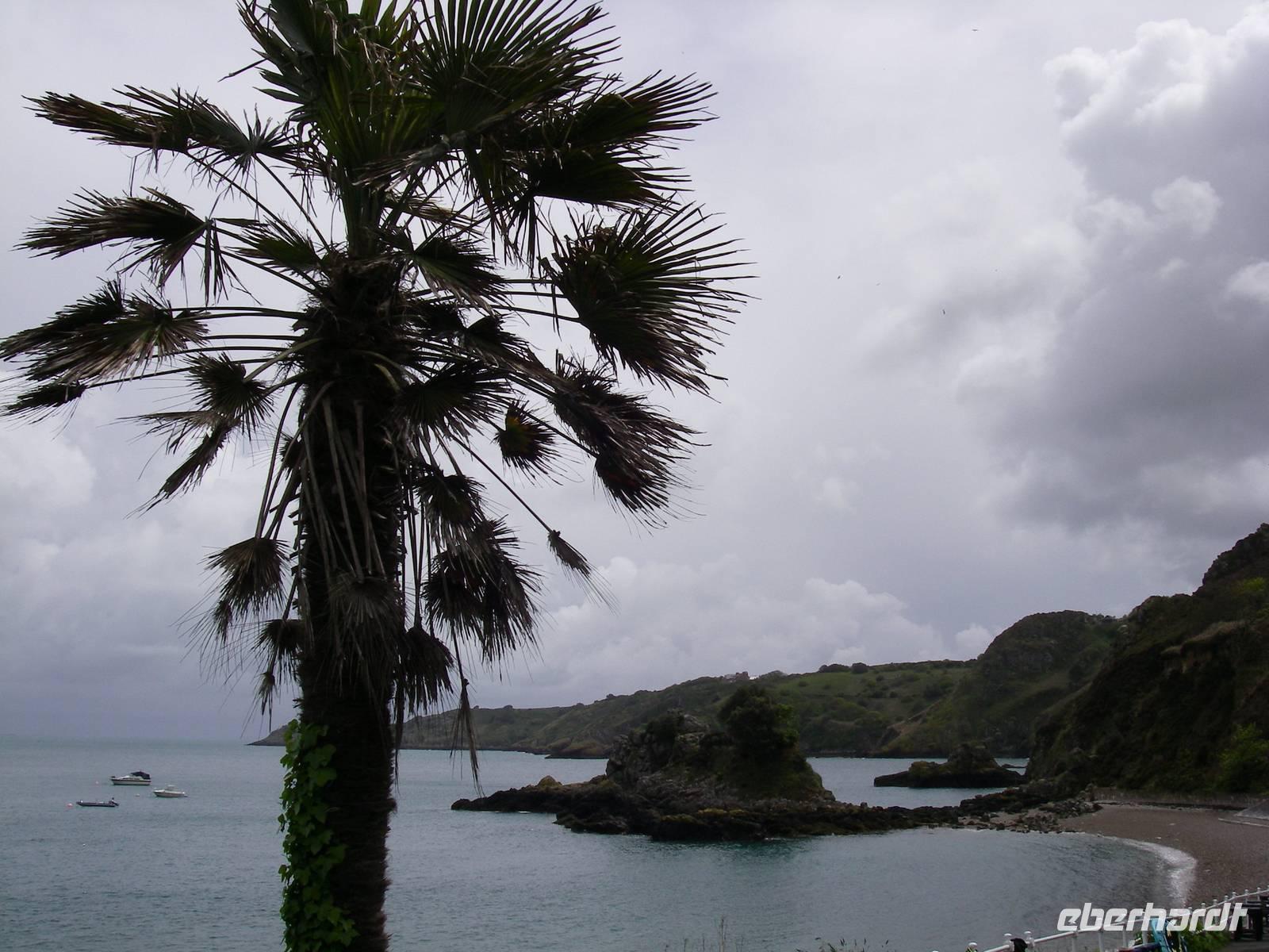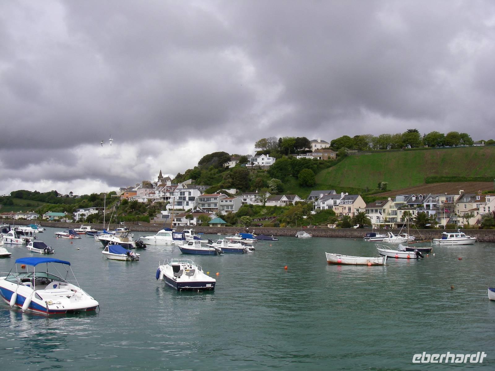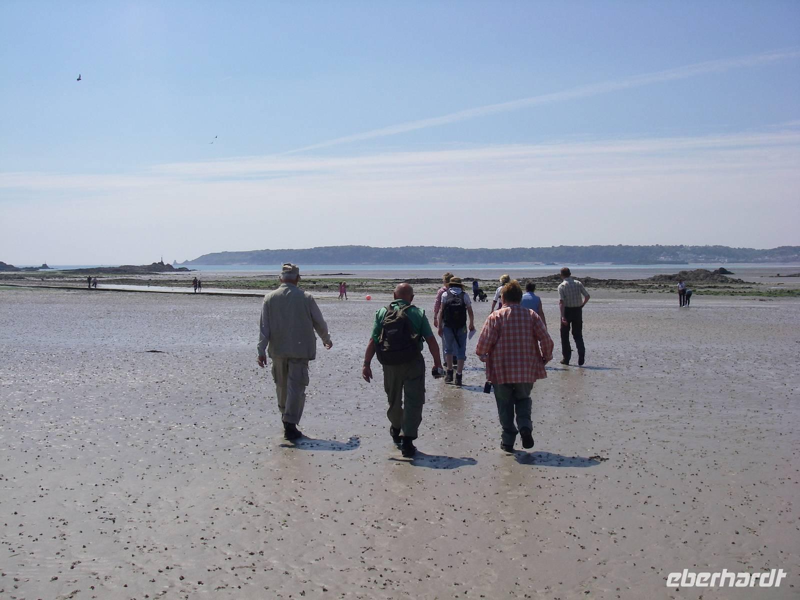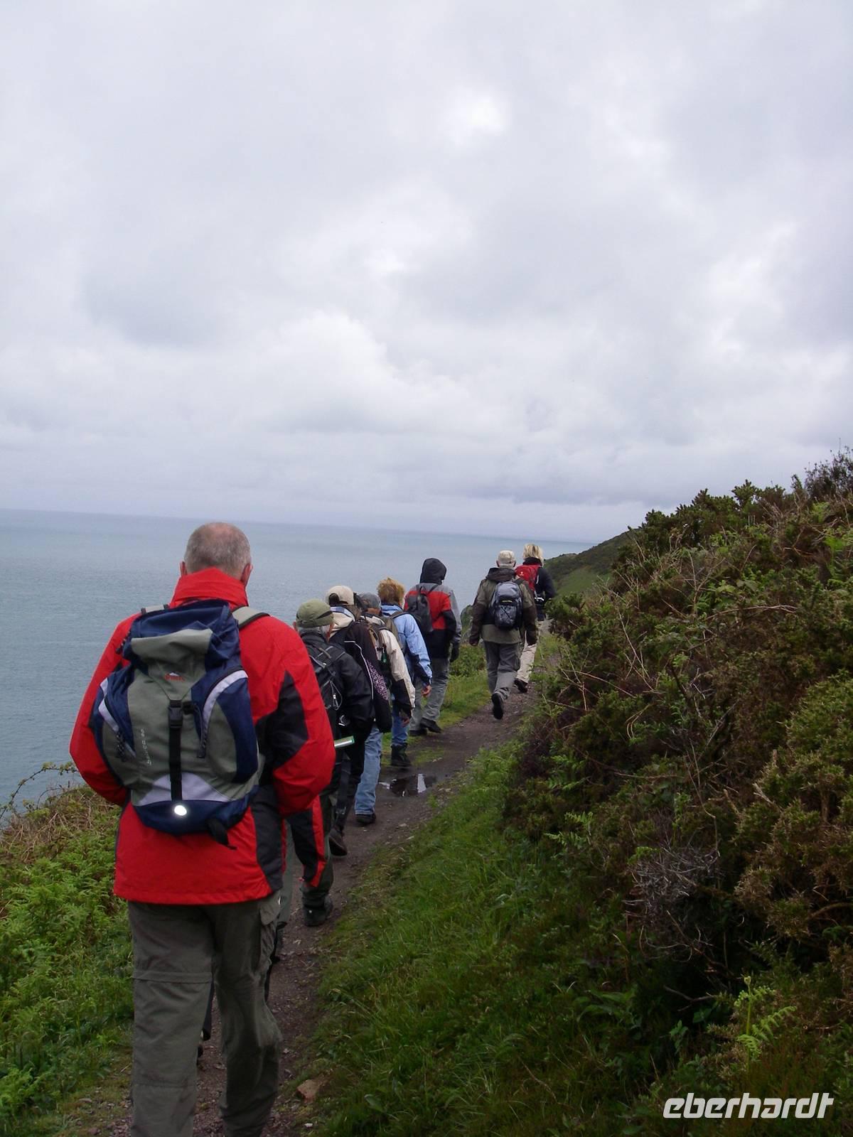 Wie vorhergesagt, regnet es heute. Aber wir geben die Hoffnung auf besseres Wetter nicht auf. Mit einem wie immer reichlichen Frühstück starten wir in den Tag und werden gegen 9:30 Uhr von Heidi und Ernst, der unser Chauffeur für den heutigen Tag ist, abgeholt. Von St. Helier fahren wir durch das Landesinnere nach Norden bis wir nach ca. 20 Minuten wieder die Küste erreichen. An der Bonne Nuit Bay steigen wir bei trockenen Wetter aus dem Bus und beginnen unsere Wanderung Richtung Osten. Entlang eines schmalen Küstenpfades wandern wir bei einem Mix aus Sonne und Wolken an der Giffard Bay bis zur Bouley Bay. Die Aussichten auf das Meer und die Buchten sind unvergesslich und die Vegetation ist prächtig. Unterwegs geht es immer wieder bergauf und bergab, so dass es nicht langweilig wird. Auch müssen wir ein kurzes Stück durch einen Wald bis wir schließlich Bouley Bay erreichen. Hier gehen wir alle gemeinsam ins Pub und lassen uns von der lokalen Küche verwöhnen. Da immer noch recht viel Wasser in der Bouley Bay ist, haben wir heute leider keine Chance Jakobsmuscheln zu finden, welche hier immer von den Tauchern hinterlassen werden. Nach dieser Erholungspause setzen wir unseren Weg entlang der Küste bis zur Rozel Bay fort. Unterwegs kommen wir an den Überresten des L'Etacquerel Forts vorbei. Auch haben wir heute unseren ersten Probealarm in Sachen schnelles Regenkleidung anziehen. Da es kurz anfängt etwas stärker zu regnen, machen wir einen kurzen Stopp um unsere Regenmontur anzulegen. Die Regenwolke zieht jedoch schnell vorbei, so dass wir nach kurzer Zeit wieder alles ablegen können. An der Rozel Bay ist bereits schon Ebbe, so dass wir bei einem kurzen Strandspaziergang ein paar Muscheln finden. Anschließend genießen wir zum Abschluss unserer Wanderung noch eine kleine Überraschung im Schlosshotel „Chateau la Chaire". Ernst holt uns dann wieder mit dem Bus ab und bringt uns zurück zum Hotel. Nach unserem gemeinsamen Abendessen gehen einige Gäste mit mir noch in den Stadt, um einen Absacker im Pub „Lamplighter", wo es eine große Auswahl an verschiedenen Biersorten gibt, zu haben.