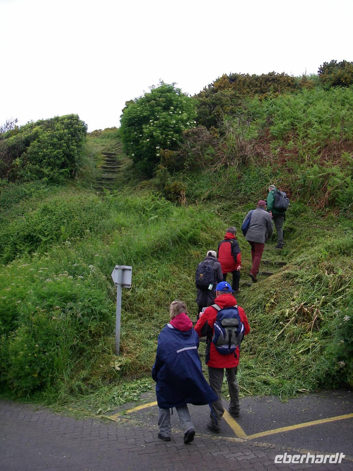 Heute werden wir nicht wie gewohnt von unserer Wanderführerin Heidi sondern von Arthur vom Hotel abgeholt. Er wandert mit uns entlang der Nordwestküste von Jersey und zeigt uns damit ein weiteres Stück dieser traumhaften Insel, welche schon seit vielen, vielen Jahren sein zu Hause ist. Mit einem Kleinbus fahren wir durch das Landesinnere und erreichen nach einer ca. 30-minütigen Fahrt das Grosnez Castle - dem Ausgangspunkt unserer heutigen Wanderung. Am Anfang der Tour meint es Petrus nicht wirklich gut mit uns. Jedoch verziehen sich die Regenwolken nach kürzester Zeit, so dass wir die Regenkleidung wieder ablegen können. Entlang der Plémont Bay, einer landschaftlich sehr schönen Bucht, wandern wir auf dem Küstenpfad zum Greve de Lecq. Dabei durchqueren wir ein kleines Dorf mit sehr gepflegten, hübschen Gärten. Angekommen am Greve de Lecq gönnen wir uns eine Mittagspause. Bei kleinen Snacks, Desserts und einem Cider entspannen wir etwas und machen uns anschließend auf den Weg in Richtung Devil's Hole. Doch bevor wir wieder den Weg hinauf zur Steilküste steigen, besuchen wir noch die Greve de Lecq Barracks. Diese gehören zum Jersey National Trust und zeigen unter anderem eine Sammlung historischer Pferdekutschen. Mit erstandenen kleinen Souvenirs wandern wir schließlich zum Legenden umwogenden Devil's Hole, welches bereits von weitem zu erkennen ist. Von dem Pub Priory Inn laufen wir hinab zum Devil's Hole. Unterwegs treffen wir auf den Teufel höchst persönlich, welcher als Figur in einem Teich am Wegrand auf uns wartet. Da gerade Ebbe ist und das Meer doch weitestgehend ruhig ist, müssen wir uns am Devil's Hole heute nicht „fürchten" . Nachdem wir den tollen Ausblick genossen haben, gehen wir zurück zum Pub. Bei einem Getränk sitzen wir noch etwas im Außenbereich des Priory Inn und warten auf Ernst, welcher nach kurzer Zeit eintrifft und uns zurück ins Hotel bringt. Am Abend treffen wir uns das der Hotelrezeption und schlendern durch die Stadt bis zum Fischrestaurant Atlantique. Bei leckeren Fischspezialitäten aus der Region lassen wir den Abend ausklingen und kehren mit vollen Bäuchern zurück ins Hotel.