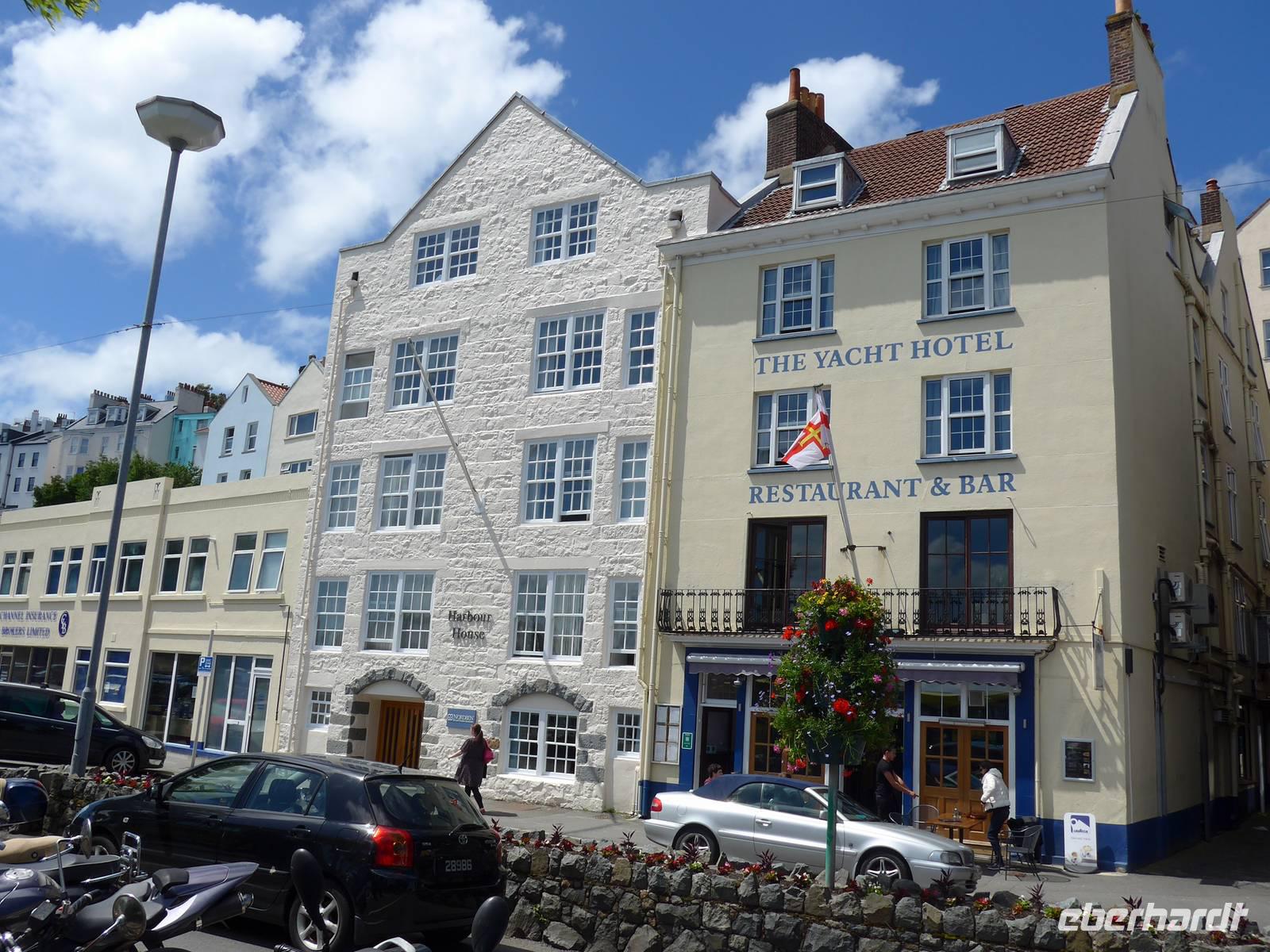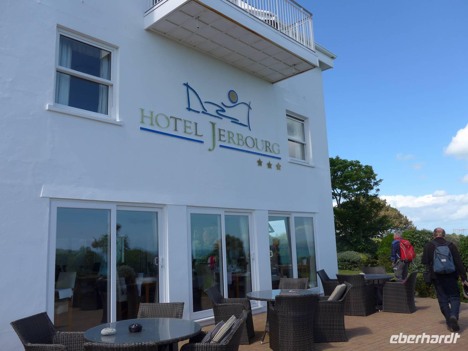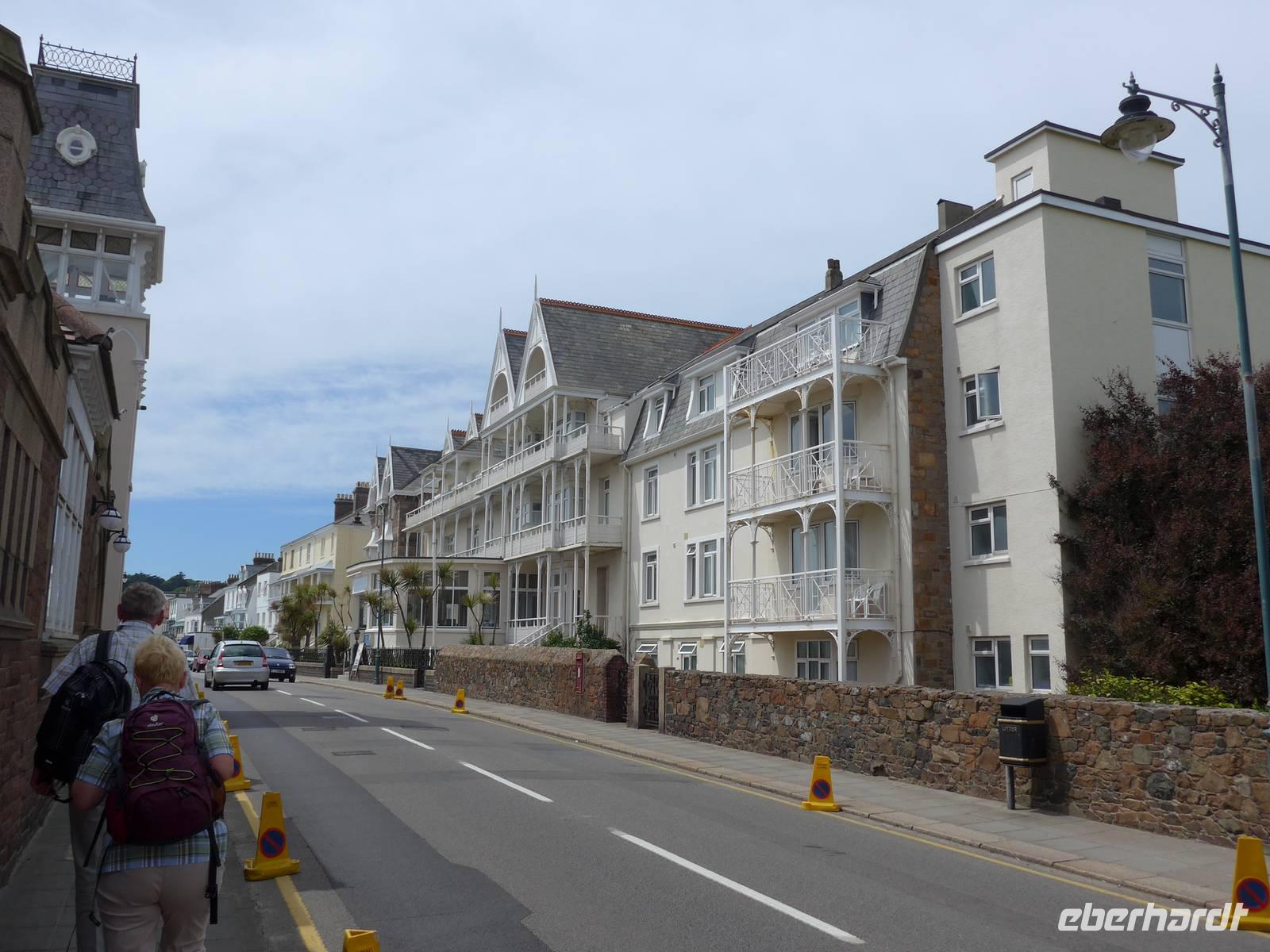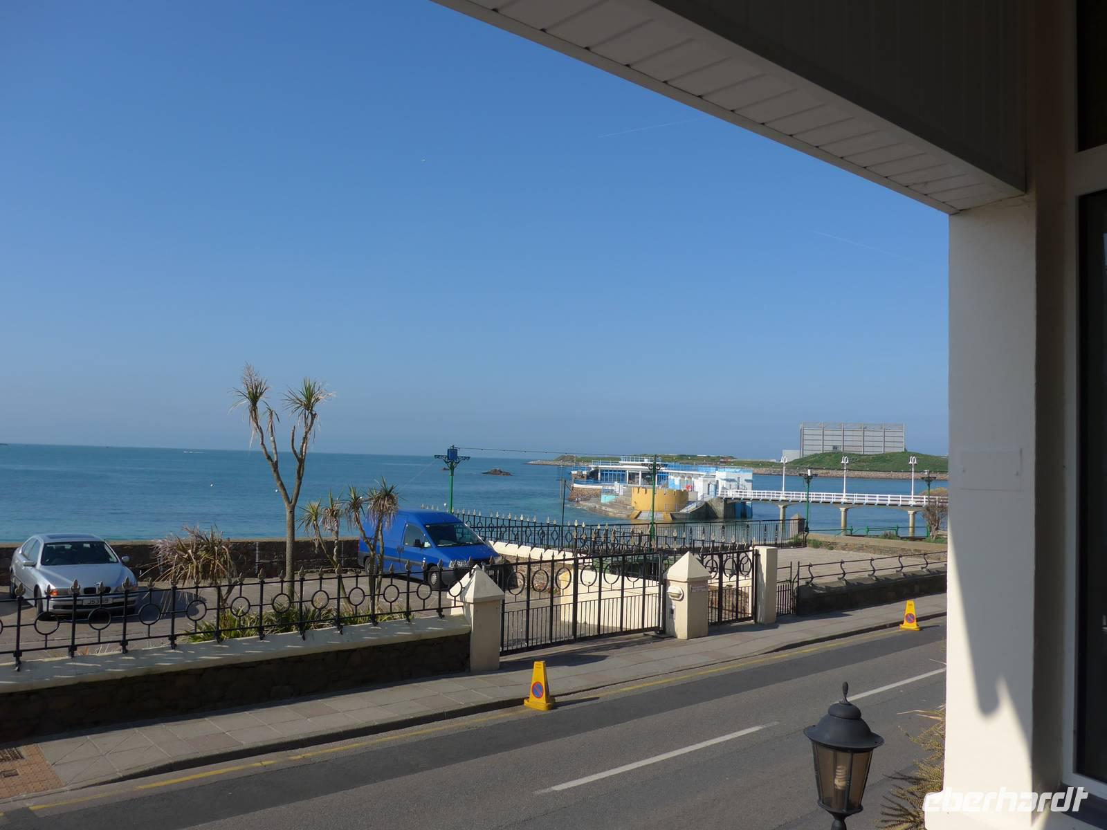 Von Berlin, Leipzig, Basel und Dresden reisten wir nach München. In Dresden hatte unser Flugzeug einen Vogelschlagschaden an einem Triebwerk und der Start war damit ungewiß. Aber nach 50 Minuten bangen Wartens konnten wir dann doch starten und waren alle sehr erleichtert. Von München flogen wir mit Lufthansa alle zusammen nach Jersey, wo wir pünktlich landeten und unsere Uhr eine Stunde zurück stellen mußten. Von der Agentur Stecial Tours wurden wir schon erwartet und Ernst brachte uns in unser Hotel "Ommaroo" in St.Helier. Zum Abendessen durften wir uns täglich ein 3-Gang-Menue aus der Speisekarte zusammen stellen. Noch vor dem Abendessen trafen wir uns bei einem Glas Sekt oder Saft zu einer kurzen Vorstellungsrunde und nach dem Essen machten wir gemeinsam einen Orientierungsspaziergang ins Städtchen und zum Einkaufen von Wasser.