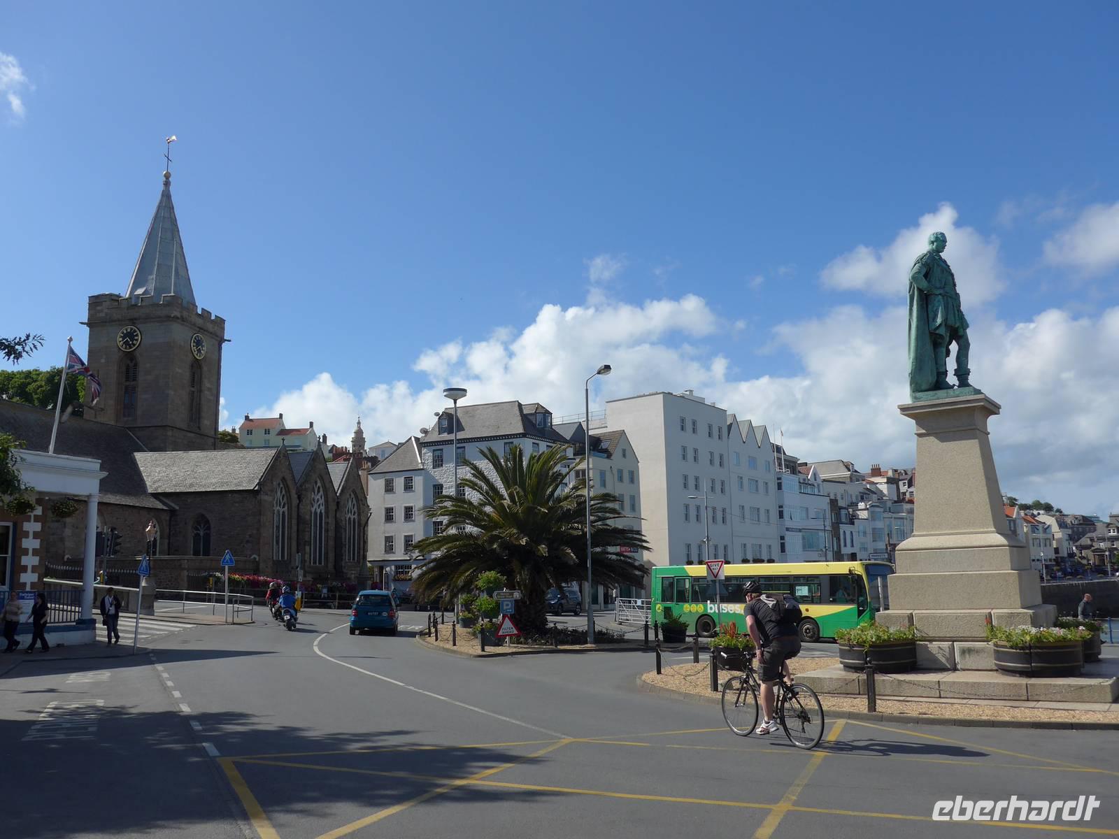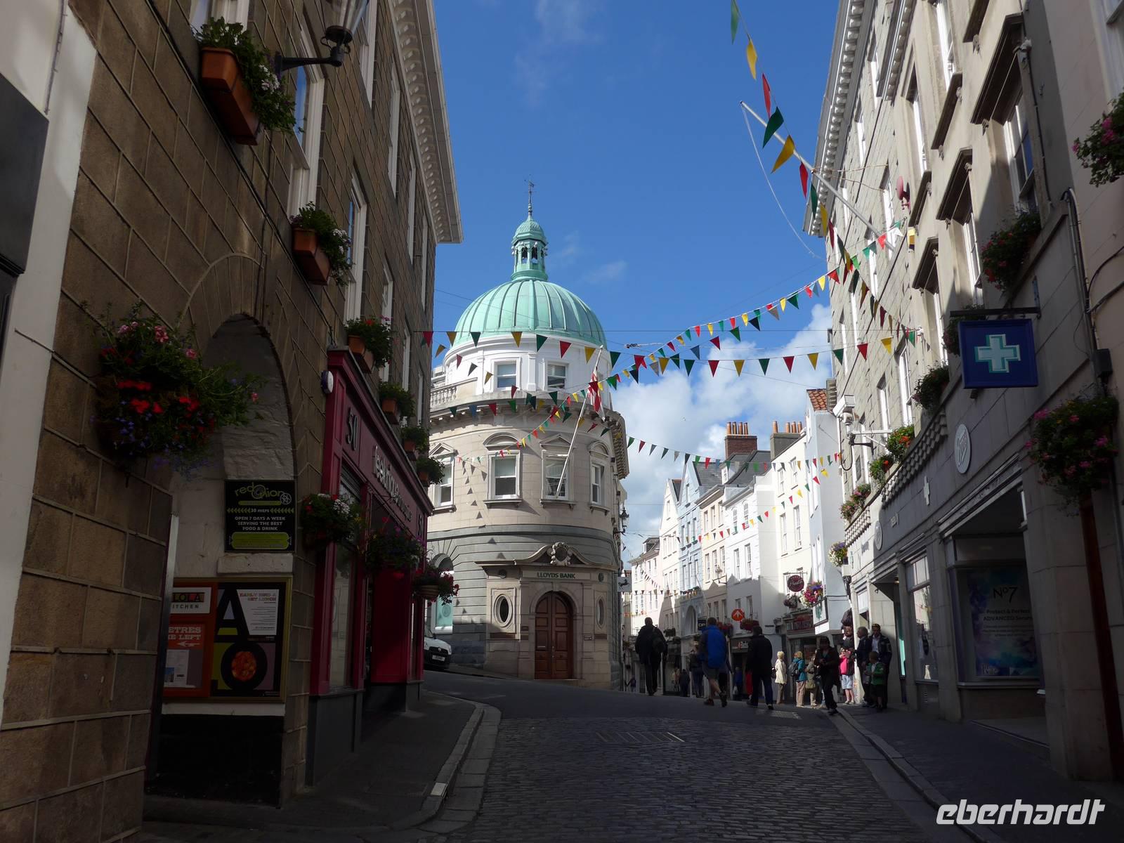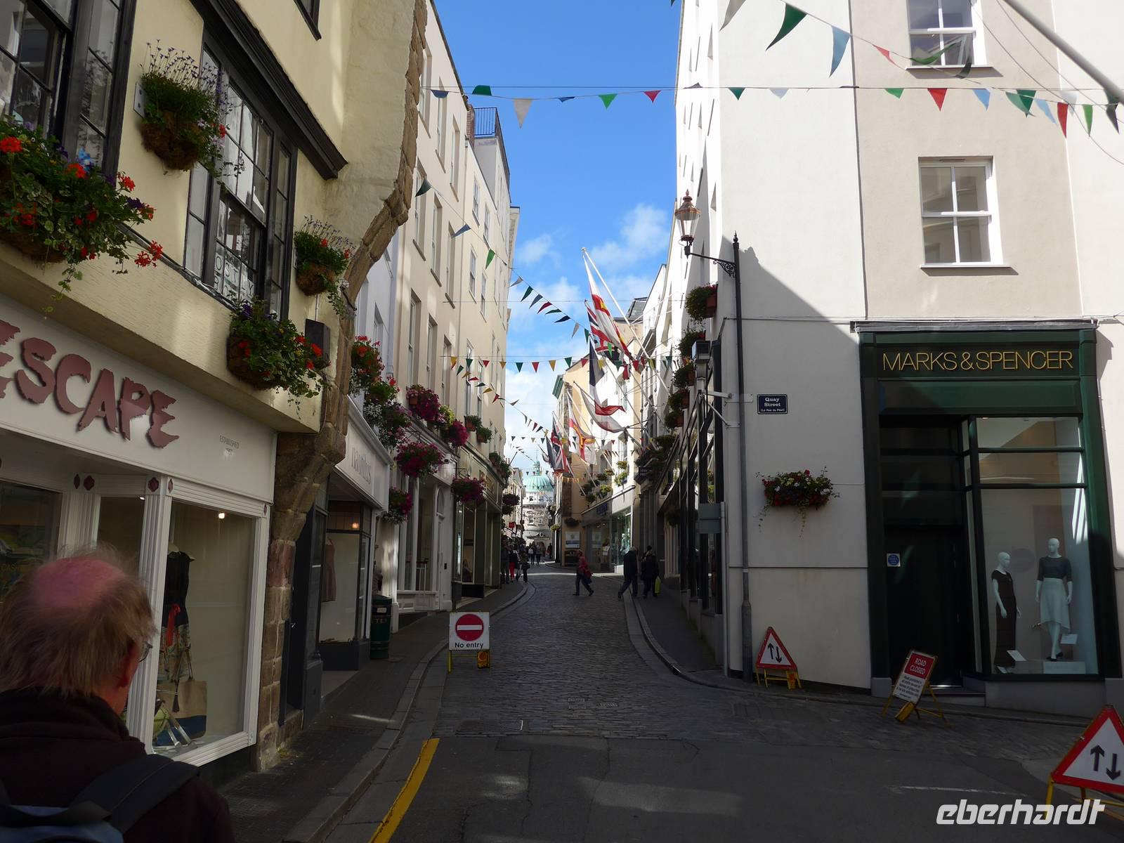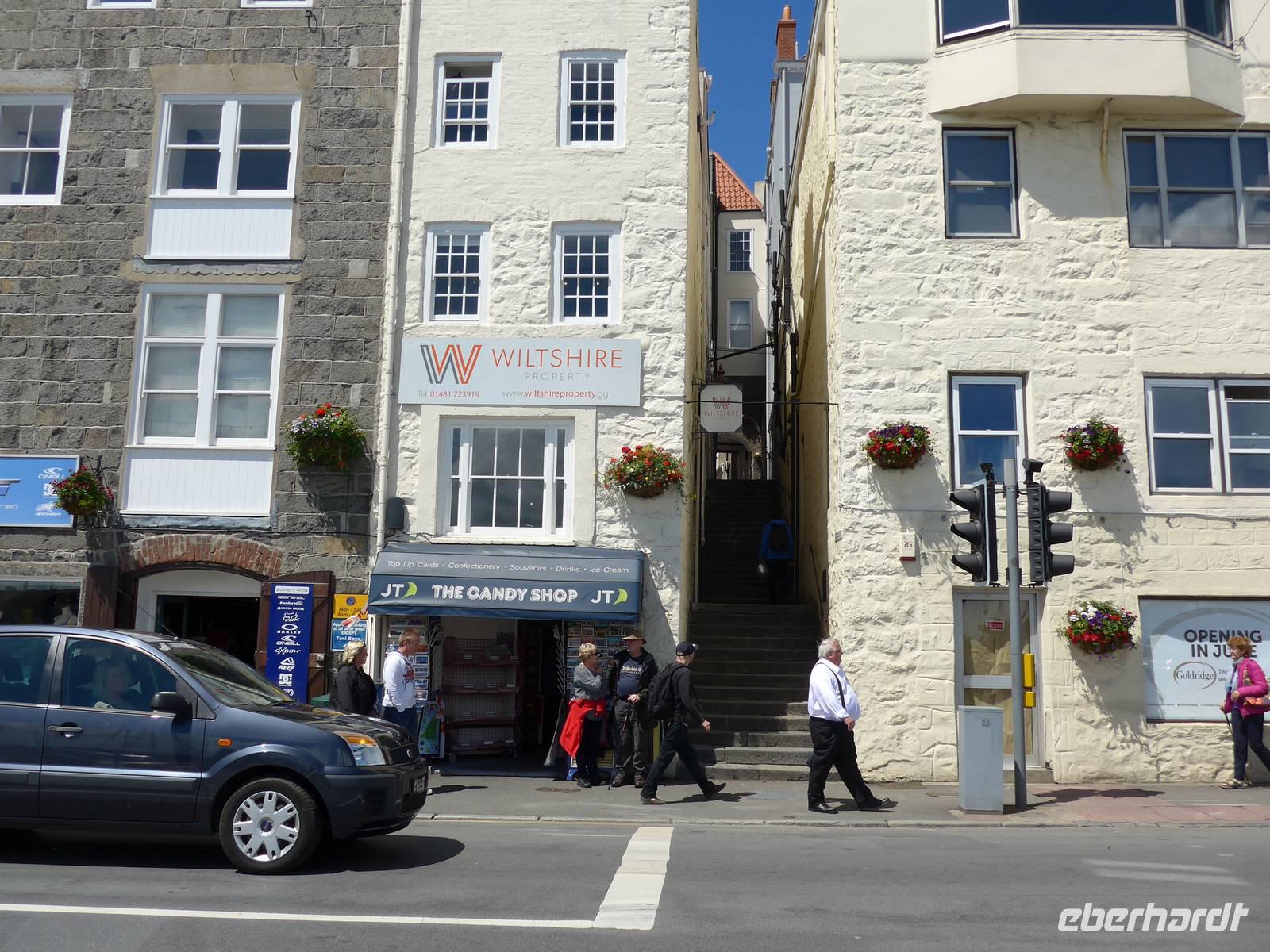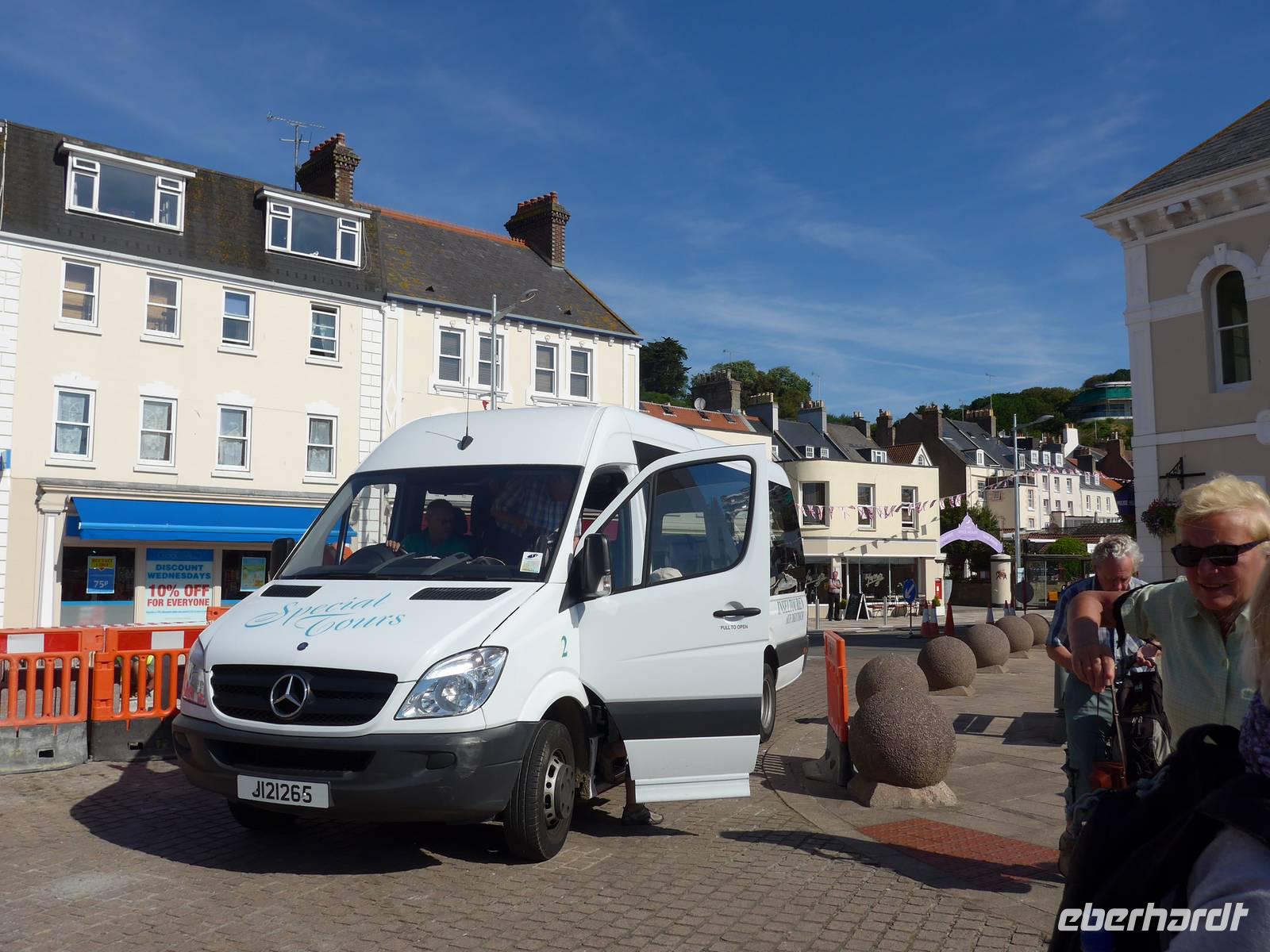 Von Berlin, Leipzig, Basel und Dresden reisten wir nach München. In Dresden hatte unser Flugzeug einen Vogelschlagschaden an einem Triebwerk und der Start war damit ungewiß. Aber nach 50 Minuten bangen Wartens konnten wir dann doch starten und waren alle sehr erleichtert. Von München flogen wir mit Lufthansa alle zusammen nach Jersey, wo wir pünktlich landeten und unsere Uhr eine Stunde zurück stellen mußten. Von der Agentur Stecial Tours wurden wir schon erwartet und Ernst brachte uns in unser Hotel "Ommaroo" in St.Helier. Zum Abendessen durften wir uns täglich ein 3-Gang-Menue aus der Speisekarte zusammen stellen. Noch vor dem Abendessen trafen wir uns bei einem Glas Sekt oder Saft zu einer kurzen Vorstellungsrunde und nach dem Essen machten wir gemeinsam einen Orientierungsspaziergang ins Städtchen und zum Einkaufen von Wasser.