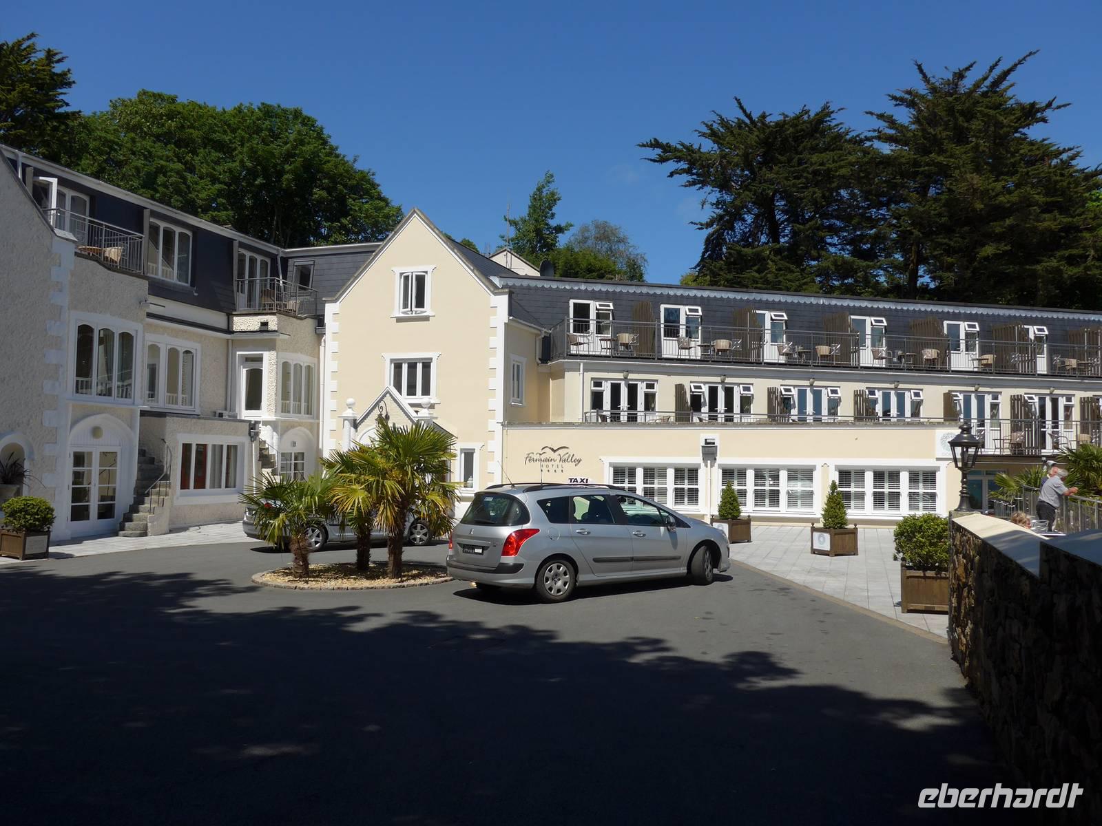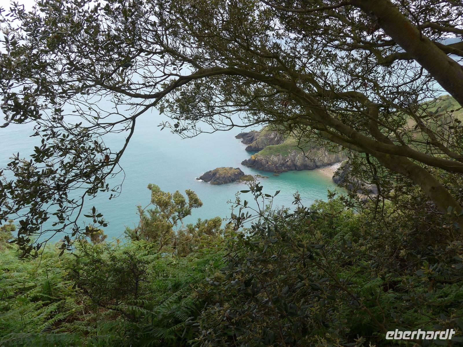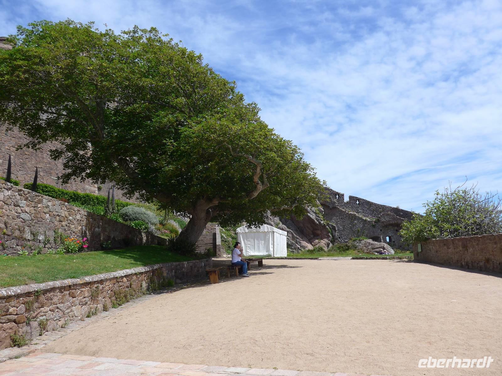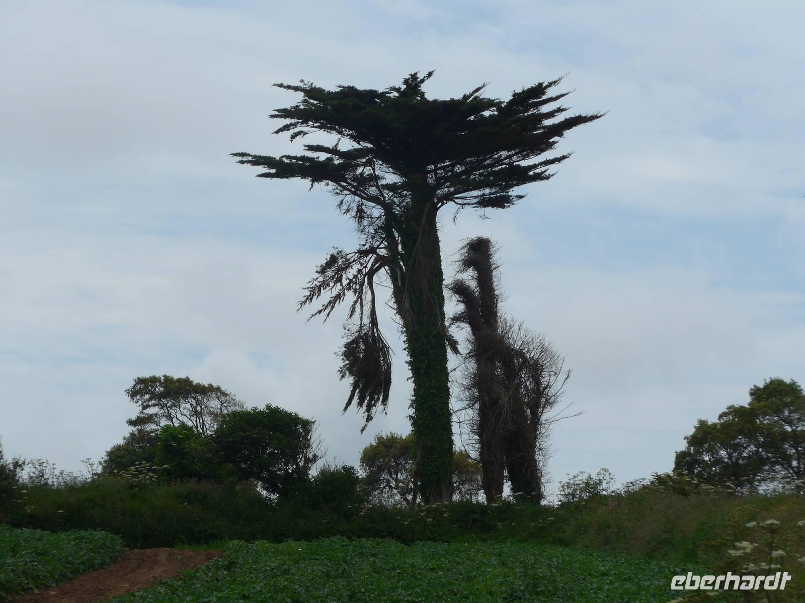 Koniferen waren von Teufelszwirn eingewebt. Zur besten Kaffeezeit erreichten wir 15 Uhr Rozel und kehrten im Chateau la Chaire auf einen Cream Tee mit Scones ein. Es tat gut, zu sitzen und diese Köstlichkeiten zu probieren. Danach spazierten wir das Tal hinauf und bestaunten einen blühenden rießigen Taschentuchbaum. Ernst brachte uns entlang der Ostküste, die bei Ebbe eine sehr interessante Landschaft freigibt, zurück ins Hotel. Trotz Ebbe war der riesige Meerwasserpool gegenüber von unserem Hotel mit Wasser gefüllt und so wagten einige von uns bei 14 Grad Wassertemperatur ein Bad.