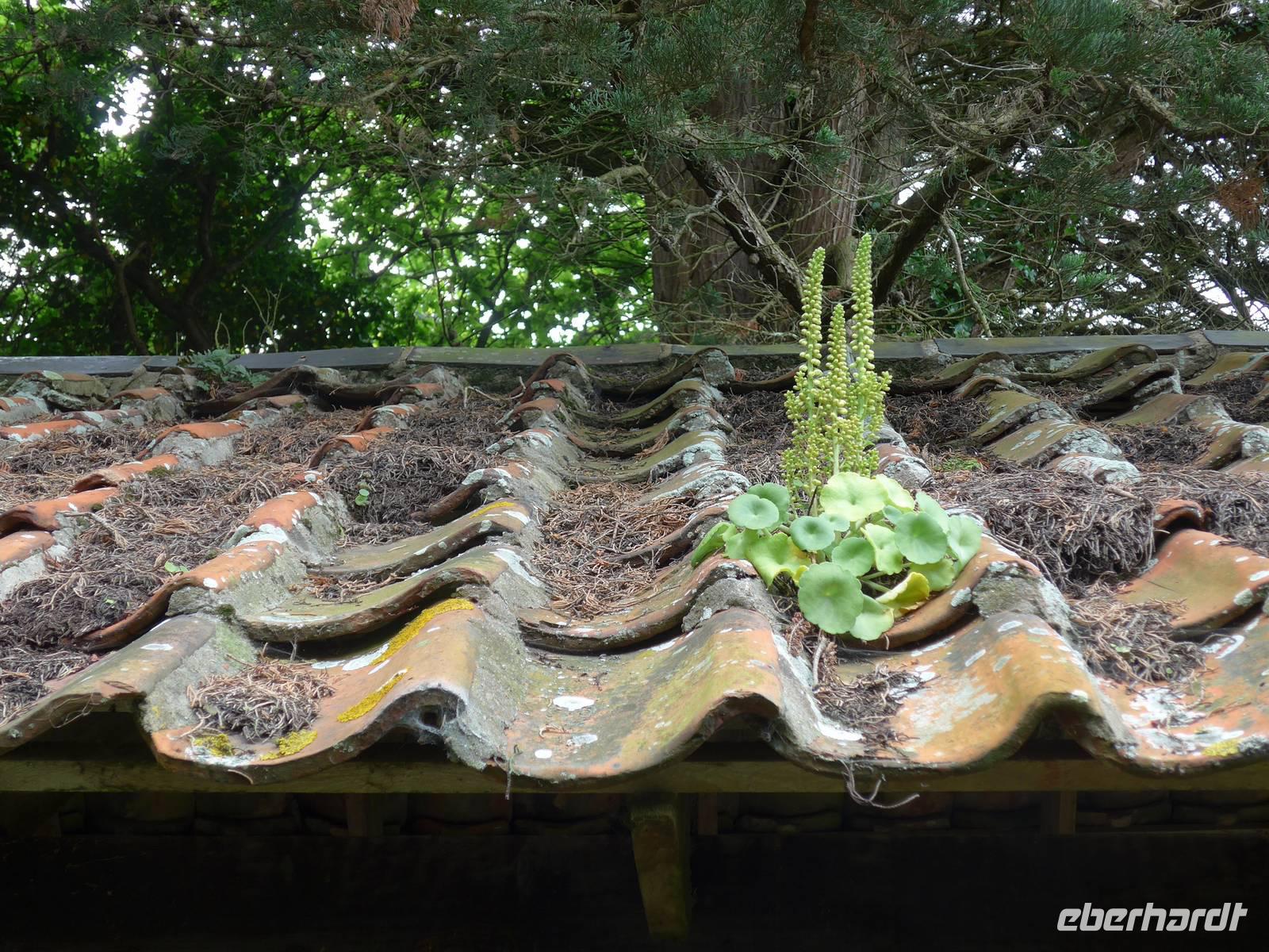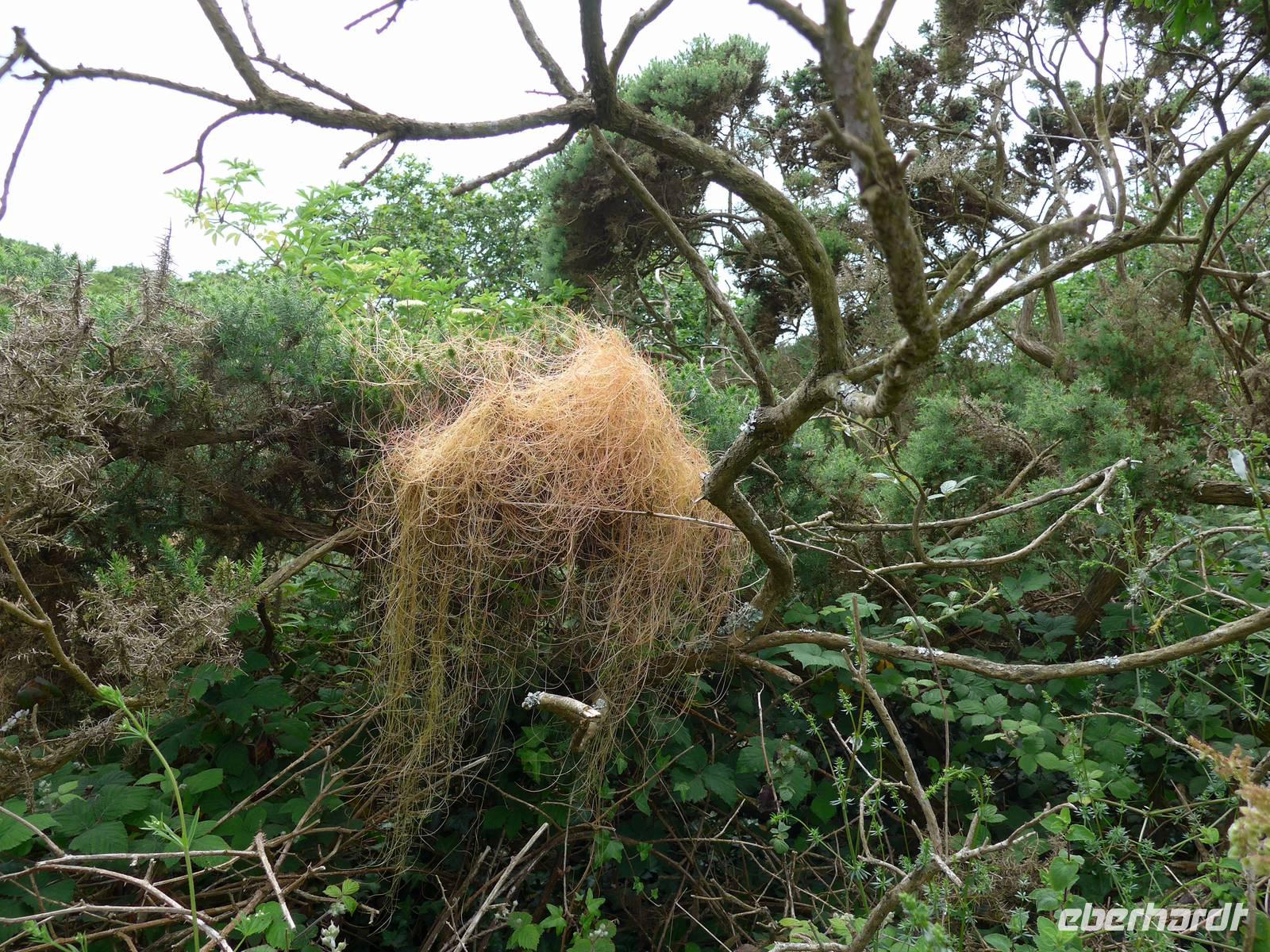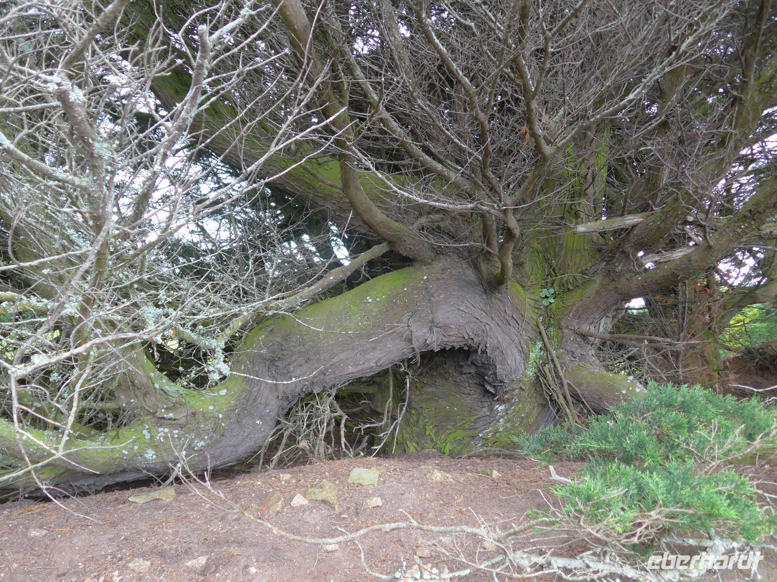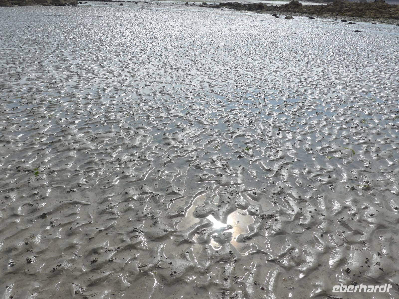 Koniferen waren von Teufelszwirn eingewebt. Zur besten Kaffeezeit erreichten wir 15 Uhr Rozel und kehrten im Chateau la Chaire auf einen Cream Tee mit Scones ein. Es tat gut, zu sitzen und diese Köstlichkeiten zu probieren. Danach spazierten wir das Tal hinauf und bestaunten einen blühenden rießigen Taschentuchbaum. Ernst brachte uns entlang der Ostküste, die bei Ebbe eine sehr interessante Landschaft freigibt, zurück ins Hotel. Trotz Ebbe war der riesige Meerwasserpool gegenüber von unserem Hotel mit Wasser gefüllt und so wagten einige von uns bei 14 Grad Wassertemperatur ein Bad.