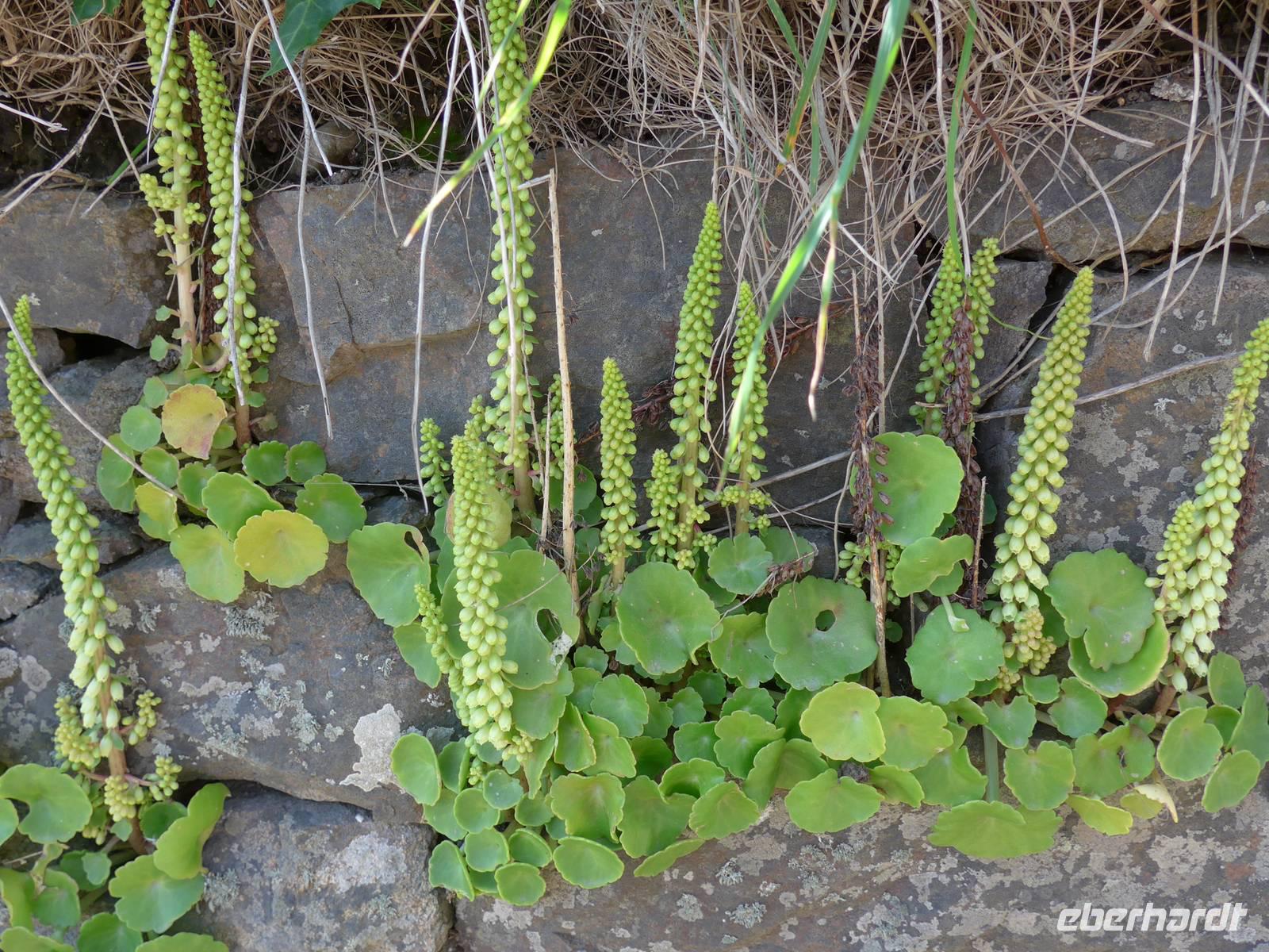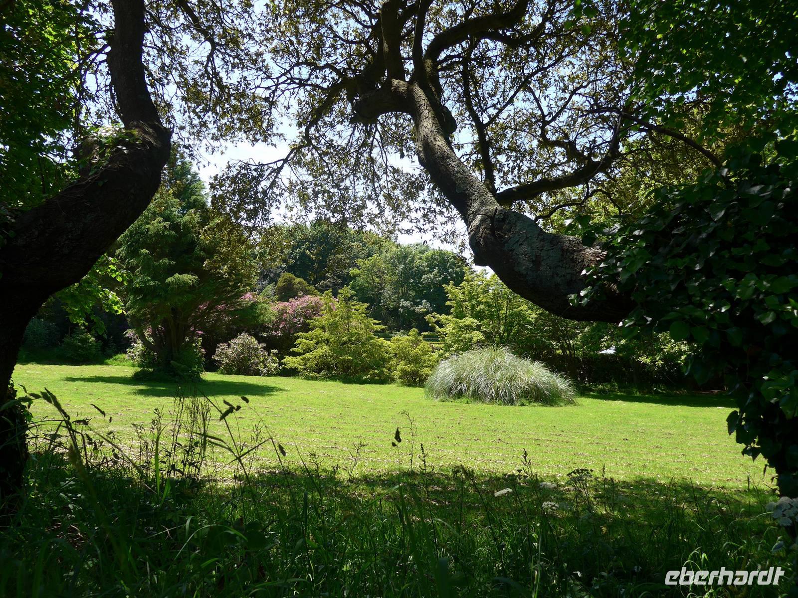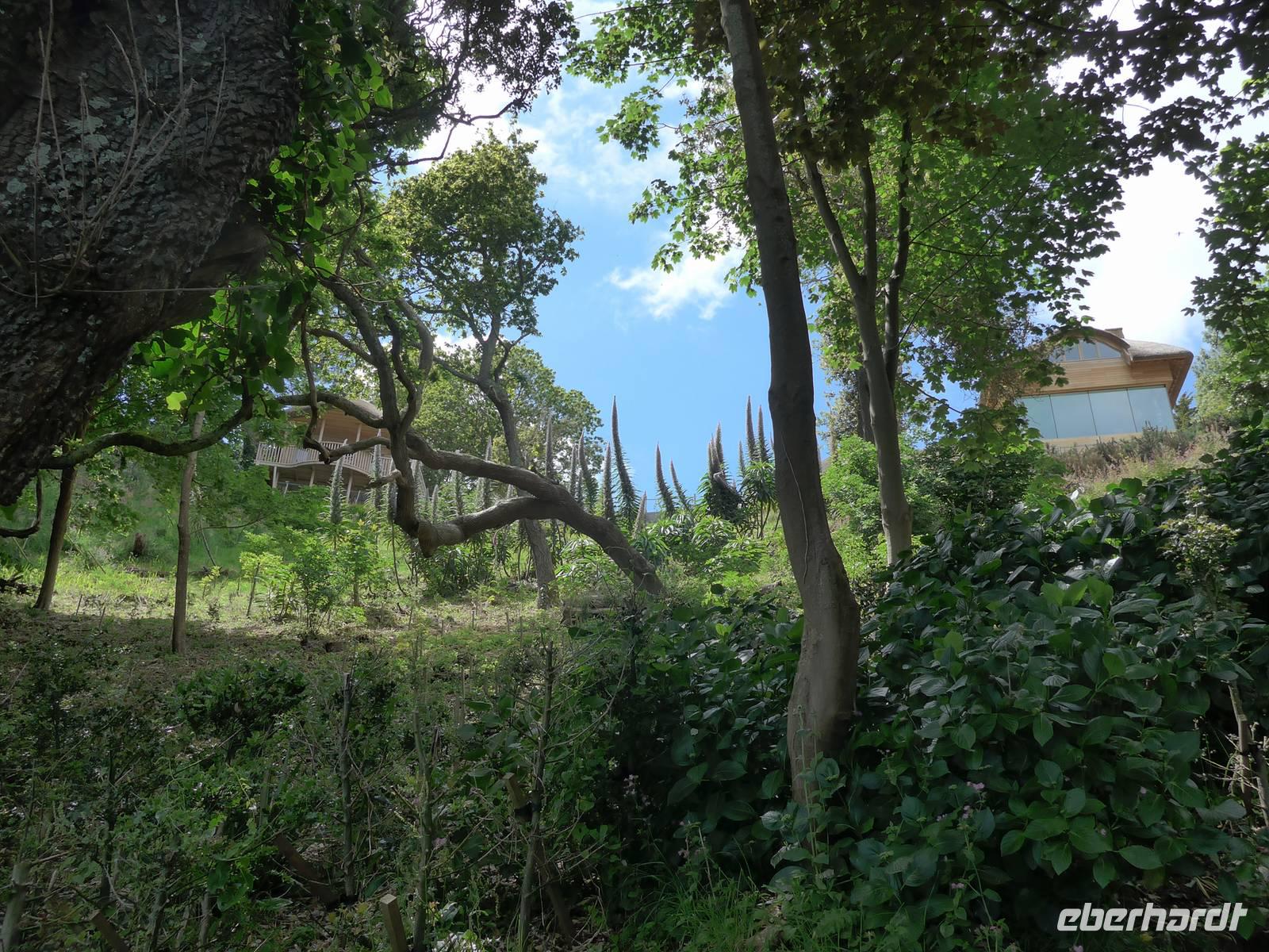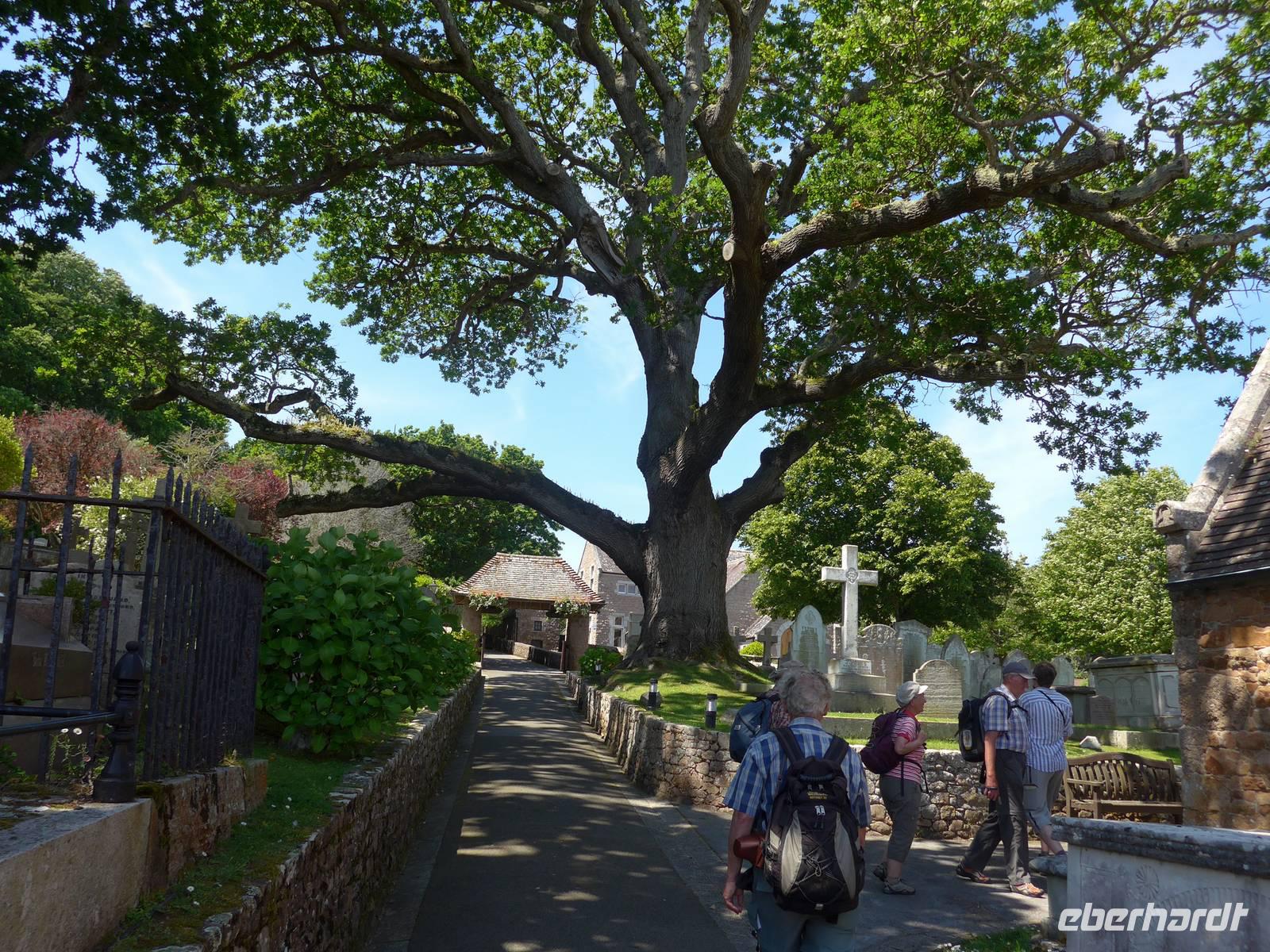 Koniferen waren von Teufelszwirn eingewebt. Zur besten Kaffeezeit erreichten wir 15 Uhr Rozel und kehrten im Chateau la Chaire auf einen Cream Tee mit Scones ein. Es tat gut, zu sitzen und diese Köstlichkeiten zu probieren. Danach spazierten wir das Tal hinauf und bestaunten einen blühenden rießigen Taschentuchbaum. Ernst brachte uns entlang der Ostküste, die bei Ebbe eine sehr interessante Landschaft freigibt, zurück ins Hotel. Trotz Ebbe war der riesige Meerwasserpool gegenüber von unserem Hotel mit Wasser gefüllt und so wagten einige von uns bei 14 Grad Wassertemperatur ein Bad.