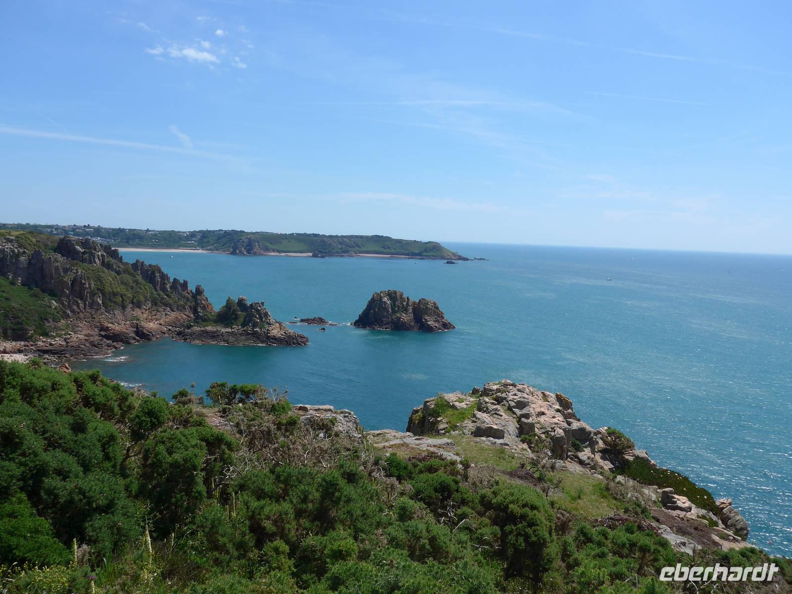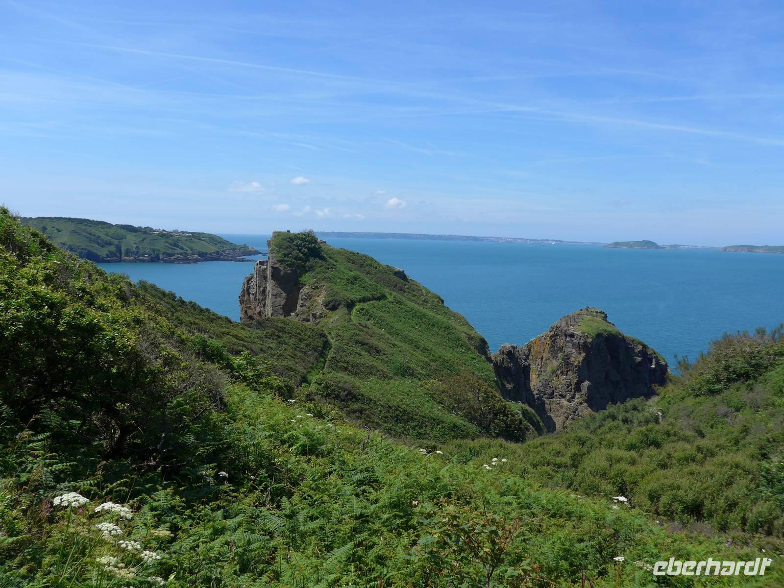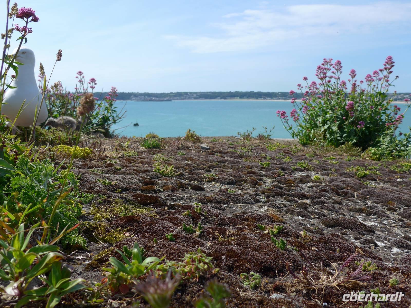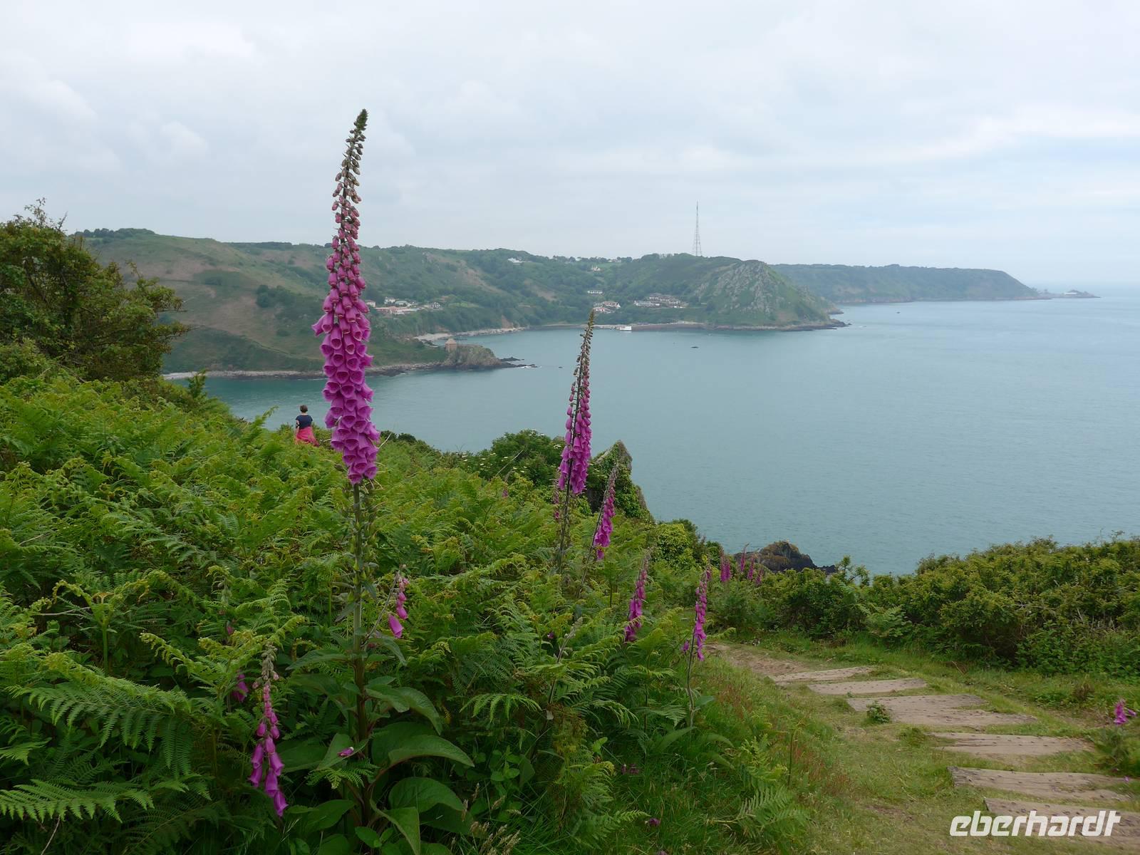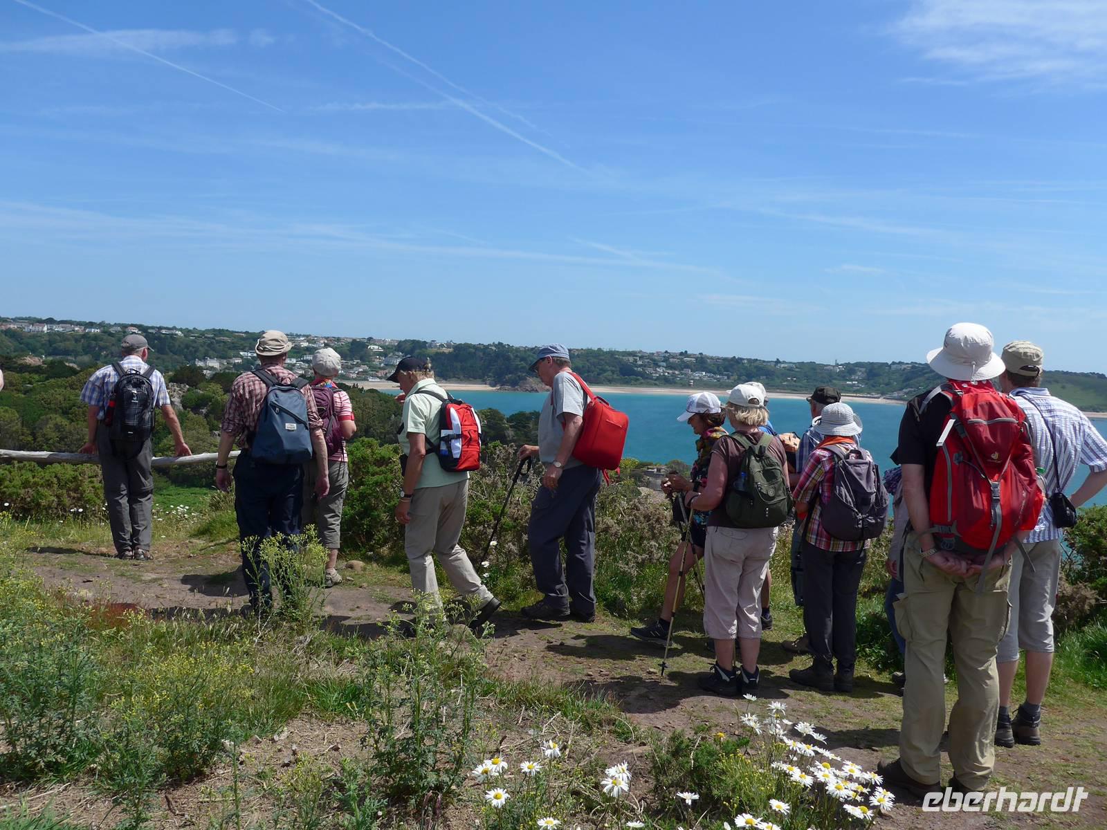 Für die Wanderungen auf Jersey war Eberhard unser Wanderleiter. Mit ihm fuhren wir quer über die Insel zur Nordküste. Der Wanderweg war gesäumt mit vielen verschiedenen Blumen und verlief dicht an der Küste immer auf und ab mit tollen Ausblicken auf die Nachbarinseln. Unsere Mittagspause machten wir in der Bouly Bay, wo wir Jakobsmuscheln fanden und bei Mad Marry einen kleinen Imbiß einnahmen. Weiter ging es wieder auf und ab immer an der Küste entlang. Wir sahen Fasane und kamen an vielen Kartoffelfeldern vorbei.