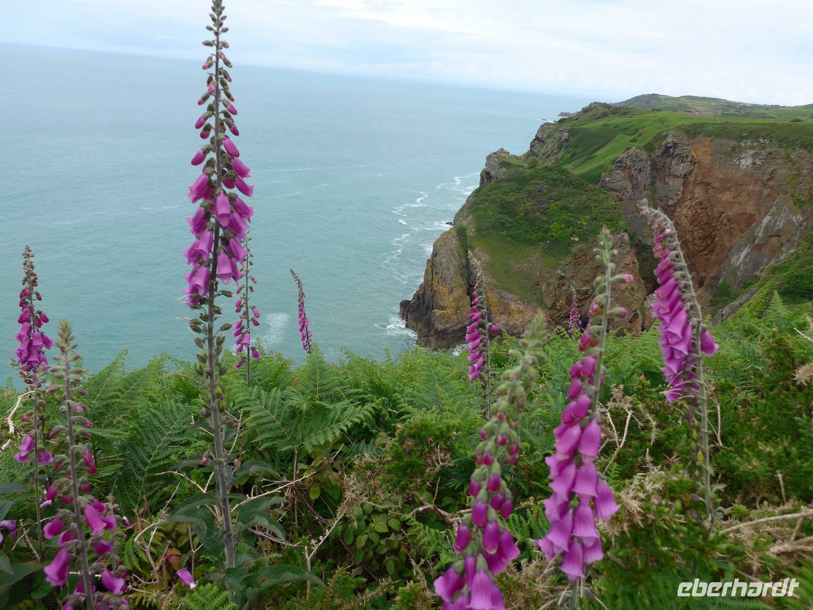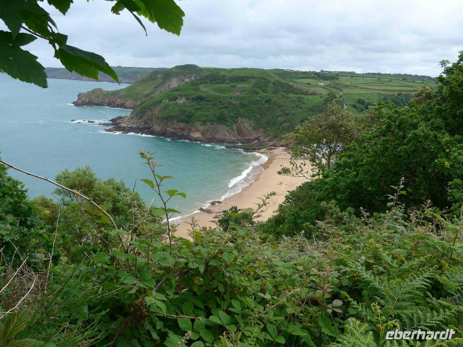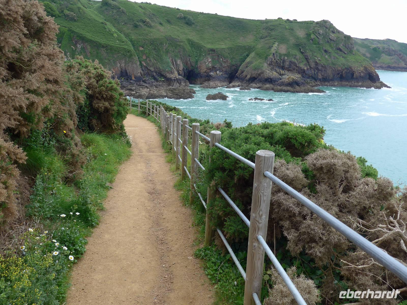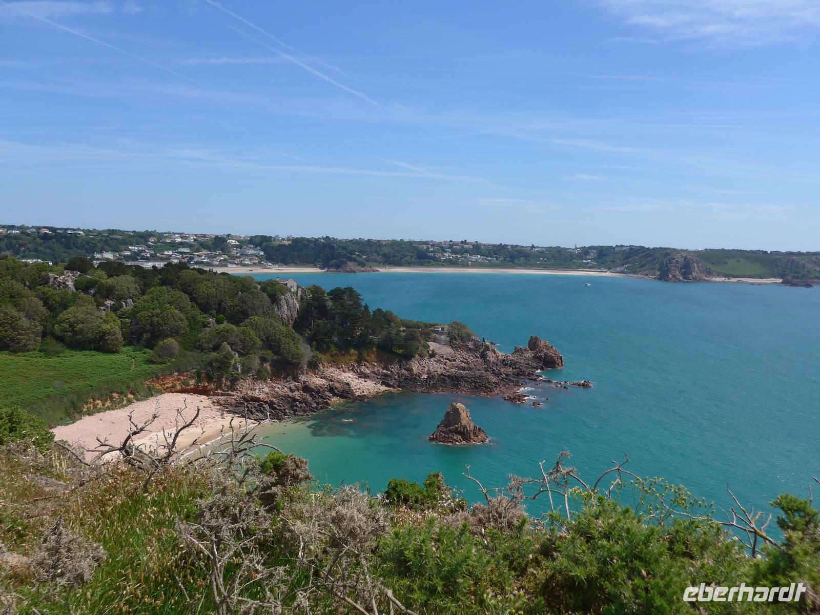 Für die Wanderungen auf Jersey war Eberhard unser Wanderleiter. Mit ihm fuhren wir quer über die Insel zur Nordküste. Der Wanderweg war gesäumt mit vielen verschiedenen Blumen und verlief dicht an der Küste immer auf und ab mit tollen Ausblicken auf die Nachbarinseln. Unsere Mittagspause machten wir in der Bouly Bay, wo wir Jakobsmuscheln fanden und bei Mad Marry einen kleinen Imbiß einnahmen. Weiter ging es wieder auf und ab immer an der Küste entlang. Wir sahen Fasane und kamen an vielen Kartoffelfeldern vorbei.